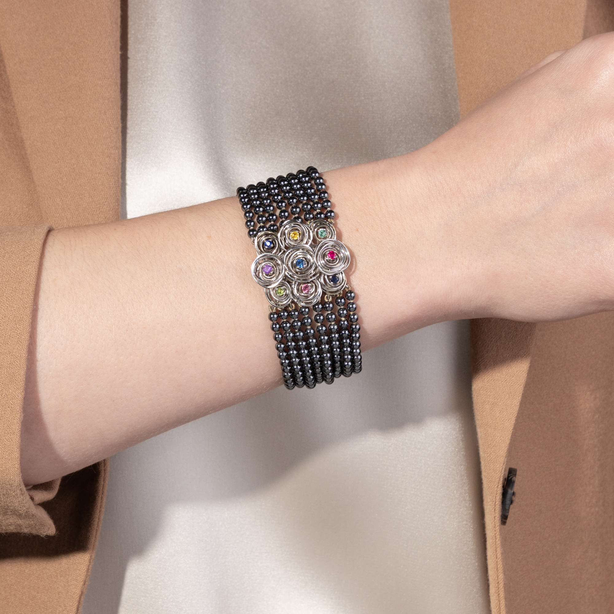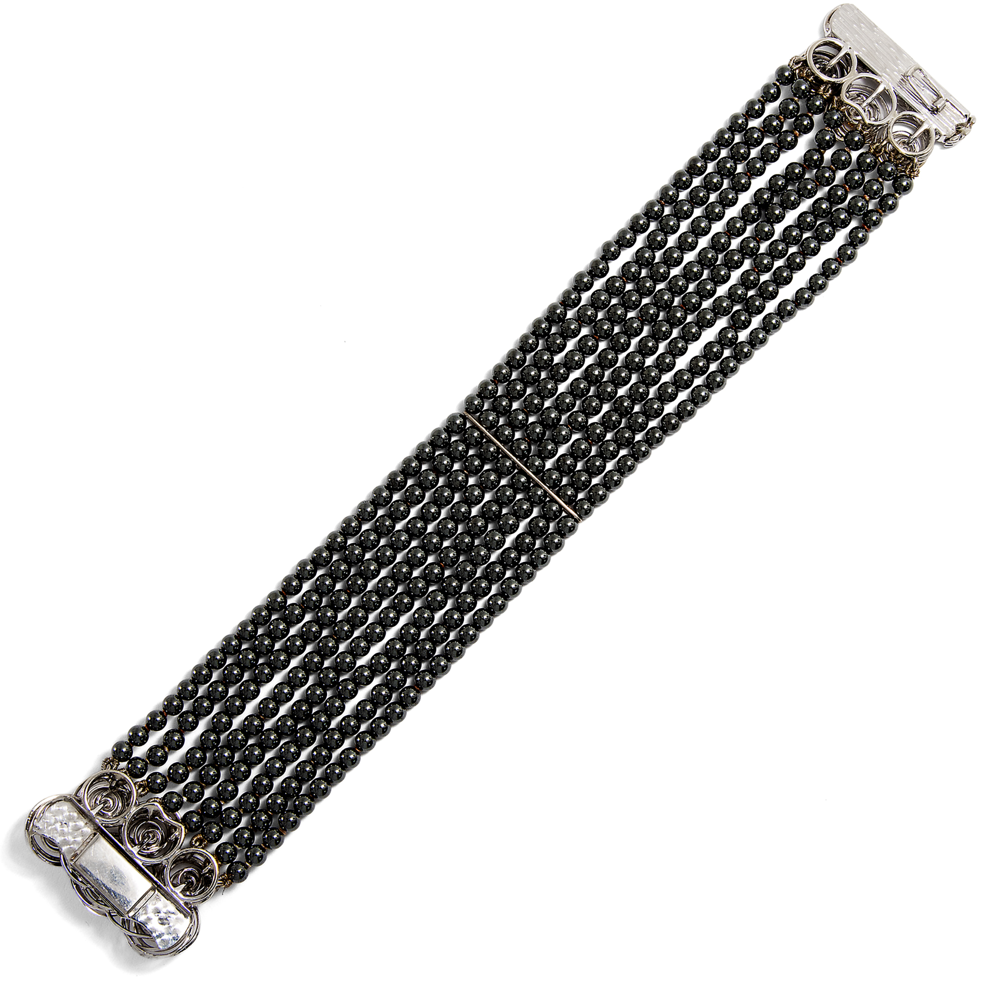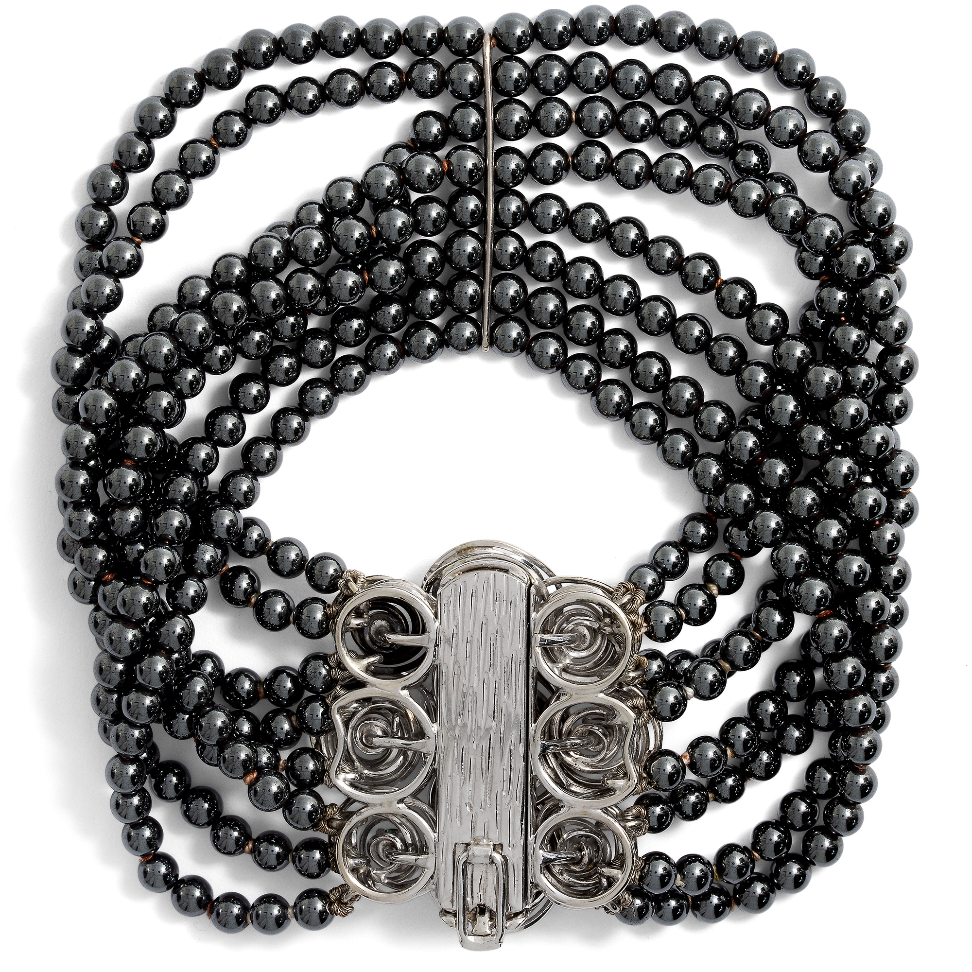 In der Nachkriegszeit wurde im Schmuckdesign kontinuierlich und experimentierfreudig nach neuen Ausdrucksmöglichkeiten gesucht. Ziel war die Hervorbringung einer eigenständigen abstrakten Formensprache, die sich von den vorangegangenen historisierenden Stilen abheben und zugleich erkennbar gegenwärtig sein sollte. Häufig steht seitdem die Materialität der Stücke im Vordergrund, der Kontrast etwa zwischen spiegelnden und matten Oberflächen und dem Spiel von Licht und Schatten. Als Vintage-Schmuck werden diese handgearbeiteten Kreationen heute wieder neu geschätzt, da sie durch ihre eigenständige Formensprache überzeugen. Das vorliegende, ausdrucksstarke Armband ist ein typisches und besonders hochwertig ausgestattetes Beispiel dieser Zeit. Das Armband besteht aus acht Reihen metallisch glänzender Hämatitperlen, die von einer expressiven Zierschließe zusammengehalten werden. Die große Schließe ist aus hochkarätigem Weißgold gearbeitet. Sie ist aus neun Kreisformen aus gewickeltem Weißgolddrähten aufgebaut in deren Zentrum jeweils ein farbiger Edelstein leuchtet. Wir sehen einen roten Rubin, drei blaue Saphire und einen gelben Saphir, einen violetten Amethyst, einen lindgrünen Peridot sowie zwei Turmaline in Pink und Petrolgrün. So erhält die Zierschließe ein farbenfrohes, Optimismus versprühendes Aussehen. Das handgearbeitete Armband ist ein sehr schön erhaltenes Stück tragbaren Kunstgewerbes und eine tolle Ergänzung für jede Sammlung von Schmuckdesign der 1970er Jahre.