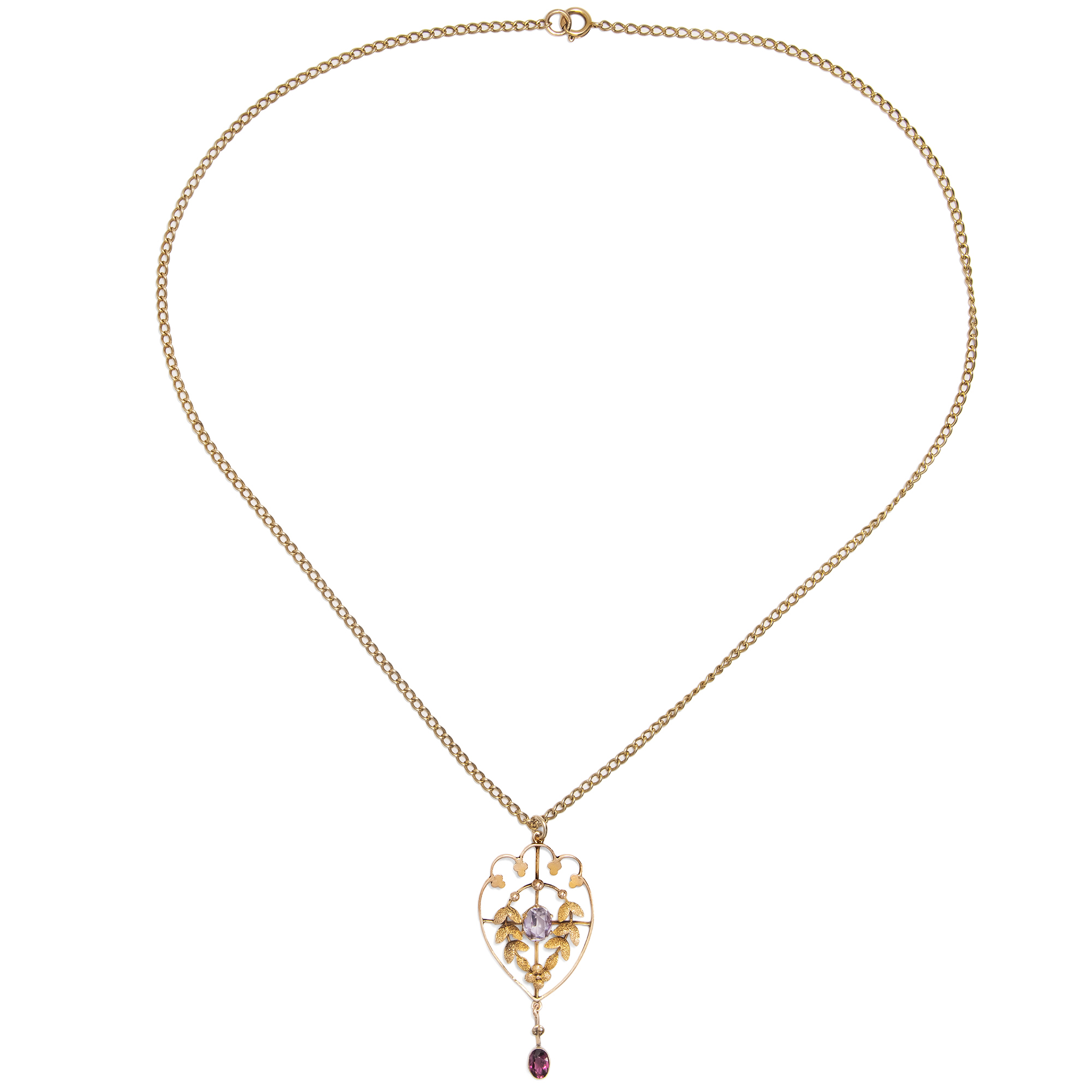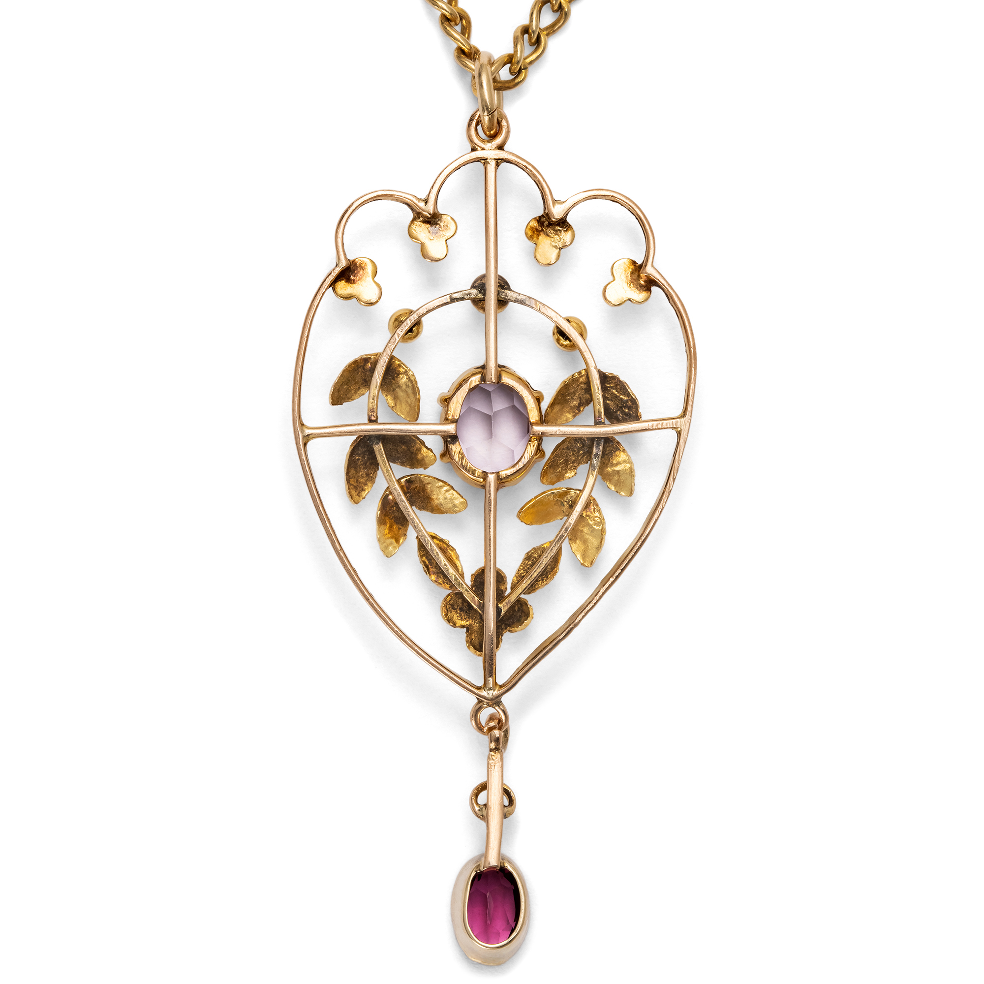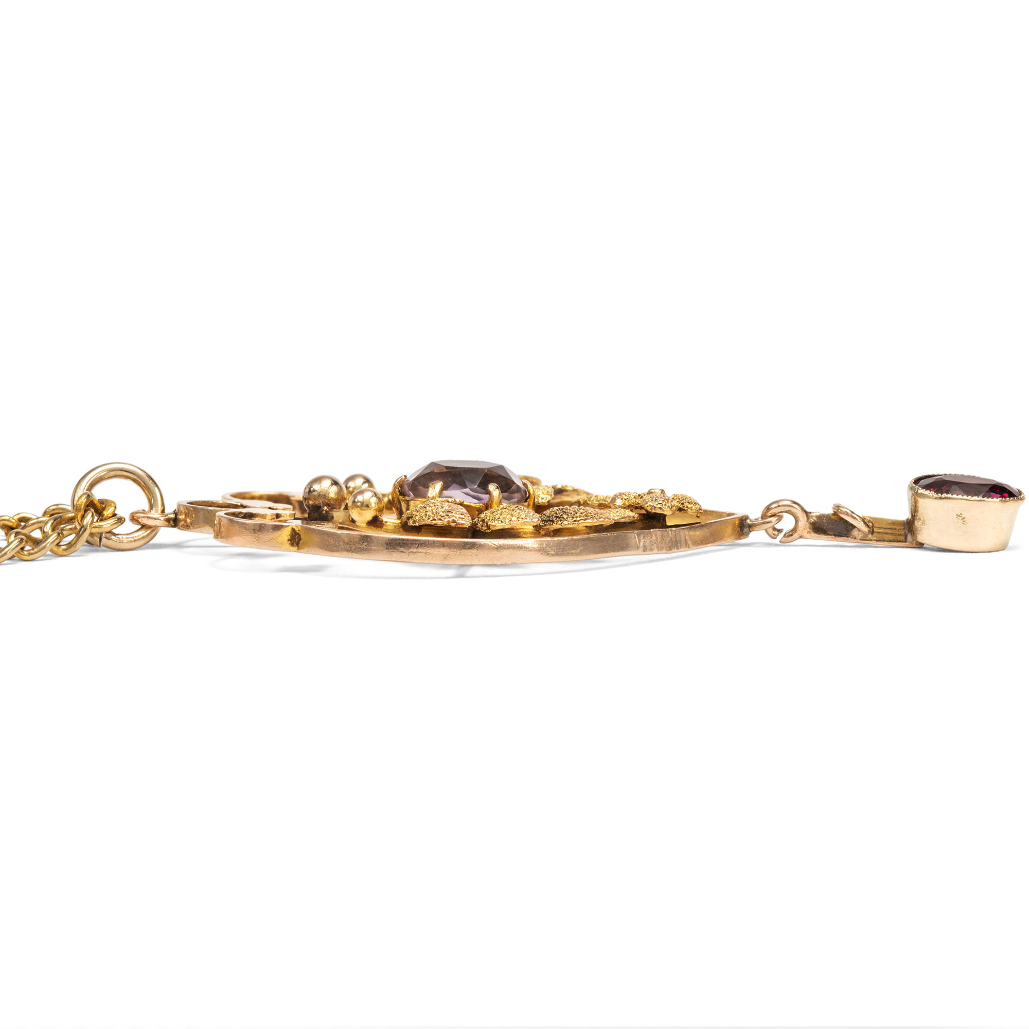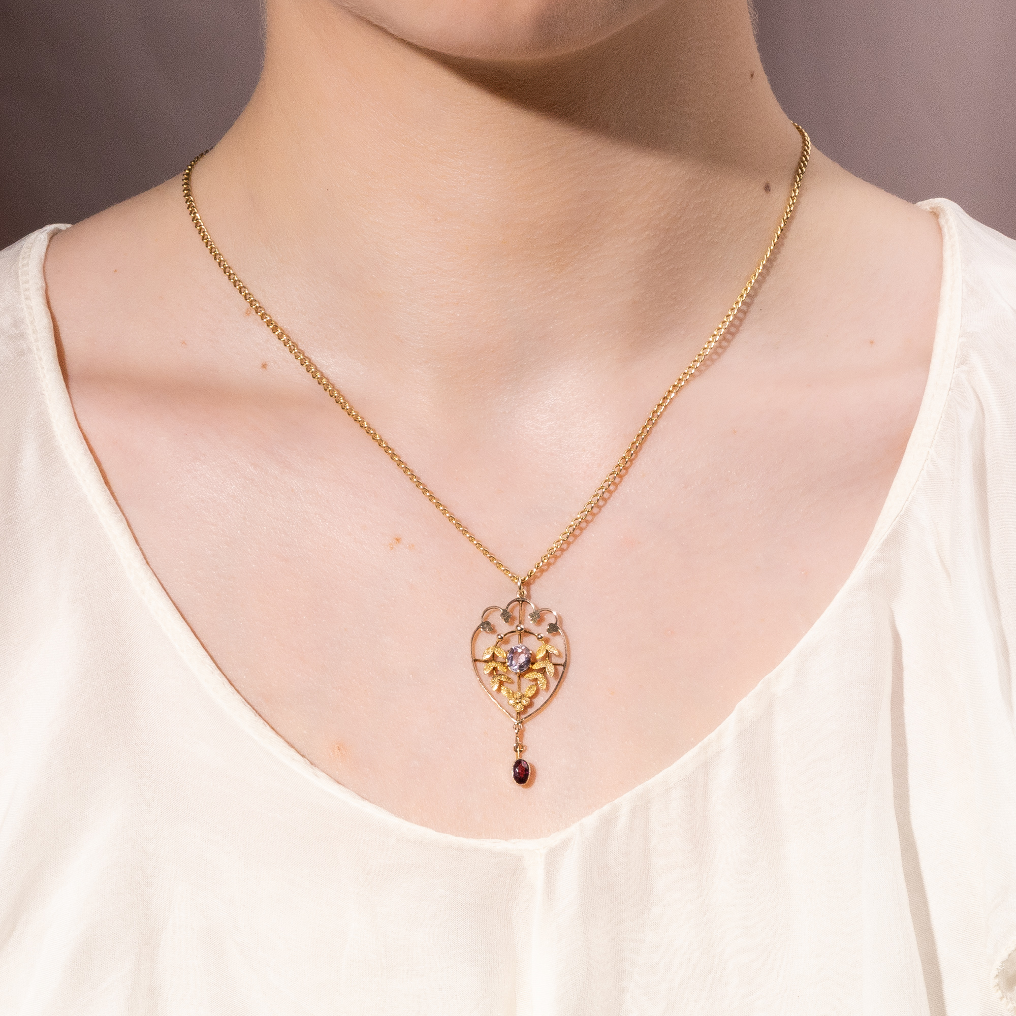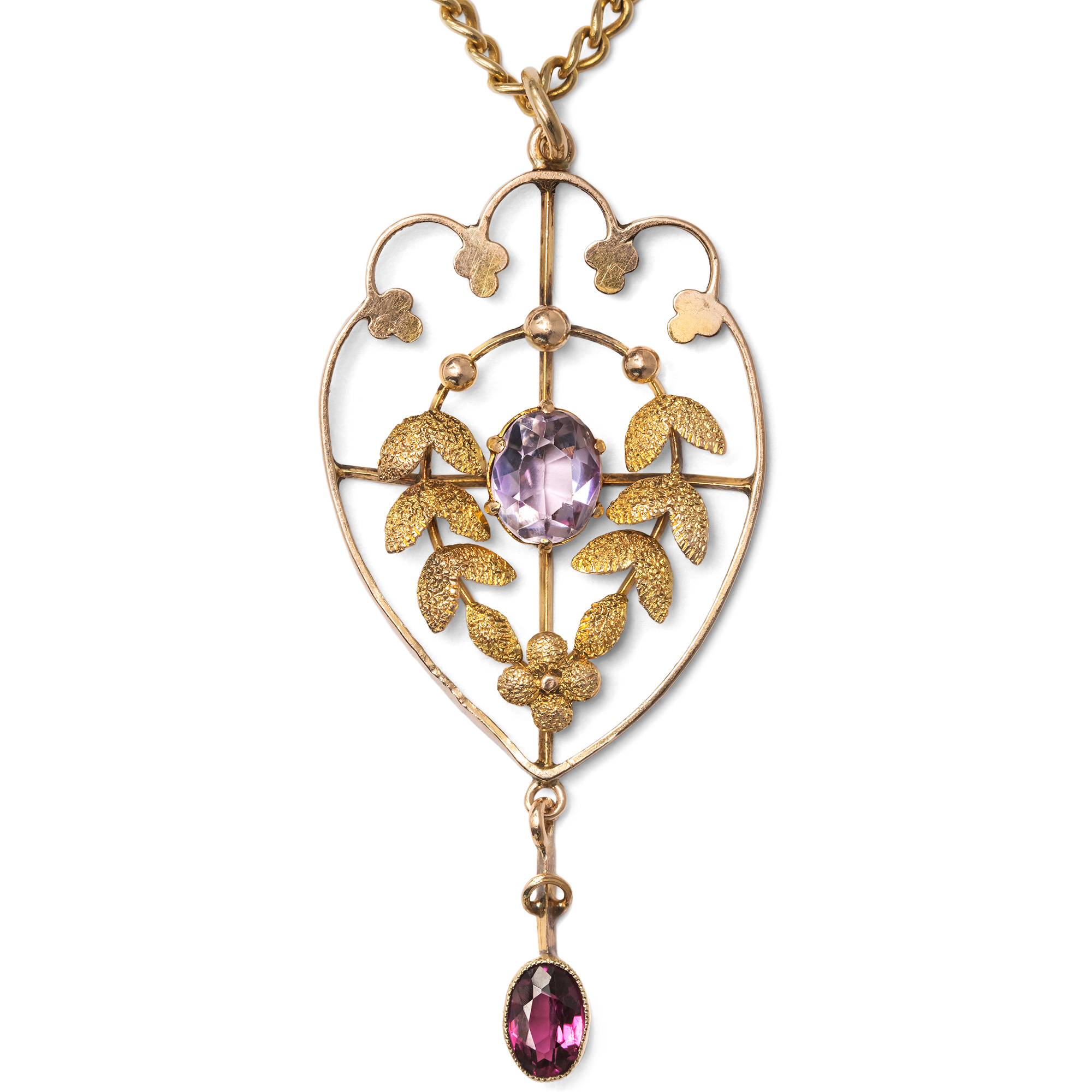 In den ersten Jahren des 20. Jahrhunderts waren in Großbritannien zarte Anhänger beliebt: Solche aus feinen Goldstegen, um die sich zierliche Blätter und Blüten winden, beeinflusst von den Formensprachen des Jugendstils und des modischen „Garland Style“, einem leichten Neoklassizismus mit Anklängen an den Empire. Der hier vorliegende Anhänger zeigt sich in diesem eleganten Geschmack. In einem Geflecht aus Ranken und Blättern präsentiert er mittig einen Amethyst von bassvioletter Farbe. Wie eine Blüte sitzt der Stein inmitten symmetrisch angeordneter Lorbeerzweige. Unten dann ist ein weiterer Edelstein pendelnd angefügt, ein Granat, in einem tiefen, leuchtenden Violett. In der Entstehungszeit des Schmuckstücks besaß die übliche Goldlegierung einen rötlichen Ton, sodass man auf beinahe alle Schmuckstücke eine zusätzliche Schicht Feingold auflegte, um den begehrten warmen Gelbgoldton zu erhalten. Auch unser Anhänger zeigt diese Auflage aus Feingold auf den mattierten Partien. Auf den polierten glänzenden Stegen und Blättern am oberen Rand ist die Auflage heute verloren, wodurch der Anhänger einen wärmeren Ton erhalten hat, der aber ganz wunderbar zum Violett der Edelsteine passt. Der Anhänger kann mit seiner passenden Goldkette sofort getragen werden. Wir haben ihn in London entdeckt.