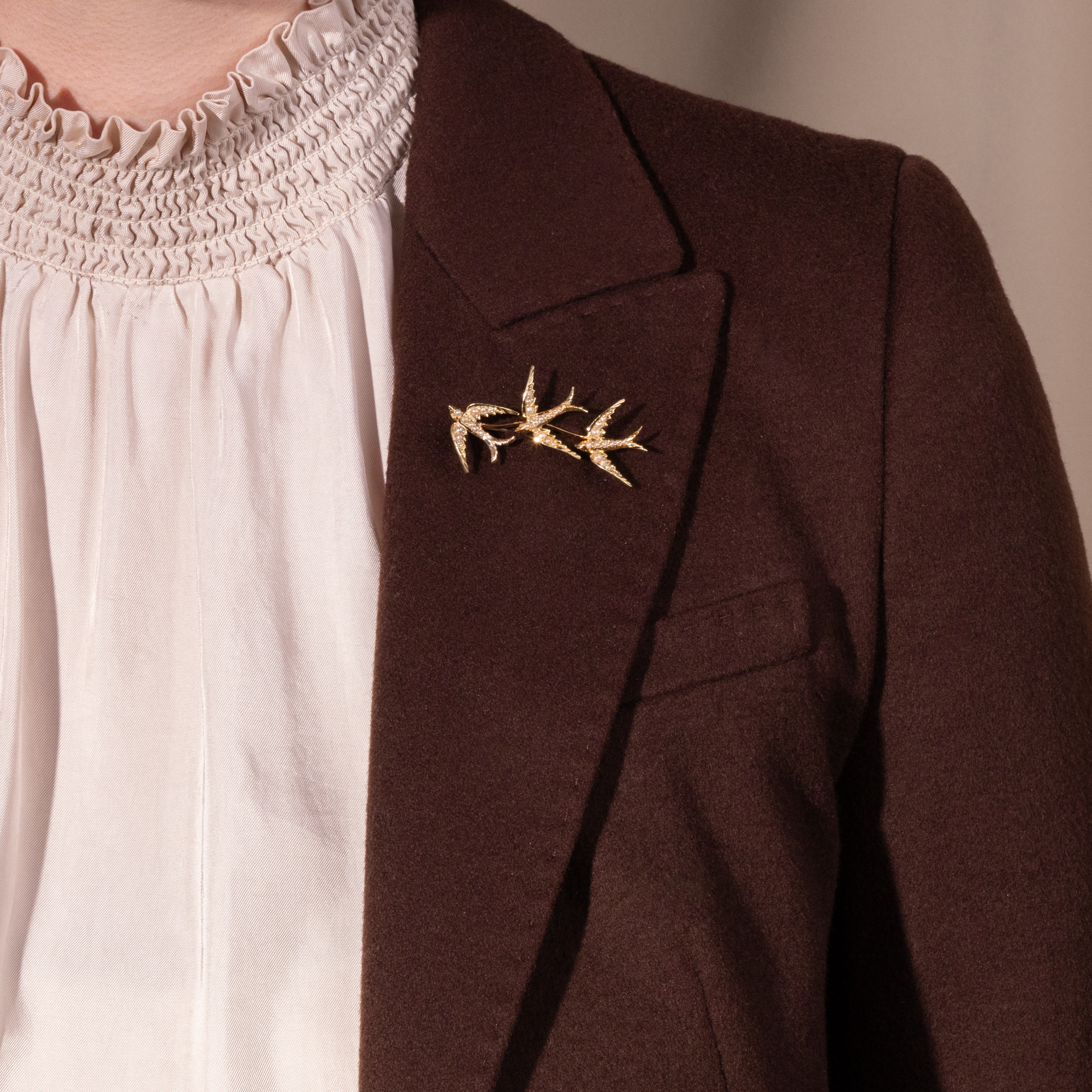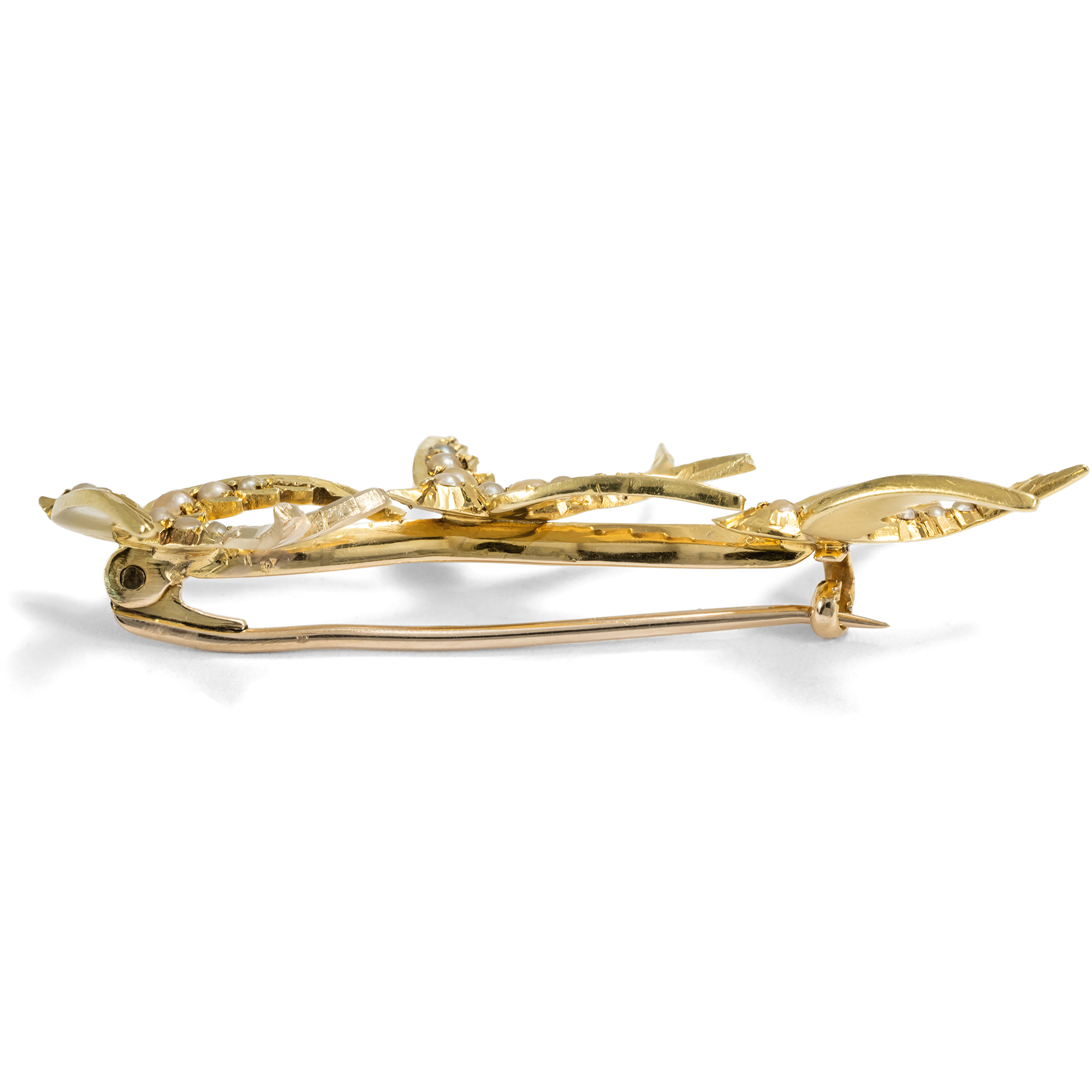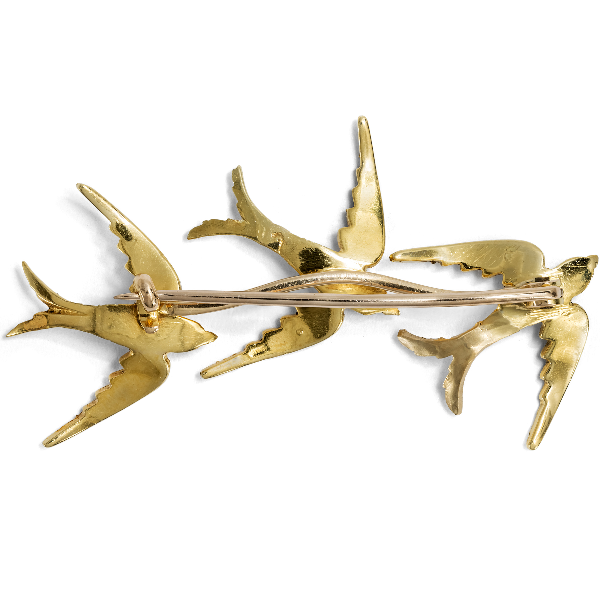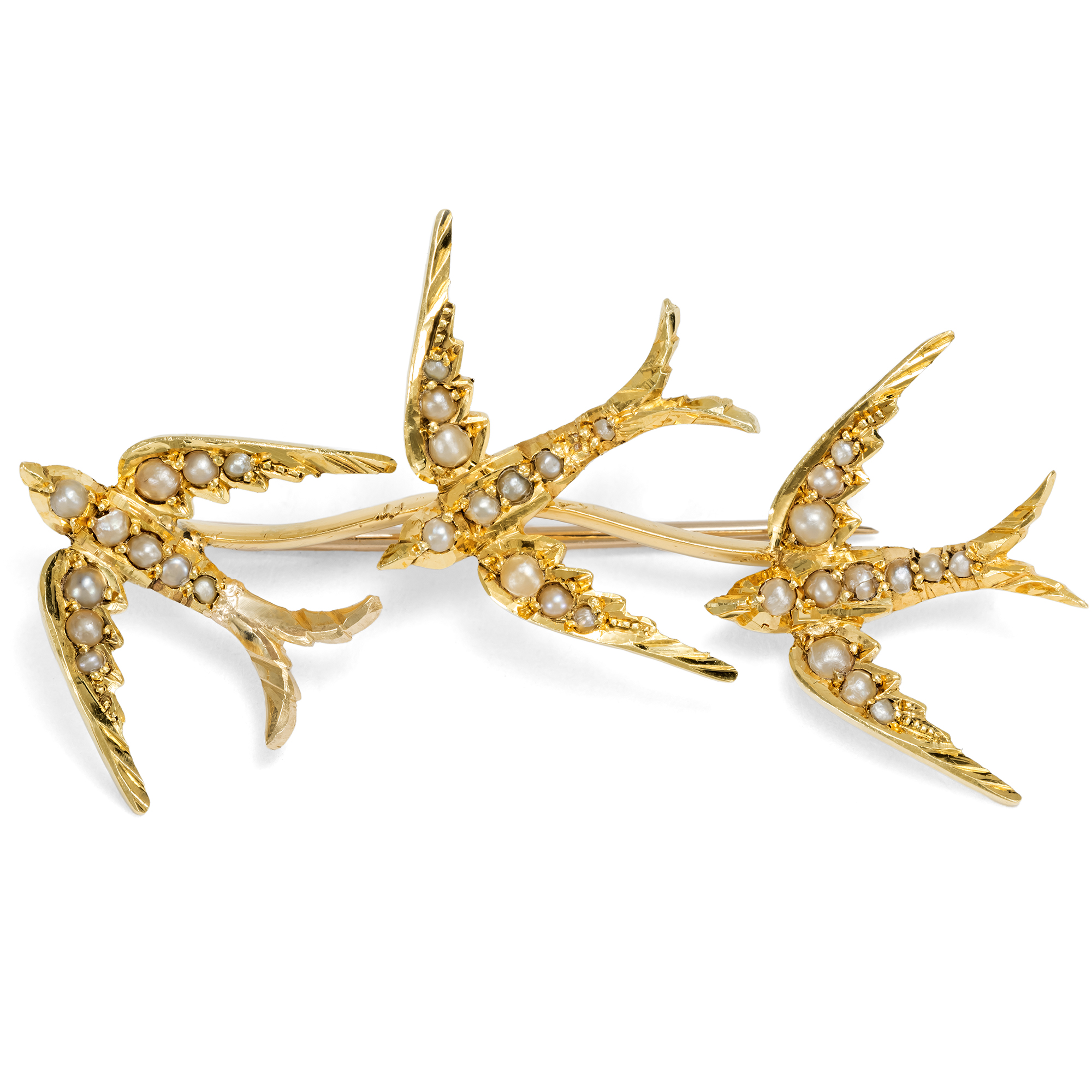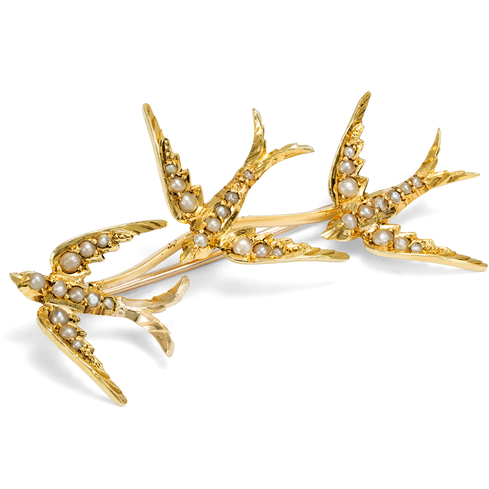 Drei Schwalben im munteren Flug gleiten wie Pfeile durch die Lüfte. Ihr helles Gefieder, aushgefasst mit schimmernden Perlen, weiß und rein, fängt das Licht auf jedem Flügelschlag. Die Körper, aus Gold geformt, leuchten warm im Sonnenlicht und bilden zusammen einen anmutigen Schwarm. Die Schwalbe, die jedes Jahr im Frühling zu uns zurückkehrt, ist seit jeher ein Sinnbild der Hoffnung und der Liebe. Die Perlen, Symbol der Göttin Venus, unterstreichen diesen romantischen Charakter und erschaffen so ein kleines, glänzendes Denkmal für tiefe Zuneigung. Gefertigt wurde das Schmuckstück im ausgehenden viktorianischen Zeitalter, in dem solche romantischen Symbole große Beliebtheit hatten. Schwalben, auch als Lovebirds bekannt, zierten damals zahlreiche Schmuckstücke und standen als Liebesgeschenke hoch im Kurs. Dieses Exemplar aus den letzten Jahren des 19. Jahrhunderts ist ein bezauberndes Zeitzeugnis und noch heute hervorragend tragbar.