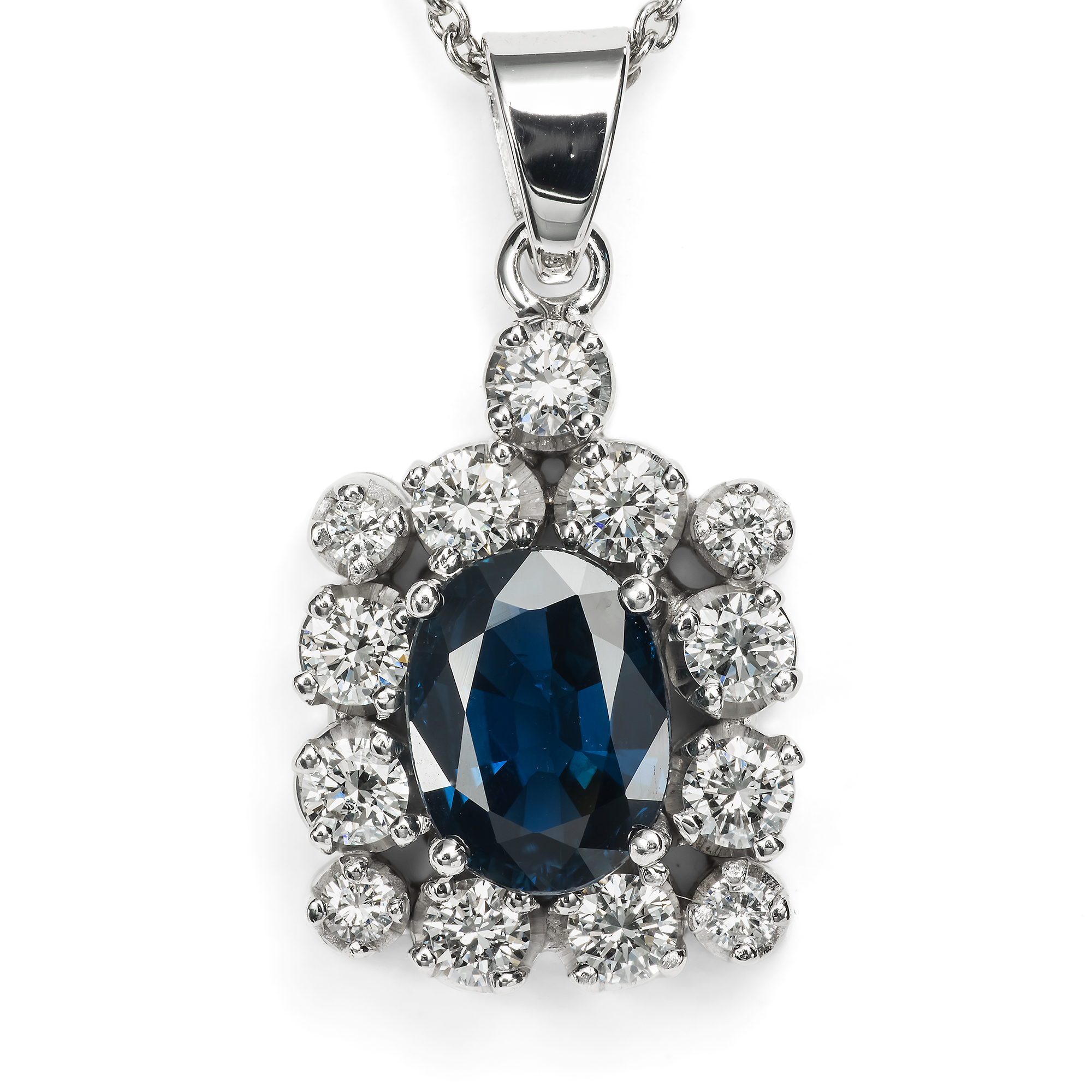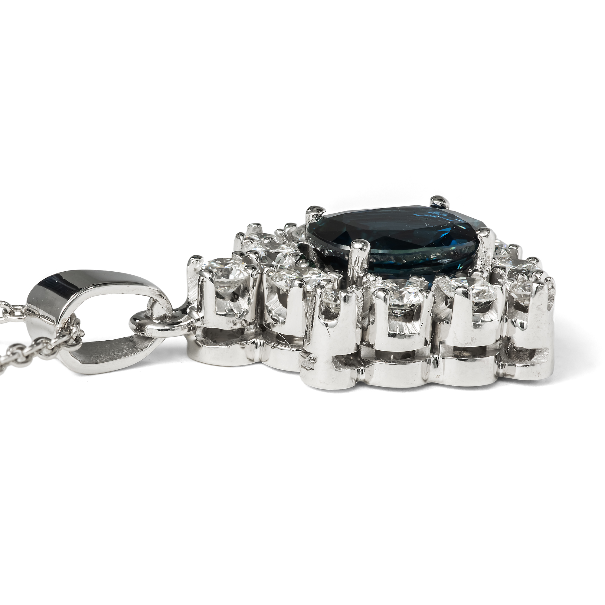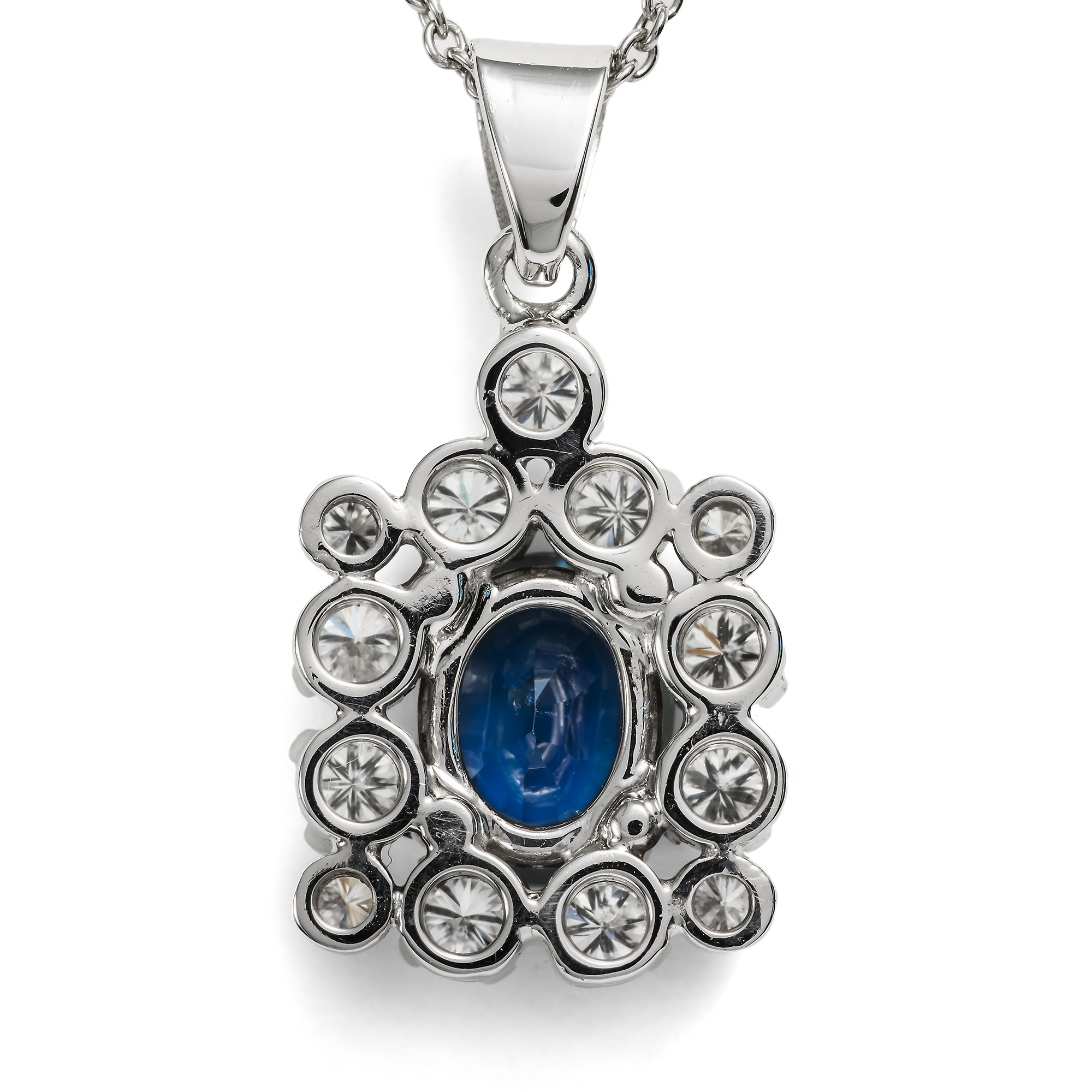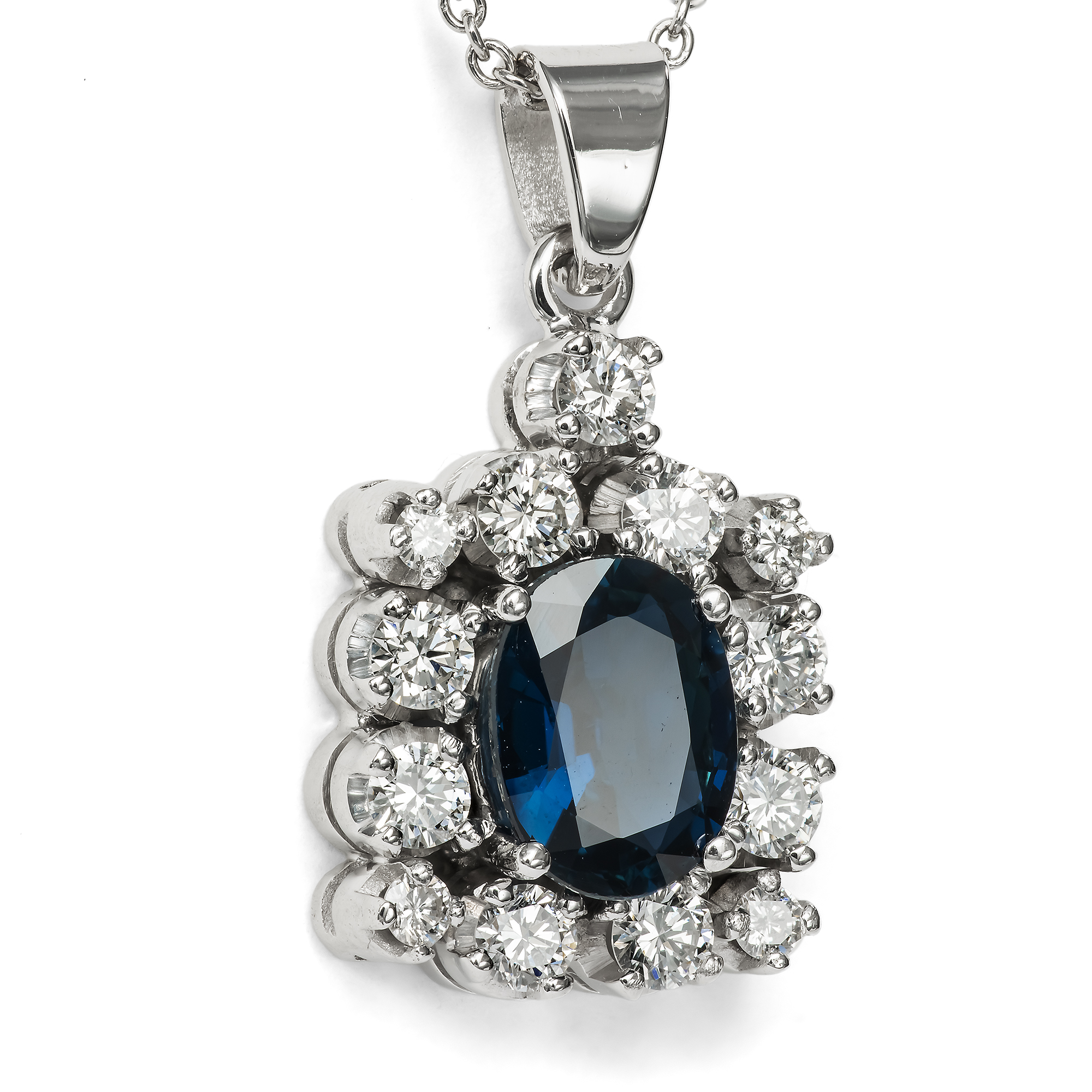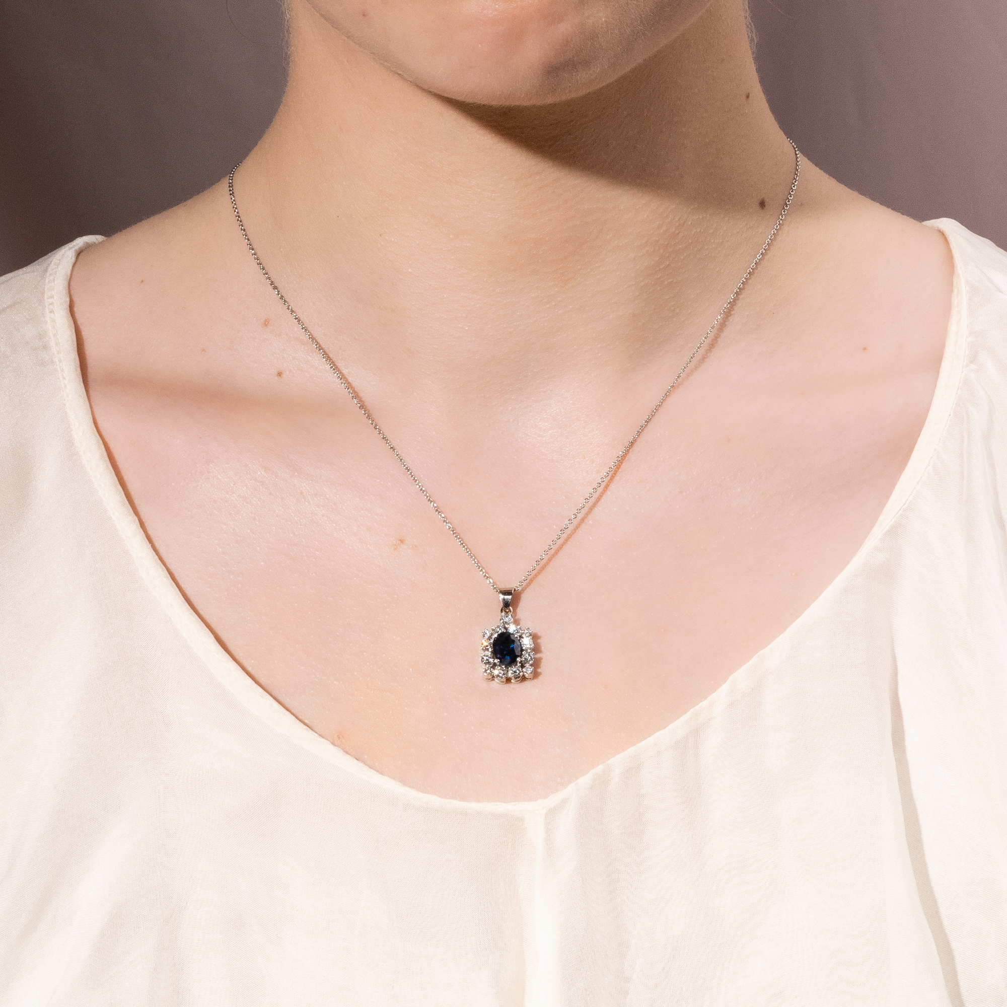 Stimmungsvoll blau zeigt sich der natürliche Saphir im Mittelpunkt dieses Anhängers. Der Stein ist oval facettiert und bringt etwa 1,38 Karat Gewicht auf die Waage. Das Besondere an diesem Saphir ist, dass er nicht erhitzt wurde, um seine Farbe oder Reinheit zu verbessern. Er ist somit vollständig unbehandelt und sein Mitternachtsblau und seine besondere Klarheit sind vollkommen natürlich. Ein Rahmen aus dreizehn feinweißen Brillanten in der Farbstufe „Top Wesselton, G“ ist um den Saphir gelegt. Die Fassungen aller Edelsteine aus hochkarätigem Weißgold nehmen sich dagegen völlig zurück. Dem Goldschmied lag es vor allem daran, die Edelsteine bestmöglich zu präsentieren. Eine feine moderne Platinkette macht das Schmuckstück tragbar. Zu uns kam der vintage Anhänger hier in Berlin und wir datieren ihn in die Jahre um 1980. Entstanden ist er vermutlich in Deutschland.
