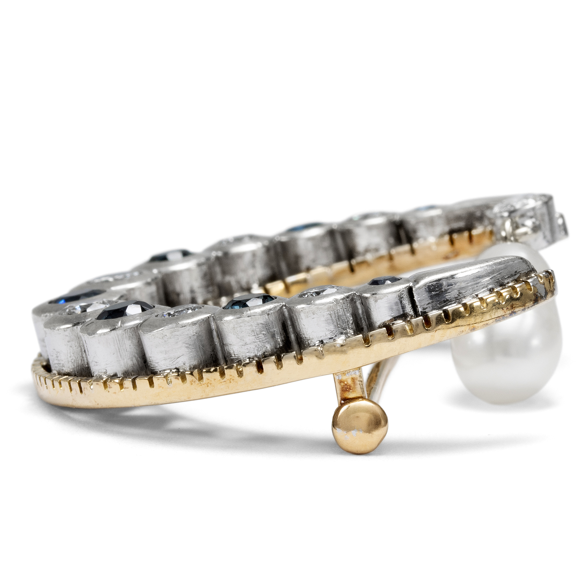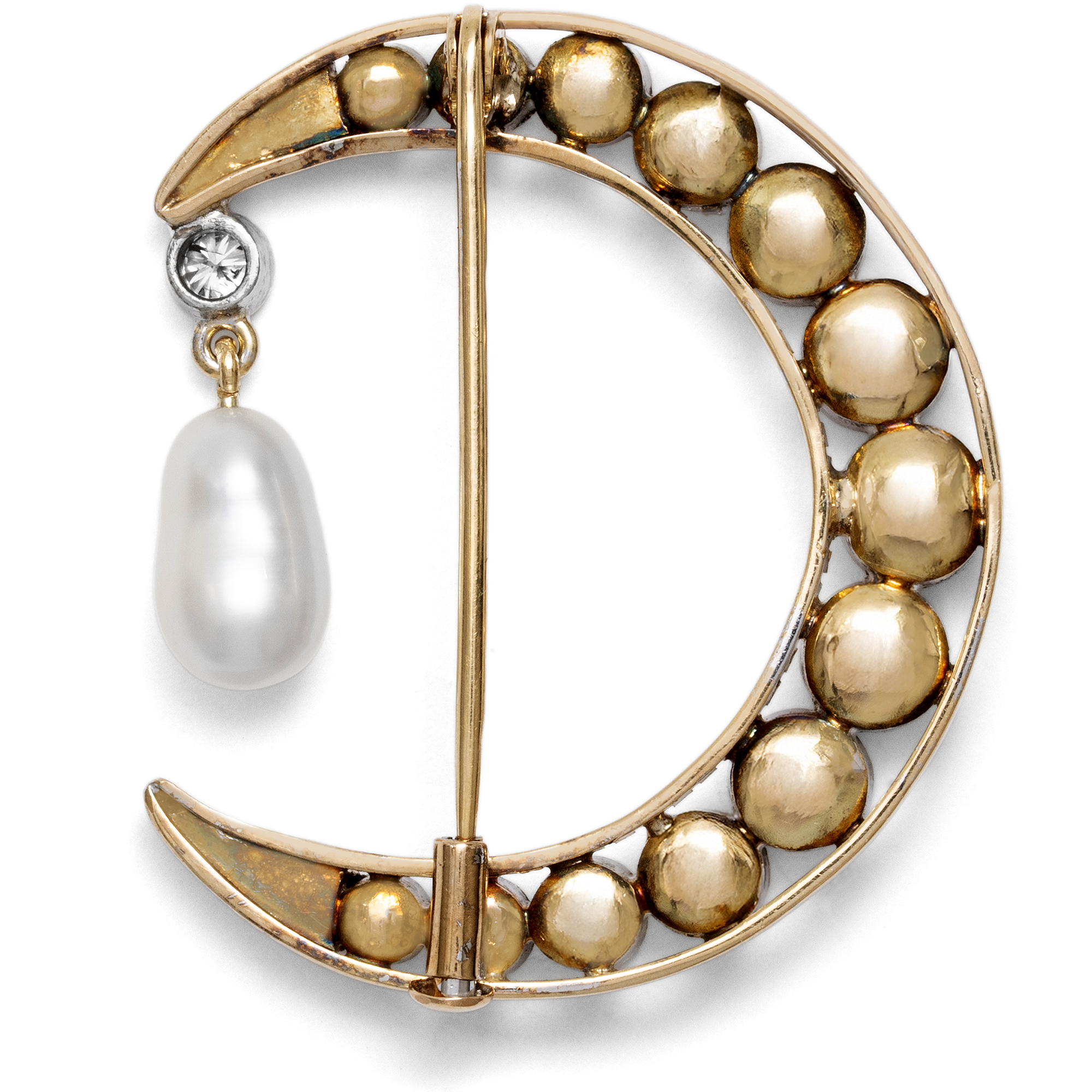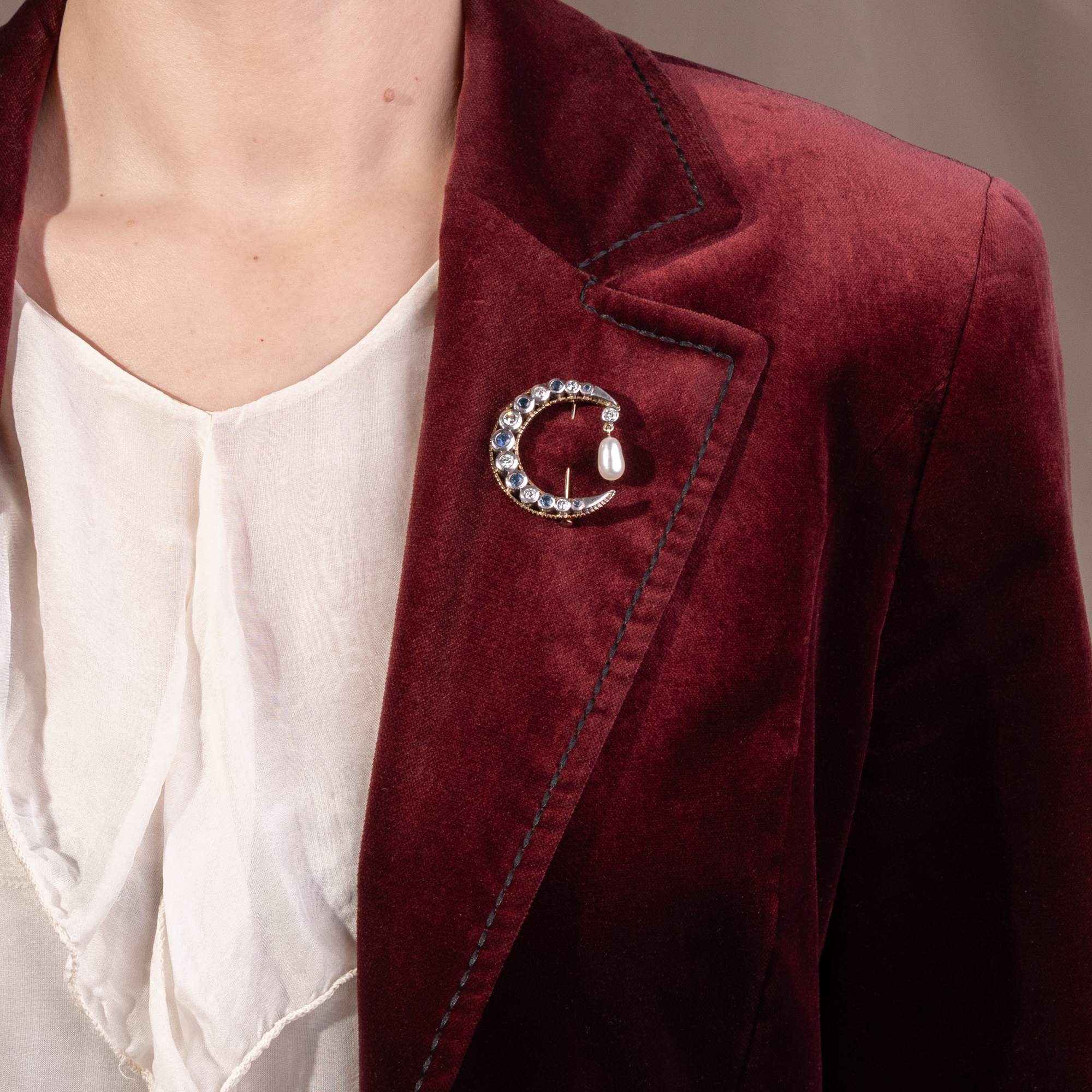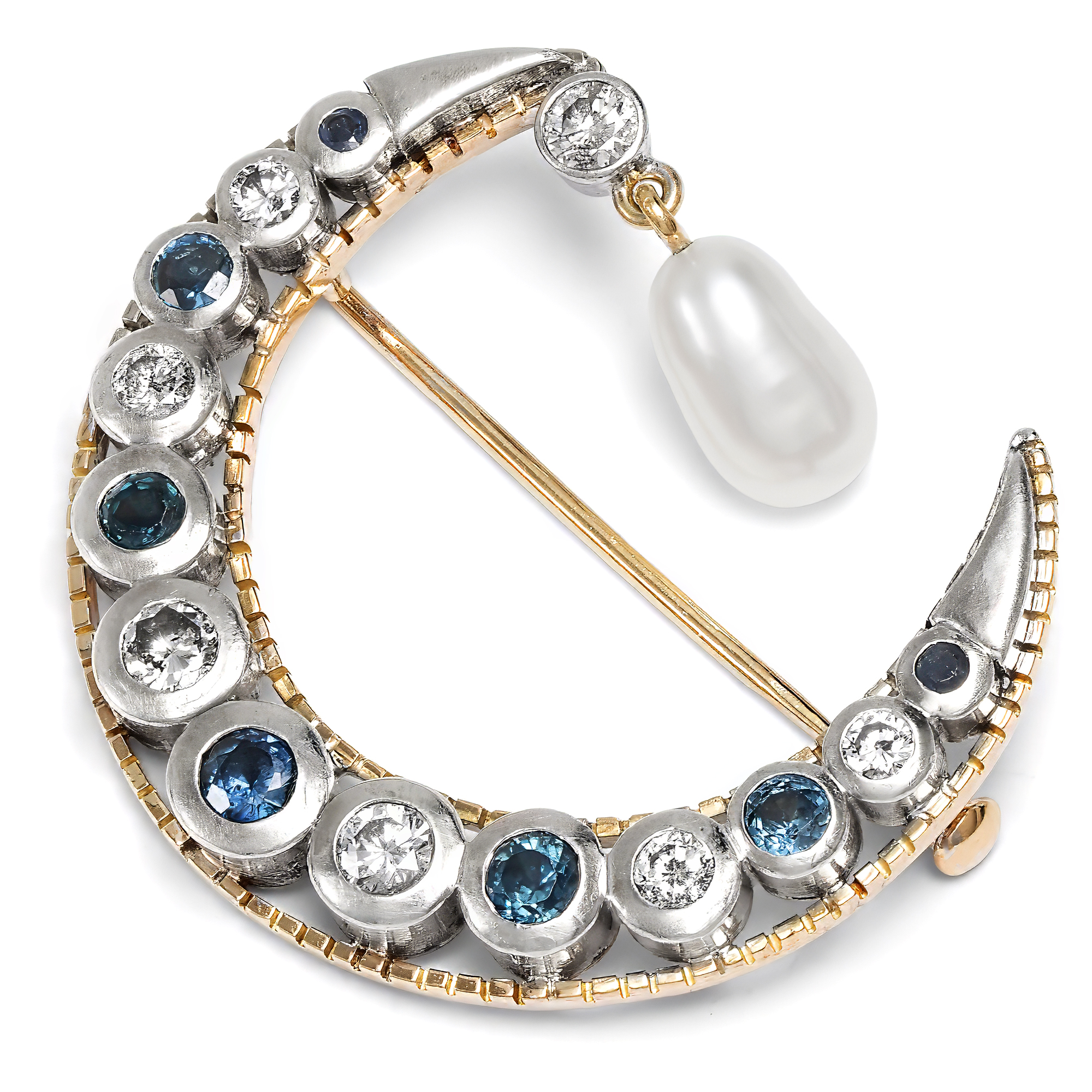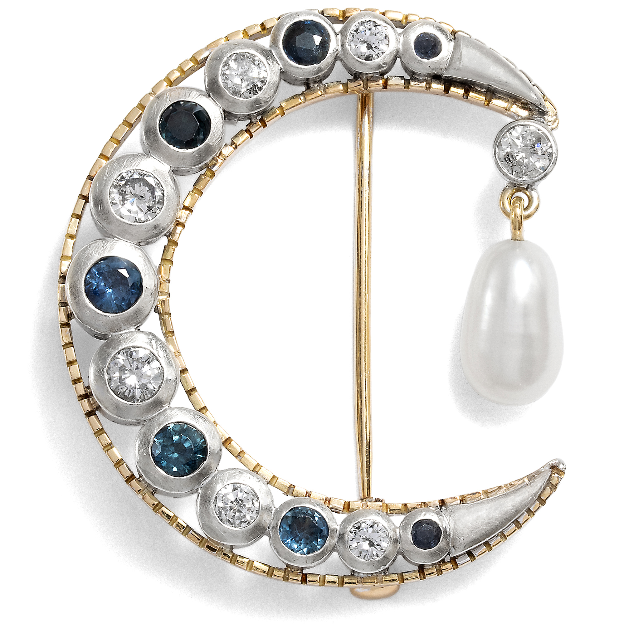Schmuck in Form von Himmelskörpern erfreute sich im letzten Drittel des 19. Jahrhunderts großer Beliebtheit. Monde, Sterne und Sonnen prangten an den Korsagen der Kleider und funkelten im Haar. Wer denkt bei Diamantsternen nicht sogleich an das legendäre Porträt der Sisi, gemalt von Winterhalter, das die junge Kaiserin mit einer Vielzahl solcher Juwelen im dunklen Haar zeigt? Die Damen jener Zeit trugen diese Broschen in Verbindung mit verschiedenen anderen Stücken am Ausschnitt ihrer prachtvollen Kleider. Viele der Monde waren dabei ausschließlich mit Diamanten verziert, um eine gewisse farbliche Nähe zum Naturvorbild zu erzeugen. Aber es wurden auch farbenfrohere Entwürfe umgesetzt, oft mit mehreren Reihen kostbarer Edelsteine. Meist wurden Diamanten mit Saphiren oder Rubinen kombiniert. Die hier vorliegende Brosche ist ein später Widerhall dieser Mondmode des 19. Jahrhunderts, denn ausweislich der Edelsteinschliffe ist sie erst in jüngerer Zeit entstanden. Wir datieren sie in die Mitte der 1980er Jahre. Die Brosche ist aus Gelbgold mit einer Auflage aus Silber gefertigt und mit etwa einem Karat Brillanten und 0,42 Karat blauen Saphiren besetzt. Eine schimmernde Perle ist an einer Sichelspitze pendelnd angehängt. Die Farbigkeit der Brosche erinnert an den nächtlichen Himmel, ihre Form an die lange Tradition der Mondschmuckstücke – so ist die Brosche zugleich modern und doch voller Nostalgie.