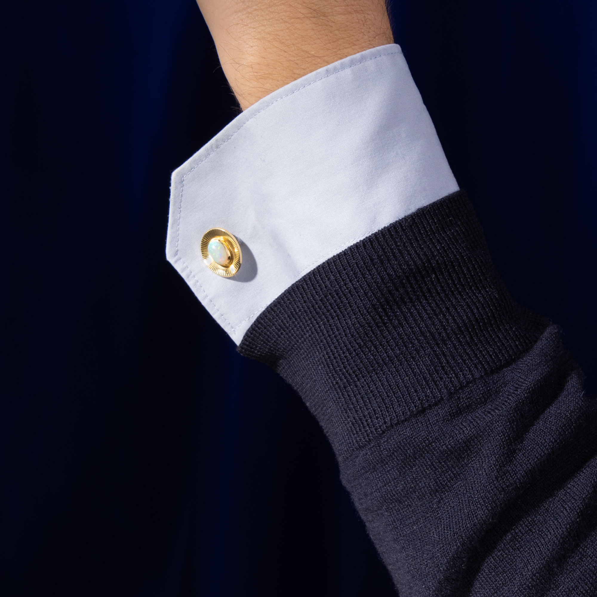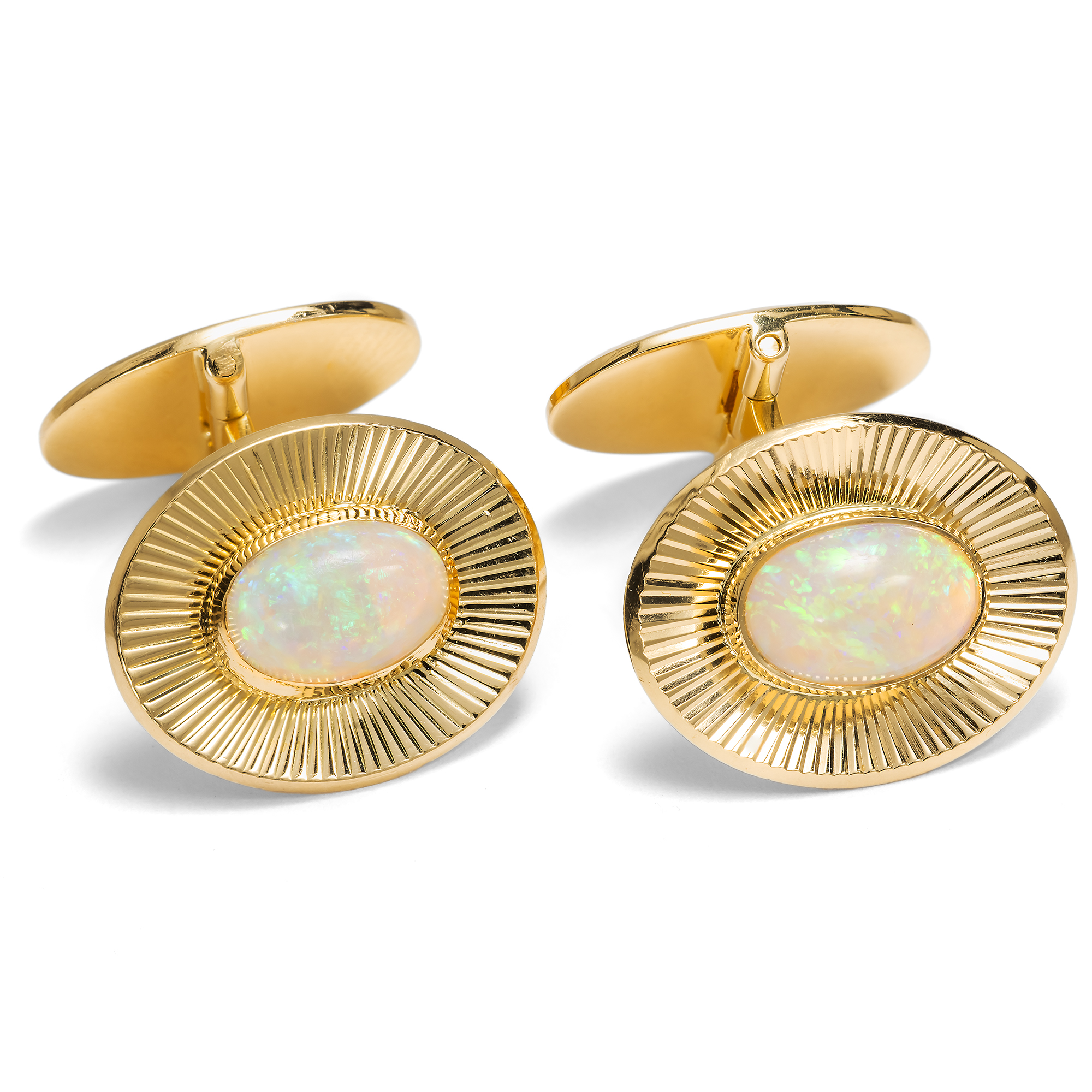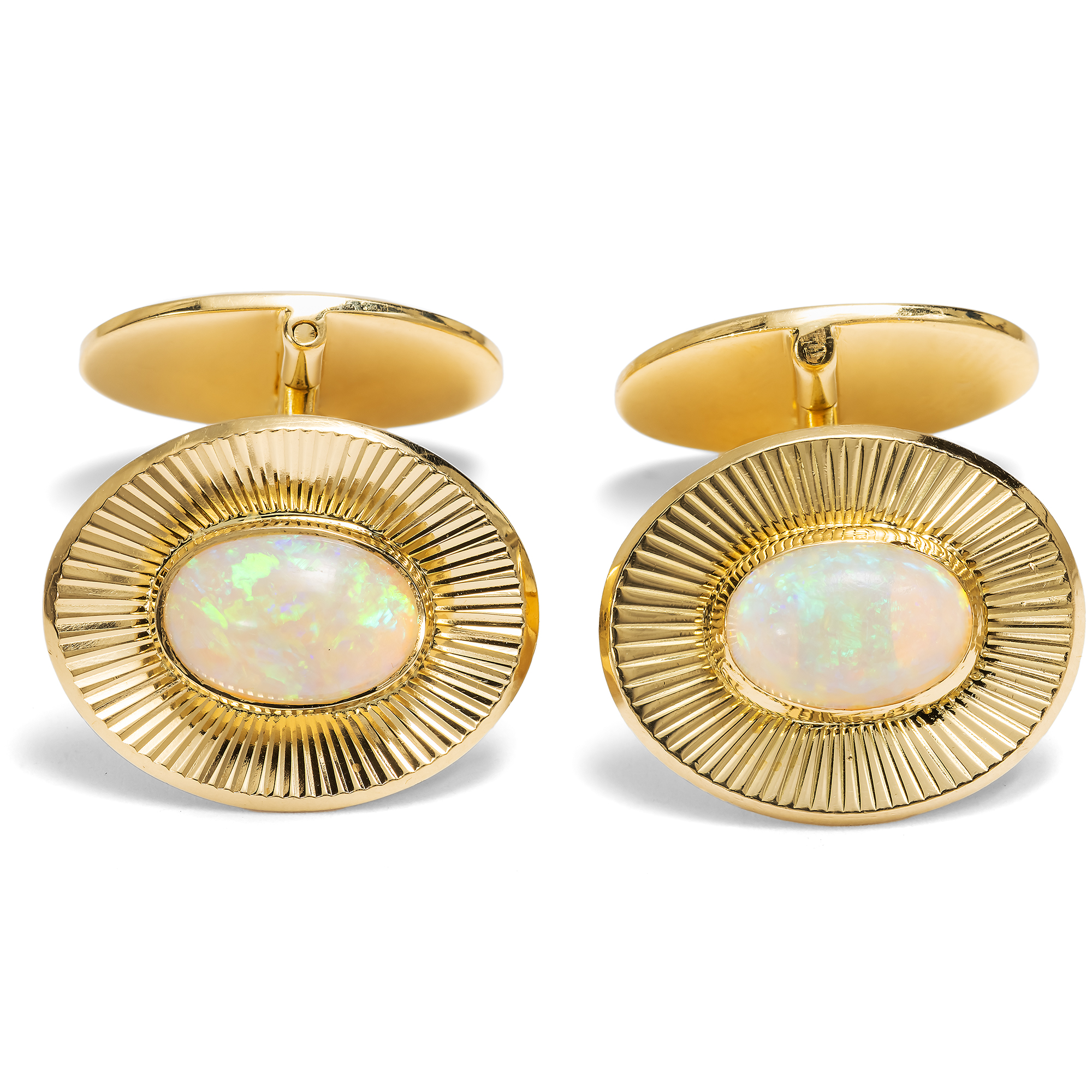 Manschettenknöpfe gehören zu den wenigen Schmuckstücken für den Herren und sind neben Armbanduhren aus der Welt der Herrenmode nicht wegzudenken. Sie bieten die Möglichkeit, zurückhaltend die eigene Persönlichkeit zum Ausdruck zu bringen. Wieviel stilvoller ist doch ein gediegenes Paar Manschettenknöpfe aus Gold als schnöde Hemdsknöpfe aus Kunststoff! Die hier vorliegenden Manschettenknöpfe aus hochkarätigem Gold zeigen die Formensprache des Midcentury. Ihre Fronten zeigen sich in ovaler Form. Sie sind konkav gebogen und die Oberflächen zeigen eine strahlenkranzartige Riffelung, die von einem zentralen Opal ausgeht. Die qualitätvollen Edelsteine zeigen ein beeindruckendes Farbspiel, dass durch die ungewöhnliche Rahmung besonders schön zur Geltung kommt. Sie entsprechen perfekt dem Zeitgeschmack, denn Struktur war ein großes Thema des Schmucks der 1960er und frühen 1970er Jahre. Unsere Knöpfe sind laut Stempelung eine Arbeit der bereits 1895 in Pforzheim gegründeten Goldschmiede Georg Lauer. Sie sind exzellent erhalten und ein ebenso edler wie stilvoller Blickfang am Hemd!