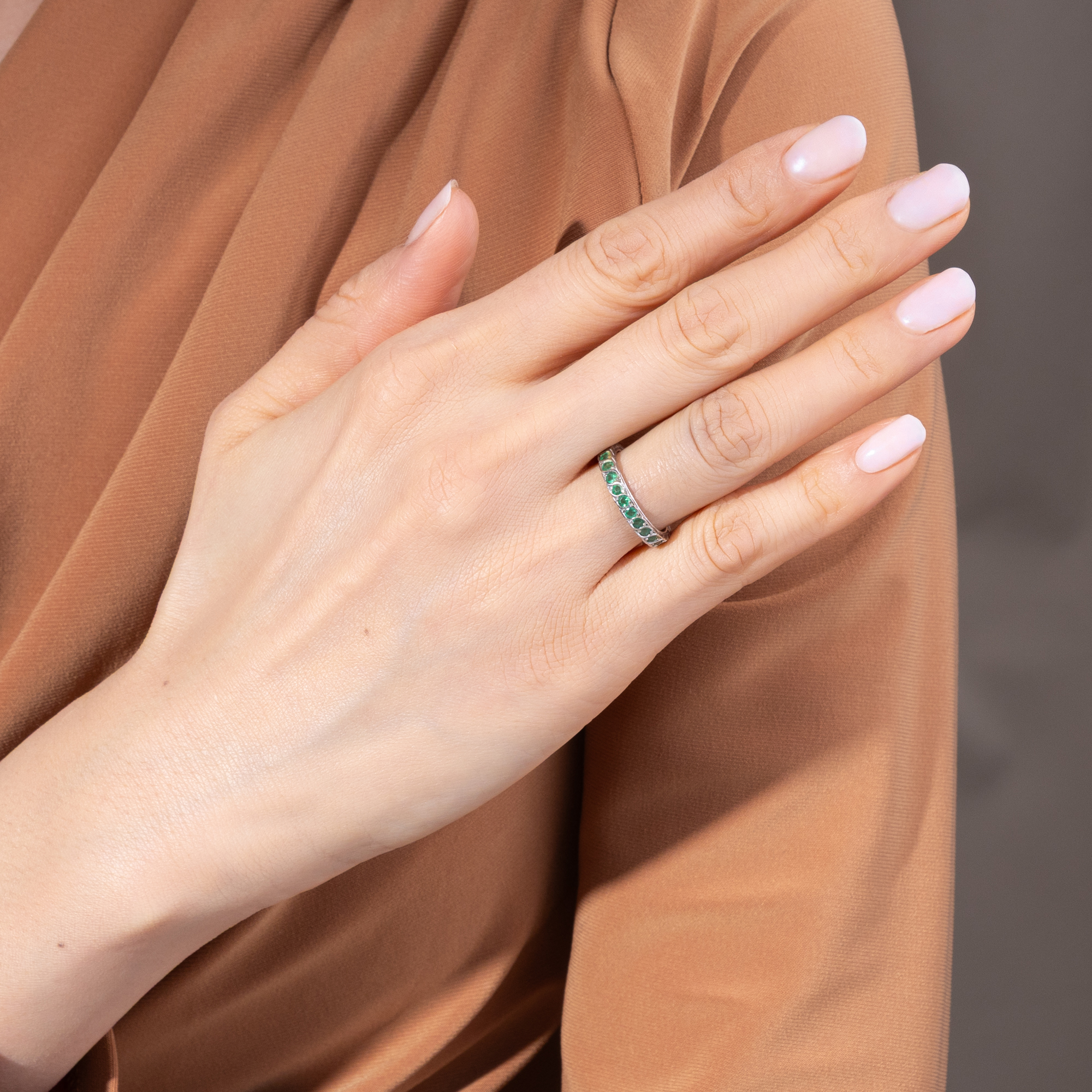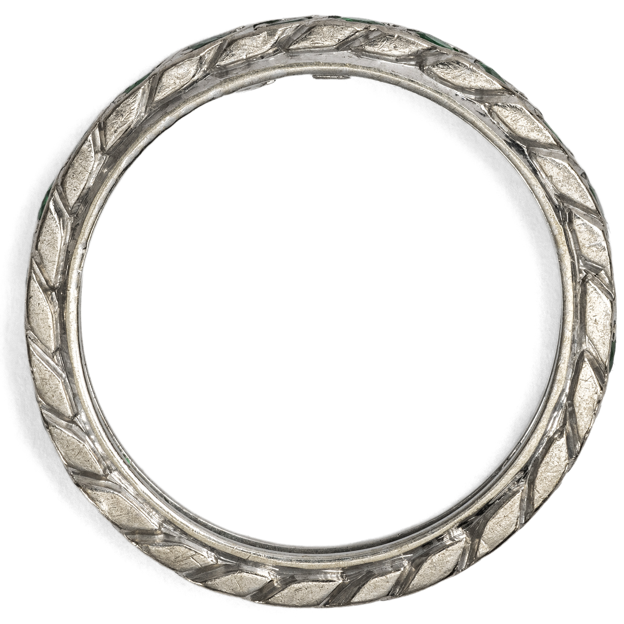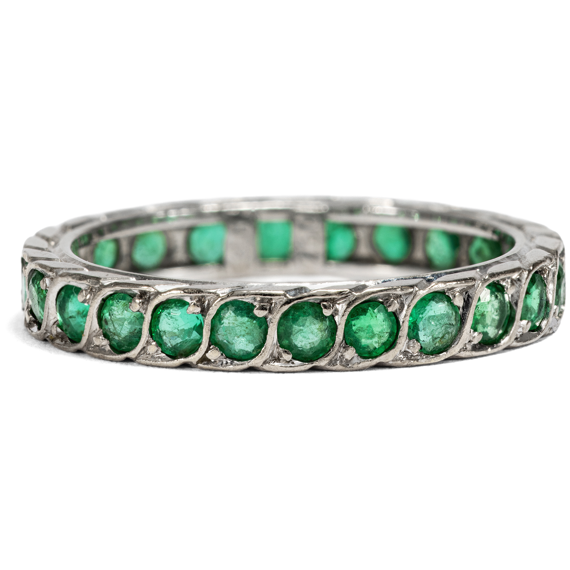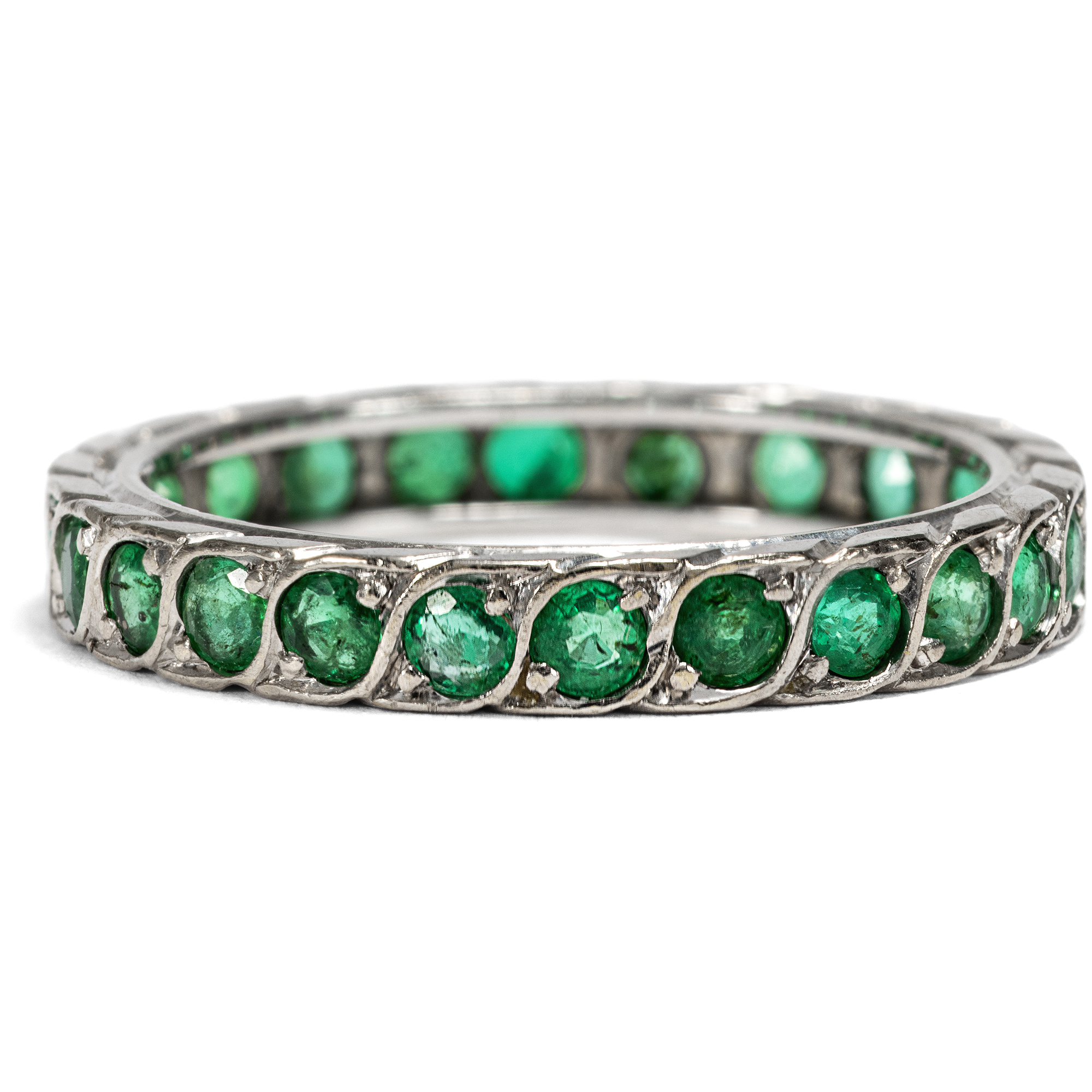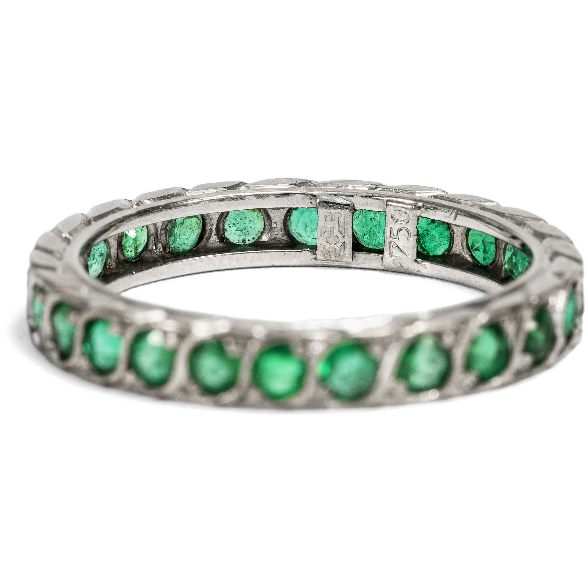 Memory Ringe (auch „Mémoire Ringe“) sind besonders anrührende Schmuckstücke, deren Rund mit Edelsteinen, meist der gleichen Art und Größe besetzt ist. Die Namensgebung lässt sich dadurch erklären, dass jeder einzelne Edelstein für ein bestimmtes schönes Erlebnis der Besitzerin bzw. des Besitzers stehen soll, das so in der Erinnerung lebendig gehalten wird. Memory Ringe werden gerne als Verlobungs- oder Trauringe verwendet. In diesem Fall ist dann auch die alternative Bezeichnung „Eternity Ring“ gebräuchlich. Der hier vorliegende, hochwertige Ring aus den Jahren um 1980 zeigt sich jedoch anders als seine klassischen Brüder. Er unterscheidet sich in der Auswahl seines Besatzes: Anstelle weißer Diamanten sehen wir grüne Smaragde, welche in einem dynamischen Flechtmuster eine funkelnde Reihe in frischem Grün bilden. In der Sprache der Edelsteine gilt der Smaragd als Sinnbild junger, frisch erblühender Liebe und beinhaltet die Hoffnung, dass diese andauern möge. Der Ring ist aus hochkarätigem Weißgold gefertigt und sehr schön erhalten.