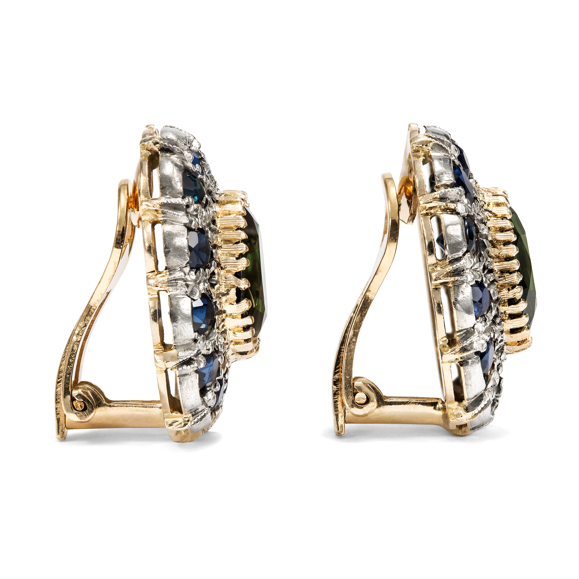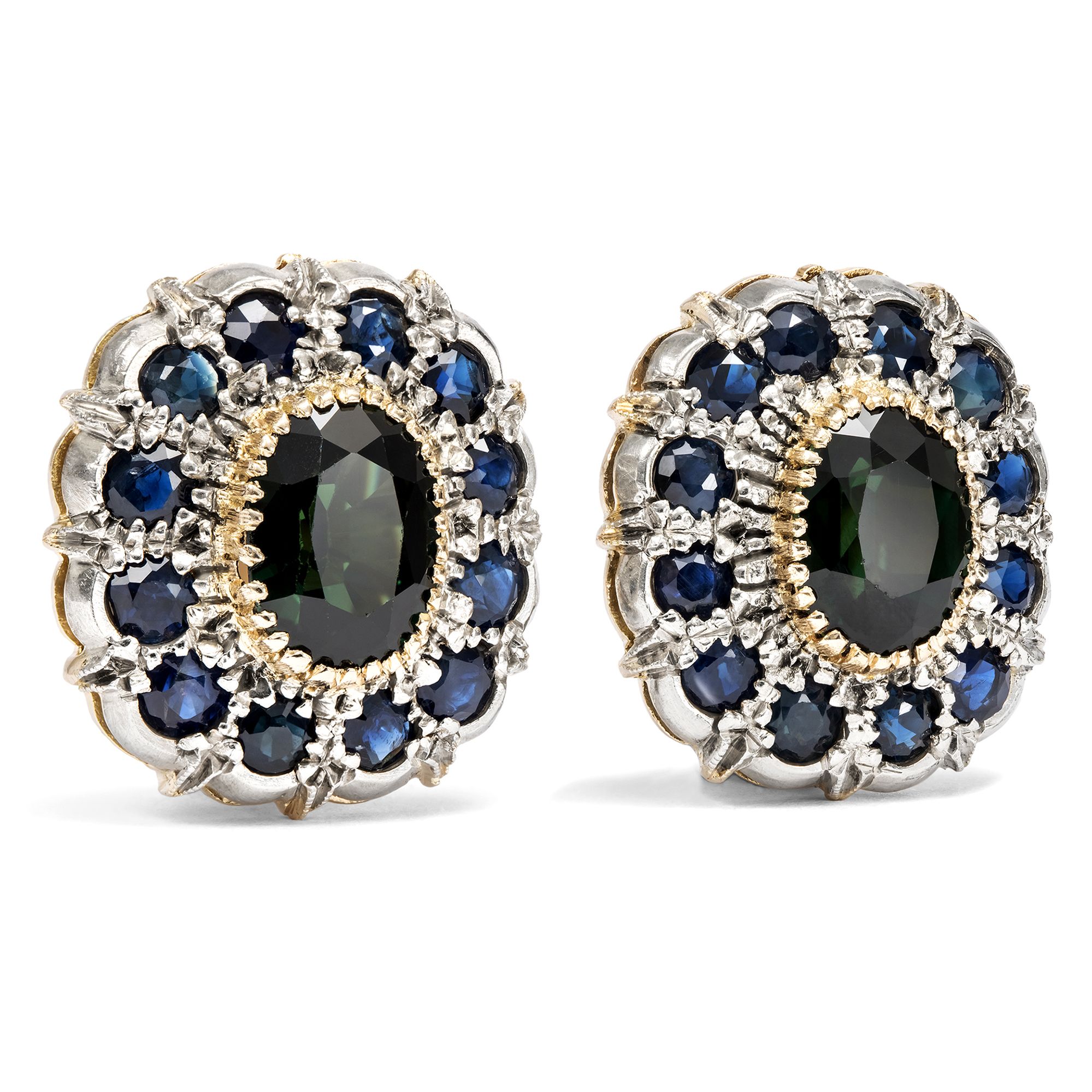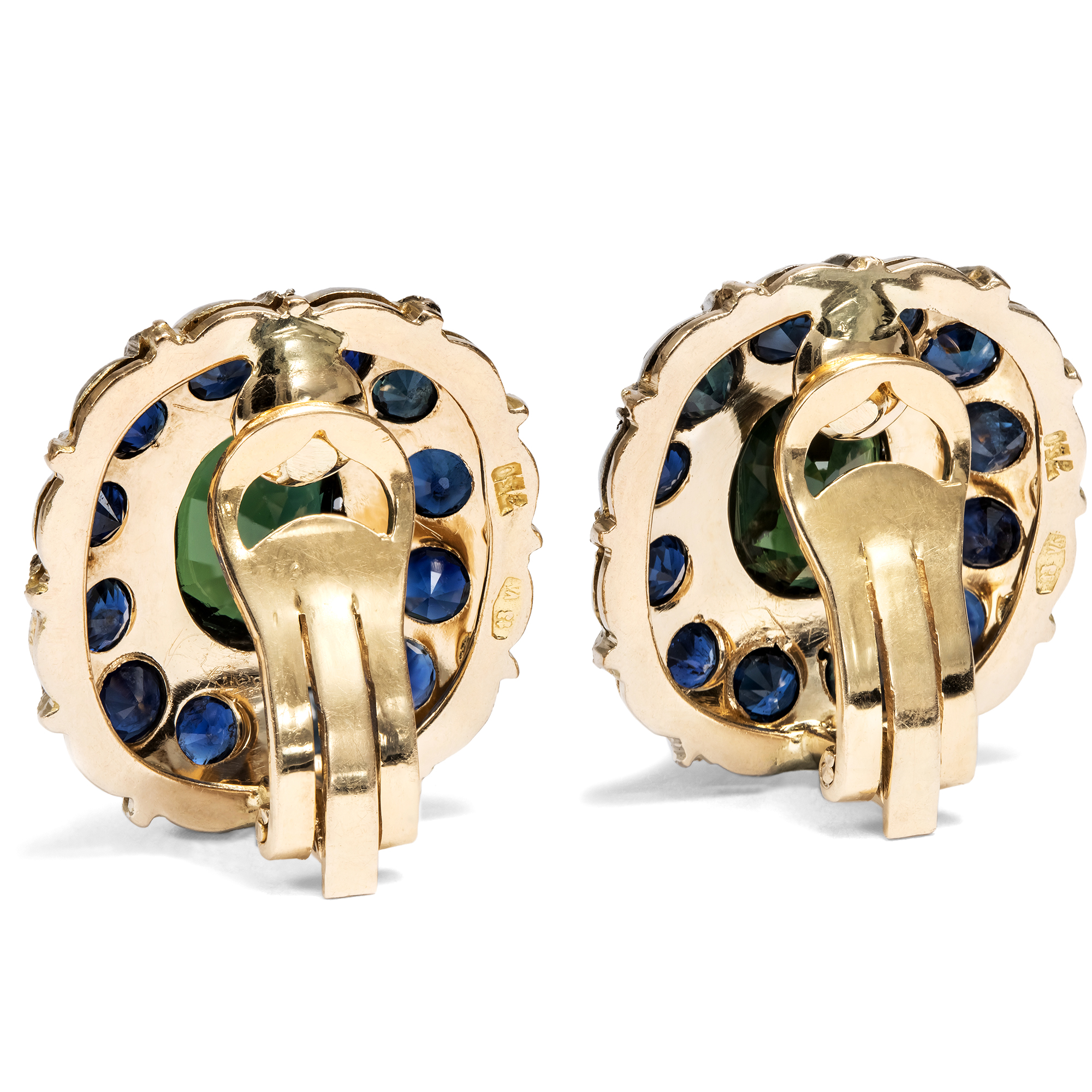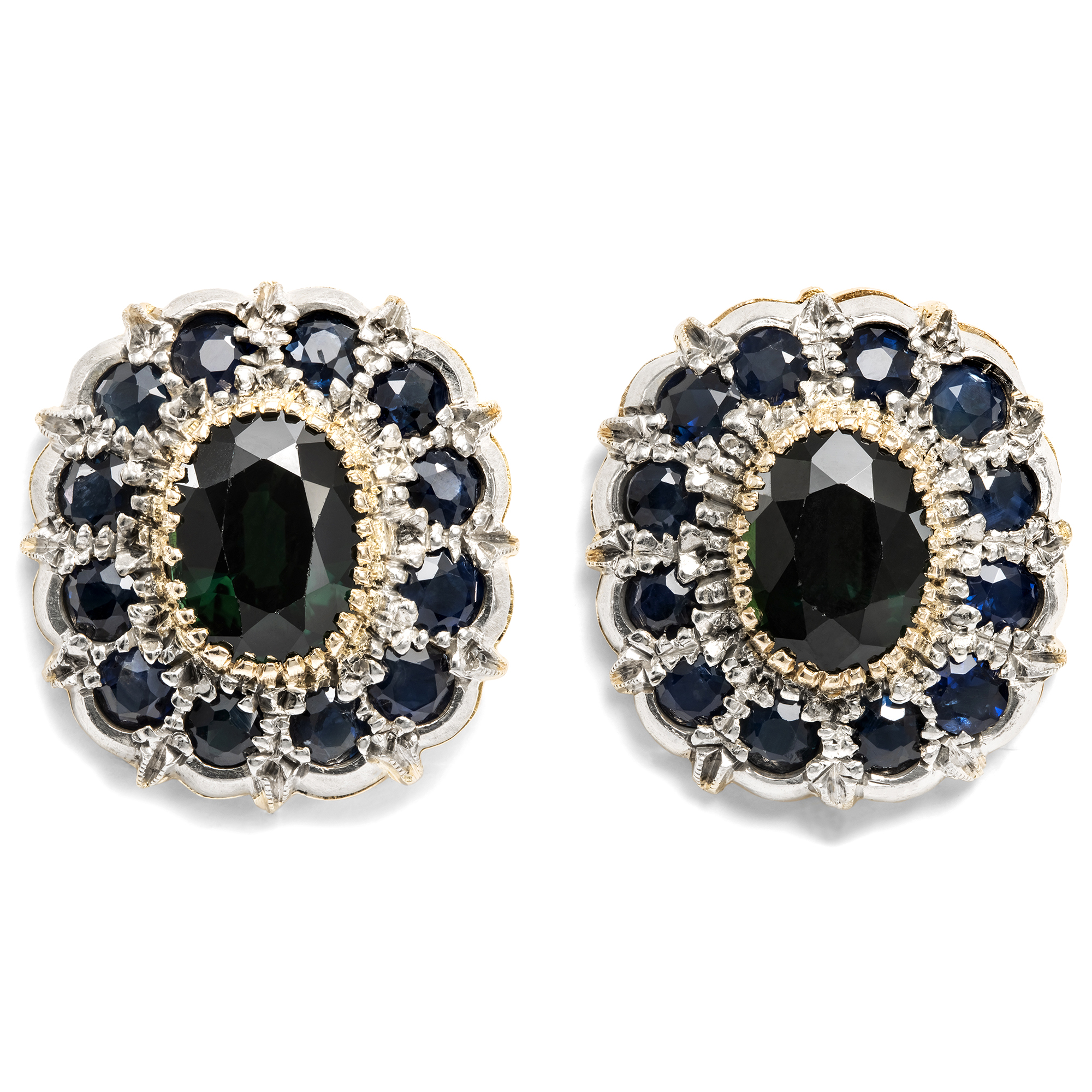 In den Mittelmeerländern wie Italien, Spanien und Portugal erlebten Schmuckformen und Verarbeitungstechniken des 19. Jahrhunderts in den Wirtschaftswunderjahren der Nachkriegszeit eine wahre Renaissance. So sind auch die hier vorliegenden Ohrclips ganz bewusst in Anleihe an die Formen der Belle Époque gestaltet, jener „schönen Epoche” vor den Ausbrüchen der beiden großen Kriege. Die Ohrclips fassen in Schauseiten aus Silber insgesamt 26 Saphire. Um einen größeren Saphir in der Mitte sind dabei je zwölf kleinere Saphire wie Blütenblätter arrangiert. Der Stein in der Mitte ist in Gelbgold gefasst und geheimnisvoll dunkel. Im Durchlicht erscheint seine Farbe grünlich. Die kleineren Steine sind heller, sie leuchten in einem dunklen Blau. Die Rückseiten der Ohrclips bestehen aus hochkarätigem Gold. Die Punzen auf der Rückseite verraten, dass die Ohrclips in Italien, in den Jahren zwischen 1944 und 1968 entstanden sind, in der Werkstatt von Maria Socci in Gallarate bei Mailand. Die Ohrclips sind eindrucksvoll und hellen den Alltag mit italienischer Lebensfreude auf. Zu uns kam das Paar hier in Berlin.