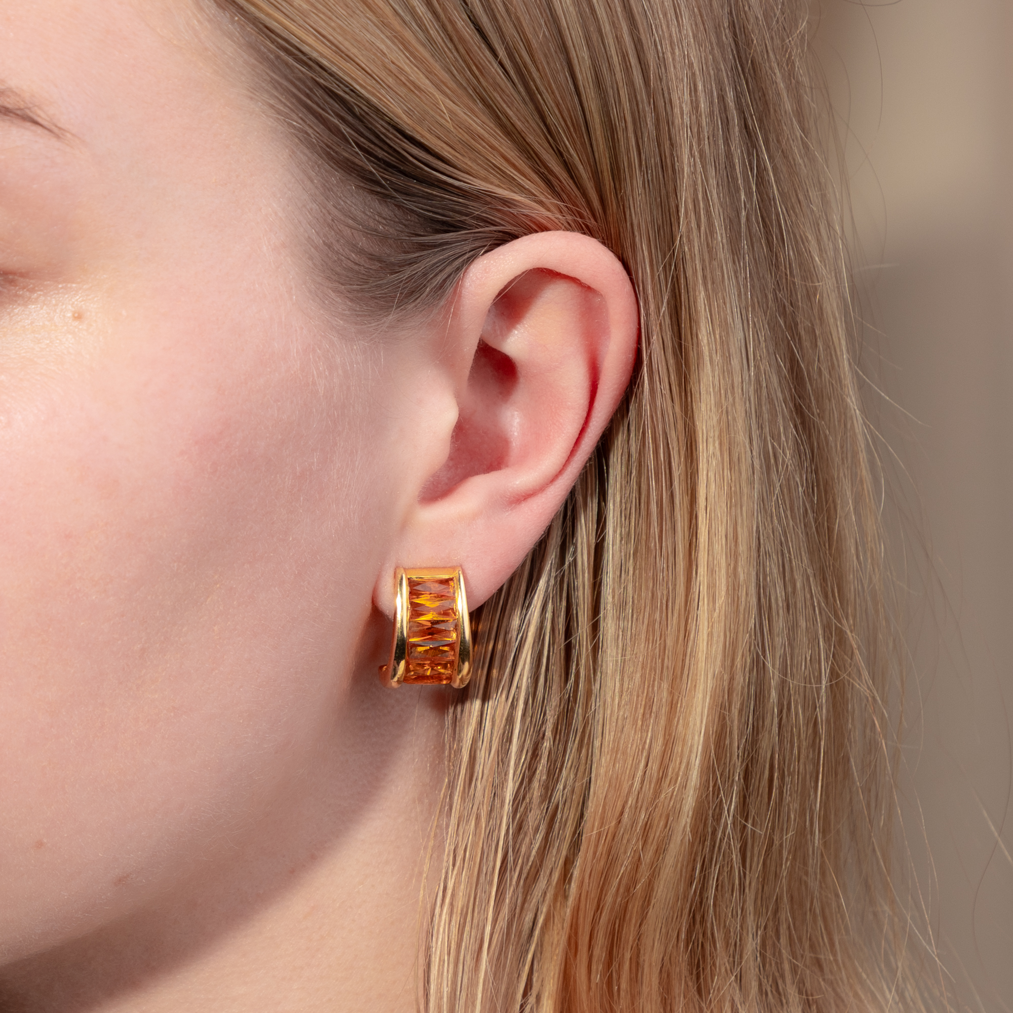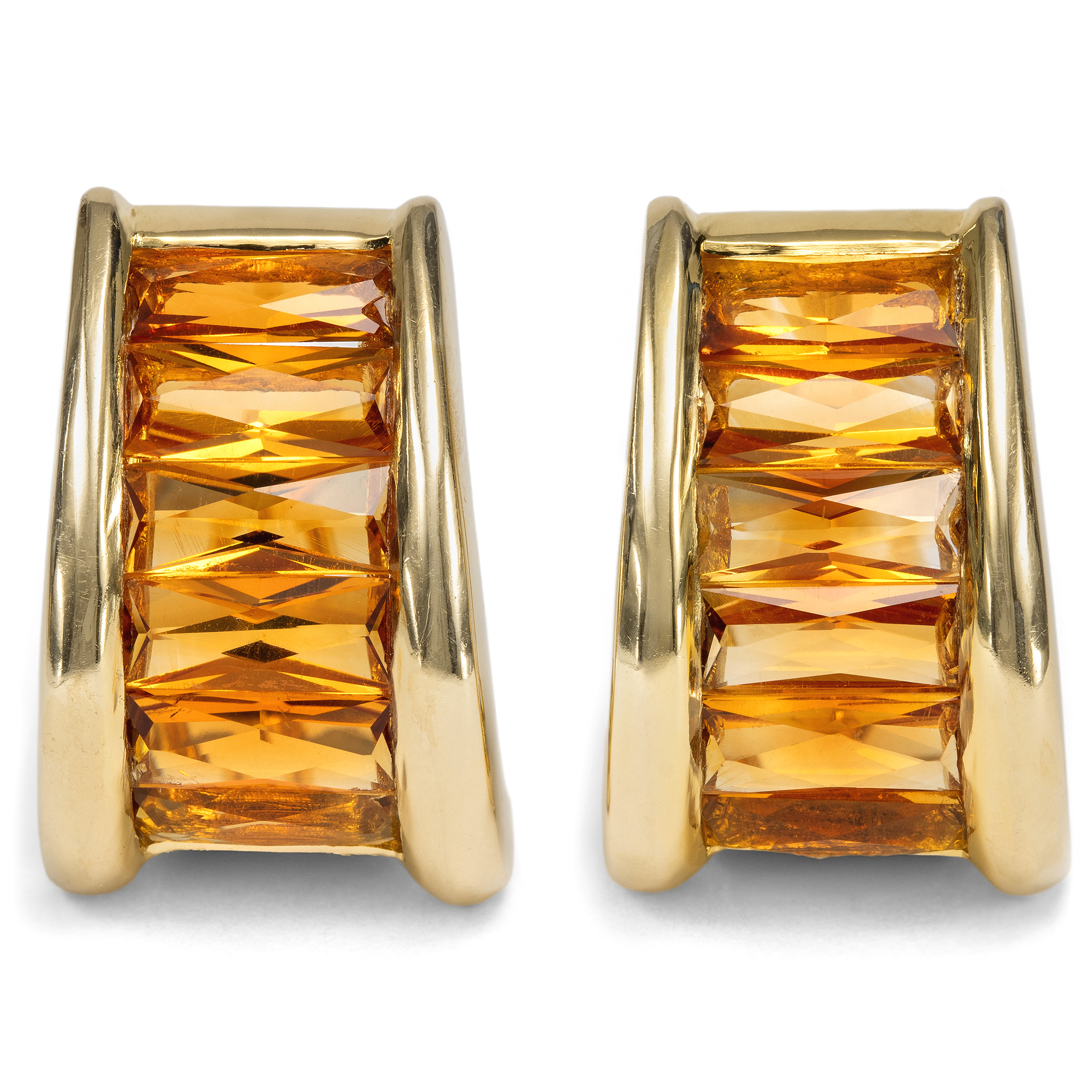 Diese vintage Ohrringe tragen das Licht des Sommers in sich: Fünf facettierte Citrine sind jeweils dicht an dicht gefasst und bilden ein lebendiges Band aus warmen Gelb- und Honigtönen. Je nach Lichteinfall changieren die Edelsteine zwischen zartem Zitronengelb, sattem Gold und einem leicht bernsteinfarbenen Schimmer. Insgesamt bringen sie etwa 5 Karat auf die Waage. Der Citrin, passender Weise benannt nach dem französischen „citron“ für Zitrone, kommt in diesem Paar Ohrringe mit praktischen Omega-Brisuren gut zur Geltung: Die facettierten Steine reflektieren das einfallende Licht in warmen Nuancen. Dabei sind sie in 14-karätigem Gold gefasst, dessen Farbton das Farbspiel der Steine harmonisch aufnimmt und unterstreicht. Die leicht gewölbte Form der Ohrringe sorgt dafür, dass sich das Licht über die gesamte Fläche bewegen kann. So entsteht ein lebendiger Effekt, der die Ohrringe bei jeder Bewegung zum Funkeln bringt. Entstanden ist dieses schöne Paar um 1990. Ein Paar für alle, die Farbe lieben und die sich ein Stück Sommer ganz einfach anlegen möchten. Zu uns kamen die Ohrringe aus einem vornehmen Haushalt in München.