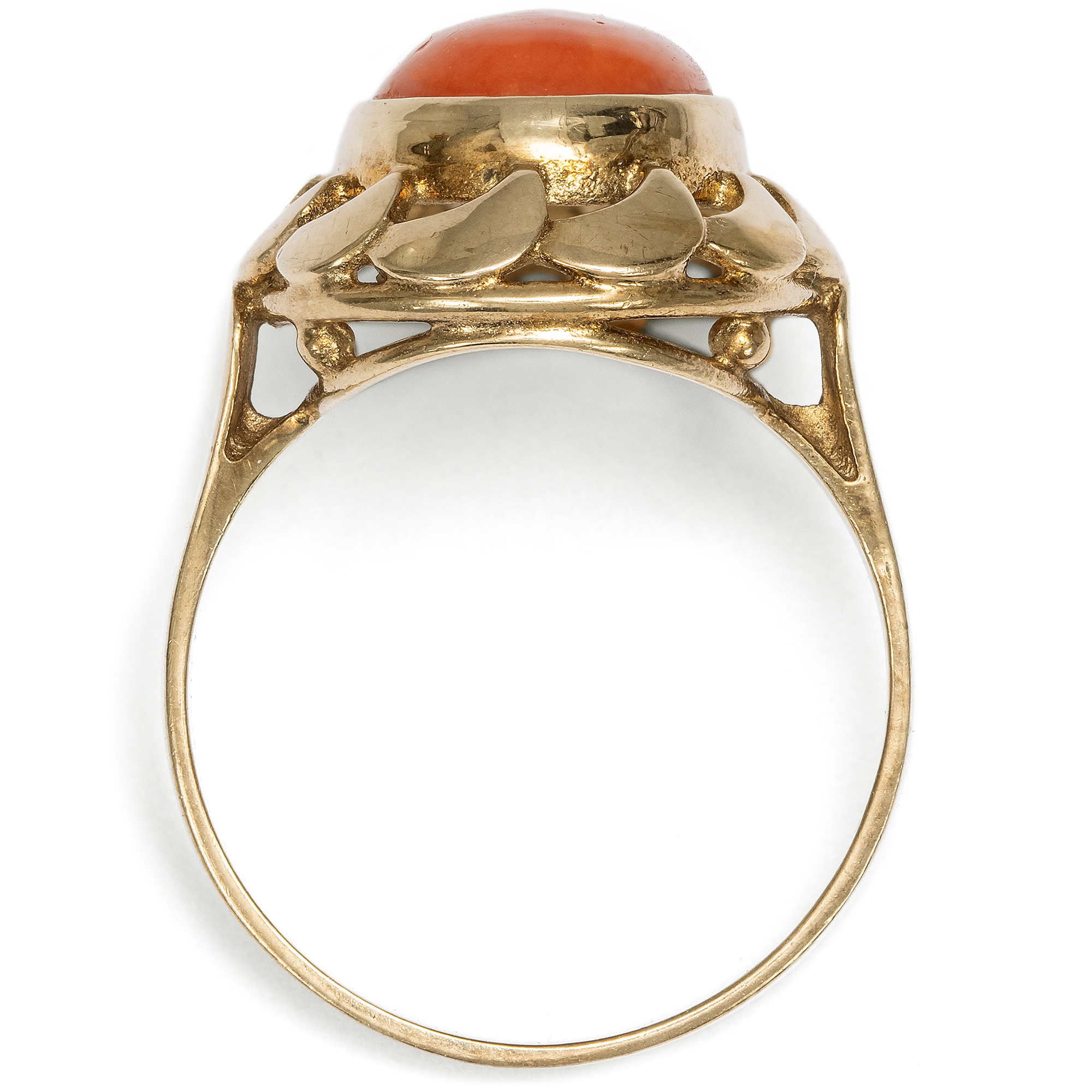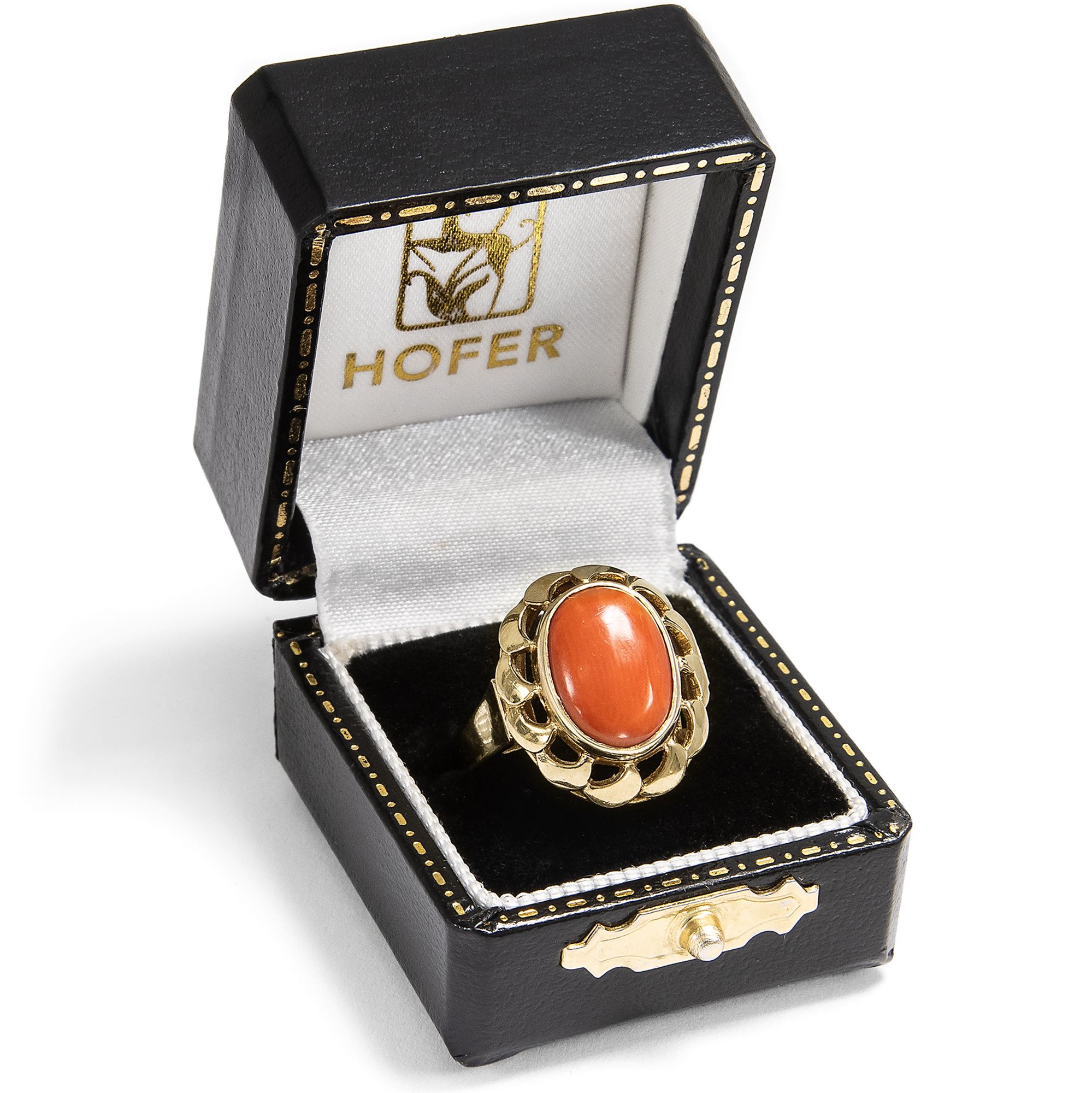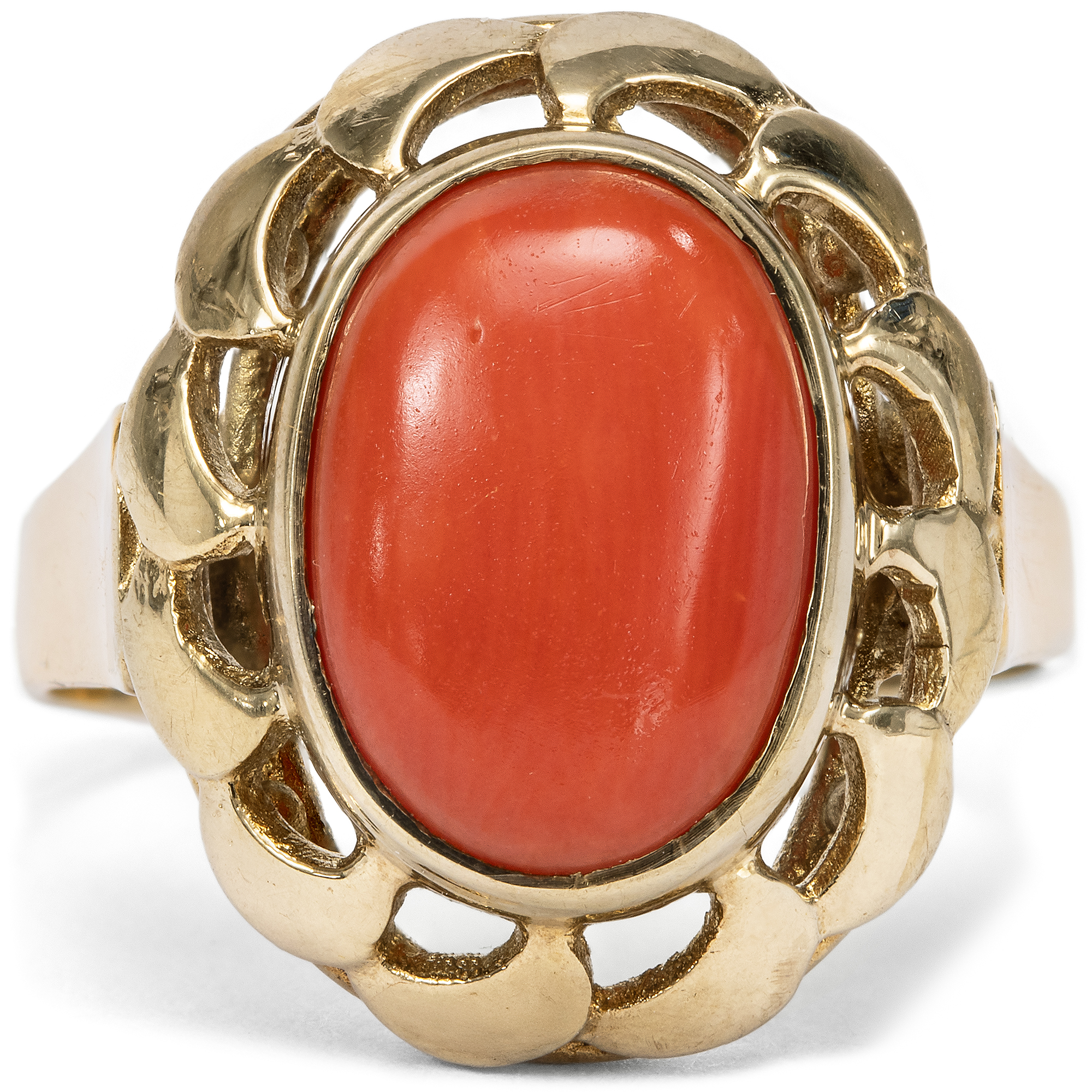 Schmuck aus Koralle hat eine jahrhundertealte Tradition. Schon die alten Römer schmückten sich mit kunstvoll geschnitzten Stücken aus der tiefroten Mittelmeerkoralle, die vor der Küste von Neapel in reichen Mengen geerntet werden konnte. Kein Wunder also, dass gerade zu Füßen des Vesuvs eine hochspezialisierte Handwerkstradition entstand, deren Meister die Schätze des Meeres bis heute in kunstvolle Kreationen verwandeln. Eine wahre Blüte erlebte die Korallenverarbeitung im 19. Jahrhundert. Zahlreiche Reisende aus ganz Europa besuchten in jenen Jahren Neapel, die Grabungsstätten in Pompeji und Herkulaneum, die Insel Capri und die Amalfiküste. Schmuck aus Koralle war ein beliebtes Souvenir, das vor Ort gekauft wurde. Doch auch in den europäischen Metropolen wurden Mittelmeerkorallen von den Juwelieren importiert, verarbeitet und gehandelt. 1851 etwa erregte der Stand des Londoner Juweliers Robert Phillips auf der Weltausstellung in London mit einer spektakulär großen Auswahl italienischer Korallen großes Aufsehen, von der große Teile vom heutigen Victoria and Albert Museum übernommen wurden. Und noch bis in unsere Tage hält sich die Begeisterung für die farbenfrohen Varianten der Koralle, und Deutschland scheint eine ganz besondere Beziehung zu diesen Meeresschätzen zu haben. Besonders Reisende der Wirtschaftswunderzeit brachten Korallen aus Italien mit, die eine Erinnerung an einen schönen Sommerurlaub sein konnten. Der hier vorliegende Ring ist in den Jahren um 1960 entstanden und präsentiert eine große italienische Mittelmeerkoralle in einer dekorativen Goldfassung. Plastische Schwünge lassen den Ringkopf wie eine Blüte erscheinen. Die Koralle in intensivem Rot ist zu einem ovalen Cabochon geschliffen. Der Ring fand hier in Berlin zu uns und ist sehr gut erhalten.