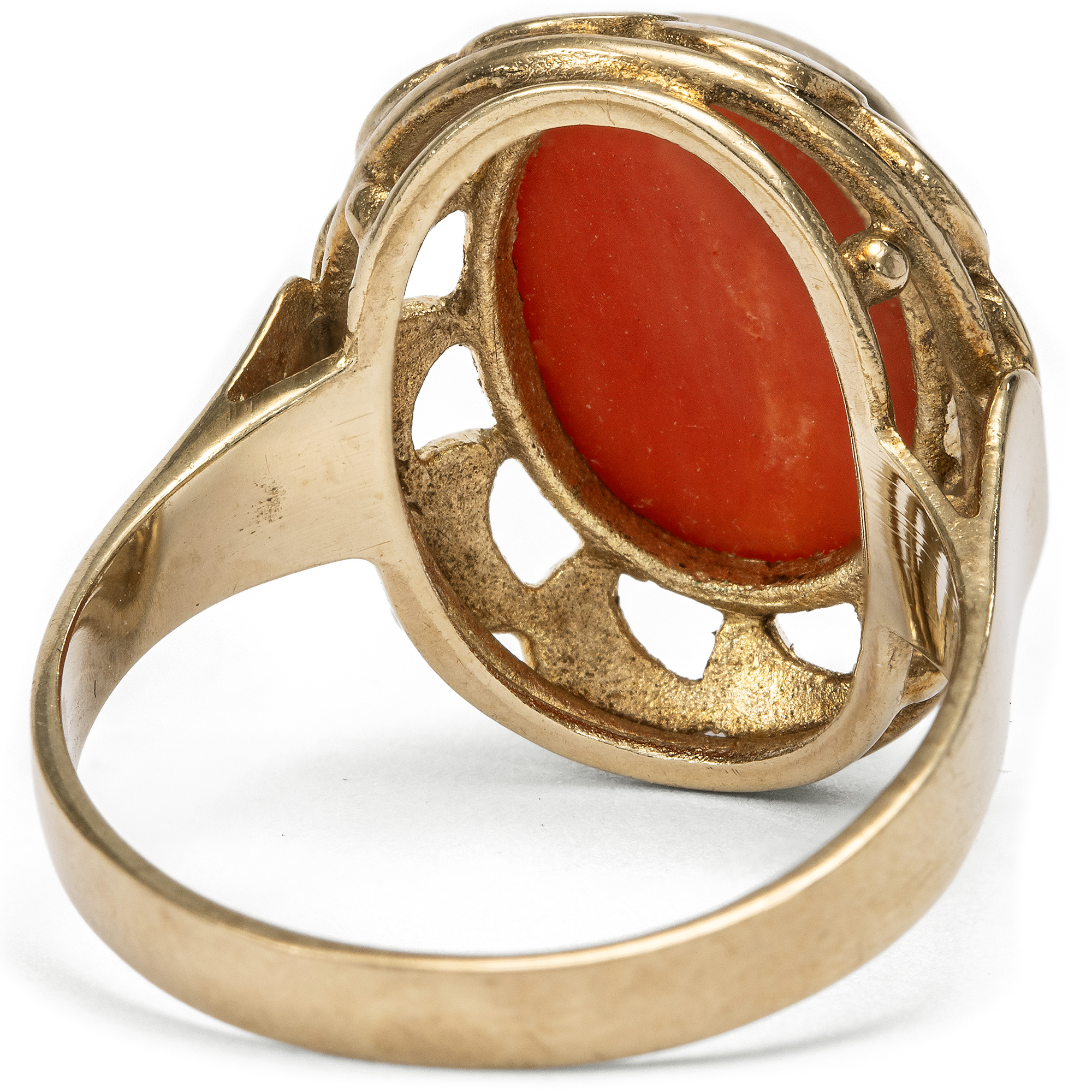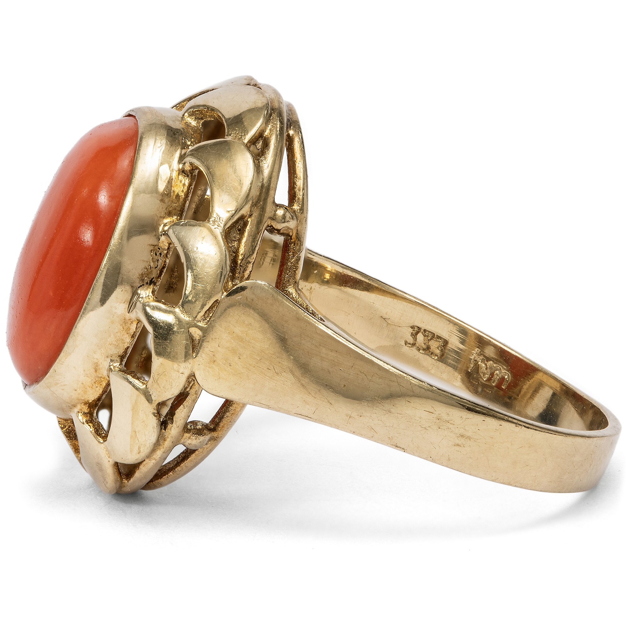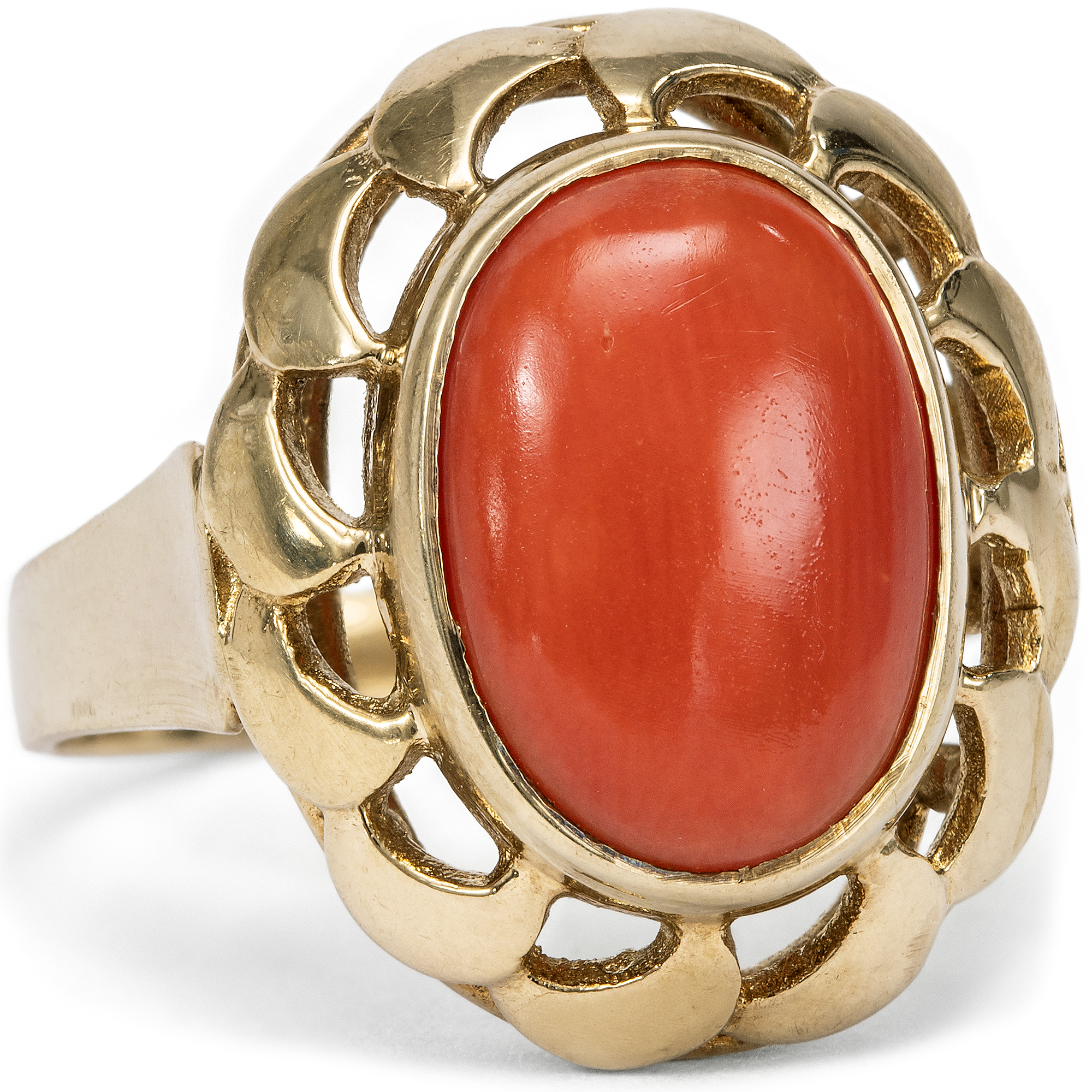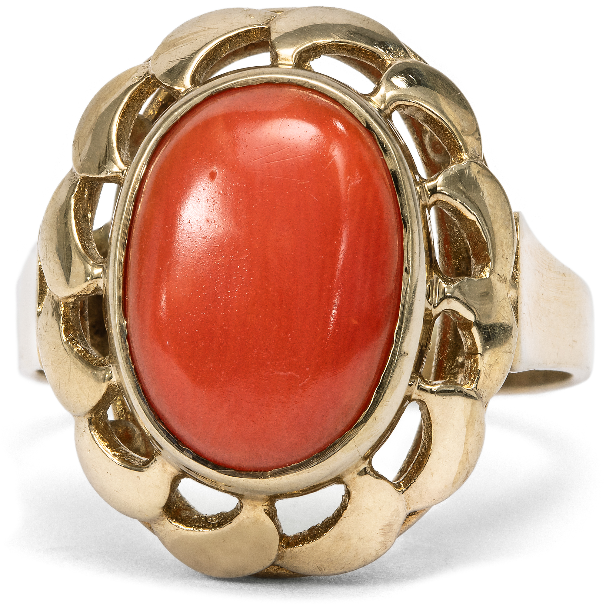 Schmuck aus Koralle hat eine jahrhundertealte Tradition. Schon die alten Römer schmückten sich mit kunstvoll geschnitzten Stücken aus der tiefroten Mittelmeerkoralle, die vor der Küste von Neapel in reichen Mengen geerntet werden konnte. Kein Wunder also, dass gerade zu Füßen des Vesuvs eine hochspezialisierte Handwerkstradition entstand, deren Meister die Schätze des Meeres bis heute in kunstvolle Kreationen verwandeln. Eine wahre Blüte erlebte die Korallenverarbeitung im 19. Jahrhundert. Zahlreiche Reisende aus ganz Europa besuchten in jenen Jahren Neapel, die Grabungsstätten in Pompeji und Herkulaneum, die Insel Capri und die Amalfiküste. Schmuck aus Koralle war ein beliebtes Souvenir, das vor Ort gekauft wurde. Doch auch in den europäischen Metropolen wurden Mittelmeerkorallen von den Juwelieren importiert, verarbeitet und gehandelt. 1851 etwa erregte der Stand des Londoner Juweliers Robert Phillips auf der Weltausstellung in London mit einer spektakulär großen Auswahl italienischer Korallen großes Aufsehen, von der große Teile vom heutigen Victoria and Albert Museum übernommen wurden. Und noch bis in unsere Tage hält sich die Begeisterung für die farbenfrohen Varianten der Koralle, und Deutschland scheint eine ganz besondere Beziehung zu diesen Meeresschätzen zu haben. Besonders Reisende der Wirtschaftswunderzeit brachten Korallen aus Italien mit, die eine Erinnerung an einen schönen Sommerurlaub sein konnten. Der hier vorliegende Ring ist in den Jahren um 1960 entstanden und präsentiert eine große italienische Mittelmeerkoralle in einer dekorativen Goldfassung. Plastische Schwünge lassen den Ringkopf wie eine Blüte erscheinen. Die Koralle in intensivem Rot ist zu einem ovalen Cabochon geschliffen. Der Ring fand hier in Berlin zu uns und ist sehr gut erhalten.