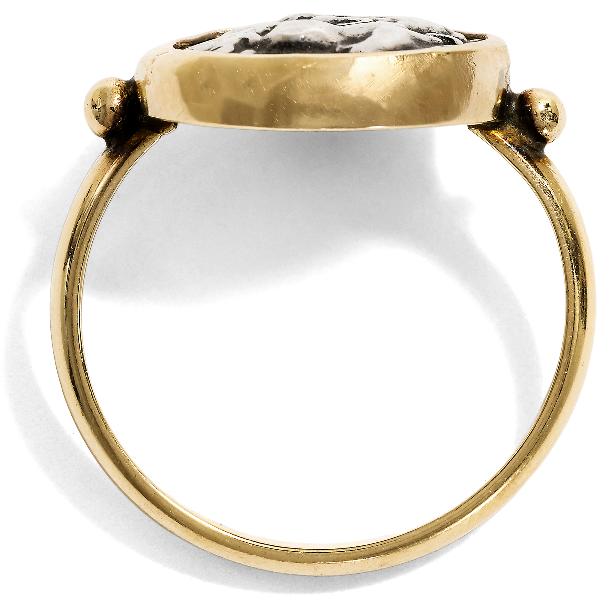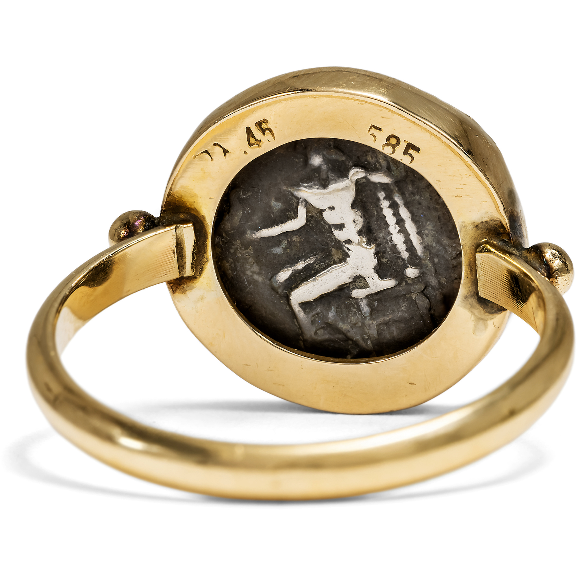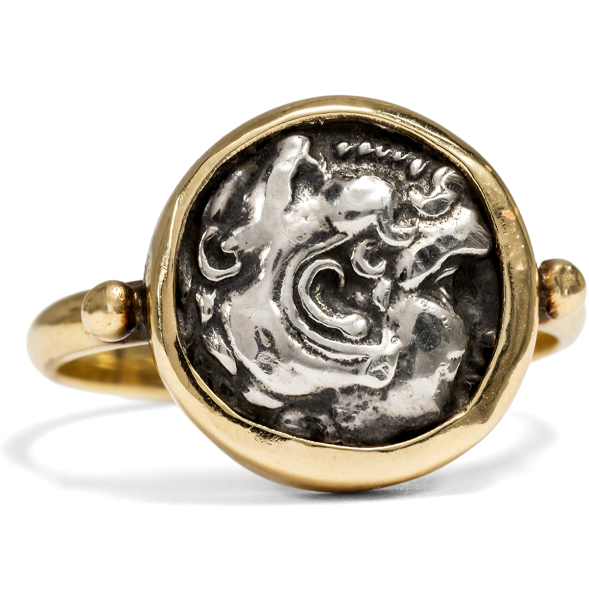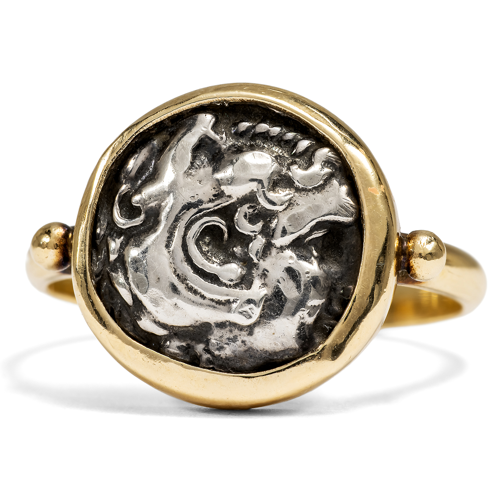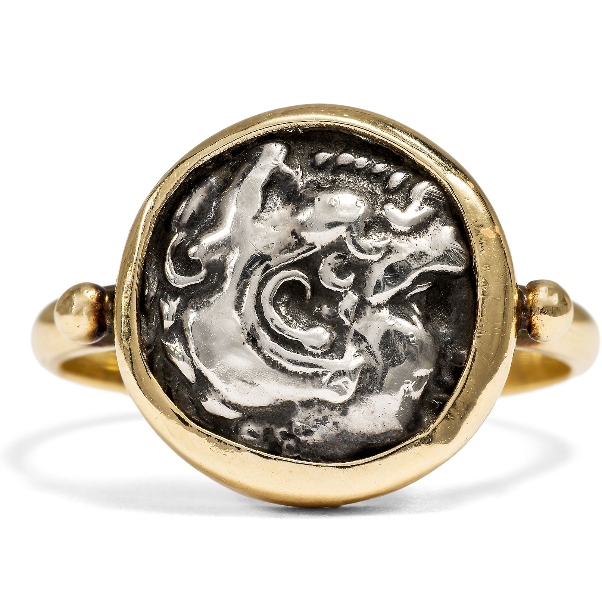 Ein echtes Objekt der Antike zu besitzen erscheint auf den ersten Blick abwegig: Dinge, die wir gewohnt sind, im Museum zu bewundern, selbst daheim zu beherbergen? Im Fall von antiken Münzen ist dies tatsächlich möglich. Diese Objekte wurden vor 2000 Jahren in so großer Zahl geprägt, dass sich bis heute so viele Exemplare erhalten haben, die nicht alle im Museum aufbewahrt werden müssen. Der hier vorliegende Goldring fasst eine solche antike Münze, eine silberne Drachme. Drachmen dieses Typus wurden erstmals in der Regierungszeit Alexanders des Großen (336 – 323 v. Chr.) in Makedonien geprägt. Ihre Vorderseite zeigt das Profil des jugendlichen Alexanders im Löwenfell, als Herakles gewandet. Auf der Rückseite befindet sich eine Darstellung des Zeus. Der Göttervater ist thronend dargestellt und hält in seiner Rechten einen Adler. Im 3. Jahrhundert v. Chr. entstanden im Donauraum und in Südosteuropa, keltische Nachprägungen der Münzen Alexanders und seines Halbbruders Philipps III. Sie übernehmen die Grundmotive von Herakles und Zeus, reduzieren diese jedoch auf kleine, kompakte Formate und lösen die Darstellungen zunehmend in abstrakte Formen auf. So verbinden diese Prägungen mediterrane Vorbilder mit einer eigenständigen keltischen Bildsprache und spiegeln den kulturellen Austausch an den Rändern der hellenistischen Welt wider. Der Ring hält die vermutlich keltische Silberdrachme in massivem Gelbgold so gefasst, dass sie ohne Beschädigungen jederzeit wieder entnommen werden könnte. So sind der auf den Münzen dargestellte Welteroberer und olympische Gott tragbare Begleiter und zeugen von der klassischen Bildung ihrer Trägerin oder ihres Trägers.