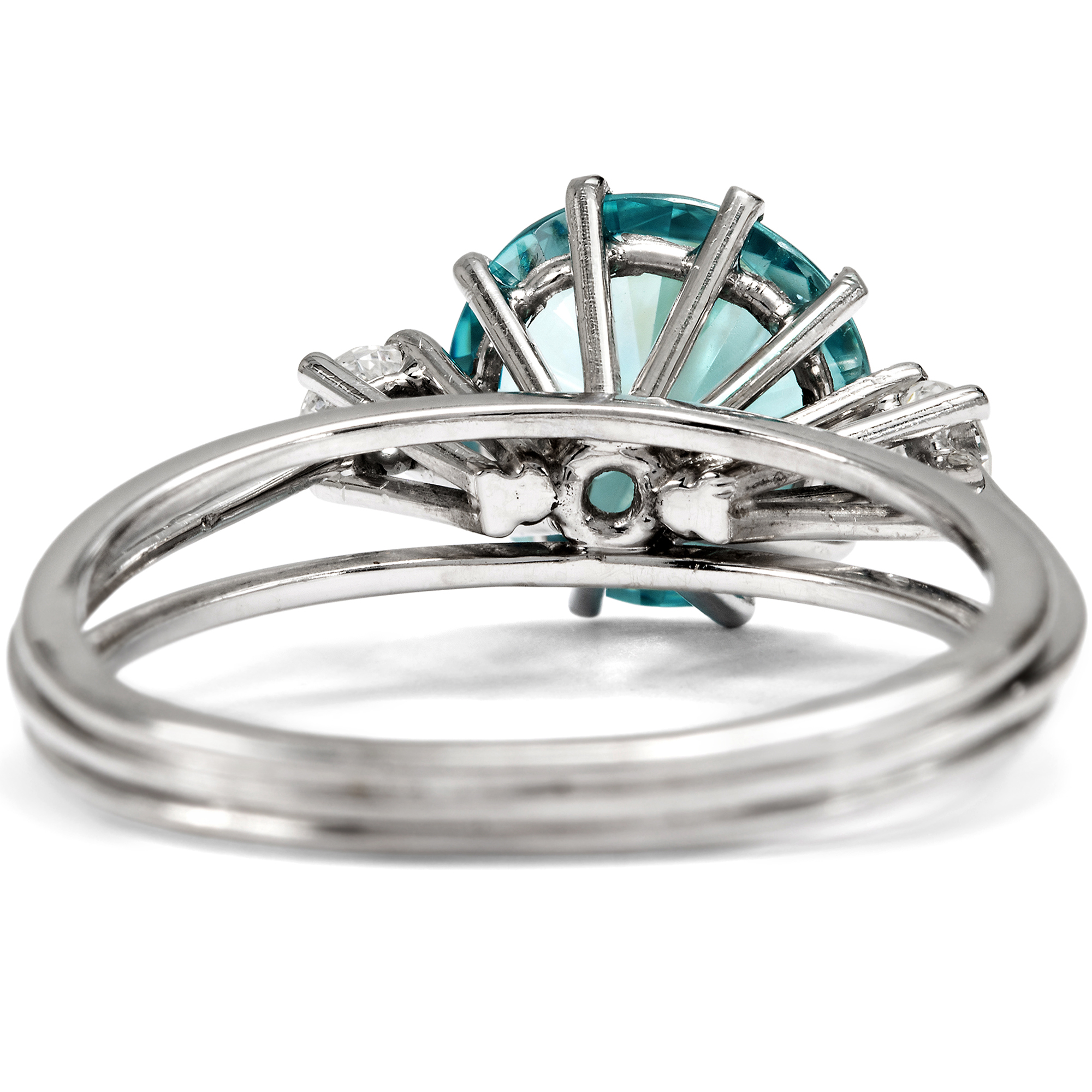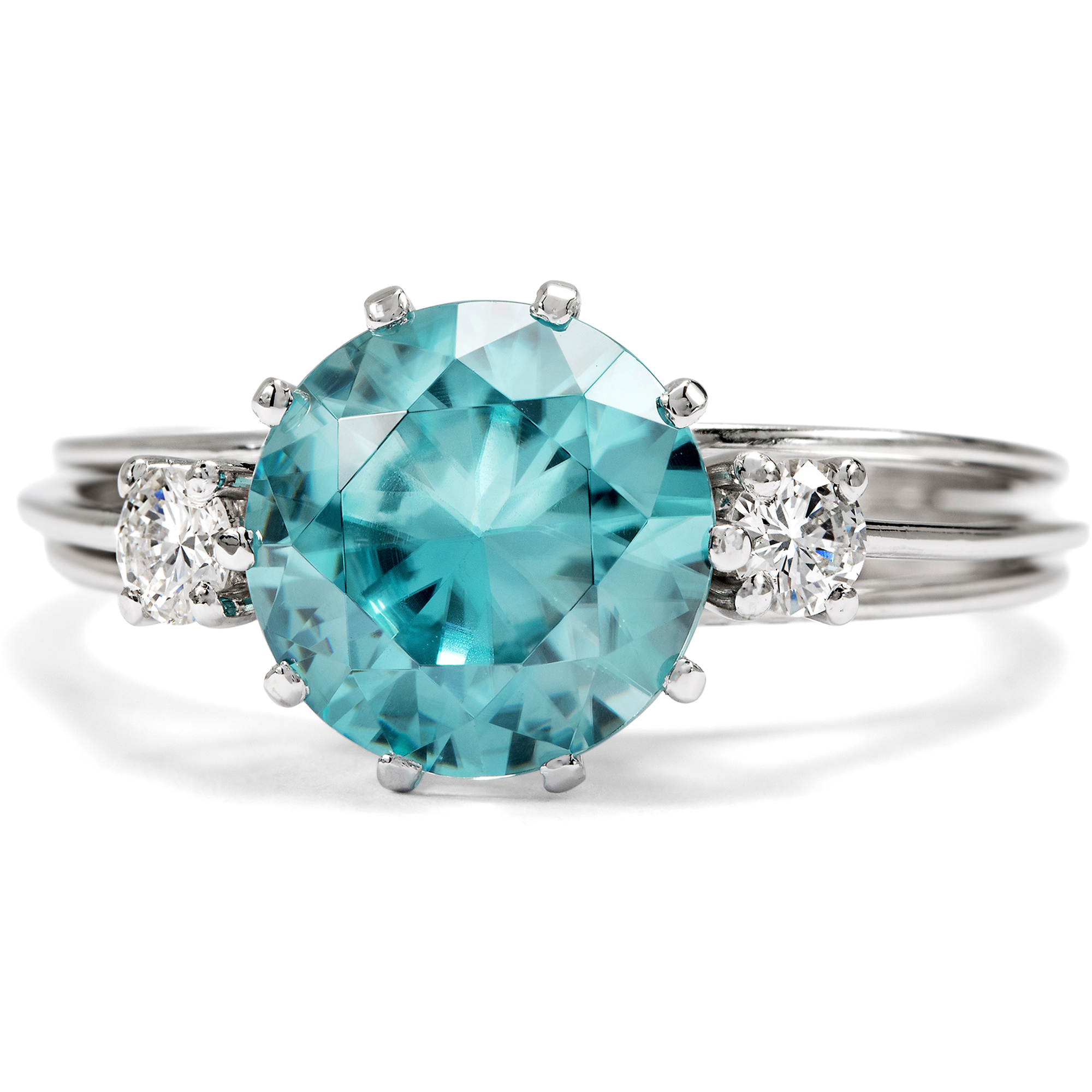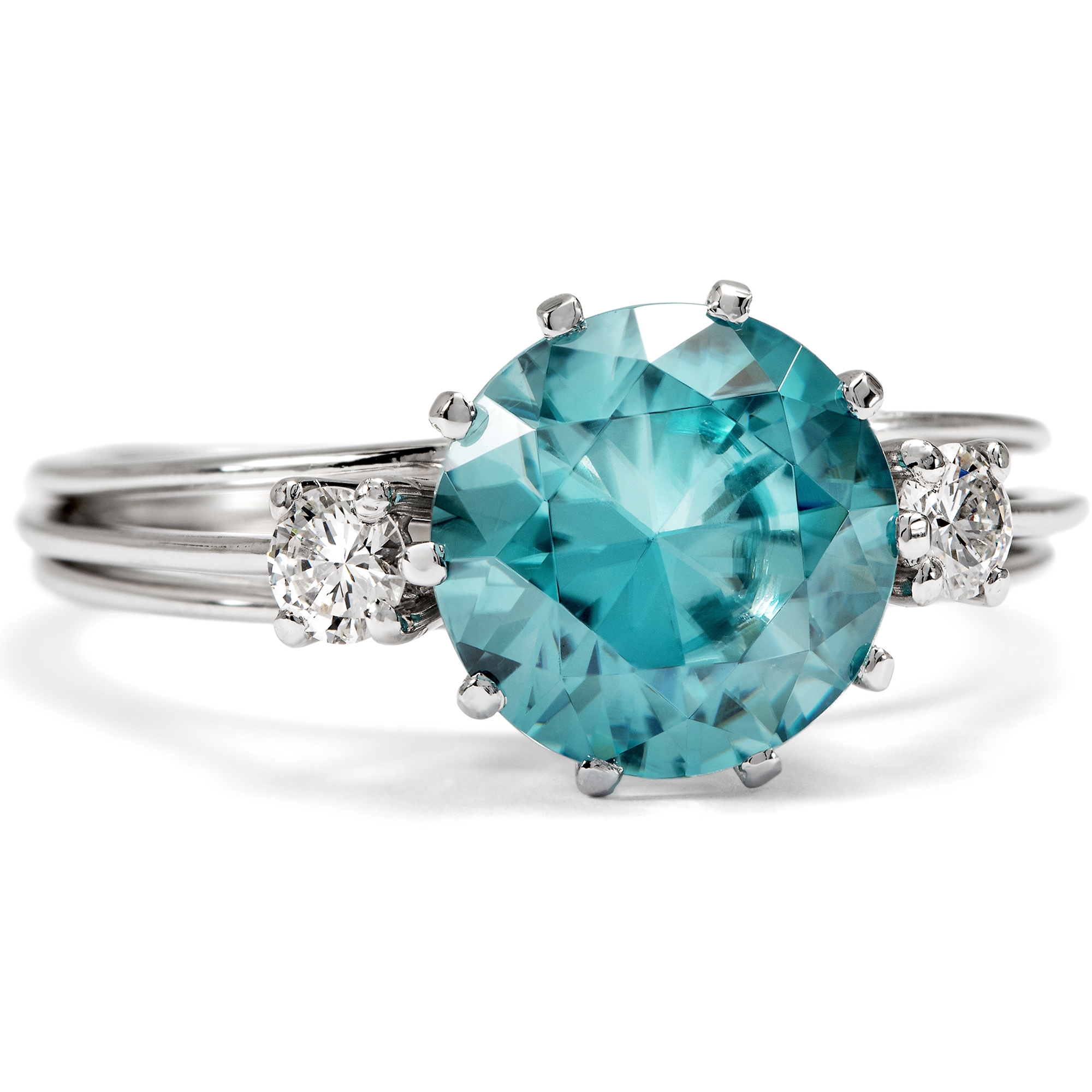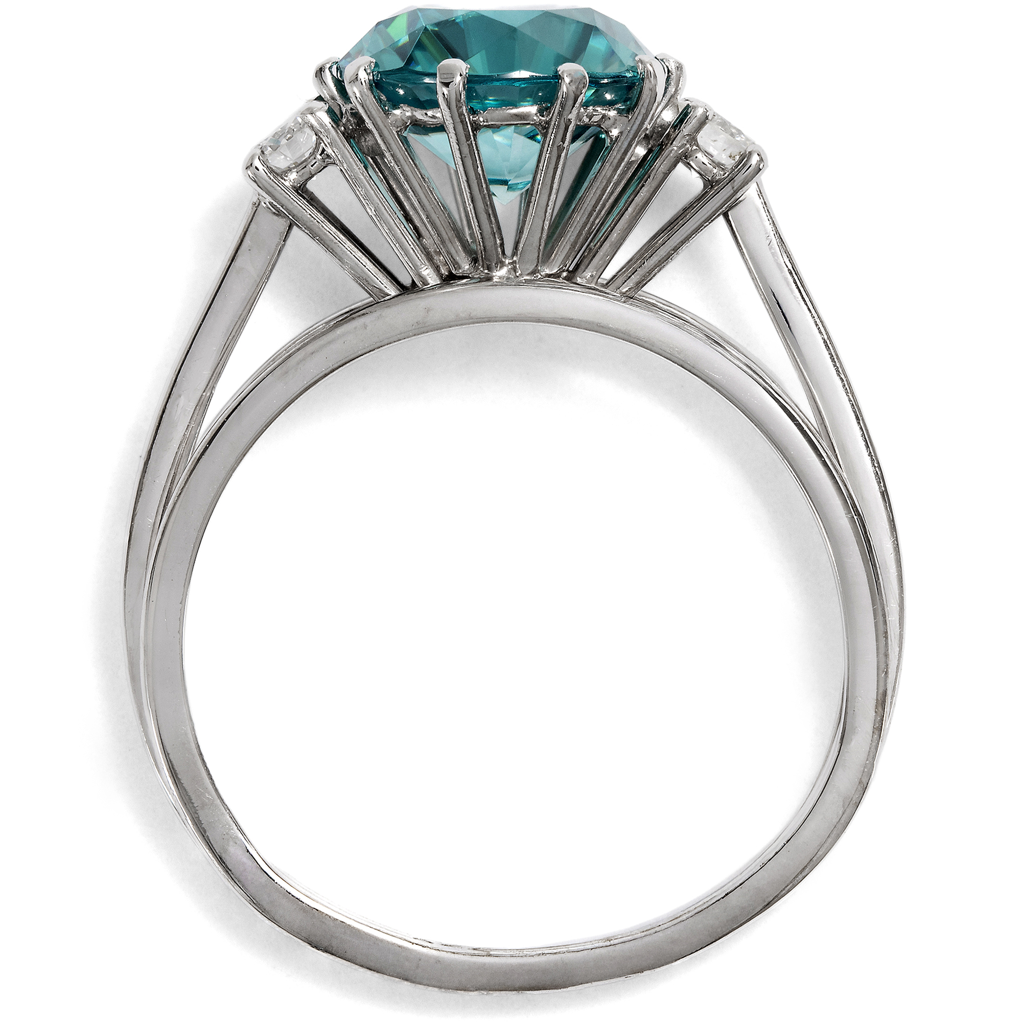 Die Zeit um 1970 war eine spannungsreiche Zeit. Auf der einen Seite Raumfahrt, technische Innovationen, wissenschaftlicher Fortschritt – auf der anderen die Nachklänge des Goldenen Zeitalters von Hollywood und natürlich der Jet Set, wie ihn der berühmte Fotograf Slim Aarons porträtierte: mondäne Damen mit großen Hüten, die an den Pools ihrer weißgetünchten Villen saßen und unter Palmen Champagner tranken oder auf Yachten die Côte d’Azur bereisten. Zwischen diesen Polen schwankt auch der vorliegende Ring, der uns einen ungewöhnlich großen Zirkon mit einer Begleitung aus Brillanten darbietet. Seine Farbe erinnert an die der leuchtend blauen Pools, die zahllosen Facetten lassen ihn in wasserartigen Reflexen erstrahlen. Allein die Kunst des Edelsteinschliffs zu betrachten und zu bewundern, bietet dem Auge hier immer wieder neue Freude. Nicht zu verwechseln ist der Zirkon dabei mit dem preiswerten „Zirkonia“, der im Labor hergestellt wird. Echte Zirkone sind kostbare Edelsteine, wobei insbesondere die auch hier präsente blaue Farbe, „Starlit“ genannt, begehrt ist. Der glamouröse Ring ist in hochkarätigem Weißgold ausgeführt, welches den Zeitgeschmack ideal verkörpert. Die luftige, seitlich aus Stegen zusammengesetzte Unterkaderung und die drahtige Ringschiene, die ungewöhnlich zarten Krappen: All dies trägt die Impressionen des „Space Age“ hinüber in die Schmuckgestaltung. Der Ring ein besonders schönes Beispiel der Schmuckgestaltung der Zeit um 1970. Ganz in Handarbeit entstanden, ist er zudem ein unikates Juwel, das nicht nur mit hochwertigen Edelsteinen, sondern ebenfalls mit handwerklicher Finesse aufwartet. Er kam aus Hamburg zu uns.