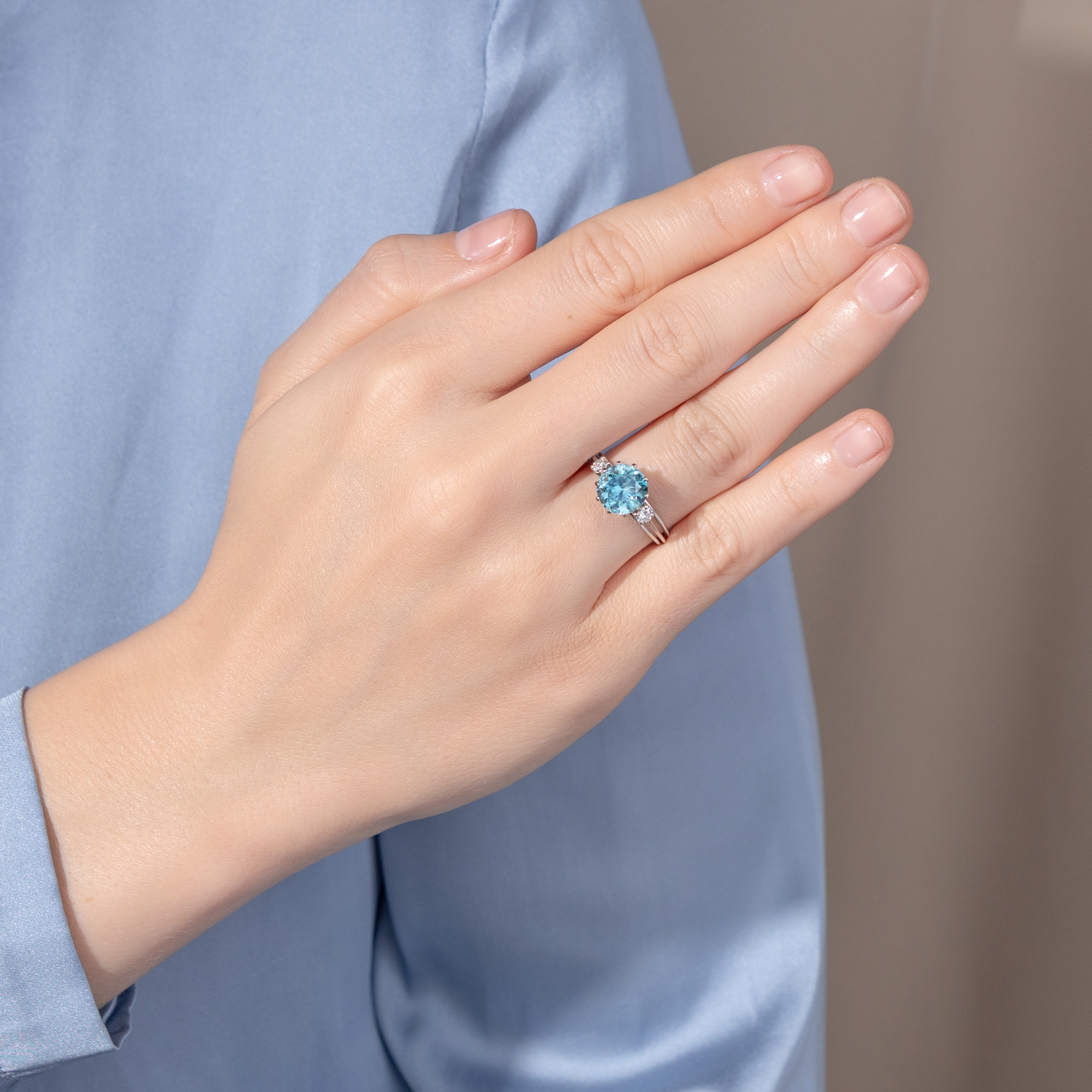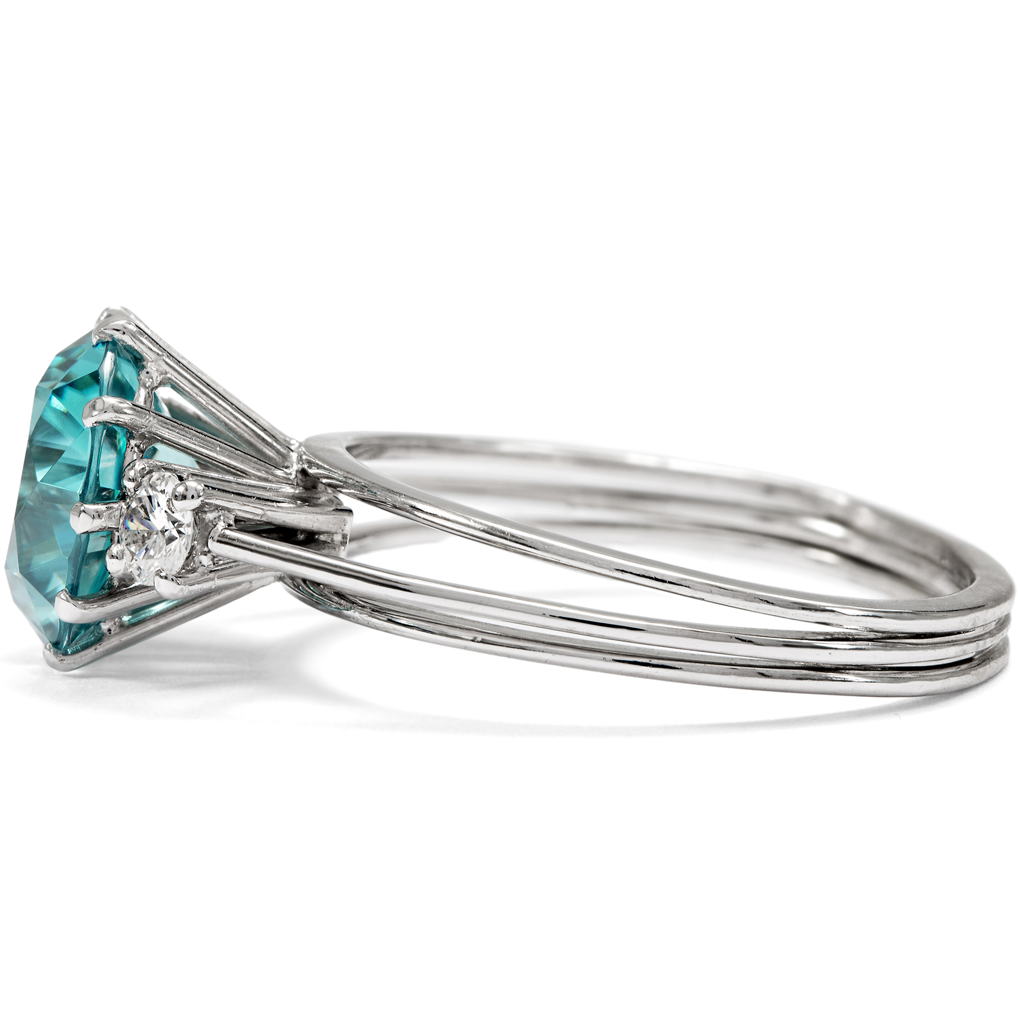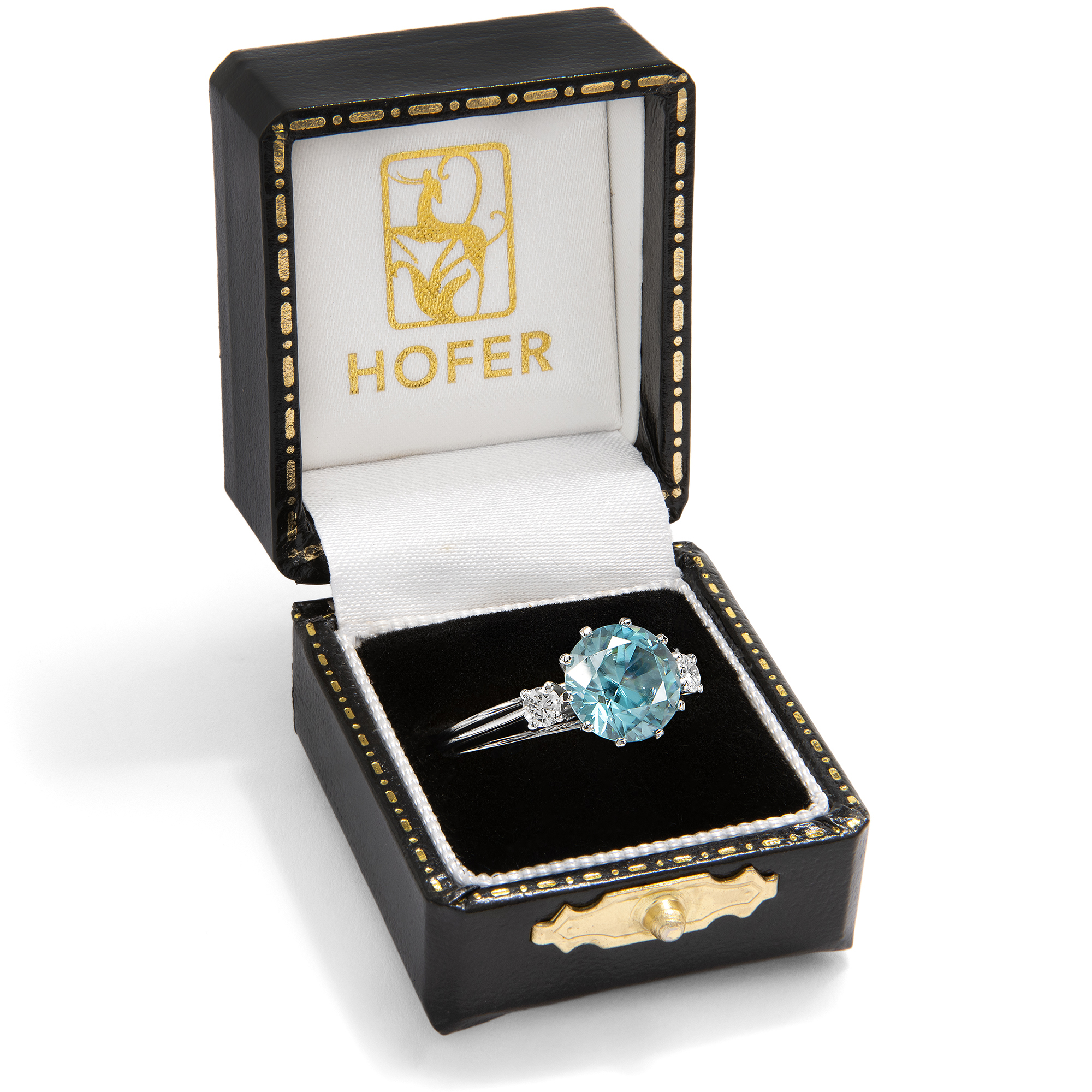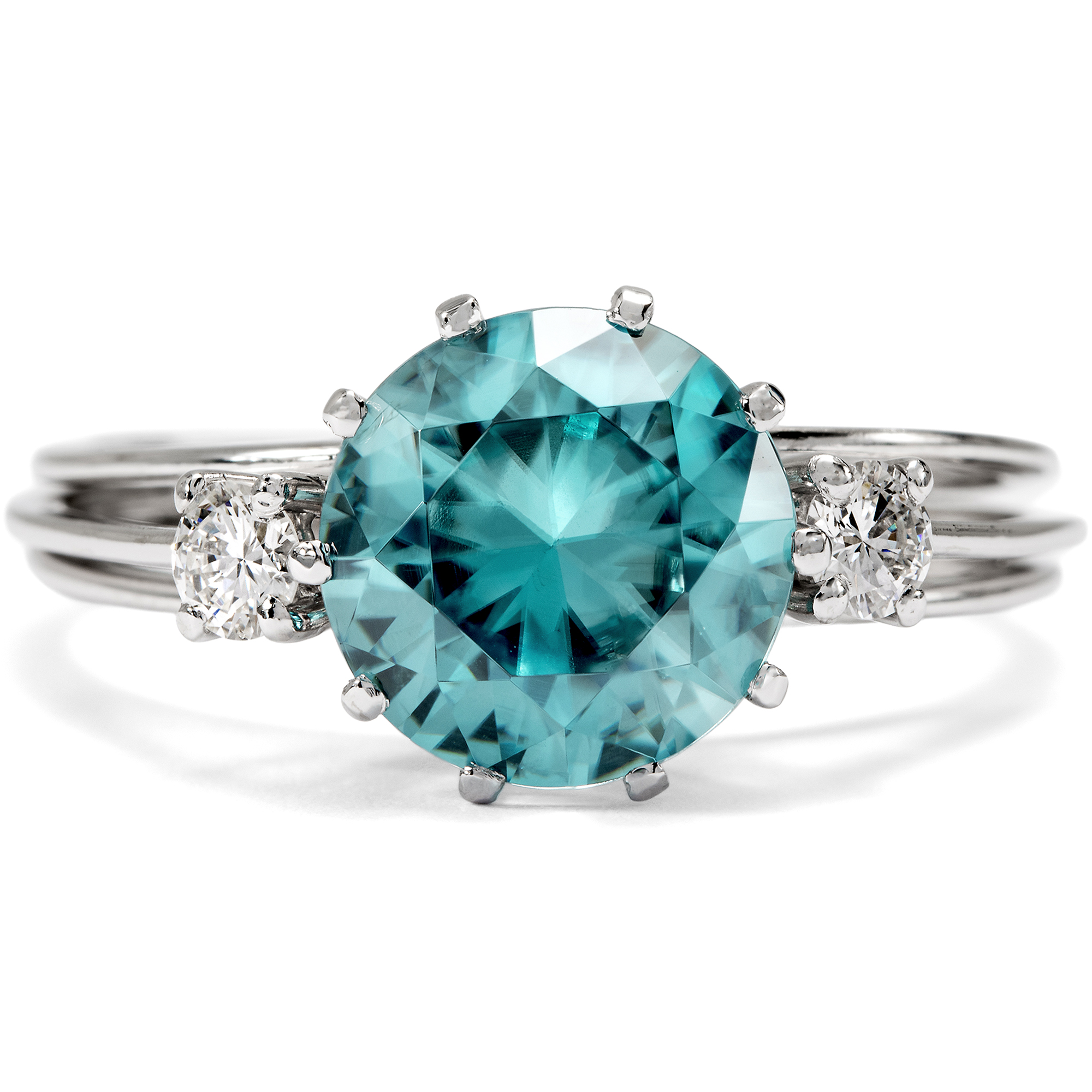 Die Zeit um 1970 war eine spannungsreiche Zeit. Auf der einen Seite Raumfahrt, technische Innovationen, wissenschaftlicher Fortschritt – auf der anderen die Nachklänge des Goldenen Zeitalters von Hollywood und natürlich der Jet Set, wie ihn der berühmte Fotograf Slim Aarons porträtierte: mondäne Damen mit großen Hüten, die an den Pools ihrer weißgetünchten Villen saßen und unter Palmen Champagner tranken oder auf Yachten die Côte d’Azur bereisten. Zwischen diesen Polen schwankt auch der vorliegende Ring, der uns einen ungewöhnlich großen Zirkon mit einer Begleitung aus Brillanten darbietet. Seine Farbe erinnert an die der leuchtend blauen Pools, die zahllosen Facetten lassen ihn in wasserartigen Reflexen erstrahlen. Allein die Kunst des Edelsteinschliffs zu betrachten und zu bewundern, bietet dem Auge hier immer wieder neue Freude. Nicht zu verwechseln ist der Zirkon dabei mit dem preiswerten „Zirkonia“, der im Labor hergestellt wird. Echte Zirkone sind kostbare Edelsteine, wobei insbesondere die auch hier präsente blaue Farbe, „Starlit“ genannt, begehrt ist. Der glamouröse Ring ist in hochkarätigem Weißgold ausgeführt, welches den Zeitgeschmack ideal verkörpert. Die luftige, seitlich aus Stegen zusammengesetzte Unterkaderung und die drahtige Ringschiene, die ungewöhnlich zarten Krappen: All dies trägt die Impressionen des „Space Age“ hinüber in die Schmuckgestaltung. Der Ring ein besonders schönes Beispiel der Schmuckgestaltung der Zeit um 1970. Ganz in Handarbeit entstanden, ist er zudem ein unikates Juwel, das nicht nur mit hochwertigen Edelsteinen, sondern ebenfalls mit handwerklicher Finesse aufwartet. Er kam aus Hamburg zu uns.