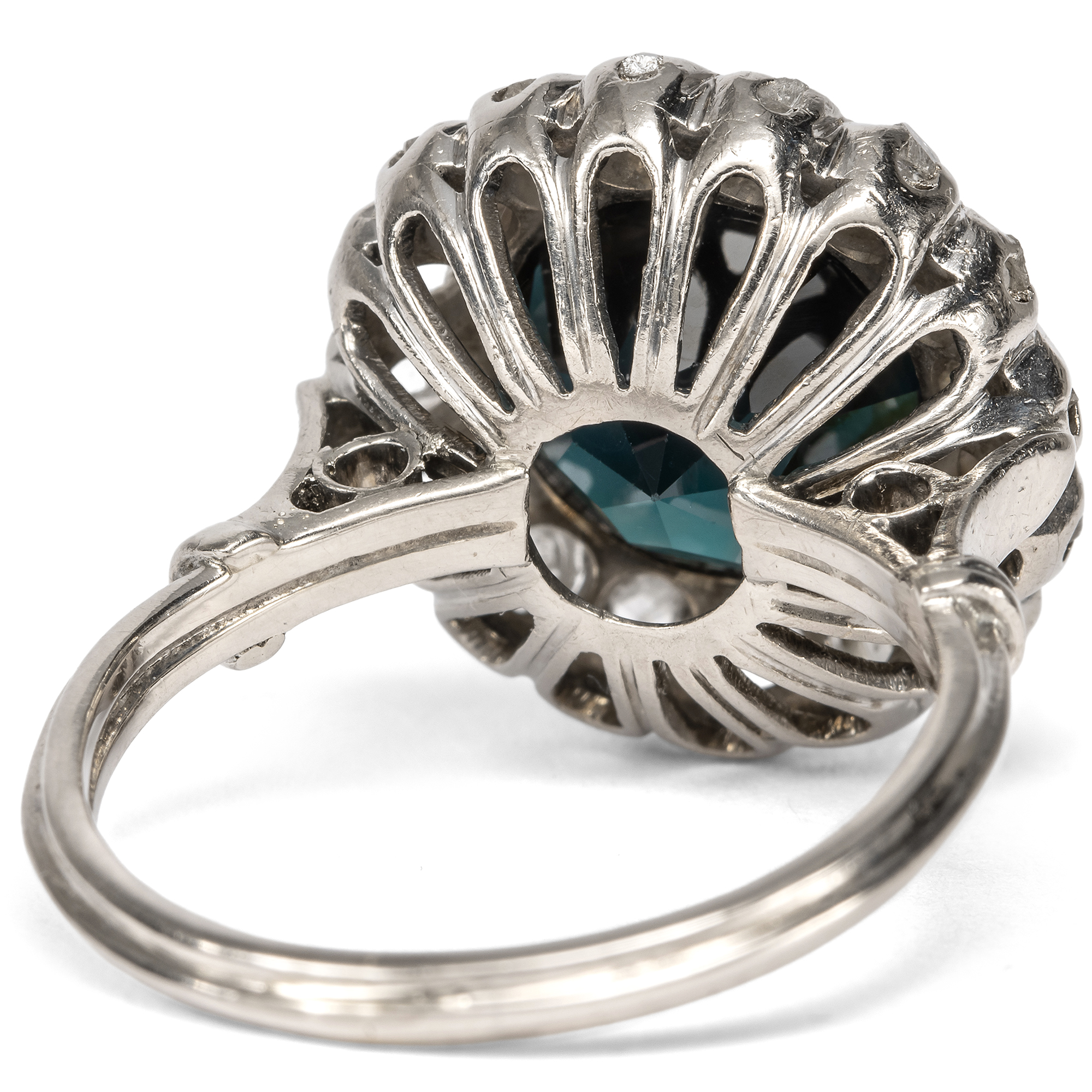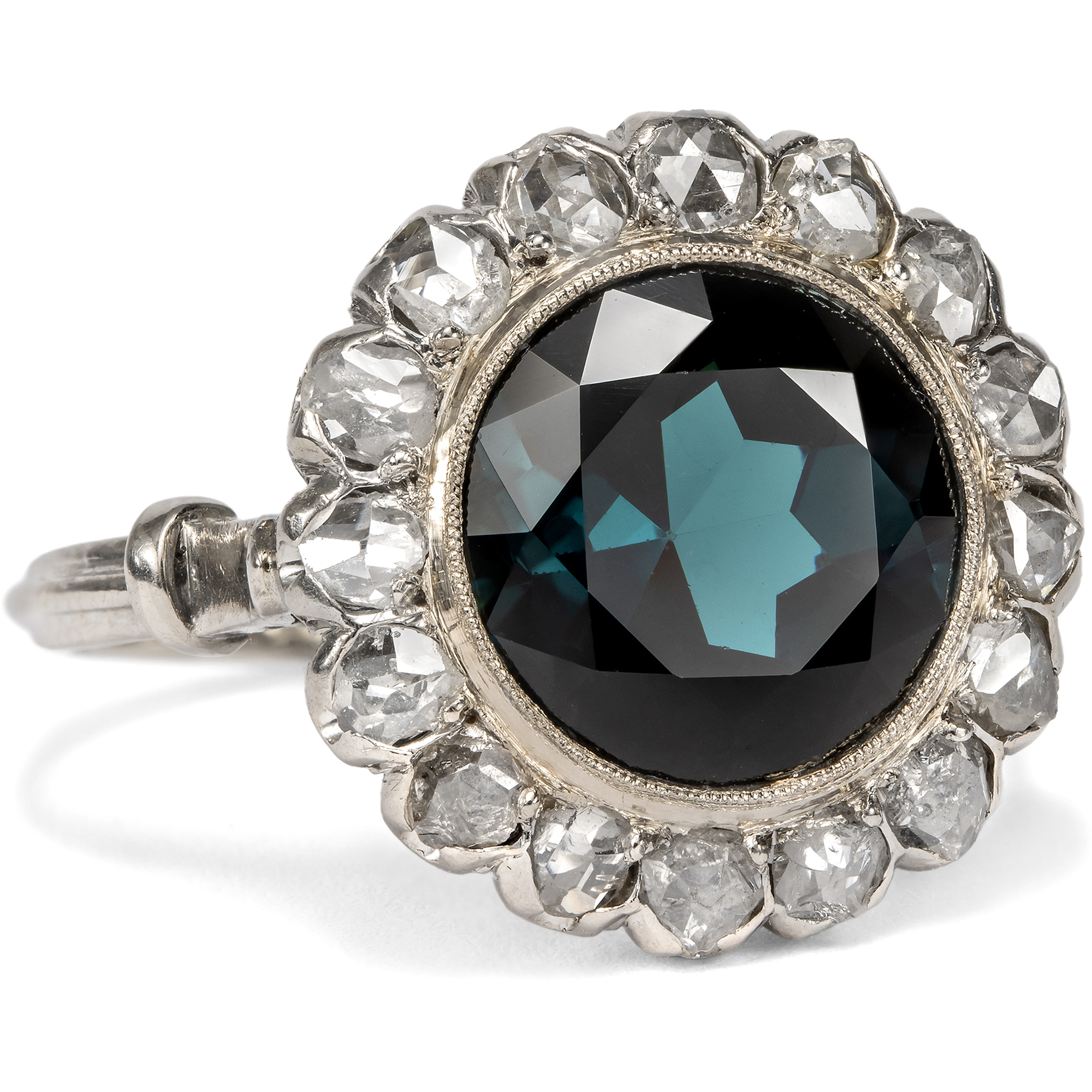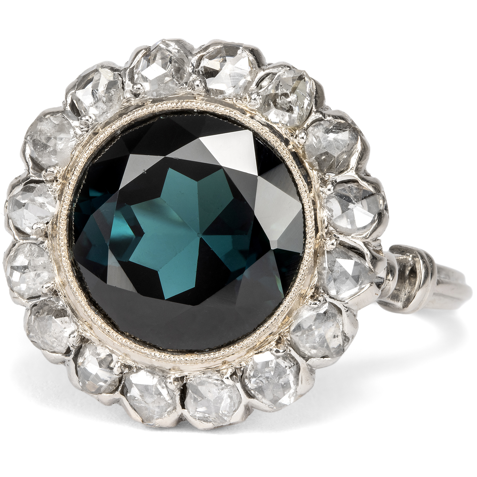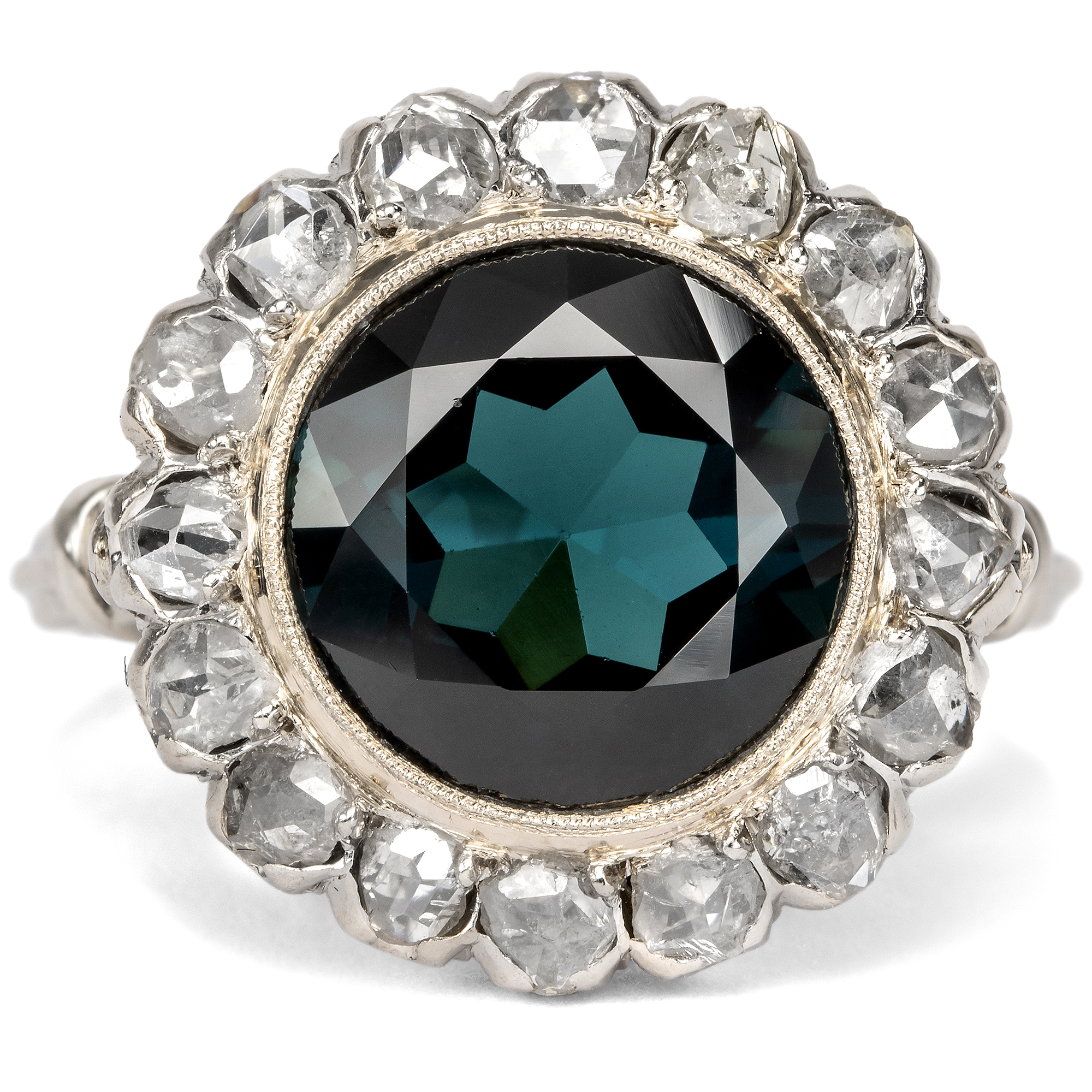 Der Turmalin ist ein Edelstein mit einem ausgesprochen vielfältigen Variantenreichtum. Von Blau über Gelb, Rosa und Grün kommen nahezu alle Farben vor. Seine wunderbare Strahlkraft macht den Turmalin seit alters her zu einem der am höchsten geschätzten Edelsteine. Der Name Turmalin stammt vom singhalesischen Wort thuramali („තුරමලි“) beziehungsweise thoramalli („තෝරමල්ලි“) ab, mit dem man allgemein bunte Schmucksteine bezeichnete, die man in Sri Lanka fand. Größere Mengen Turmalin wurden erst seit der Mitte des 18. Jahrhunderts von Sri Lanka nach Europa exportiert. Ein besonders schönes, dunkelblaues Exemplar im runden Sternschliff bildet den Mittelpunkt dieses Ringes. Der Turmalin, ein Indigolith, zeigt sich von tiefem Dunkelgrün und entfaltet erst bei Lichteinfall ein sanftes Farbspiel, das sich ansonsten ganz zurückhält. Sechzehn Diamanten im Rosenschliff begleiten den Edelstein als funkelnder Rahmen. Gefasst sind die Steine in Silber, das zusammen mit dem Gold der Ringschiene zu einem späteren Zeitpunkt weiß rhodiniert wurde. Der Entwurf des Ringes ist an historischen Vorbildern der Jahrhundertwende orientiert. Details des Entwurfs verraten jedoch, dass er etwas später entstanden ist. Sein eher hoher Aufbau z.B. ist eher typisch für den Schmuck der Jahrhundertmitte, sodass wir annehmen, dass der Ring in Erinnerung an die Belle Époque in den Jahren unmittelbar nach dem Krieg entstanden ist. Wir haben den Ring hier in Berlin entdeckt.