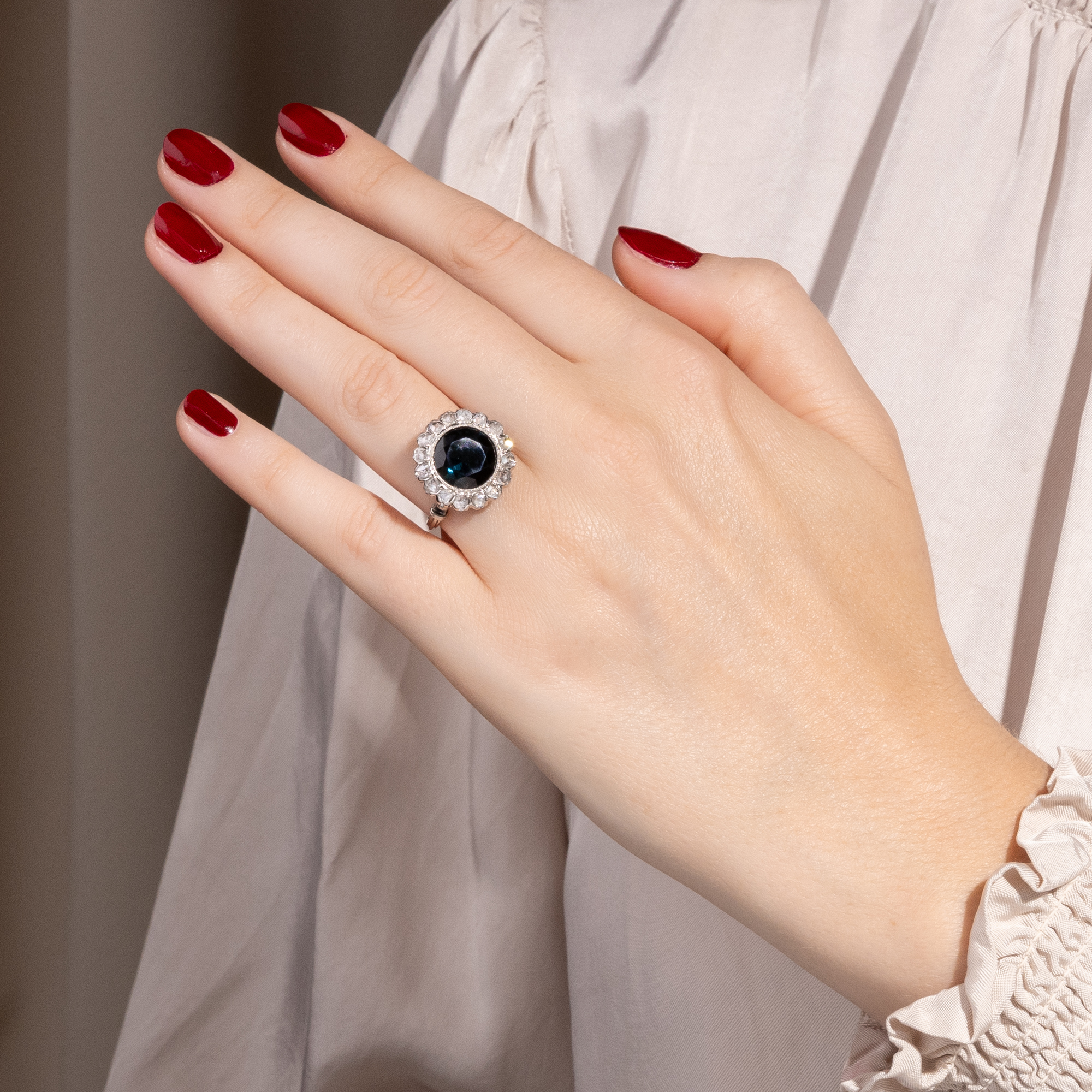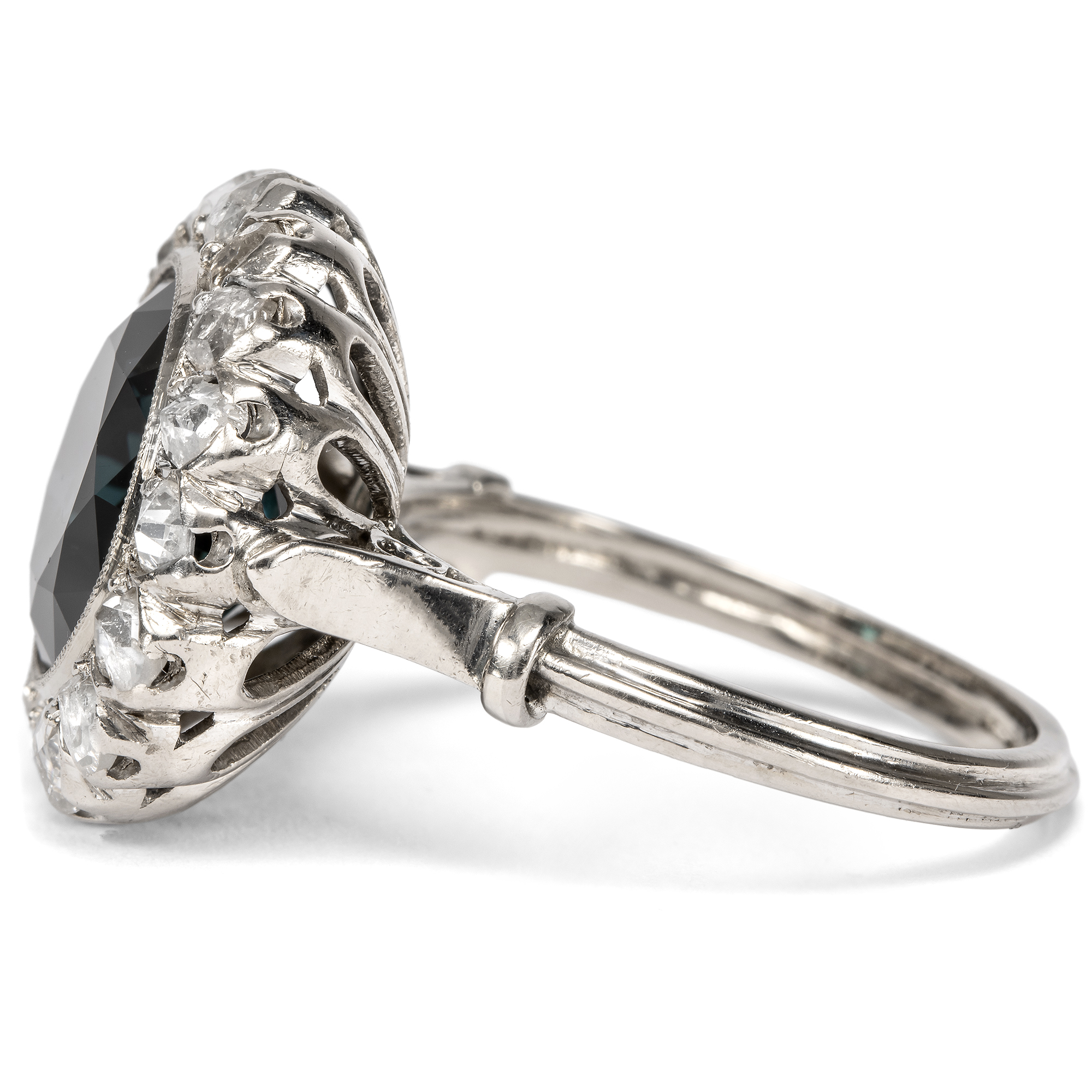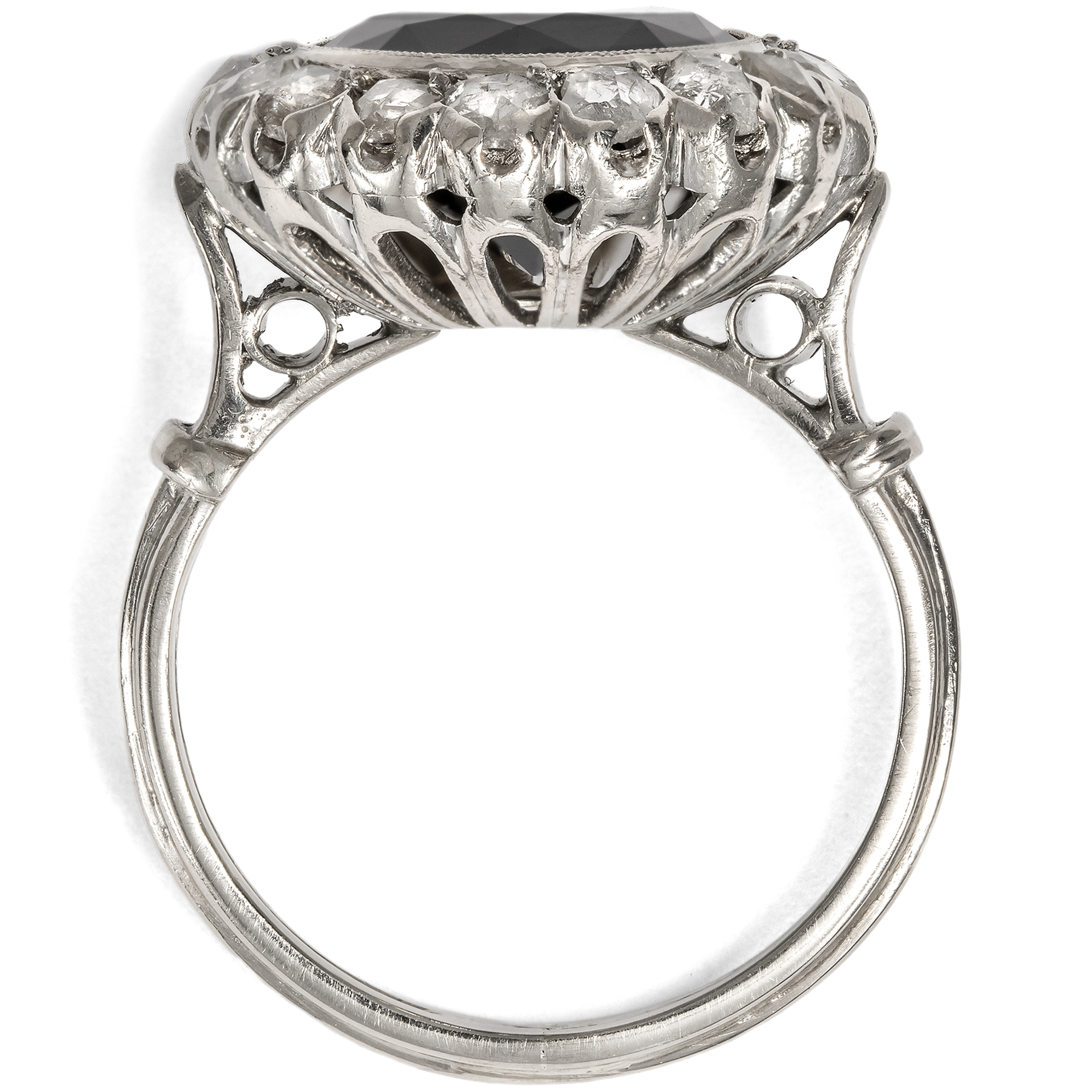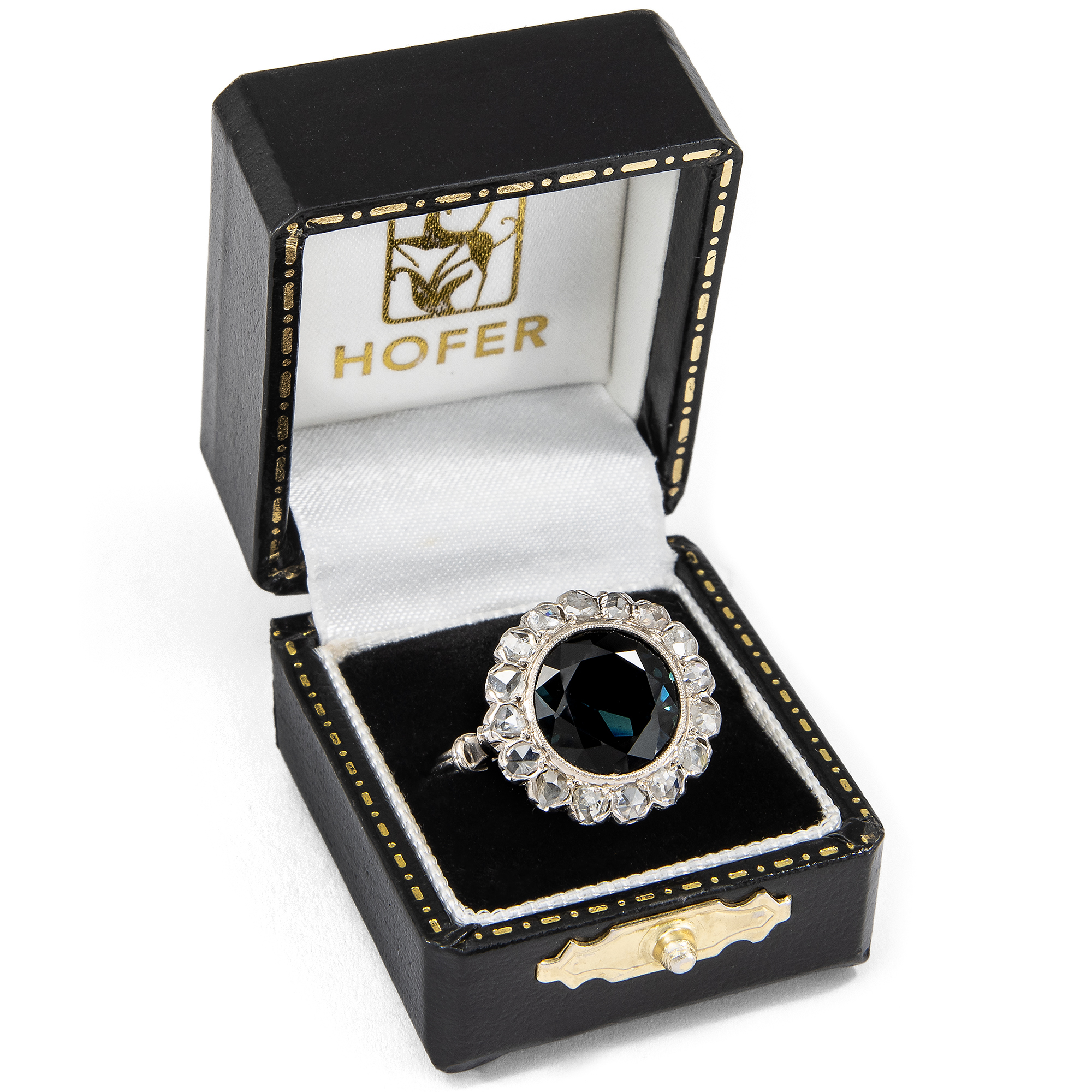 Der Turmalin ist ein Edelstein mit einem ausgesprochen vielfältigen Variantenreichtum. Von Blau über Gelb, Rosa und Grün kommen nahezu alle Farben vor. Seine wunderbare Strahlkraft macht den Turmalin seit alters her zu einem der am höchsten geschätzten Edelsteine. Der Name Turmalin stammt vom singhalesischen Wort thuramali („තුරමලි“) beziehungsweise thoramalli („තෝරමල්ලි“) ab, mit dem man allgemein bunte Schmucksteine bezeichnete, die man in Sri Lanka fand. Größere Mengen Turmalin wurden erst seit der Mitte des 18. Jahrhunderts von Sri Lanka nach Europa exportiert. Ein besonders schönes, dunkelblaues Exemplar im runden Sternschliff bildet den Mittelpunkt dieses Ringes. Der Turmalin, ein Indigolith, zeigt sich von tiefem Dunkelgrün und entfaltet erst bei Lichteinfall ein sanftes Farbspiel, das sich ansonsten ganz zurückhält. Sechzehn Diamanten im Rosenschliff begleiten den Edelstein als funkelnder Rahmen. Gefasst sind die Steine in Silber, das zusammen mit dem Gold der Ringschiene zu einem späteren Zeitpunkt weiß rhodiniert wurde. Der Entwurf des Ringes ist an historischen Vorbildern der Jahrhundertwende orientiert. Details des Entwurfs verraten jedoch, dass er etwas später entstanden ist. Sein eher hoher Aufbau z.B. ist eher typisch für den Schmuck der Jahrhundertmitte, sodass wir annehmen, dass der Ring in Erinnerung an die Belle Époque in den Jahren unmittelbar nach dem Krieg entstanden ist. Wir haben den Ring hier in Berlin entdeckt.