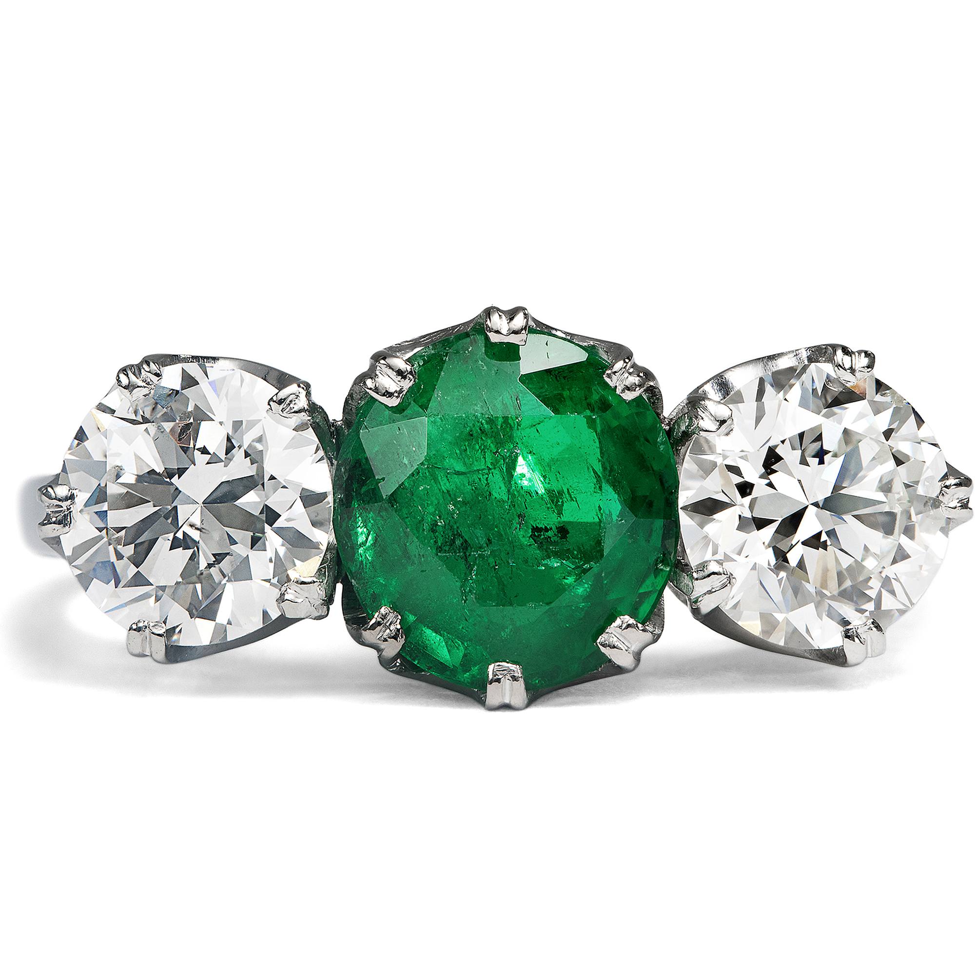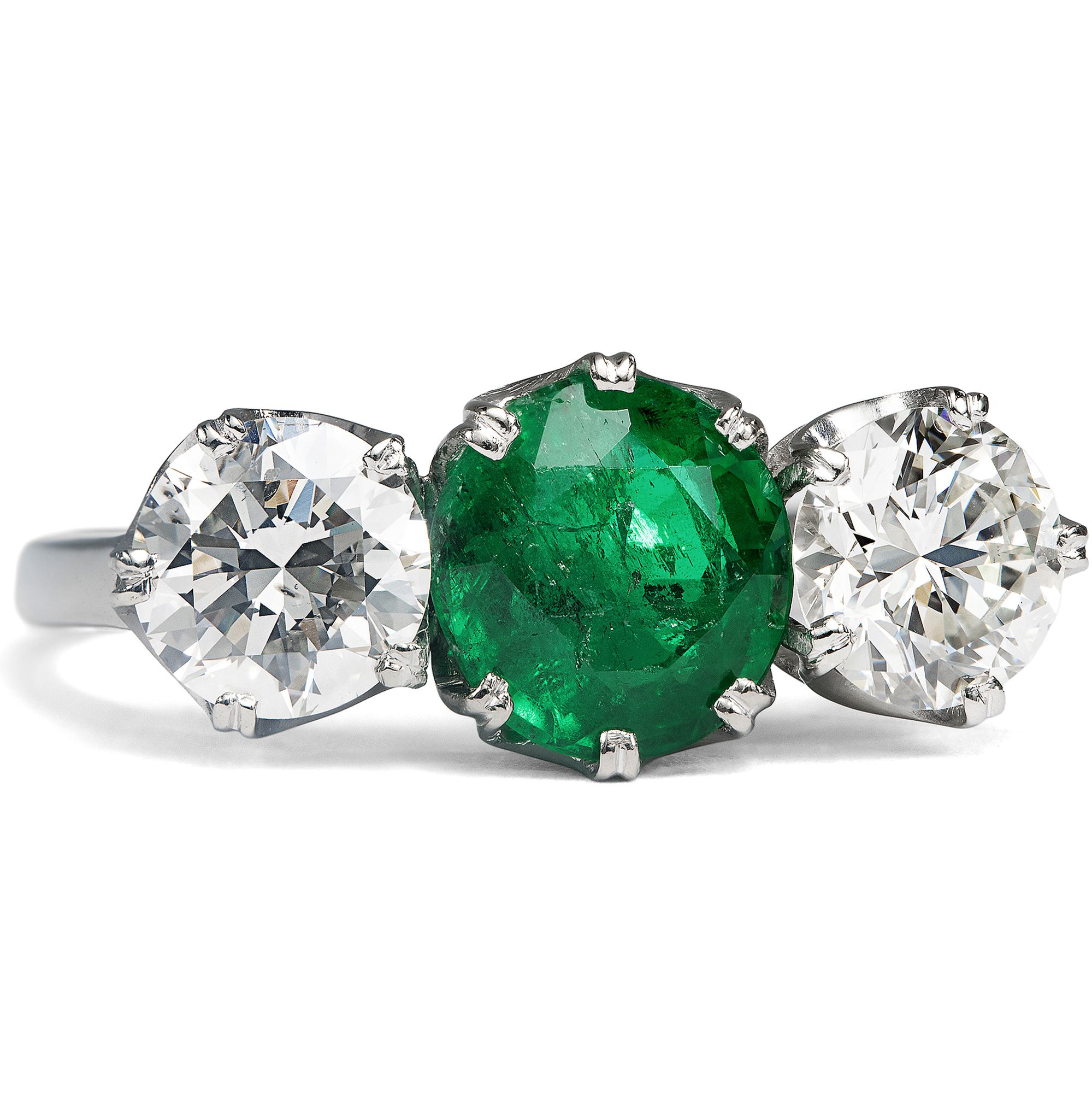 Dass man beim Anblick dieses Ringes an den tropischen Urwald denken muss, ist nicht nur der Farbe des wunderbaren Smaragdes in seiner Mitte zu verdanken. Seit jeher wurden die besten Smaragde in Kolumbien gefunden, sie stammen selbst also mitten aus dem Dschungel. Und spielt das Licht im Inneren eines solchen Steins, werden ganz von selbst die schönsten Vorstellungen an eine wuchernde, paradiesische Umgebung wach. Hier nun ist solch ein betörender Ausflug in den tropischen Wald zwischen zwei Diamanten im Brillantschliff von zusammen rund 1,60 ct gesetzt. Die beiden Diamanten rechts und links rahmen den Smaragd und machen den Ring zu einem klassischen Trilogie-Ring. Der kolumbianische Smaragd selbst ist tiefgrün und leuchtet doch warm. Feine Einschlüsse, der sogenannte „jardin“, verleihen ihm ein weiches Licht. Der Ring fasst die Edelsteine in Weißgold. Sie liegen in einer Reihe quer zum Finger und sind zugleich doch sehr flach angeordnet, sodass sich der Ring angenehm trägt. Der Ring ist etwa so breit wie der Finger und besitzt durch die großen Steine eine kraftvolle Präsenz. Der elegante Schwung und die zugleich kompakte Form des Entwurfes lassen uns den Ring in die 1950er Jahre datieren. Ausweislich seiner Punzen ist er in Wien entstanden.
