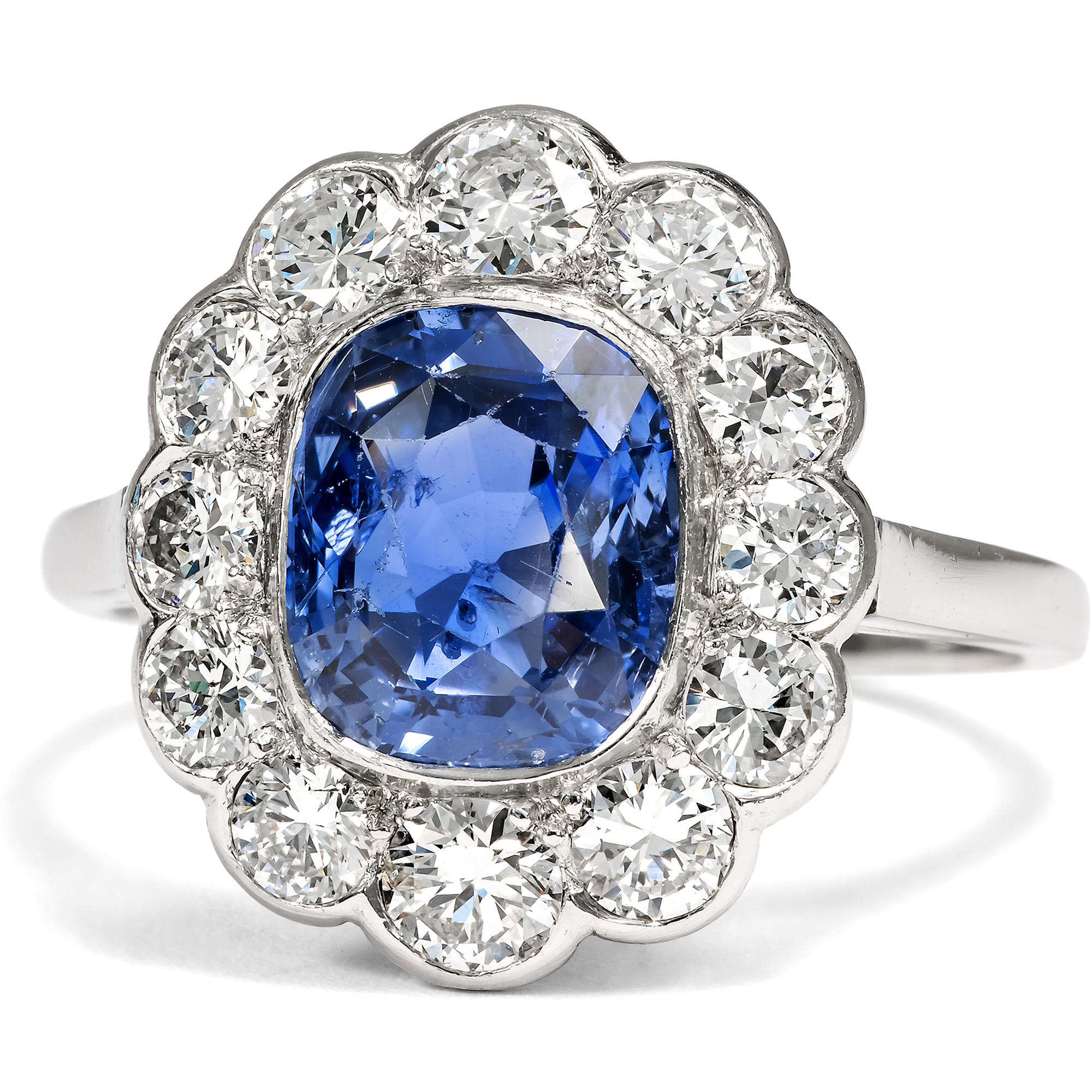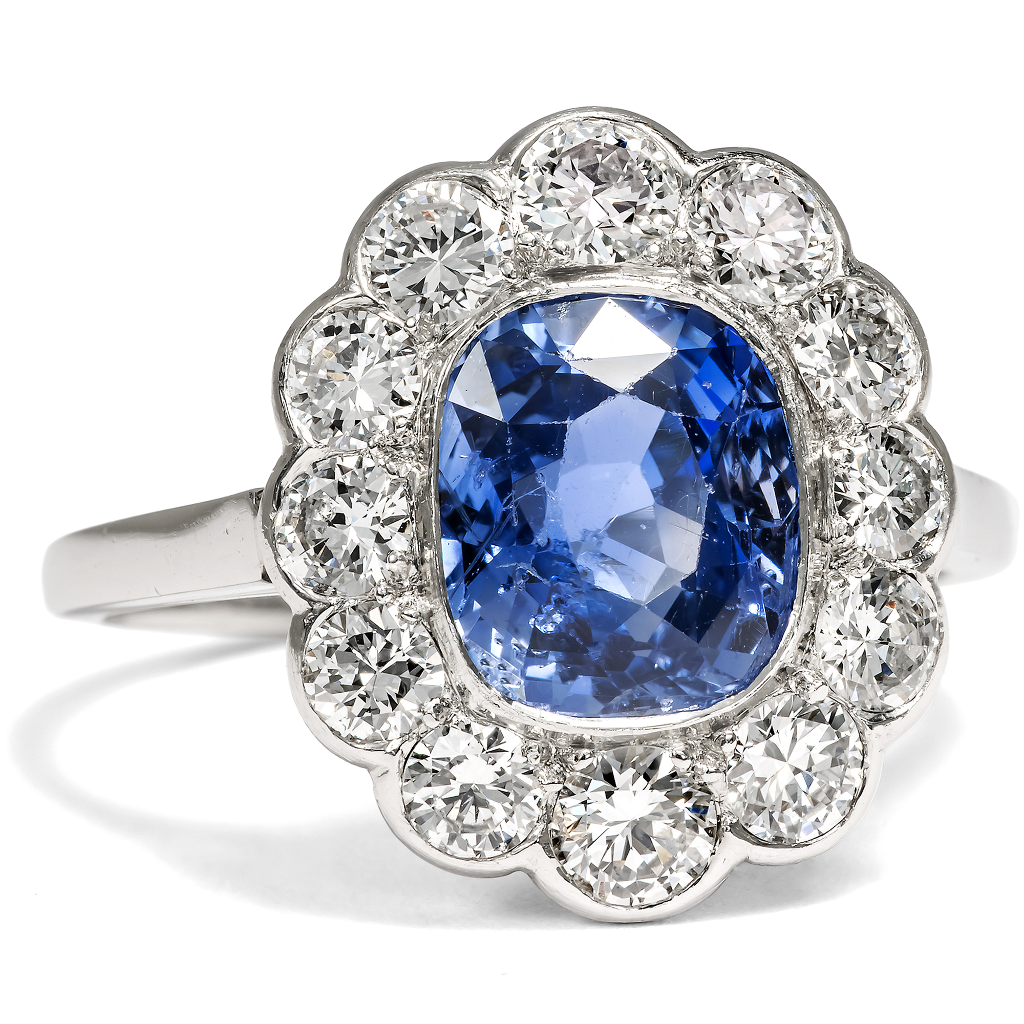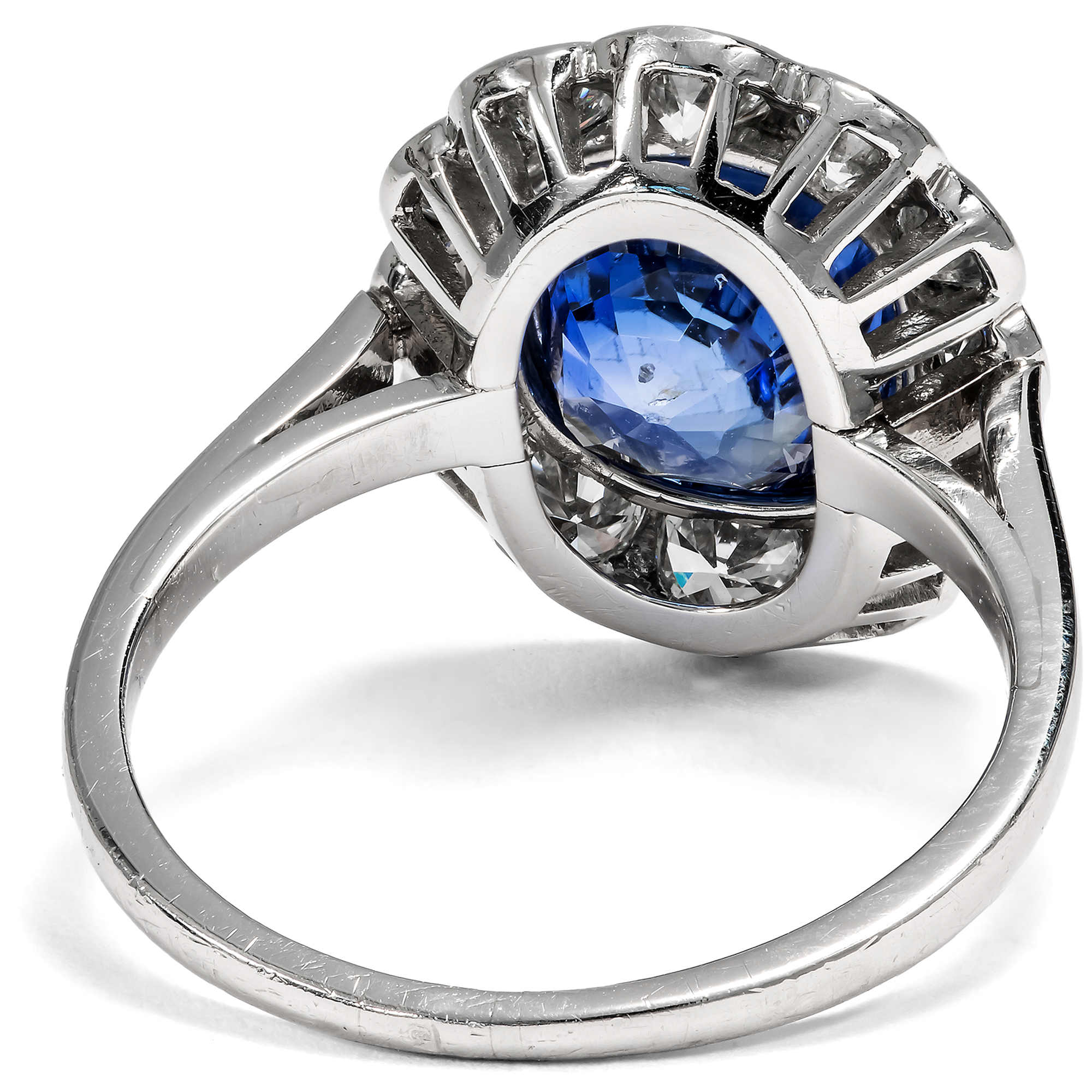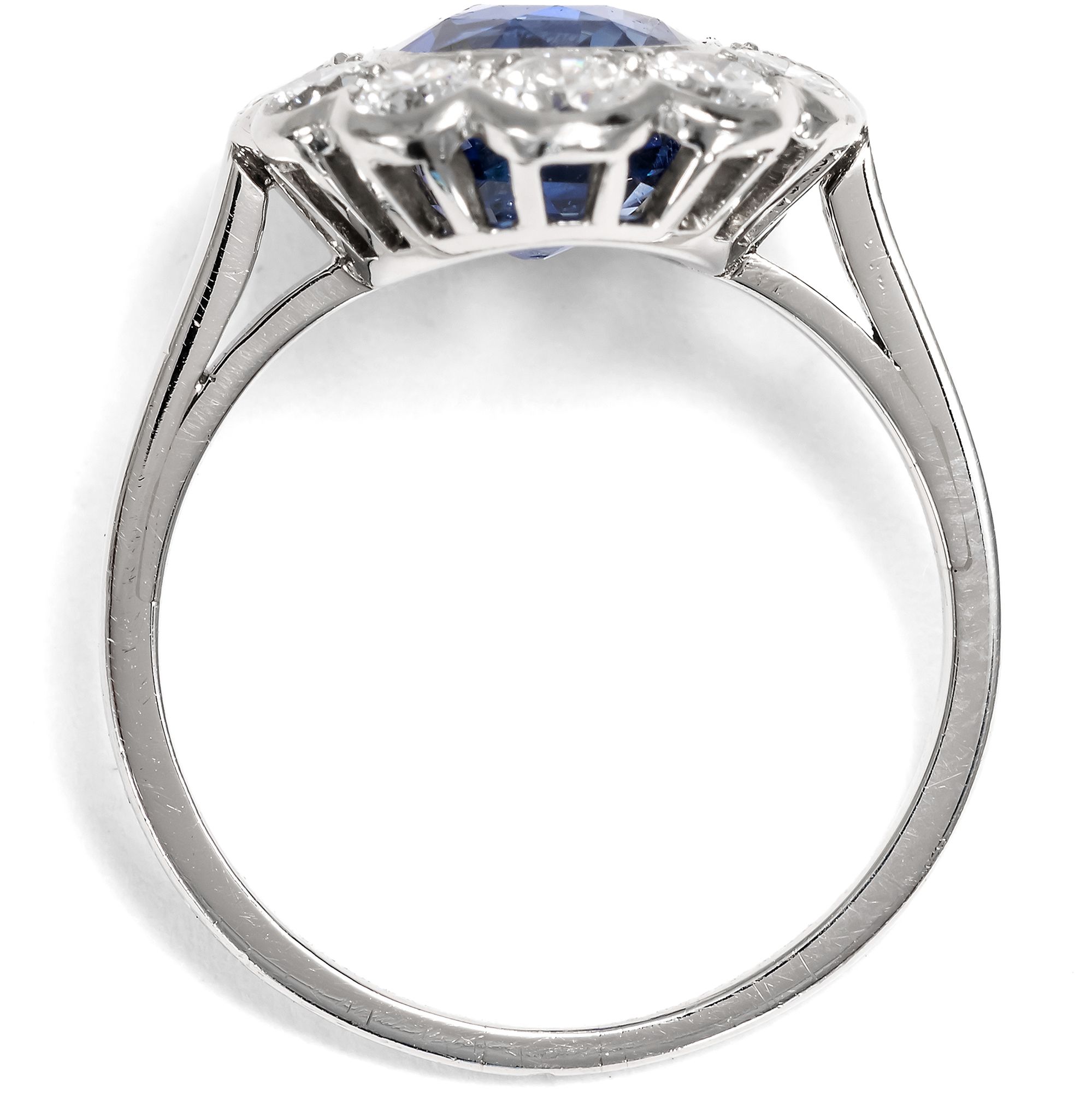 Bei den allermeisten Saphiren, die man heute im Handel kaufen kann, hat der Mensch nachgeholfen, um ihr Aussehen möglichst attraktiv zu gestalten. Oft werden Saphire erhitzt, um ihre Reinheit oder Farbigkeit zu verbessern, seltener mit Bleiglas gefüllt oder sogar radioaktiv bestrahlt, um ihre Farbe oder Reinheit zu verbessern. In dem hier vorliegenden, von Hand gefertigten Ring findet sich allerdings ein Saphir, bei dem niemand nachgeholfen hat, um seine natürliche Schönheit zu steigern, abgesehen vom Schleifen und Polieren des Rohsteins. Auf einer schmalen Ringschiene aus Platin ist ein vielpassiger Ringkopf aufgesetzt. Zwölf weiße Diamanten funkeln rahmend rund um den großen Farbstein. Mittelpunkt des Rings bildet der mittelblaue Saphir von etwa 2,95 Karat Gewicht. Der Edelstein, der aus Sri Lanka, dem früheren Ceylon, stammt, ist nicht erhitzt und nicht reinheitsverbessert. Er leuchtet so vor uns, wie die Natur ihn schuf. Seine kraftvolle, kompakte Form und seine Verarbeitung aus Platin lassen uns den Ring, der aus Südfrankreich zu uns kam, in die Jahre um 1955 datieren. Die kleine Platinpunze auf der Außenseite der Ringschiene belegt, dass er in Frankreich entstanden ist. Ein unabhängiges Gutachten aus Wien hat die Qualität der Materialien bestätigt, es wird zusammen mit dem Ring geliefert.