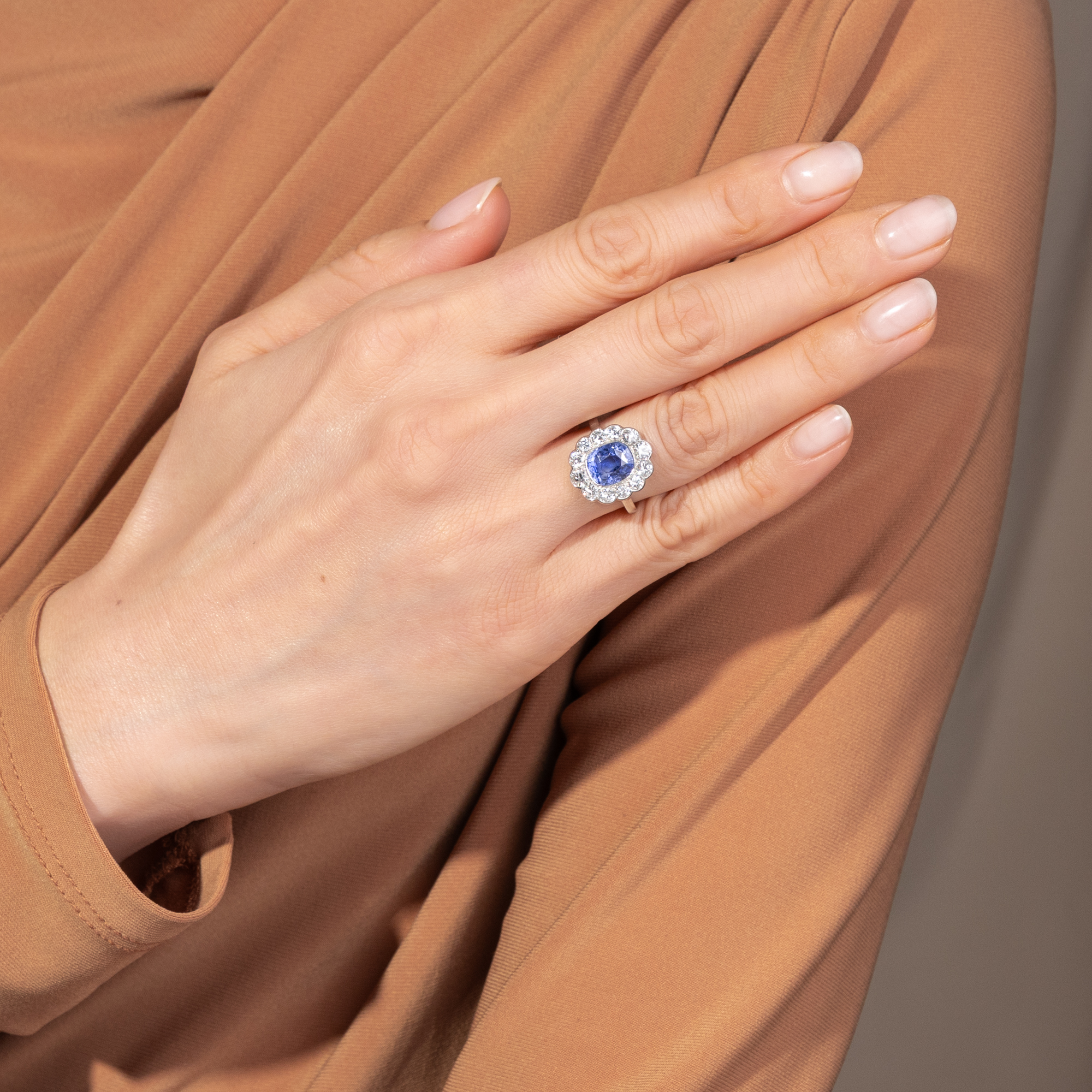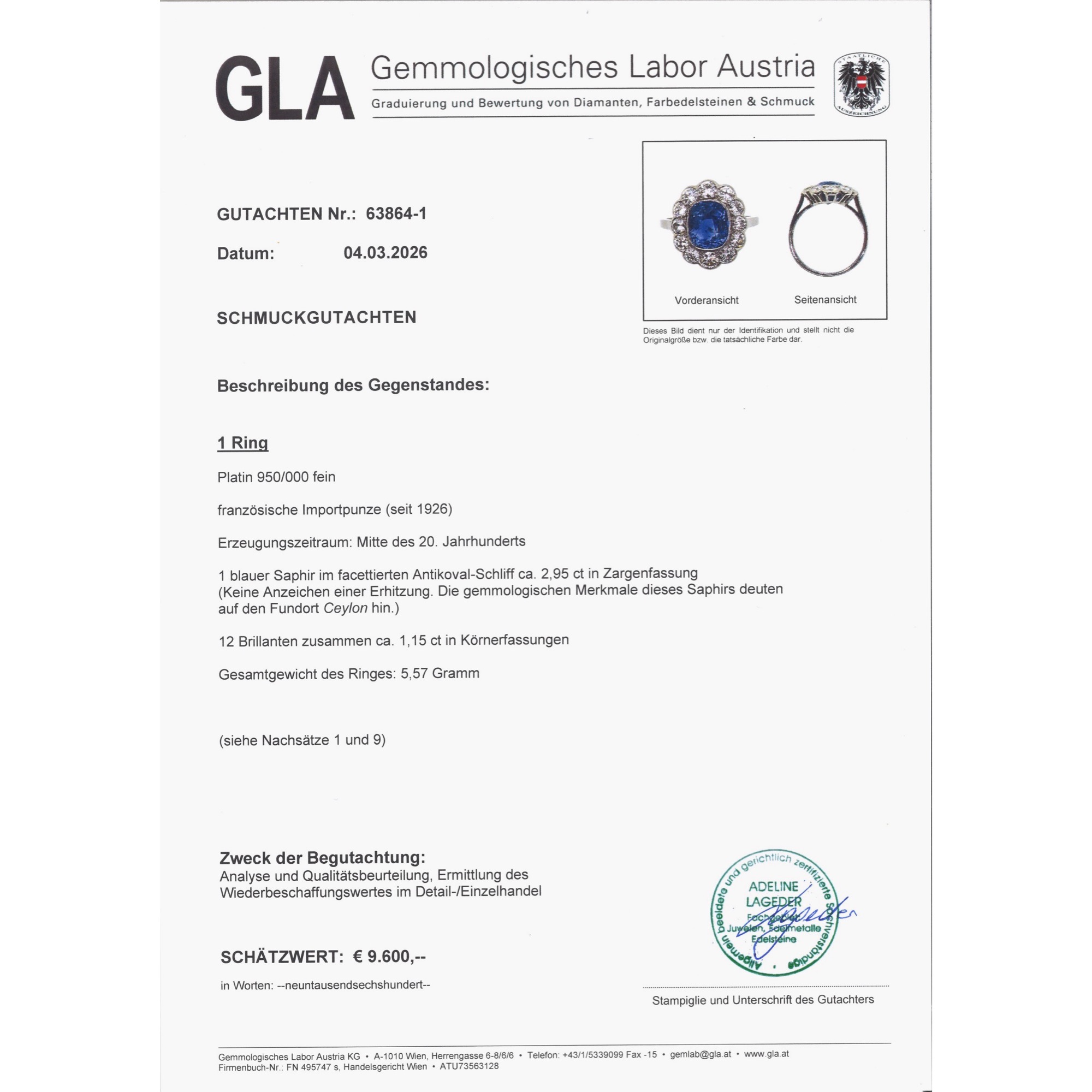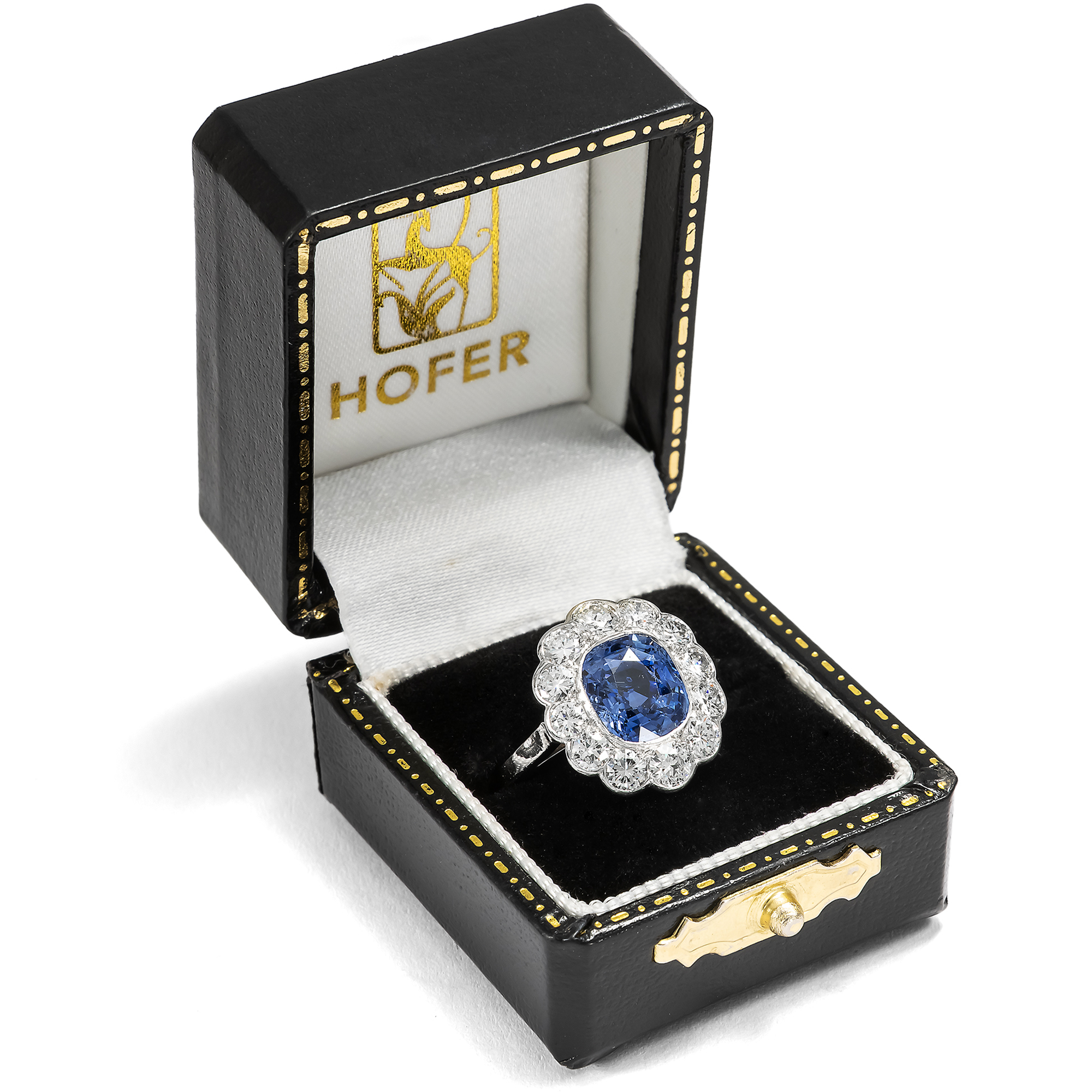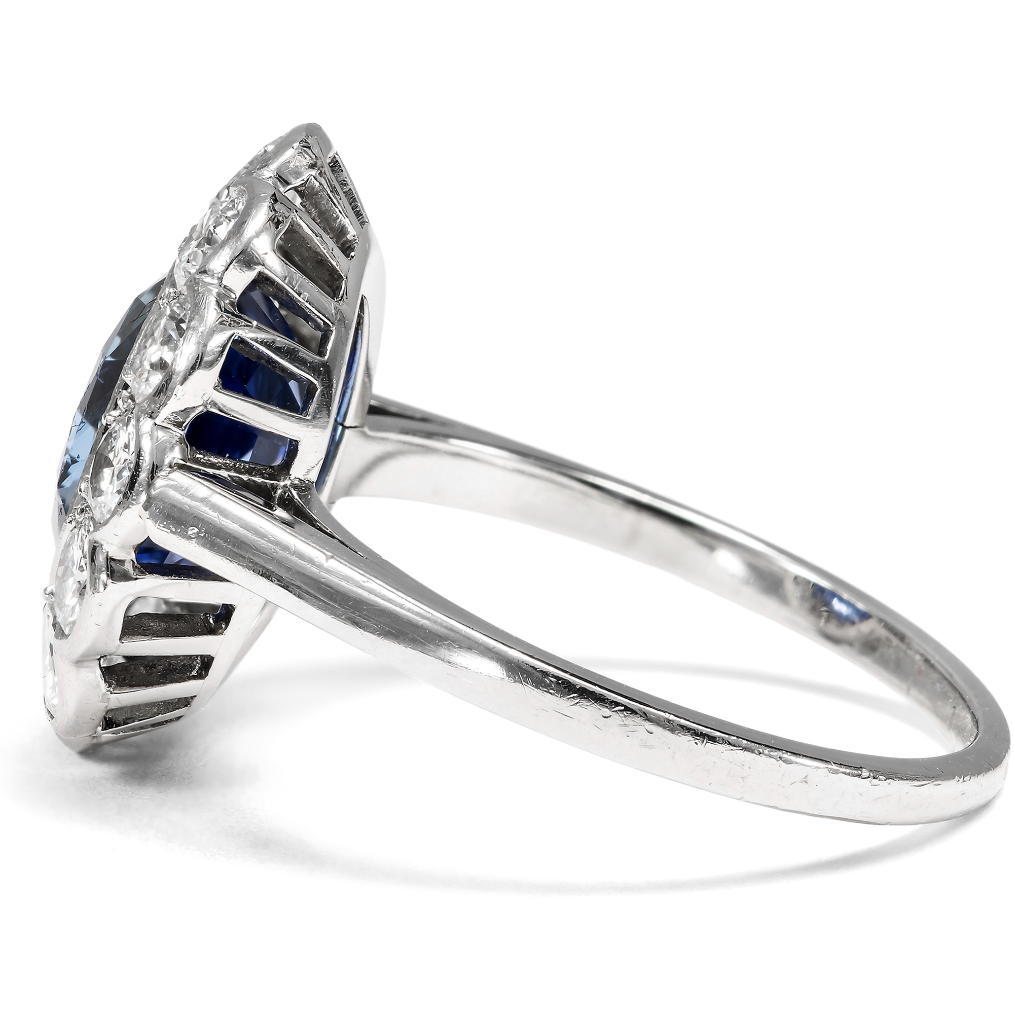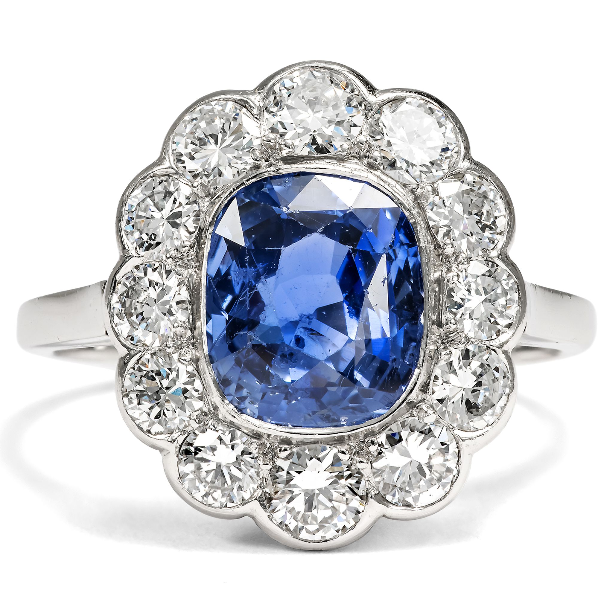 Bei den allermeisten Saphiren, die man heute im Handel kaufen kann, hat der Mensch nachgeholfen, um ihr Aussehen möglichst attraktiv zu gestalten. Oft werden Saphire erhitzt, um ihre Reinheit oder Farbigkeit zu verbessern, seltener mit Bleiglas gefüllt oder sogar radioaktiv bestrahlt, um ihre Farbe oder Reinheit zu verbessern. In dem hier vorliegenden, von Hand gefertigten Ring findet sich allerdings ein Saphir, bei dem niemand nachgeholfen hat, um seine natürliche Schönheit zu steigern, abgesehen vom Schleifen und Polieren des Rohsteins. Auf einer schmalen Ringschiene aus Platin ist ein vielpassiger Ringkopf aufgesetzt. Zwölf weiße Diamanten funkeln rahmend rund um den großen Farbstein. Mittelpunkt des Rings bildet der mittelblaue Saphir von etwa 2,95 Karat Gewicht. Der Edelstein, der aus Sri Lanka, dem früheren Ceylon, stammt, ist nicht erhitzt und nicht reinheitsverbessert. Er leuchtet so vor uns, wie die Natur ihn schuf. Seine kraftvolle, kompakte Form und seine Verarbeitung aus Platin lassen uns den Ring, der aus Südfrankreich zu uns kam, in die Jahre um 1955 datieren. Die kleine Platinpunze auf der Außenseite der Ringschiene belegt, dass er in Frankreich entstanden ist. Ein unabhängiges Gutachten aus Wien hat die Qualität der Materialien bestätigt, es wird zusammen mit dem Ring geliefert.
