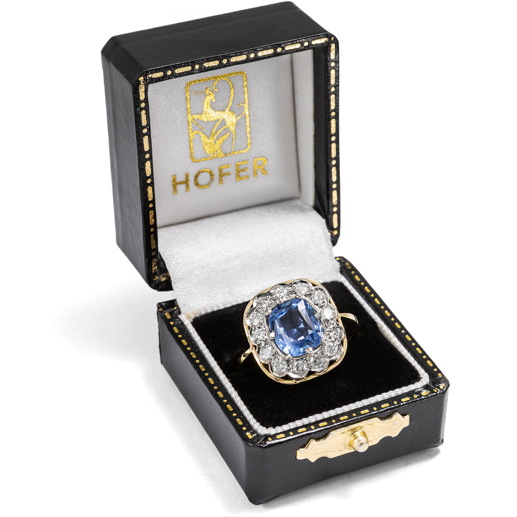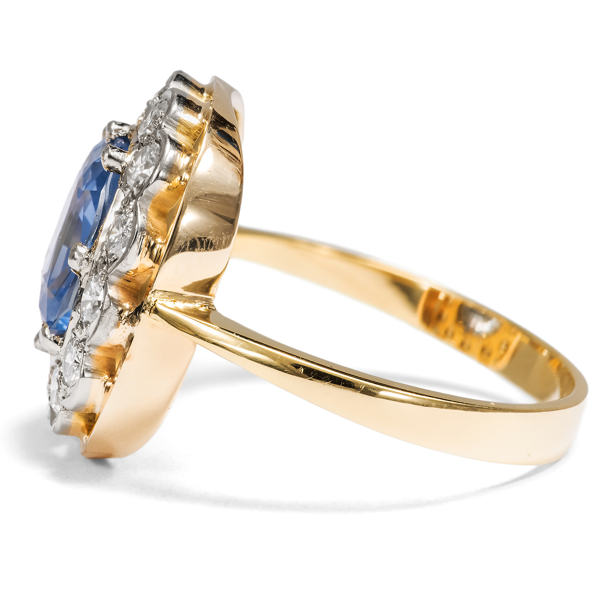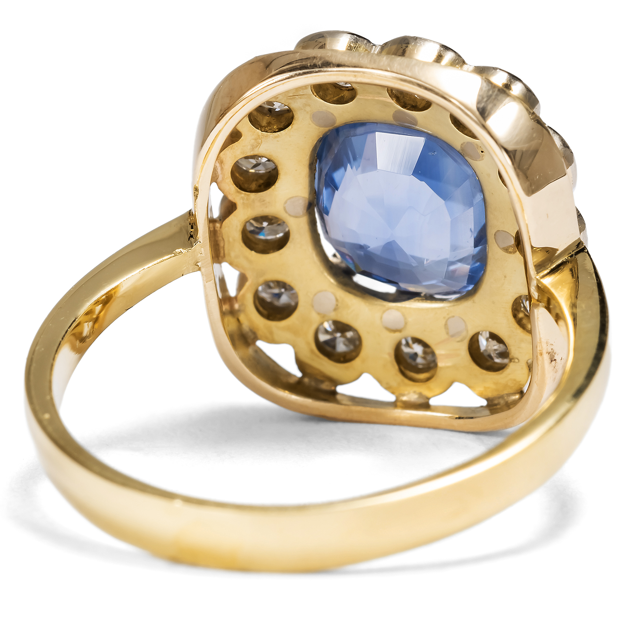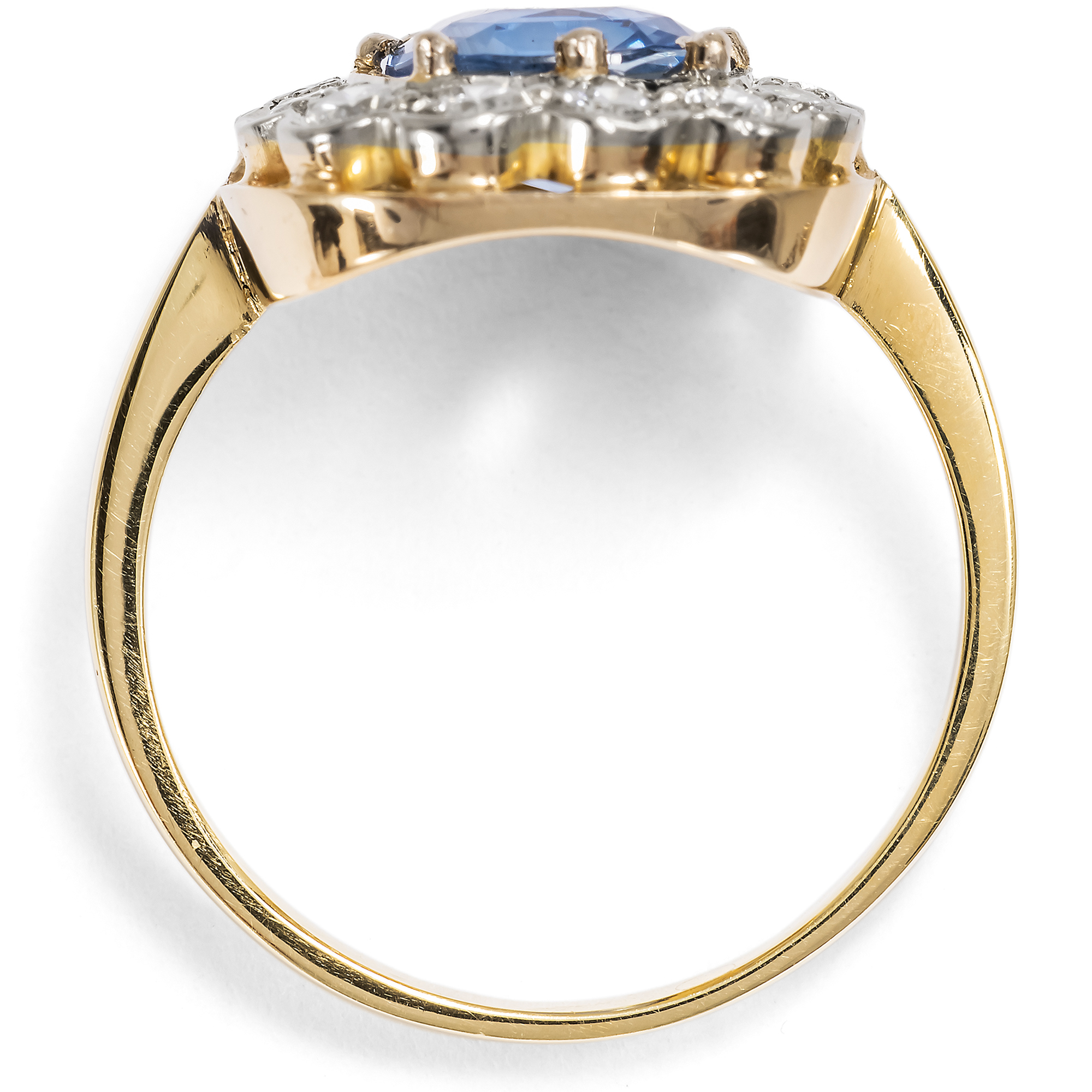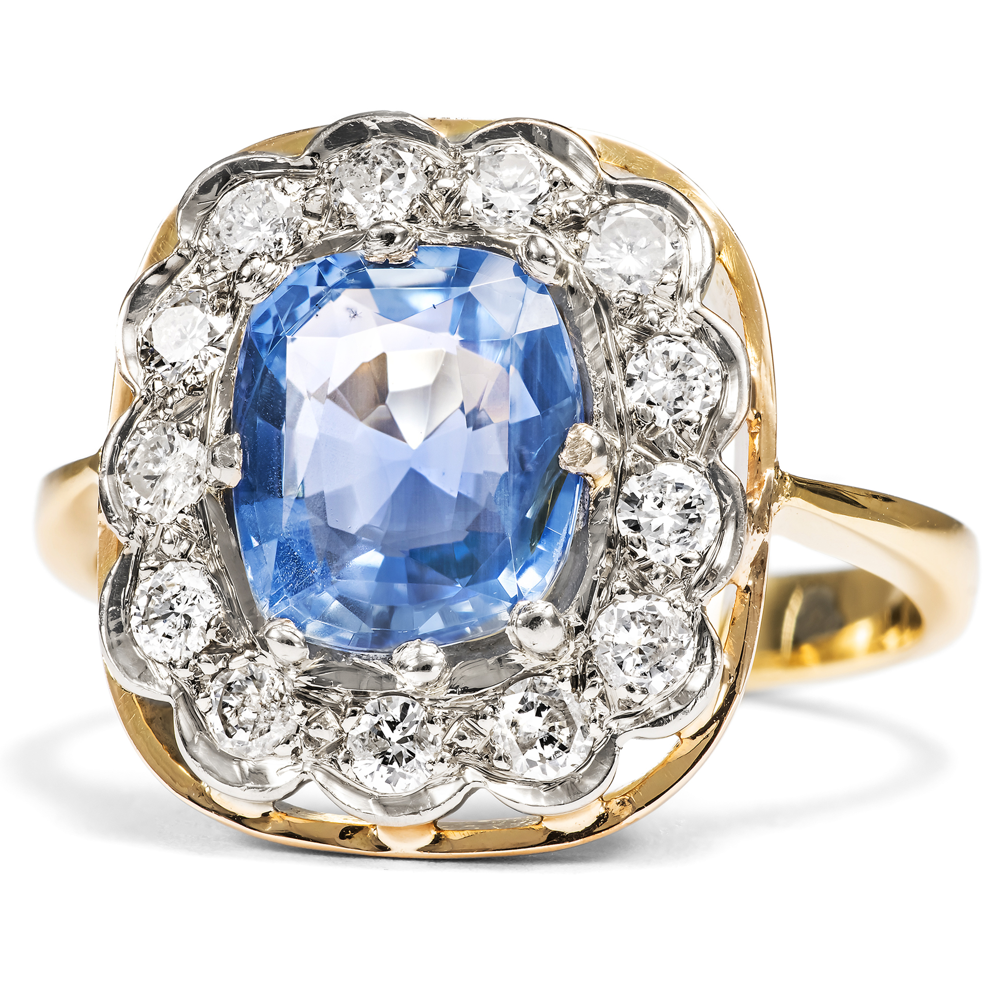 Es gibt einige Entwurfsideen im Bereich des Schmucks, die zu jeder Zeit begegnen, und doch in jeder Generation mit neuem Leben gefüllt wurden. Eines dieser klassischen Themen ist der sog. „Entouragering“. Ein großer Farbedelstein wird dabei ovn einem Rahmen aus kleineren Diamanten umgeben. Grundsätzlich eine einfache Idee also – doch wie unterschiedlich können die daraus entstehenden Schmuckstücke aussehen! Der hier vorliegende Ring der Wirtschaftswunderzeit präsentiert in seiner Mitte einen großen, leuchtenden Saphir. Der Stein ist sehr klar, wiegt 3,25 ct und ist in der sog. Antikform geschliffen, d.h. als ein Kissen mit leicht gerundeten Seiten. Der Stein, sehr wahrscheinlich stammt er aus Ceylon, dem heutigen Sri Lanka, ist sehr klar und besitzt eine einheitliche, himmelblaue Farbe. Ganz zarte Einschlüsse, ohne Lupe kaum zu erkennen, belegen, dass er unbehandelt ist. Er wurde also nicht erhitzt, um seine Farbe zu verbessern, was ein Ausweis seiner besonderen Qualität ist. Der Ring umgibt den Saphir mit Diamanten im Brillantschliff, die in Weißgold gefasst wurden. Die Fassungen folgen dabei der runden Form der Brillanten, sodass die Ebene der Diamanten wie eine Blüte wirkt, leicht verspielt und bewegt, wie ein Spitzendeckchen geradezu. Die darunter liegende Ebene ist aus Gelbgold gefertigt und folgt in ihrem Umriss der Form des Saphirs. Der Entwurf wird so wieder beruhigt, zugleich wirkt der Ring durch die leichte Staffelung der Materialien solide und kraftvoll. Hier zeigt sich der Zeitgeschmack der Nachkriegszeit, als Schmuck wieder solider und kraftvoller wirken sollte als noch in der Vorkriegszeit. Wir haben den Ring hier in Berlin entdeckt. Er ist sehr gut erhalten. Wir haben den Saphir durch unseren Edelsteinschleifer polieren lassen. Ein unabhängiges Gutachten hat die Qualität der Materialien bestätigt.