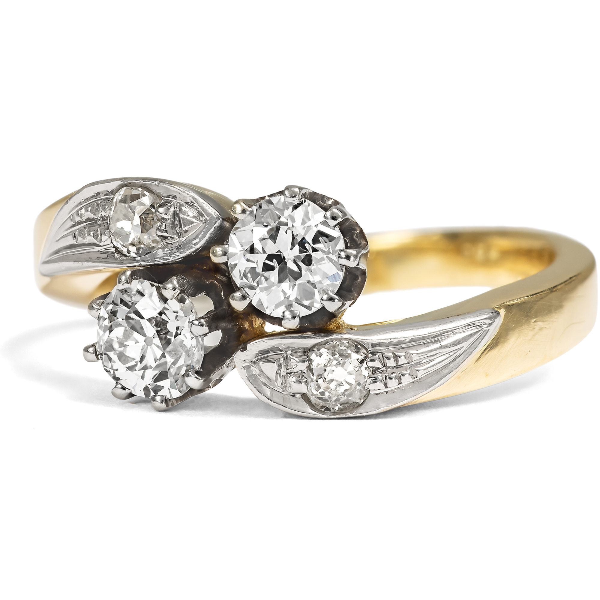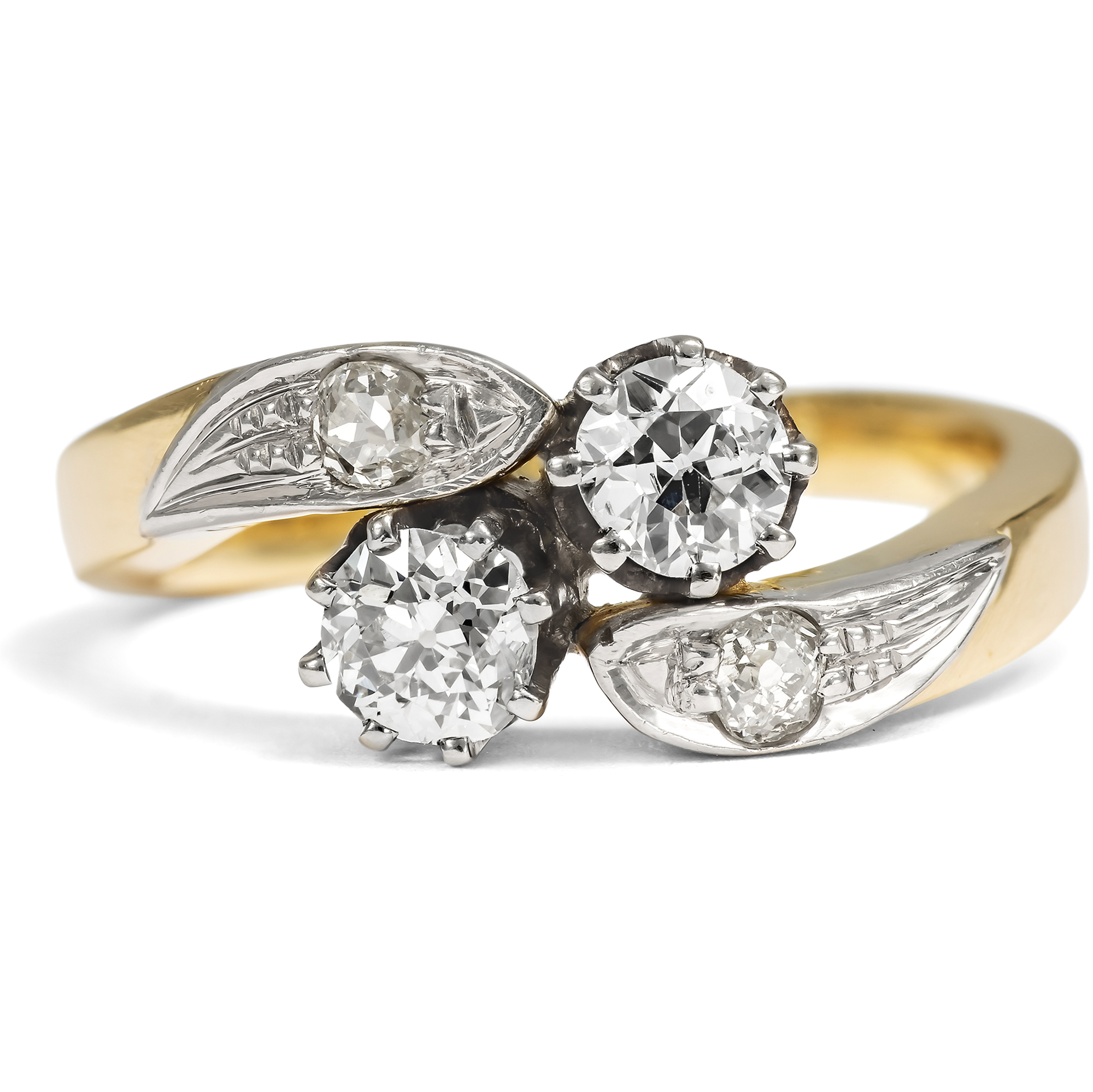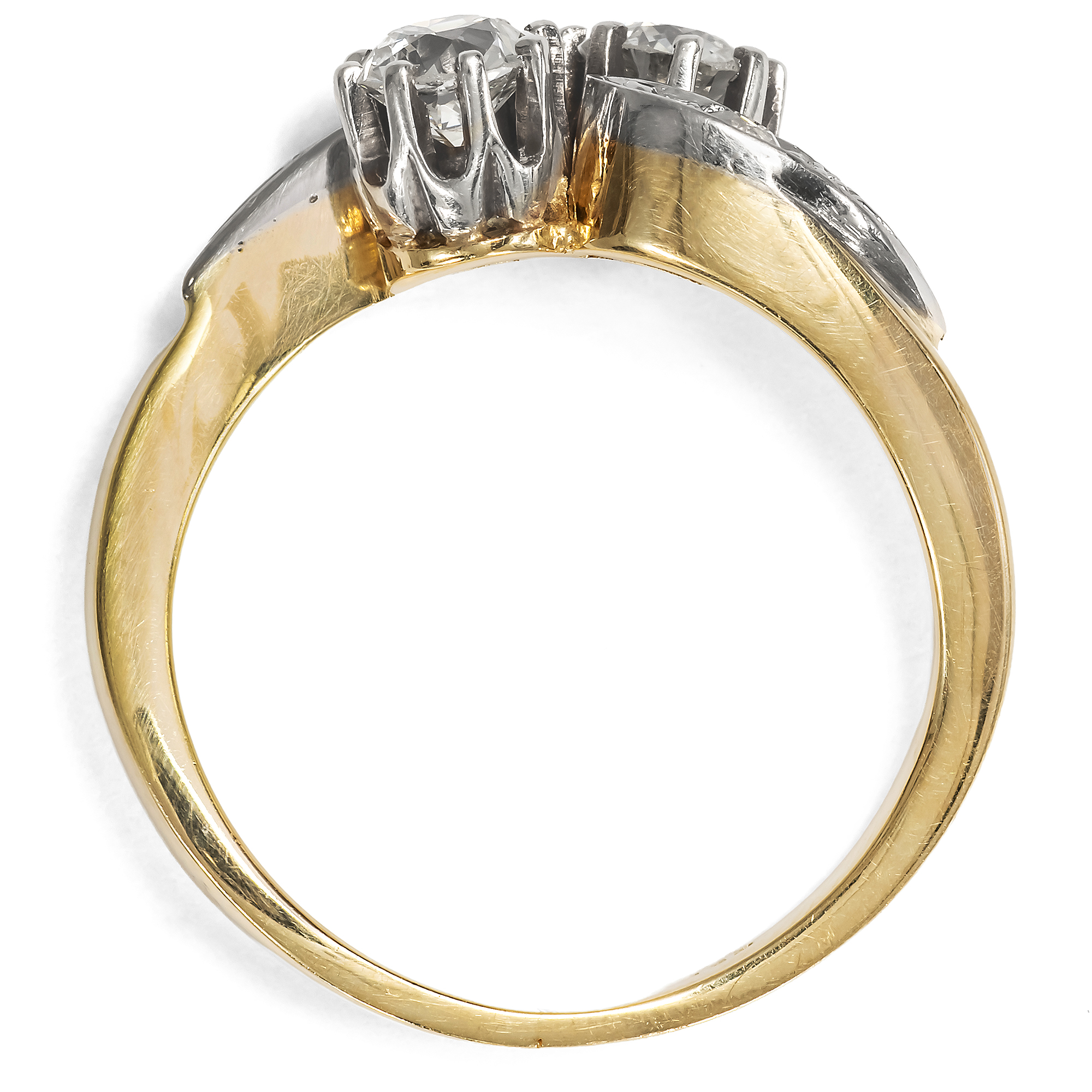 „Eins und eins, das macht zwei, Ein Herz ist immer dabei, Und wenn du Glück hast, dann sind es zwei.“ Fast meint man, der hier vorliegende Ring aus den Jahren um 1960 sei von diesen Zeilen aus Hildegard Knefs berühmten Chanson inspiriert. In eleganter Gegenüberstellung präsentiert der Ring zwei große, funkelnde Diamanten im Altschliff mit einem Gesamtgewicht von etwa 0,60 Karat. Zwei Schwünge, ebenfalls mit kleineren Diamanten besetzt, halten die wunderbar glitzernden Edelsteine, die wie in einem bewegten Pas de Deux für die Ewigkeit vereint sind. Der Ring ist aus Gelbgold gefertigt. Ringkopf und Steinfassungen sind mit Weißgold belegt. Dessen kühle Farbe in Kombination mit den weißen Diamanten verleiht dem Stück ein festliches Aussehen. Der Ring ist ein typisches Schmuckstück der Nachkriegszeit, das verrät seine solide, massive Verarbeitung. Auch wenn seine Gestaltung auf Vorbilder der Jahre um 1900 zurückgeht, so ist die Verwendung von viel Edelmetall charakteristisch für Schmuck der 1950er und 1960er Jahre. Die Steine allerdings sind tatsächlich älter als der Ring selbst. Wir können sie aufgrund ihrer Schliffe in die Jahre um 1900 datieren. Die Verarbeitung des Rings, die schönen Materialien und seine romantische Symbolik schaffen ein Schmuckstück, das vermutlich als Verlobungsring entworfen wurde. Zu uns fand der wohl erhaltene Ring aus dem Berliner Westen.