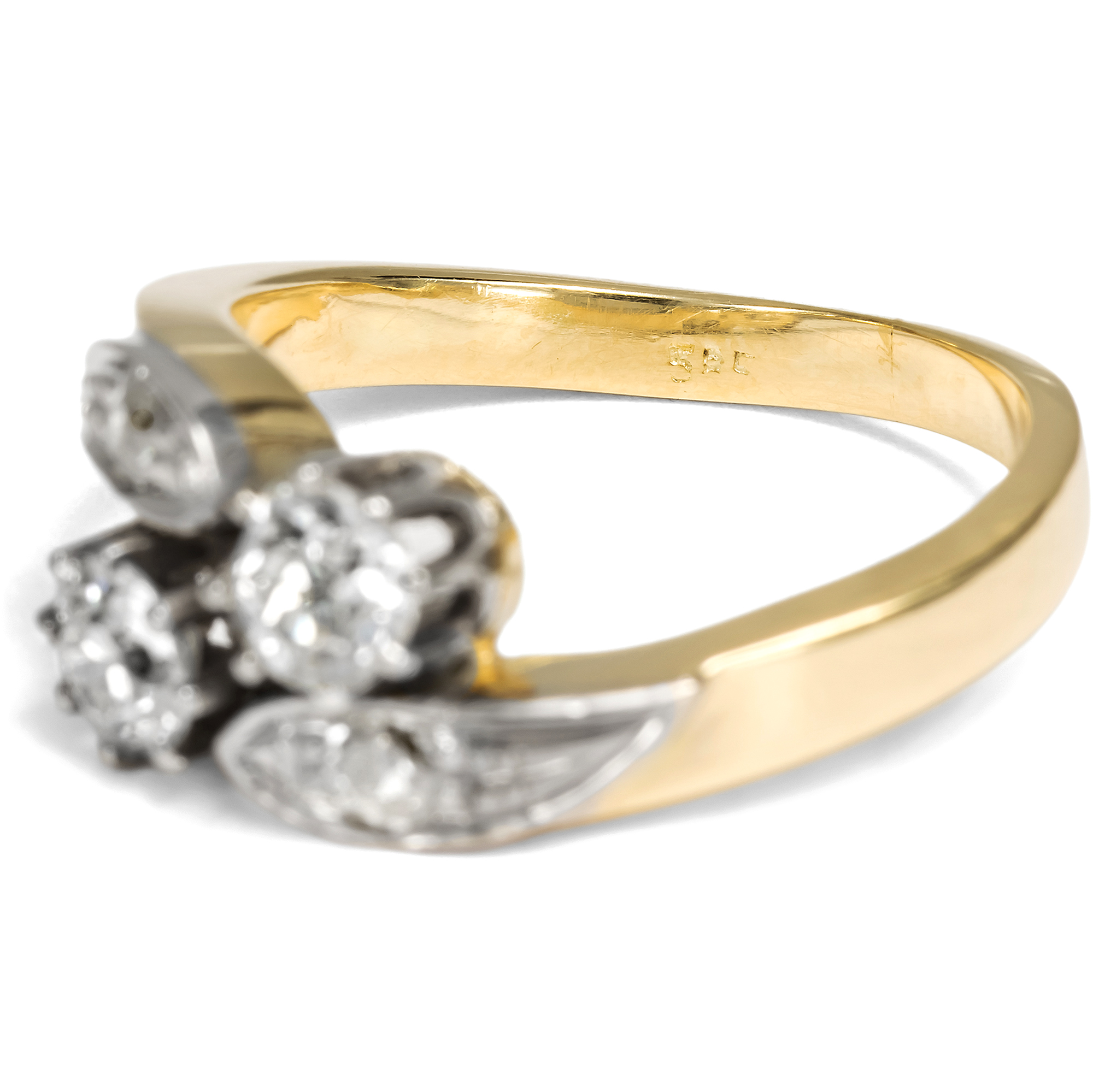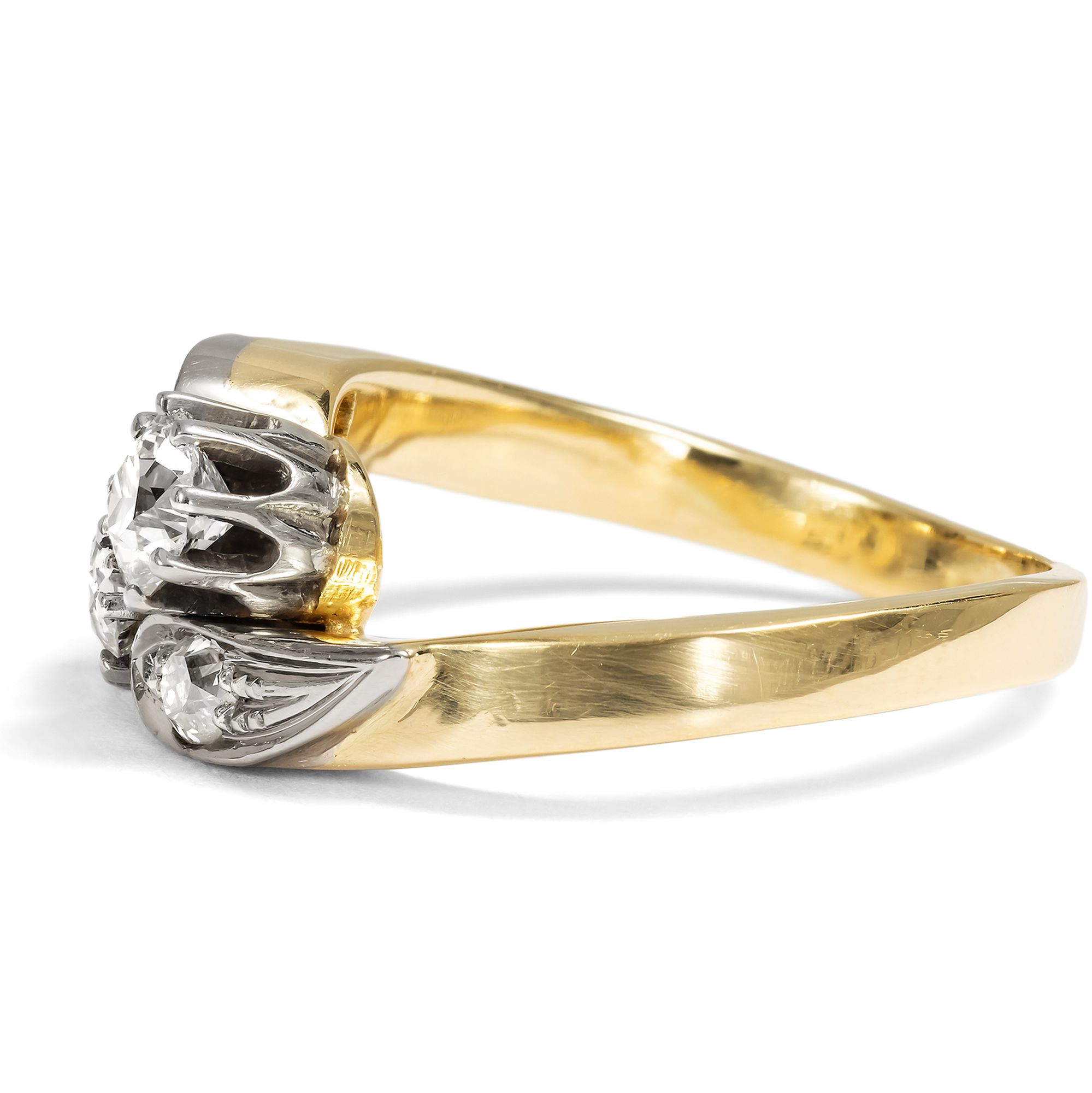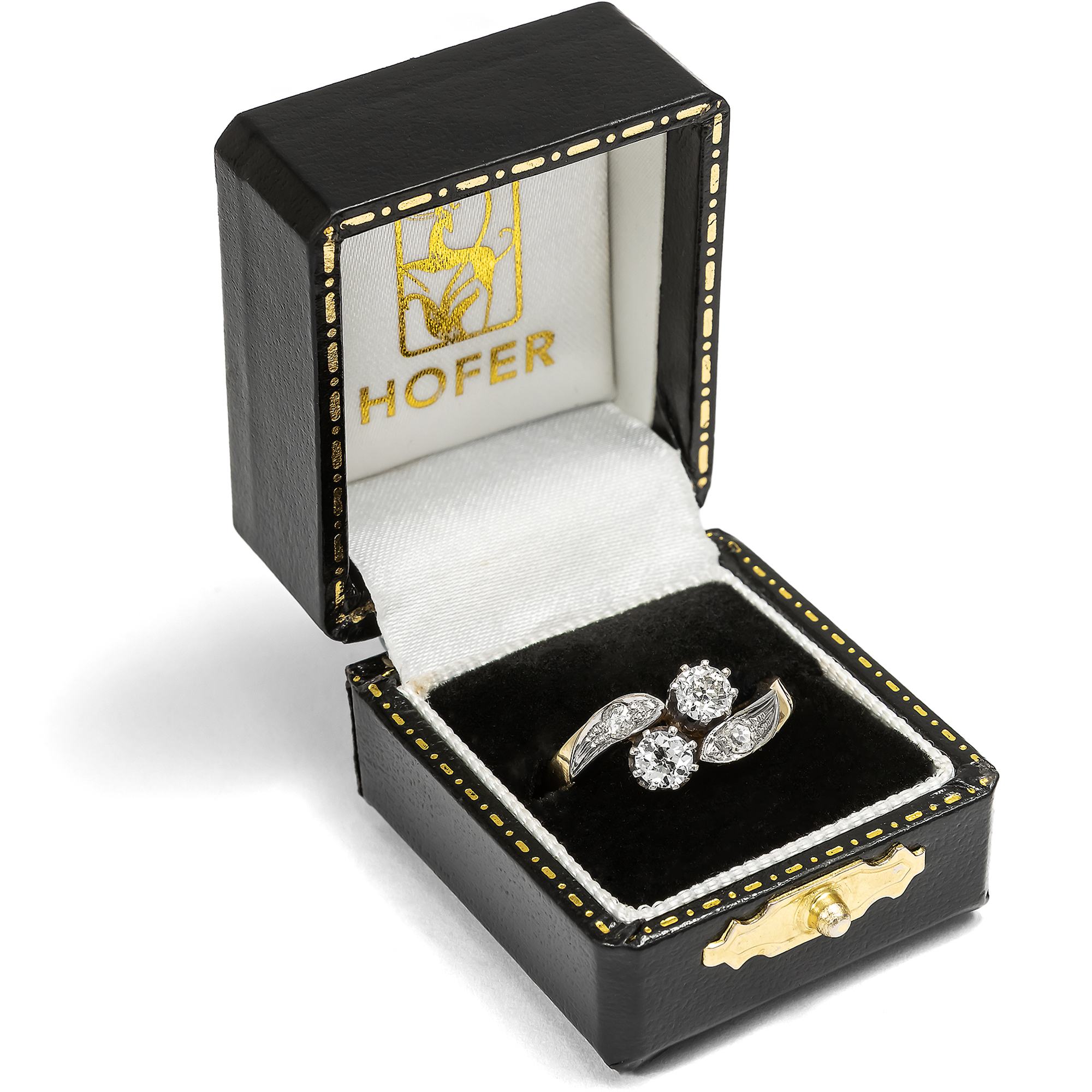 „Eins und eins, das macht zwei, Ein Herz ist immer dabei, Und wenn du Glück hast, dann sind es zwei.“ Fast meint man, der hier vorliegende Ring aus den Jahren um 1960 sei von diesen Zeilen aus Hildegard Knefs berühmten Chanson inspiriert. In eleganter Gegenüberstellung präsentiert der Ring zwei große, funkelnde Diamanten im Altschliff mit einem Gesamtgewicht von etwa 0,60 Karat. Zwei Schwünge, ebenfalls mit kleineren Diamanten besetzt, halten die wunderbar glitzernden Edelsteine, die wie in einem bewegten Pas de Deux für die Ewigkeit vereint sind. Der Ring ist aus Gelbgold gefertigt. Ringkopf und Steinfassungen sind mit Weißgold belegt. Dessen kühle Farbe in Kombination mit den weißen Diamanten verleiht dem Stück ein festliches Aussehen. Der Ring ist ein typisches Schmuckstück der Nachkriegszeit, das verrät seine solide, massive Verarbeitung. Auch wenn seine Gestaltung auf Vorbilder der Jahre um 1900 zurückgeht, so ist die Verwendung von viel Edelmetall charakteristisch für Schmuck der 1950er und 1960er Jahre. Die Steine allerdings sind tatsächlich älter als der Ring selbst. Wir können sie aufgrund ihrer Schliffe in die Jahre um 1900 datieren. Die Verarbeitung des Rings, die schönen Materialien und seine romantische Symbolik schaffen ein Schmuckstück, das vermutlich als Verlobungsring entworfen wurde. Zu uns fand der wohl erhaltene Ring aus dem Berliner Westen.
