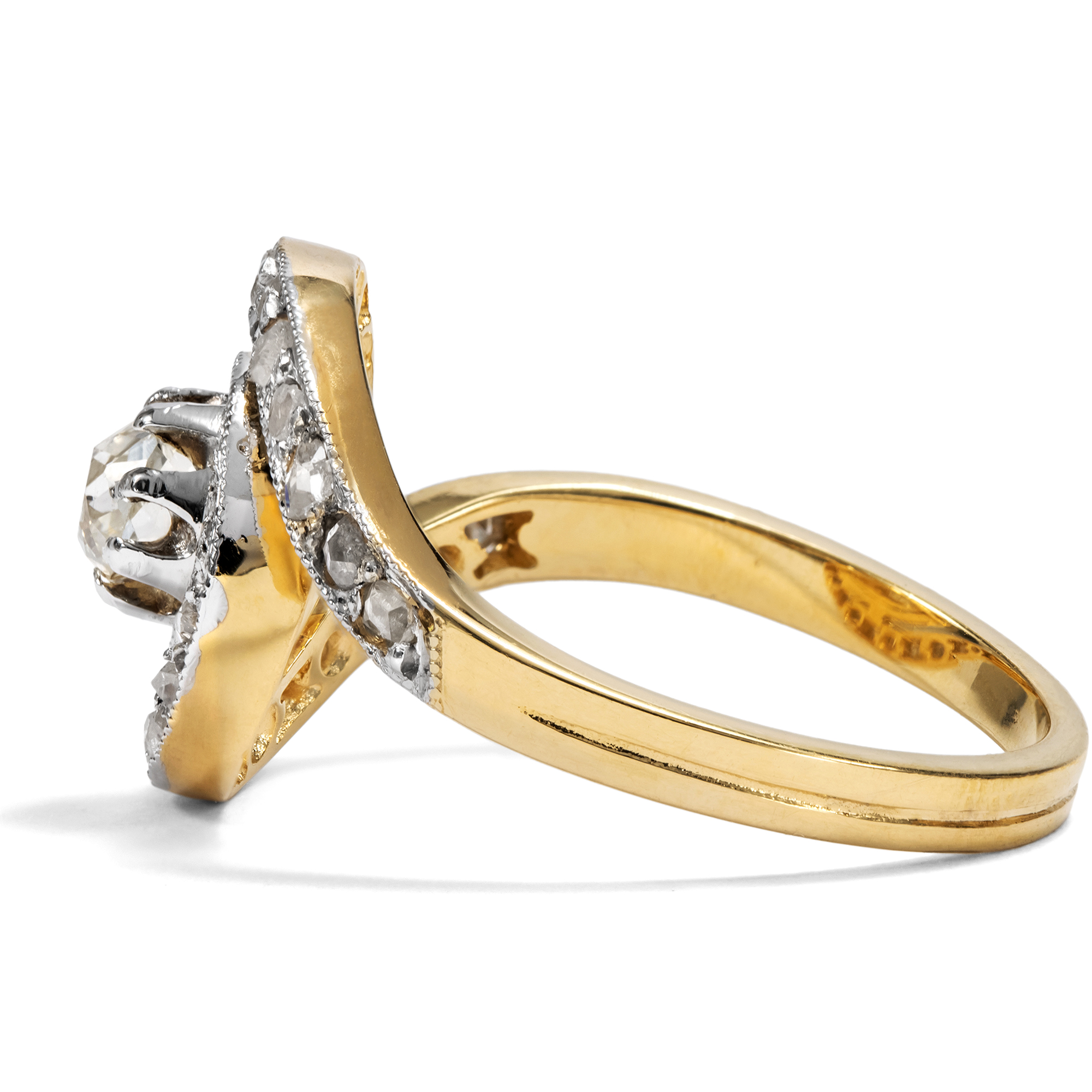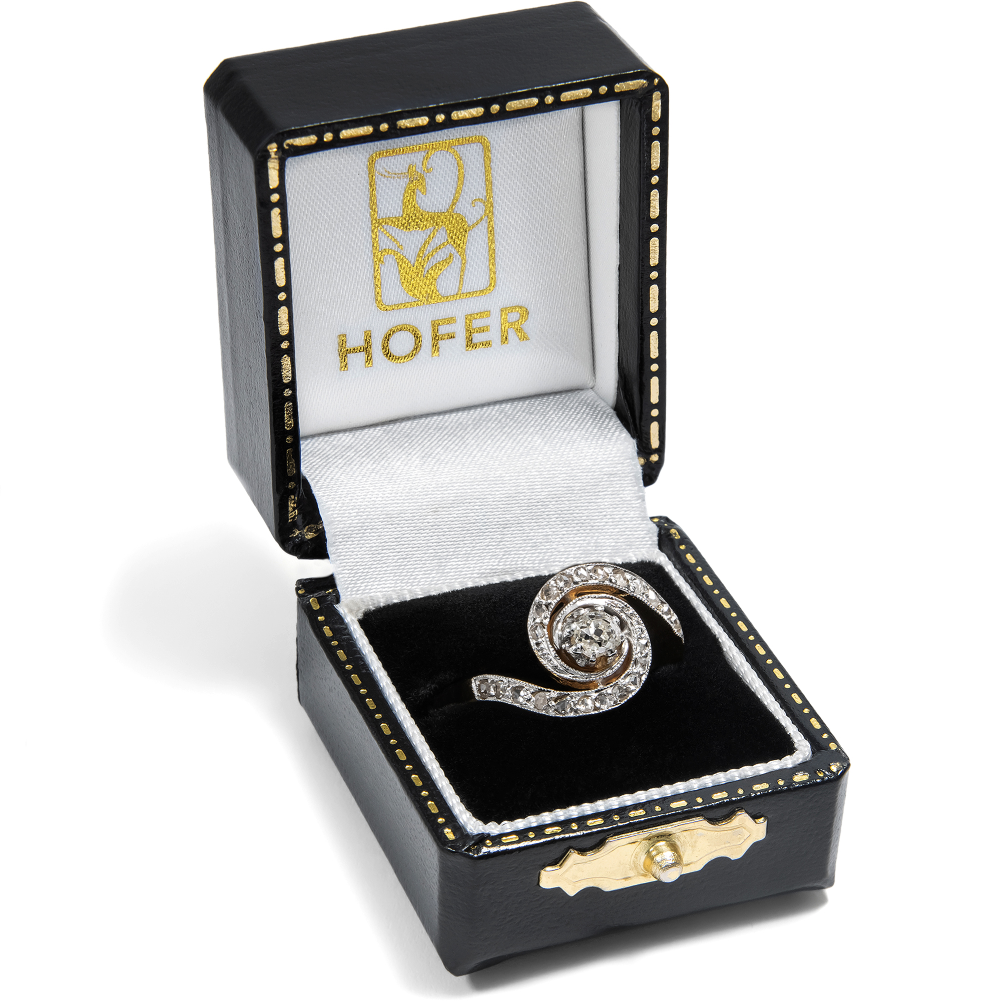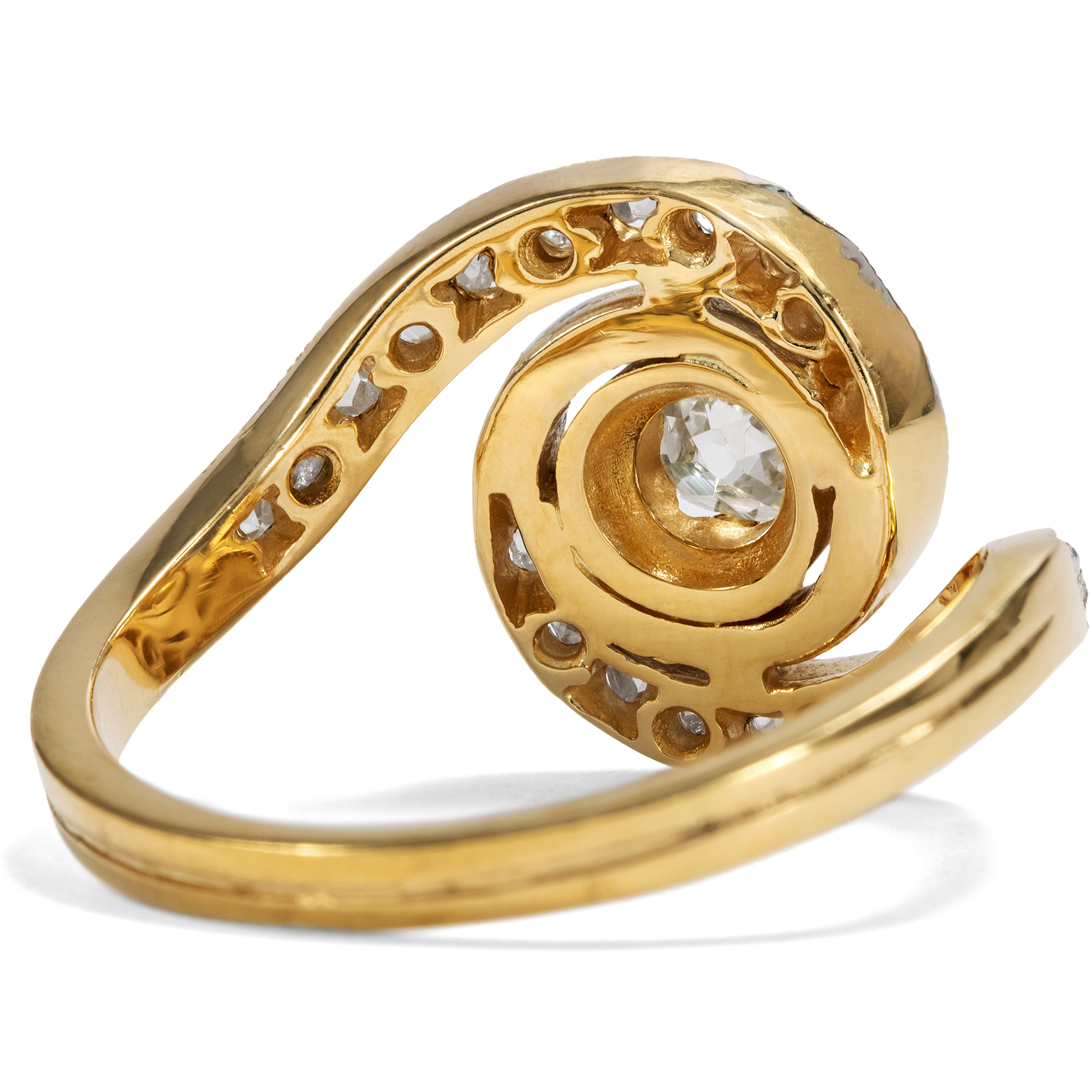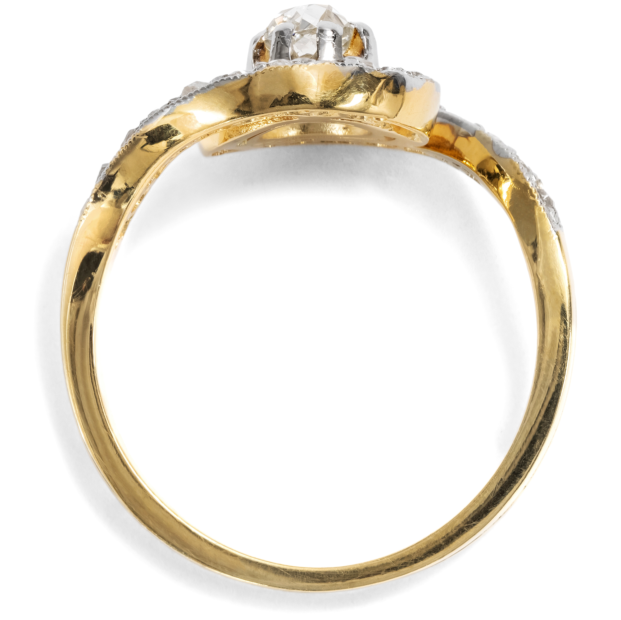 Der Typus des „Tourbillon“-Ringes taucht im Schmuck erstmals in den Jahren des Jugendstil auf. Die Bezeichnung kommt aus dem Französischen und heißt soviel wie „Wirbelwind“: Ein wunderbar beschreibender Name für einen Ring, dessen Ringschultern sich wie in einem Strudel um den zentralen Diamanten legen. Oder wie zwei schützende Hände, die einen kostbaren Schatz halten. Im Zentrum des hier wirbelnden Wirbelwinds steht ein antiker Diamant im kissenförmigen Altschliff, dem sogenannten „Old Mine Cut“. Er wiegt etwa 0,25 Karat und besitzt schöne, warmweiße Farbe. Seine Form verrät, dass er bereits in der ersten Hälfte des 19. Jahrhundert geschliffen wurde. Auf den Wirbeln, die den Mittelstein wie die Spiralarme einer Galaxis umgeben, funkeln zweiundzwanzig kleine Diamanten im Rosenschliff. Die gesamte sichtbare Oberfläche des eigentlich aus hochkarätigem Gold geschmiedeten Ringes ist mit einer Schicht aus Rhodium belegt, sodass er getragen weiß erscheint – so, wie es um 1910 Mode war. Die Verwendung von Rhodium verrät allerdings zugleich, dass der Ring nicht bereits um 1910 herum entstanden sein kann, sondern erst vor wenigen Jahren gefertigt wurde. Mit seiner Formensprache folgt er minutiös Vorbildern der Belle Époque. Die Diamanten allerdings sind älter und wurden hier zu neuem Leben erweckt, in einem Entwurf, der ihnen eine ganz perfekte Bühne bietet. Der Ring eignet sich aufgrund seiner Symbolik nicht zuletzt auch wunderbar als Verlobungsring. Ein ungewöhnlicher und zugleich tragbarer Solitär, der mehrere Generationen verbindet.
