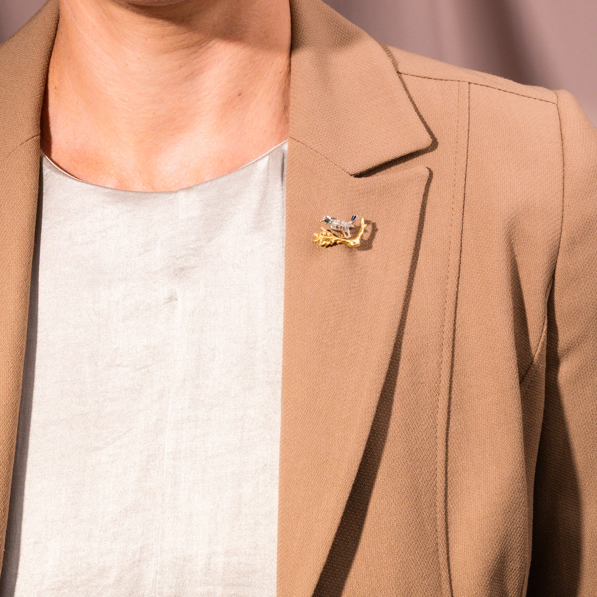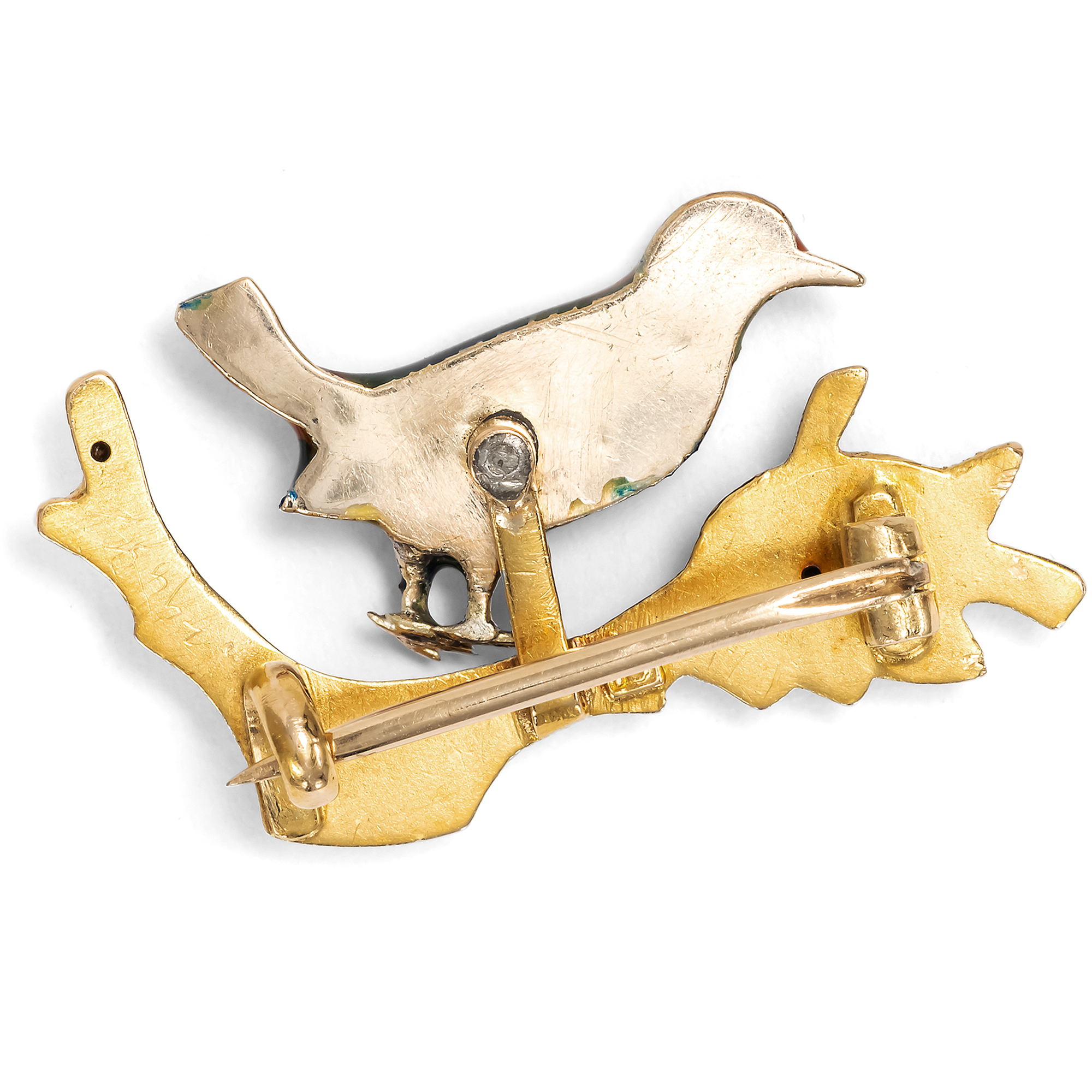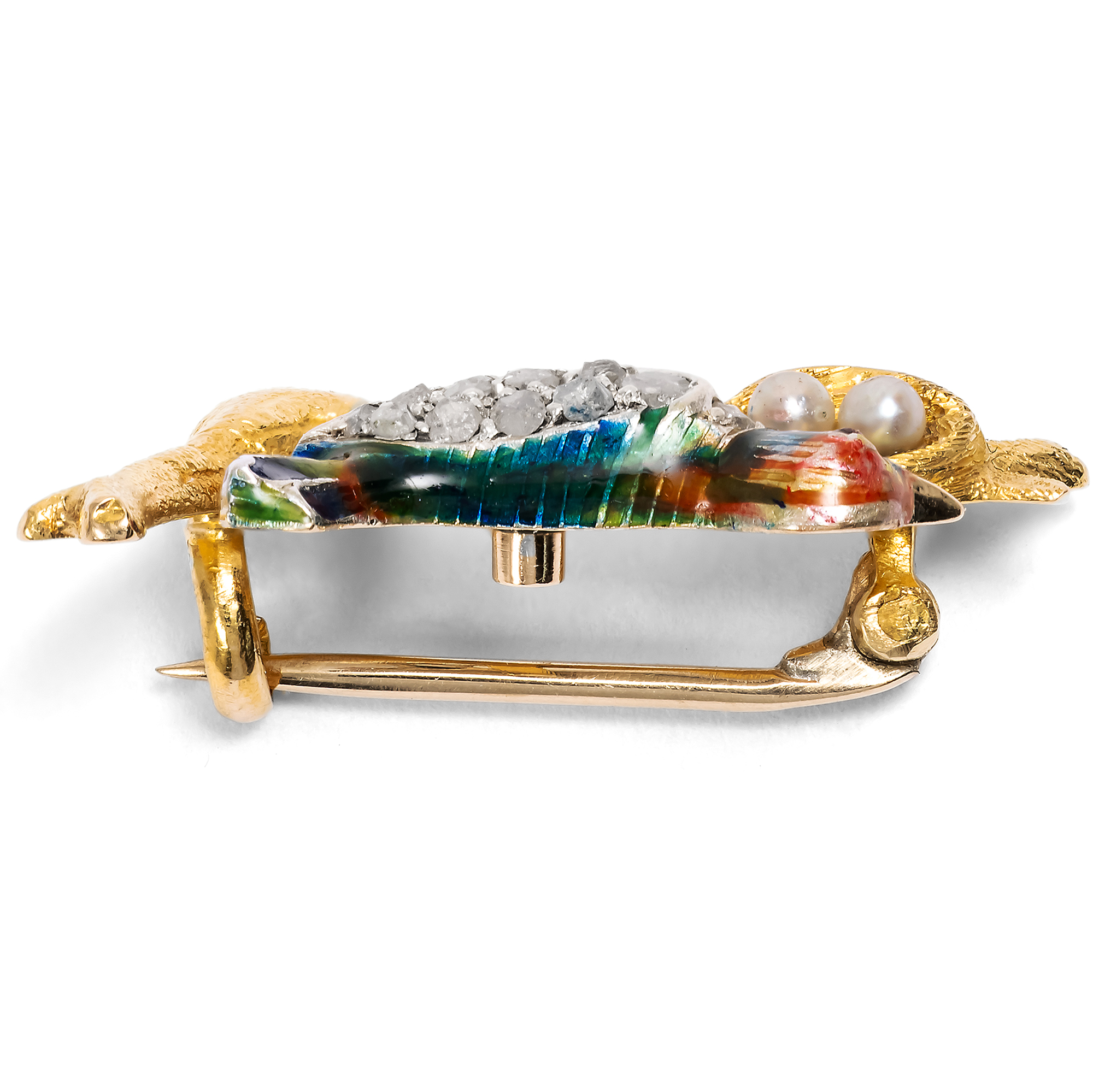 Schon in den späten 1860er-Jahren begann eine Schmuckmode, die so exzentrisch war, dass man sich noch heute fragt: Meinten die das ernst? Der sogenannte „Novelty“-Schmuck sprengte alle Konventionen. Plötzlich hingen den Damen Aquarien mit kleinen Fischmotiven aus Bergkristall an den Ohren. Kurz darauf baumelten Miniatur-Kochtöpfe am Ohrläppchen, und in den 1880er-Jahren huschten sogar goldene Mäuse über die Arme feiner Gesellschaftsdamen. Kurios, kurzlebig – aber garantiert ein Gesprächsthema auf jedem viktorianischen Teekränzchen. In diese wunderbare Kategorie fällt auch unsere Brosche aus den Jahren um 1890, entstanden im viktorianischen England. Sie zeigt einen liebevollen kleinen Vogel, der es sich auf einem goldenen Ast bequem gemacht hat. Ganz pflichtbewusst hat er ein Nest gebaut und darin zwei Eier gelegt – dargestellt durch zarte Naturperlen. Das Federkleid des kleinen Gefährten funkelt in Diamanten im Rosenschliff und leuchtet in feiner Emaille. Und, wie es sich gehört, wacht er aufmerksam über sein kleines Zuhause. Während der Vogel selbst aus Silber gefertigt ist, erstrahlen Ast und Nest im warmen Glanz von 15-karätigem Gold – einer Legierung, die in England nur bis 1932 verwendet wurde. Ein Schmuckstück also, das zeigt: Auch im viktorianischen Zeitalter hatten die Damen und Juweliere Sinn für Humor – und bis heute kann das Vögelchen seiner Funktion als Conversation piece gerecht werden. Entdeckt haben wir die zierliche Brosche im Süden Englands.