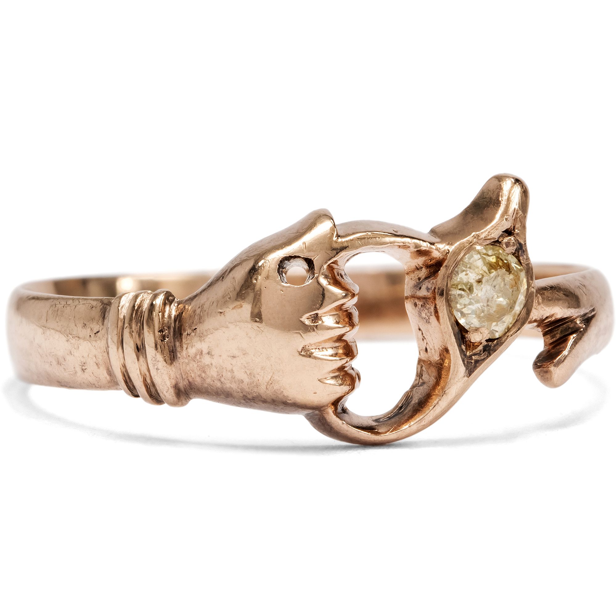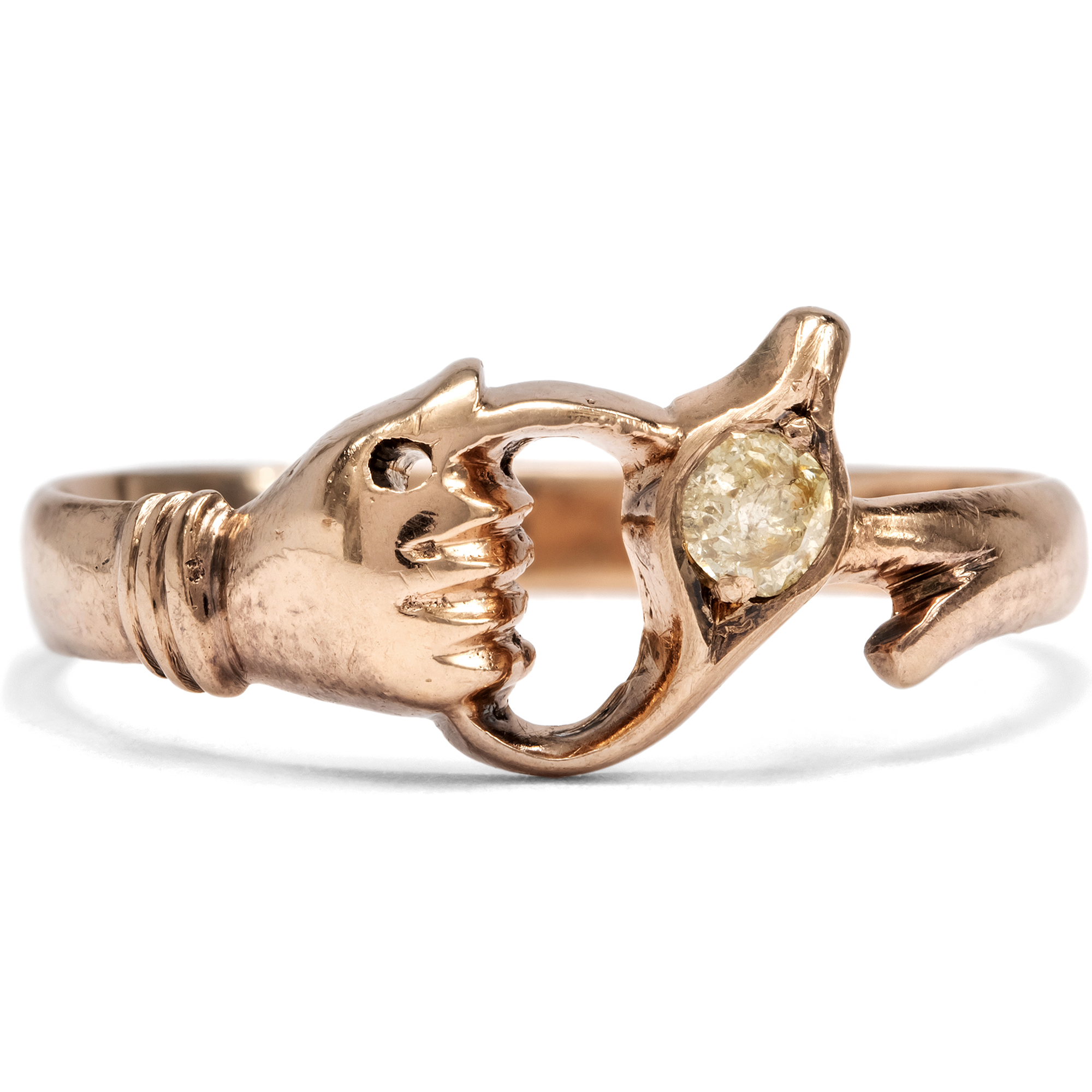 Es gibt Ringe, die einfach nur schön sind, und es gibt Ringe, die eine kleine Geschichte erzählen. Dieser charmante Ring aus der Zeit des Biedermeier gehört eindeutig zur zweiten Sorte. Auf den ersten Blick sieht man eine Form, die das Auge nicht sofort erfassen kann. Dann erkennt man eine zarte Hand aus warm schimmerndem Roségold, die entschlossen eine Pflanze umschließt. Bei näherem Hinsehen stellt man fest, dass die Blüte einen gelb schimmernden Diamanten trägt, der mit stillem Selbstbewusstsein funkelt, als wolle er sagen: Ja, ich bin klein, aber unterschätze mich nicht. Man fragt sich unwillkürlich, wen oder was diese kleine goldene Hand festhält. Vielleicht symbolisiert sie Treue, vielleicht Zuneigung oder ein entschlossenes Festhalten an einem schönen Moment. Der Ring wirkt wie ein charmantes Relikt aus einer Welt, in der Gefühle gern in kleine Symbole verpackt wurden. Der Ring trägt die leise Hoffnung, etwas Wertvolles nicht loslassen zu müssen. Ein wunderbares Schmuckstück für Menschen, die Freude daran haben, wenn ein Ring nicht nur glänzt, sondern auch ein Gefühl mitbringt.