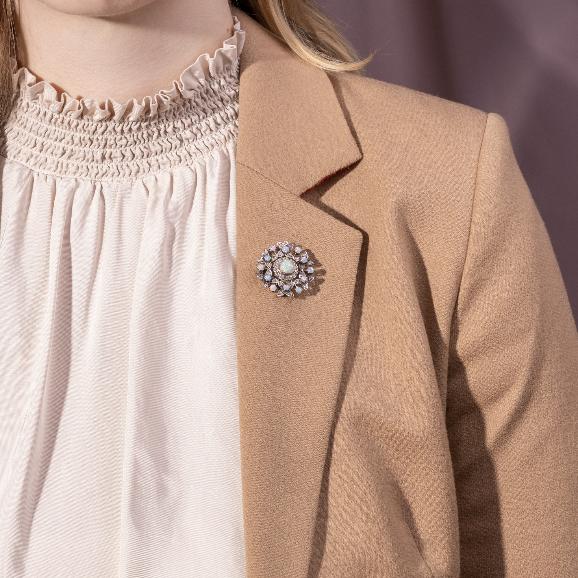 Schmuck mit Opalen war bis in das späte 19. Jahrhundert hinein recht selten. Dies änderte sich erst mit der Entdeckung der reichen Opalvorkommen in Australien gegen Ende des Jahrhunderts. Diese australischen Opale bestachen durch ihre leuchtenden Farben und ihre einzigartigen Lichtspiele. Um ihre Wertigkeit zu unterstreichen, fasste man sie besonders gern neben Diamanten: „In der Tat eine treffliche Zusammenstellung, da die Brillanten diesen Halbedelsteinen ihren Glanz leihen und hierdurch wunderbare Farbenwirkungen hervorbringen“, entnahm die geneigte Leserin dem deutschen Damenjournal Der Bazar bereits 1889. Die hier vorliegende Brosche stammt aus der Zeit dieser großen Opalmode – und es wird sofort deutlich, welches Aufsehen die Steine von „Down Under“ ausgelöst haben müssen, als sie erstmals auf den europäischen Markt kamen. Die blütenförmige Brosche ist in Silber auf Gold gefertigt und kombiniert die Opale mit kleinen Altschliffdiamanten. Schillernde, auffallend intensive Farbreflexe gleiten bei jeder Bewegung über die Opalcabochons und verändern sich bei jedem Lichteinfall. Die Farben sind leuchtend und nehmen den Blick gefangen. Die Brosche entstand um 1890 vermutlich in Großbritannien. Wir konnten sie in London entdecken, zusammen mit dem abgebildeten, antiken Etui des Juweliers John Knight & Co. aus Leeds. Das Zitat aus Der Bazar 35 (23. Dezember 1889), S. 509.