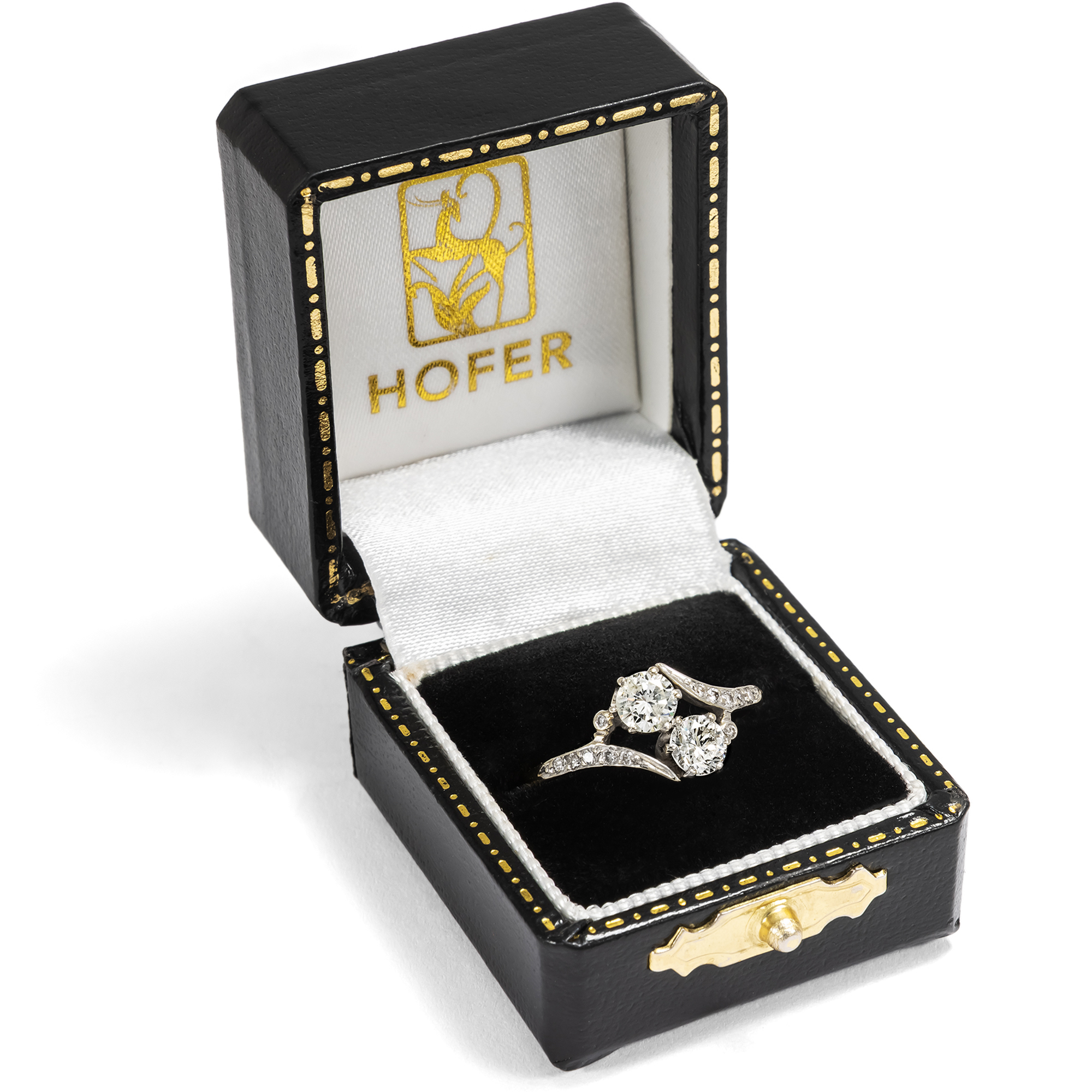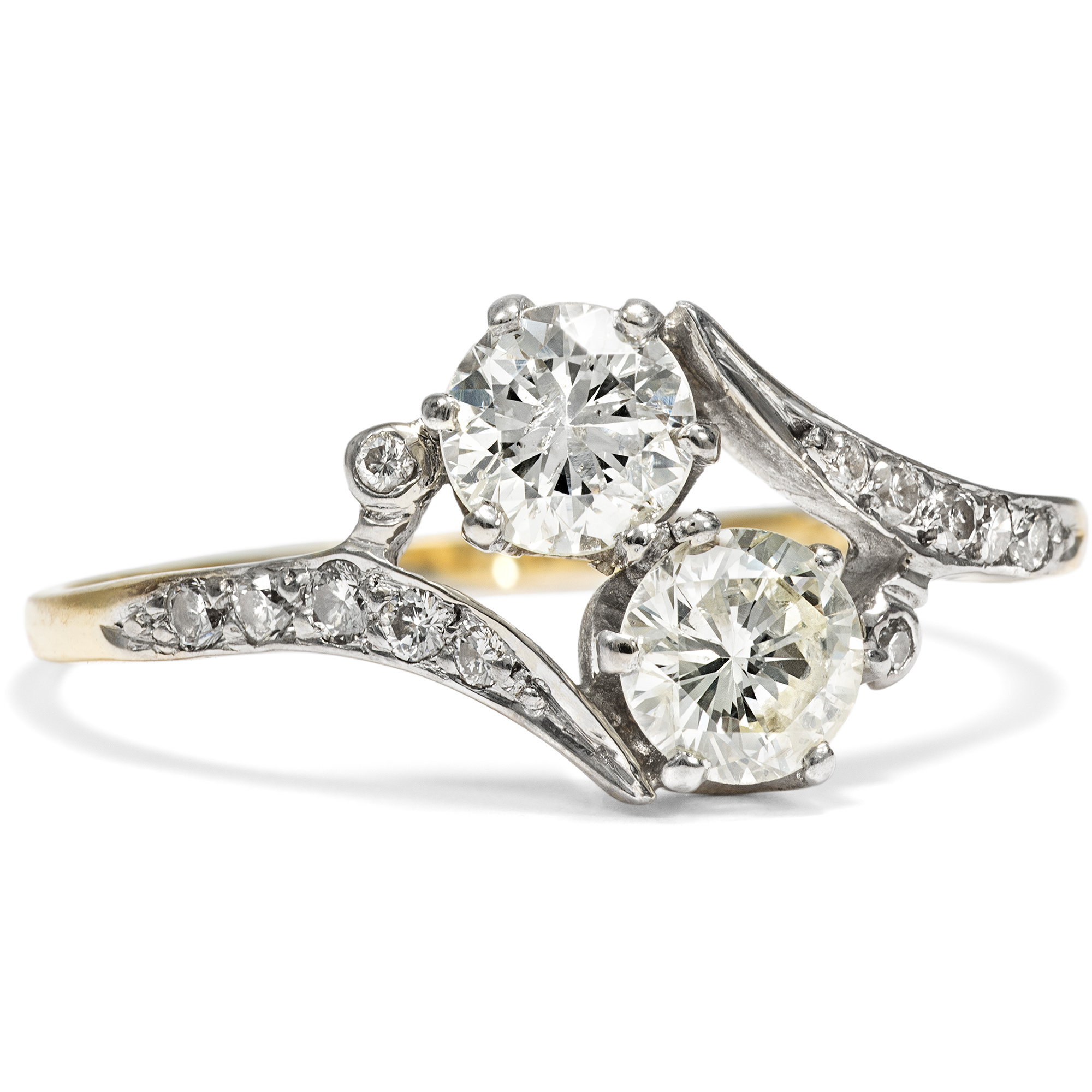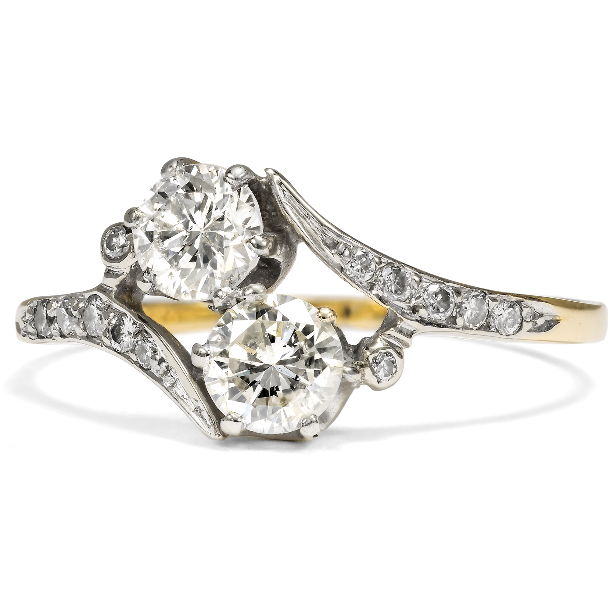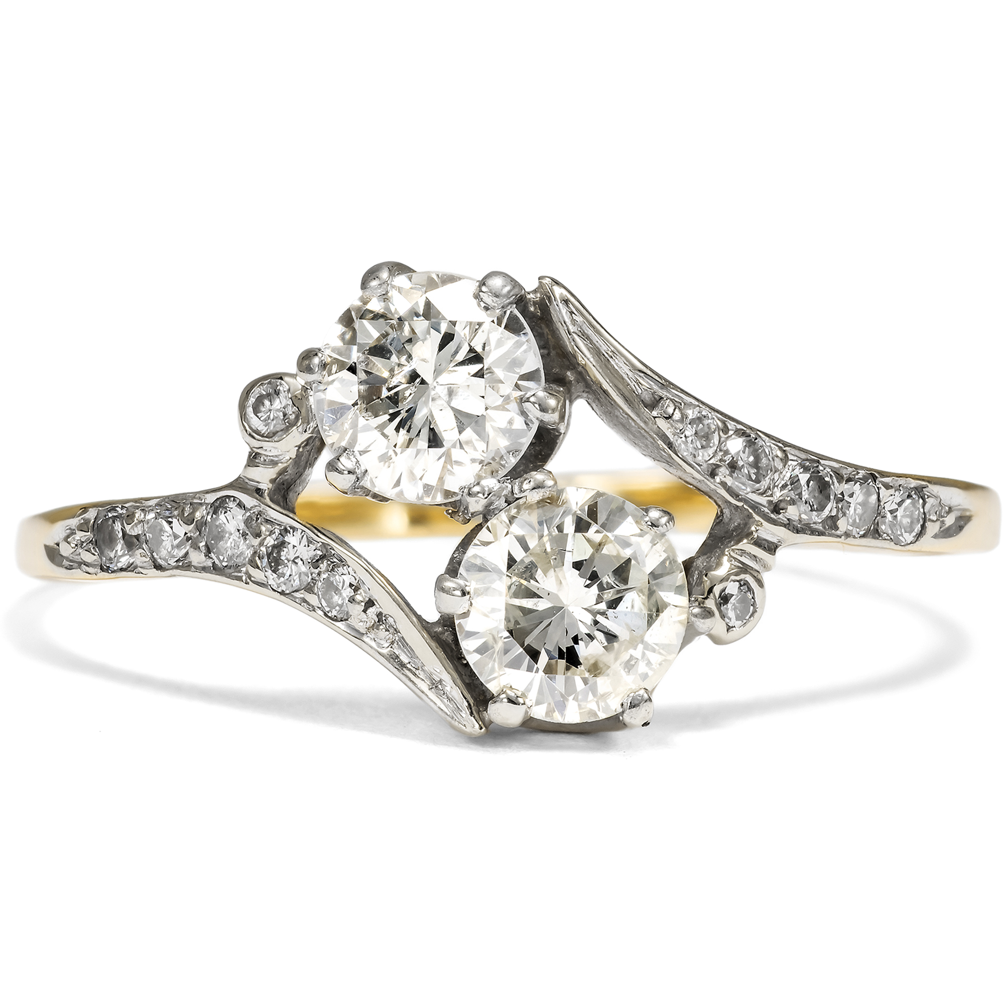 Schmuckstücke waren durch alle Zeiten Bedeutungsträger. Kaum ein Bereich ist dabei stärker vertreten und anrührender als das große Feld der Liebe. Der vorliegende Vintage-Ring zeigt ein wohlbekanntes Motiv, das sich in der Schmuckgeschichte immer wieder findet. In eleganter Gegenüberstellung präsentiert der Ring zwei funkelnde Edelsteine. Es handelt sich um ein klassisches „Toi-et-Moi“-Design (französisch für „Du und ich“), das traditionell als romantisches Geschenk galt. Der Ring symbolisiert die Verschmelzung zweier Individuen zu einem harmonischen Ganzen, wobei beide ihre Eigenständigkeit bewahren. Die beiden Brillanten von jeweils etwa 0,34 ct strahlen in perfektem Einklang und fangen das Licht aus allen Richtungen ein. Die Diamanten werden von feinen Krappen und geschwungenen Schultern aus Gold gehalten, die sie sicher umschließen und gleichzeitig elegant in Szene setzen. Die Ringschiene schwingt sanft um die Steine und verleiht dem Ring die Anmutung, als würden die Edelsteine in behutsamen Händen getragen. Kleinere Brillanten begleiten die Mittelsteine und werden wie diese in rhodinierten Fassungen gehalten. Der Ring entstand um 1980 in Großbritannien und folgt in seiner Formensprache den Vorbildern der Belle Époque, deren Schmuck für seine filigrane Handwerkskunst und romantische Ausdruckskraft geschätzt wurde. Ein charmantes Vintage-Stück, das sowohl als Geschenk als auch als eleganter Blickfang begeistert.