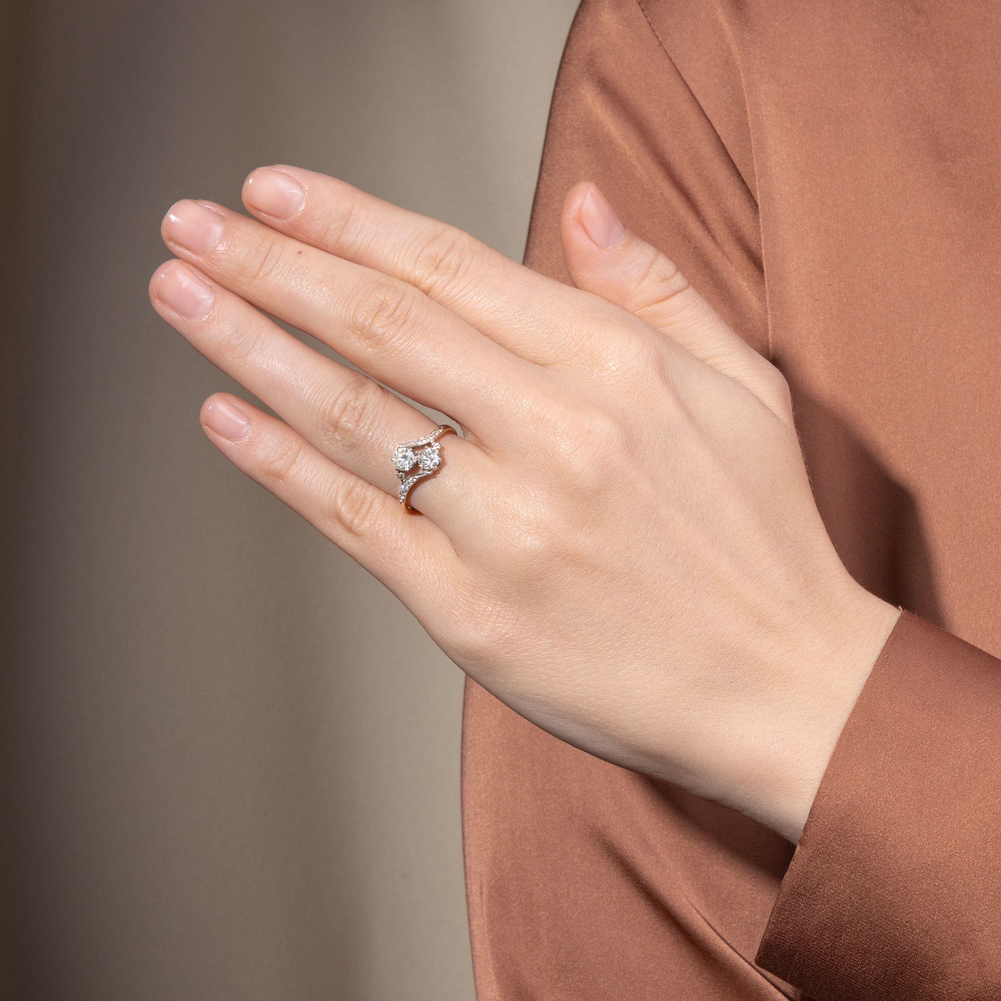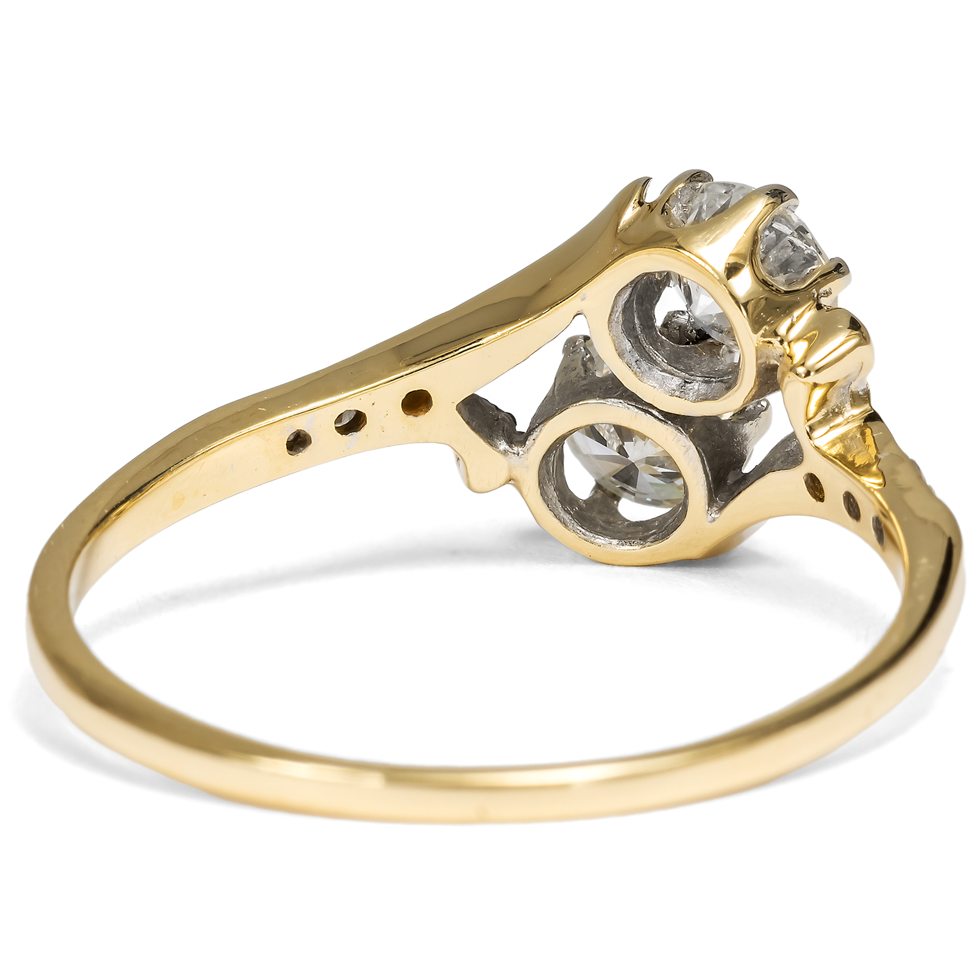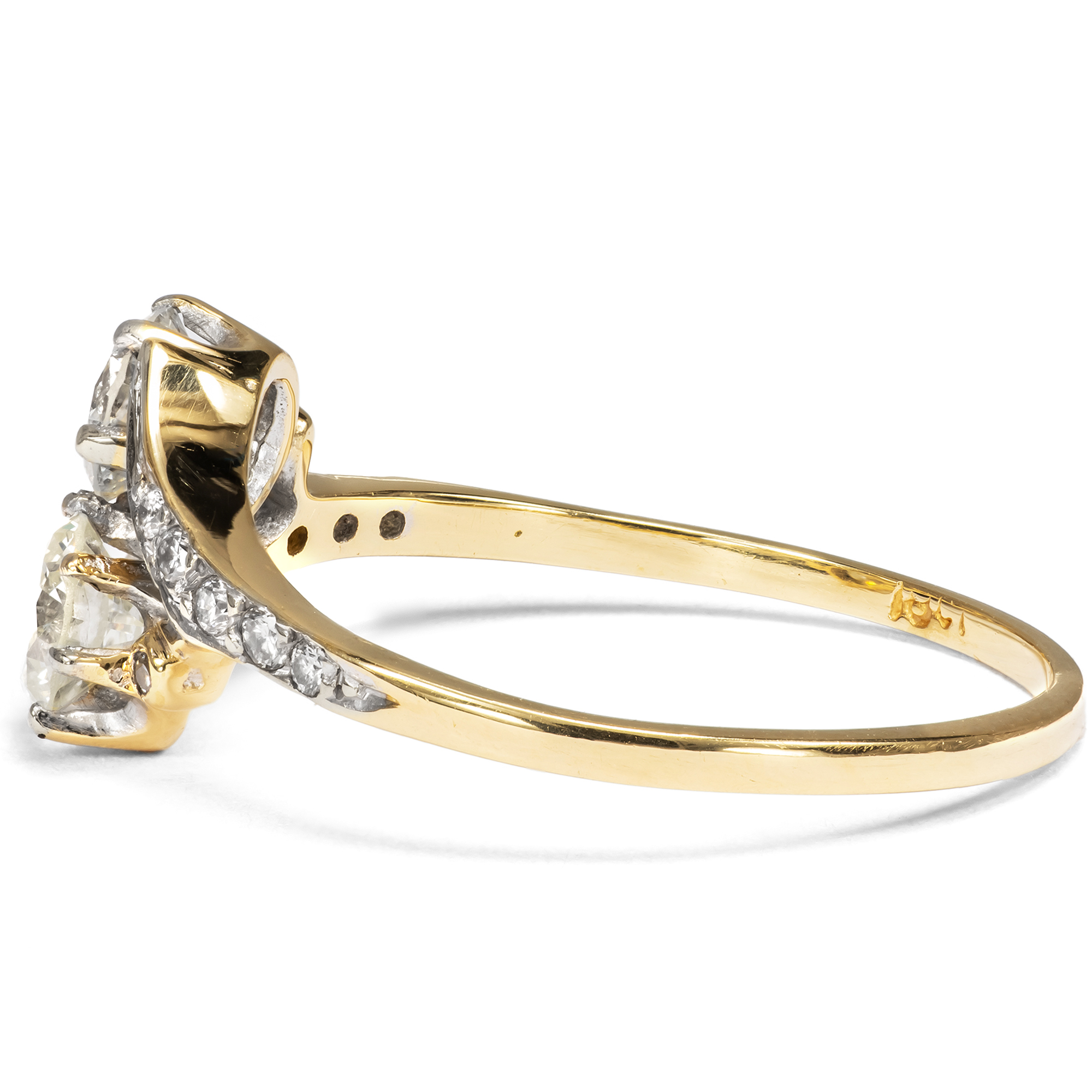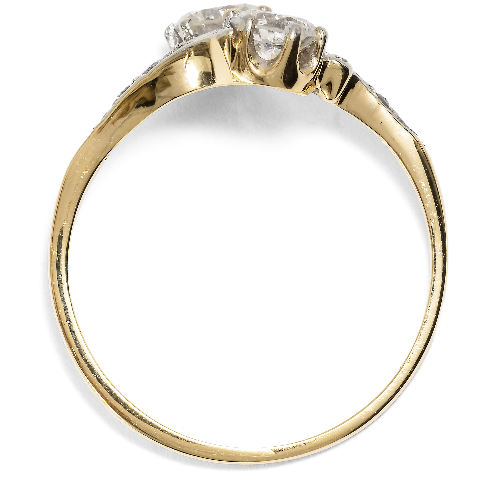 Schmuckstücke waren durch alle Zeiten Bedeutungsträger. Kaum ein Bereich ist dabei stärker vertreten und anrührender als das große Feld der Liebe. Der vorliegende Vintage-Ring zeigt ein wohlbekanntes Motiv, das sich in der Schmuckgeschichte immer wieder findet. In eleganter Gegenüberstellung präsentiert der Ring zwei funkelnde Edelsteine. Es handelt sich um ein klassisches „Toi-et-Moi“-Design (französisch für „Du und ich“), das traditionell als romantisches Geschenk galt. Der Ring symbolisiert die Verschmelzung zweier Individuen zu einem harmonischen Ganzen, wobei beide ihre Eigenständigkeit bewahren. Die beiden Brillanten von jeweils etwa 0,34 ct strahlen in perfektem Einklang und fangen das Licht aus allen Richtungen ein. Die Diamanten werden von feinen Krappen und geschwungenen Schultern aus Gold gehalten, die sie sicher umschließen und gleichzeitig elegant in Szene setzen. Die Ringschiene schwingt sanft um die Steine und verleiht dem Ring die Anmutung, als würden die Edelsteine in behutsamen Händen getragen. Kleinere Brillanten begleiten die Mittelsteine und werden wie diese in rhodinierten Fassungen gehalten. Der Ring entstand um 1980 in Großbritannien und folgt in seiner Formensprache den Vorbildern der Belle Époque, deren Schmuck für seine filigrane Handwerkskunst und romantische Ausdruckskraft geschätzt wurde. Ein charmantes Vintage-Stück, das sowohl als Geschenk als auch als eleganter Blickfang begeistert.