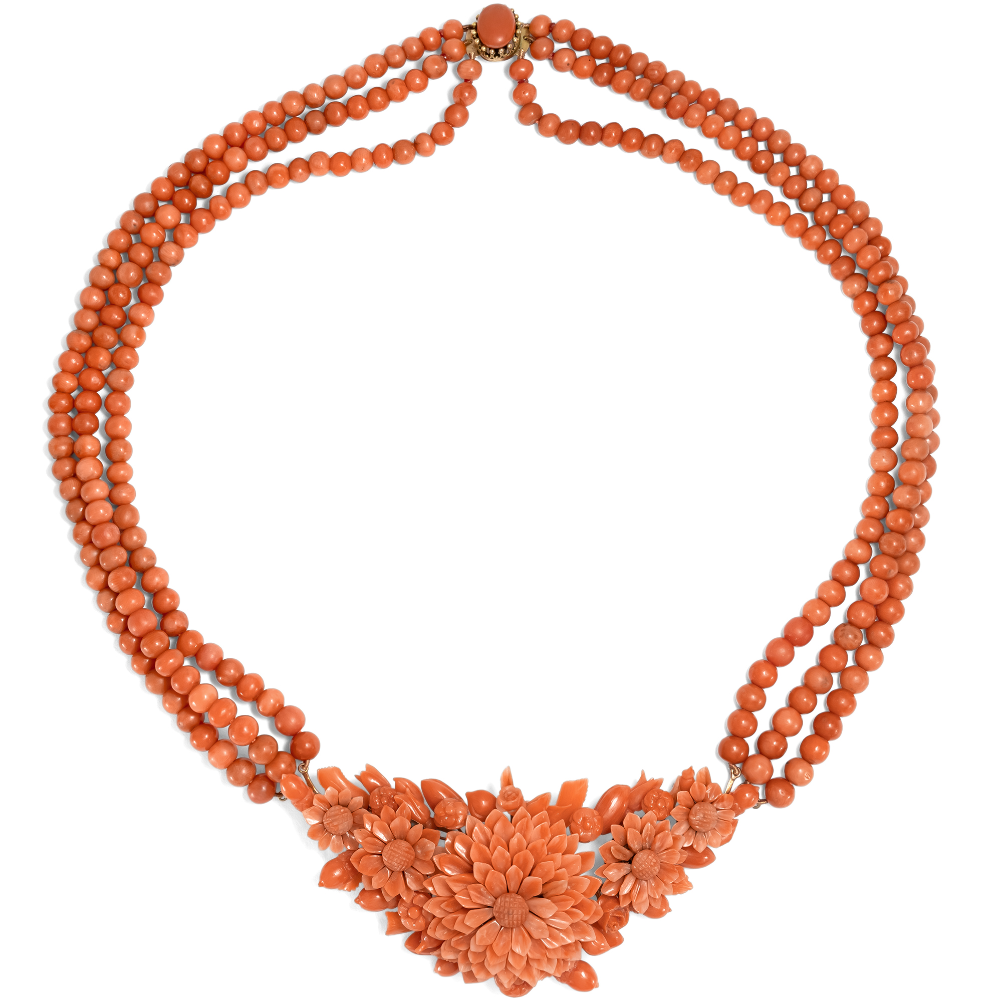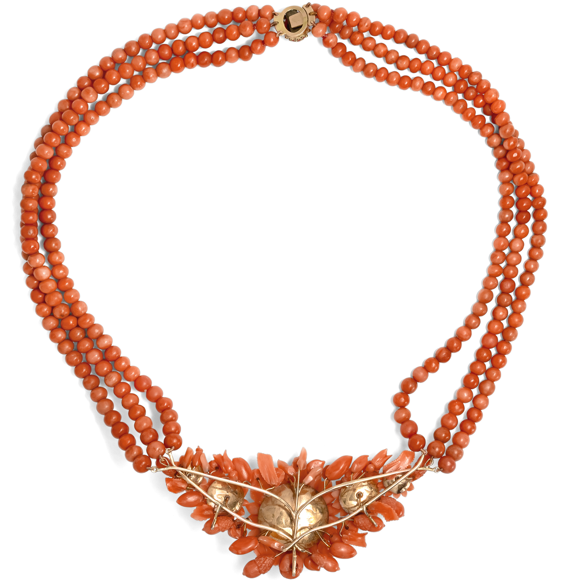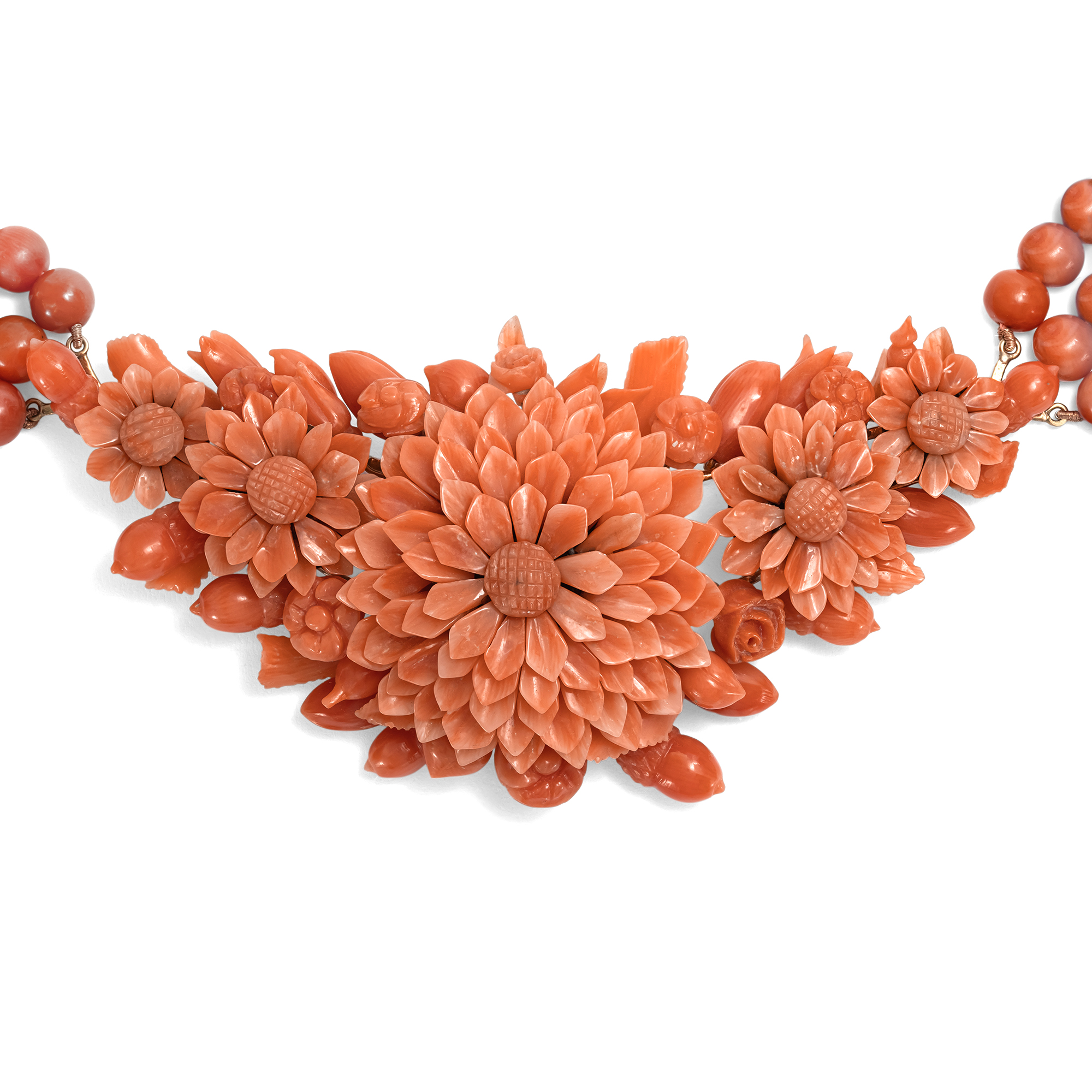 Schmuck aus geschnitzter Koralle ist eines der bis heute spektakulärsten Souvenirs einer Reise nach Neapel zur Mitte des 19. Jahrhunderts. Einfache Ketten aus zu Kugeln geschnitzter Koralle kennen wir in großer Zahl. Colliers, Broschen und ganze Paruren indes aus von Hand zu Blumen und Blüten, Blättern und Früchten geschnitzter Koralle sind außergewöhnlich selten und eine große Freude, denn sie laden ein zu einer Reise in Gedanken und ringen zugleich Bewunderung vor der Handwerkskunst der Meister ab. Das hier vorliegende Collier entfaltet an drei Reihen kräftiger Korallenperlen ein zart duftendes Bouquet aus Blüten und Früchten. Fünf große, voll aufgeblühte Chrysanthemen bestehen aus ungezählten, einzeln geschnitzten Blütenblättern, kleinere Blüten und Früchte rahmen das Arrangement. Wir finden hier auch kleine Eicheln, eine Referenz an den Schmuck der antiken Römer und Etrusker, die dasselbe Motiv als Symbol der Fruchtbarkeit und der Stärke oft in Gold ausführten. Alle Elemente sind dabei einzeln auf Stäbe aus Gold montiert. Die verwendeten Korallen stammen aus dem Mittelmeer. Sie zeigen einen warmen, hellroten Lachston, der im 19. Jahrhundert als die begehrenswerteste Korallenfarbe galt. Kunstvolle Stücke wie dieses entstanden fast ausschließlich in der Bucht von Neapel, wo sich die bedeutendsten Werkstätten jener Zeit befanden. Von dort aus gelangten sie in die Salons ganz Europas. Auf der Weltausstellung in London im Jahr 1851 sorgte der Stand des Juweliers Robert Phillips für großes Aufsehen, als er eine beeindruckende Auswahl fein geschnitzter italienischer Korallen präsentierte – Arbeiten, die wenig später in die Sammlung des heutigen Victoria & Albert Museum aufgenommen wurden. Wir haben das Collier, dessen feine Korallen in Gold gefasst sind, hier in Berlin entdeckt. Es ist wunderbar erhalten, stets wurde es sorgsam gepflegt und so sind die Blüten noch intakt. Eine Demi-Parure in ähnlicher Machart findet sich beispielsweise im British Museum, Inv. Nr. 1978,1002.857.a-b, vgl. hier. Ein vergleichbares, wenngleich weit weniger aufwendig gefertigtes Armband in der Sammlung des Victoria & Albert Museums, Inv. nr. M.126-1984, vgl. hier. Vgl. zur Datierung auch David Bennet und Daniela Mascetti: Understanding Jewellery, Woodbridge 2010, S. 107, S. 107, S. 111, sowie Charlotte Gere/Judy Rudoe: Jewellery in the Age of Queen Victoria, London: British Museum Press 2010, S. 240-243.