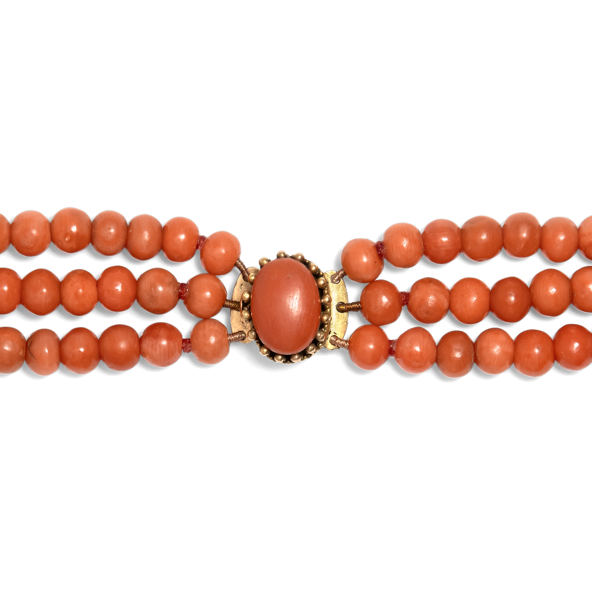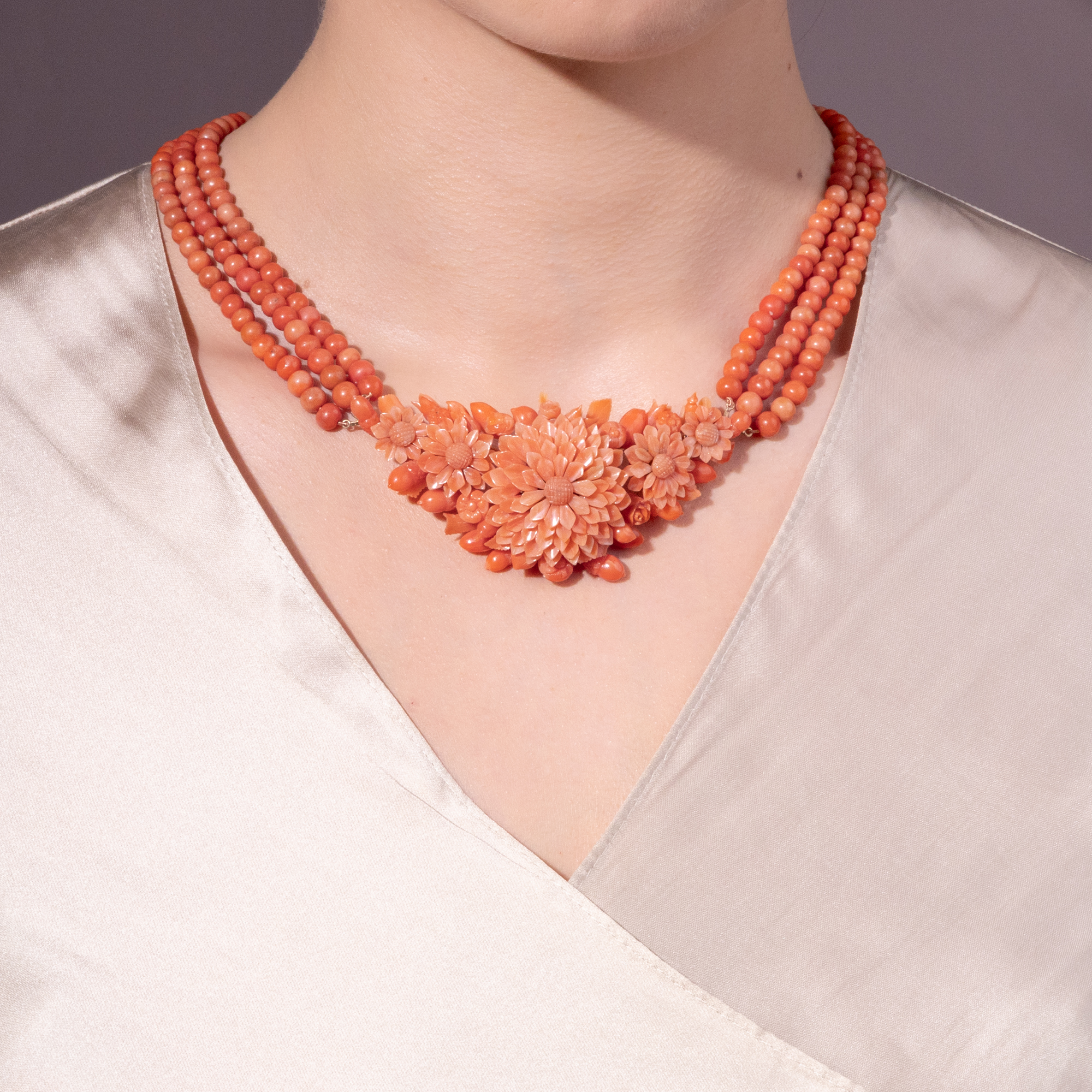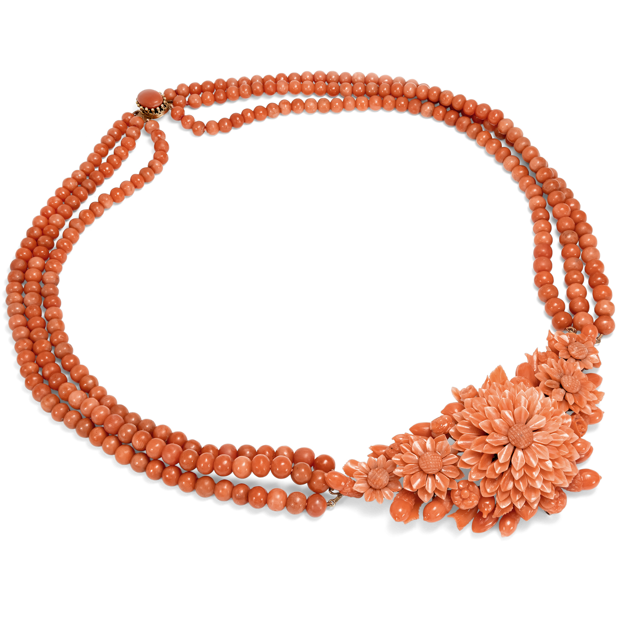 Schmuck aus geschnitzter Koralle ist eines der bis heute spektakulärsten Souvenirs einer Reise nach Neapel zur Mitte des 19. Jahrhunderts. Einfache Ketten aus zu Kugeln geschnitzter Koralle kennen wir in großer Zahl. Colliers, Broschen und ganze Paruren indes aus von Hand zu Blumen und Blüten, Blättern und Früchten geschnitzter Koralle sind außergewöhnlich selten und eine große Freude, denn sie laden ein zu einer Reise in Gedanken und ringen zugleich Bewunderung vor der Handwerkskunst der Meister ab. Das hier vorliegende Collier entfaltet an drei Reihen kräftiger Korallenperlen ein zart duftendes Bouquet aus Blüten und Früchten. Fünf große, voll aufgeblühte Chrysanthemen bestehen aus ungezählten, einzeln geschnitzten Blütenblättern, kleinere Blüten und Früchte rahmen das Arrangement. Wir finden hier auch kleine Eicheln, eine Referenz an den Schmuck der antiken Römer und Etrusker, die dasselbe Motiv als Symbol der Fruchtbarkeit und der Stärke oft in Gold ausführten. Alle Elemente sind dabei einzeln auf Stäbe aus Gold montiert. Die verwendeten Korallen stammen aus dem Mittelmeer. Sie zeigen einen warmen, hellroten Lachston, der im 19. Jahrhundert als die begehrenswerteste Korallenfarbe galt. Kunstvolle Stücke wie dieses entstanden fast ausschließlich in der Bucht von Neapel, wo sich die bedeutendsten Werkstätten jener Zeit befanden. Von dort aus gelangten sie in die Salons ganz Europas. Auf der Weltausstellung in London im Jahr 1851 sorgte der Stand des Juweliers Robert Phillips für großes Aufsehen, als er eine beeindruckende Auswahl fein geschnitzter italienischer Korallen präsentierte – Arbeiten, die wenig später in die Sammlung des heutigen Victoria & Albert Museum aufgenommen wurden. Wir haben das Collier, dessen feine Korallen in Gold gefasst sind, hier in Berlin entdeckt. Es ist wunderbar erhalten, stets wurde es sorgsam gepflegt und so sind die Blüten noch intakt. Eine Demi-Parure in ähnlicher Machart findet sich beispielsweise im British Museum, Inv. Nr. 1978,1002.857.a-b, vgl. hier. Ein vergleichbares, wenngleich weit weniger aufwendig gefertigtes Armband in der Sammlung des Victoria & Albert Museums, Inv. nr. M.126-1984, vgl. hier. Vgl. zur Datierung auch David Bennet und Daniela Mascetti: Understanding Jewellery, Woodbridge 2010, S. 107, S. 107, S. 111, sowie Charlotte Gere/Judy Rudoe: Jewellery in the Age of Queen Victoria, London: British Museum Press 2010, S. 240-243.