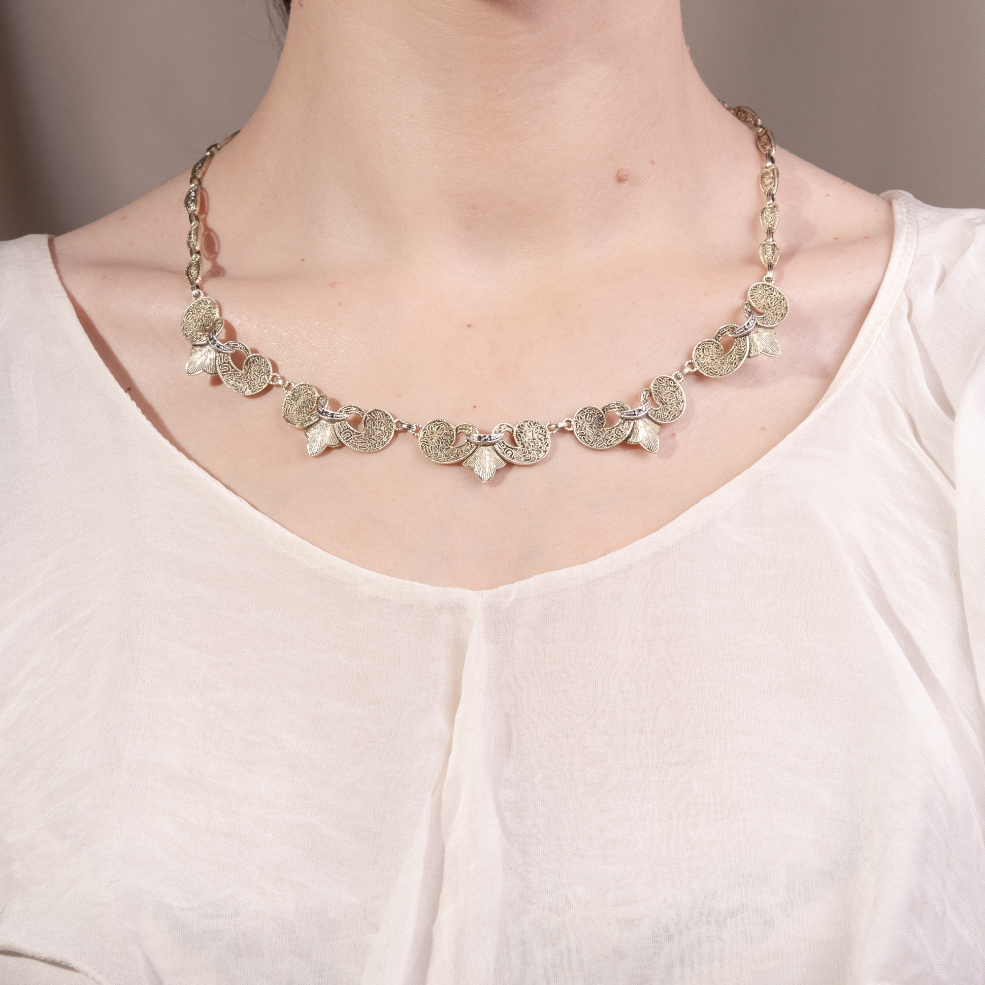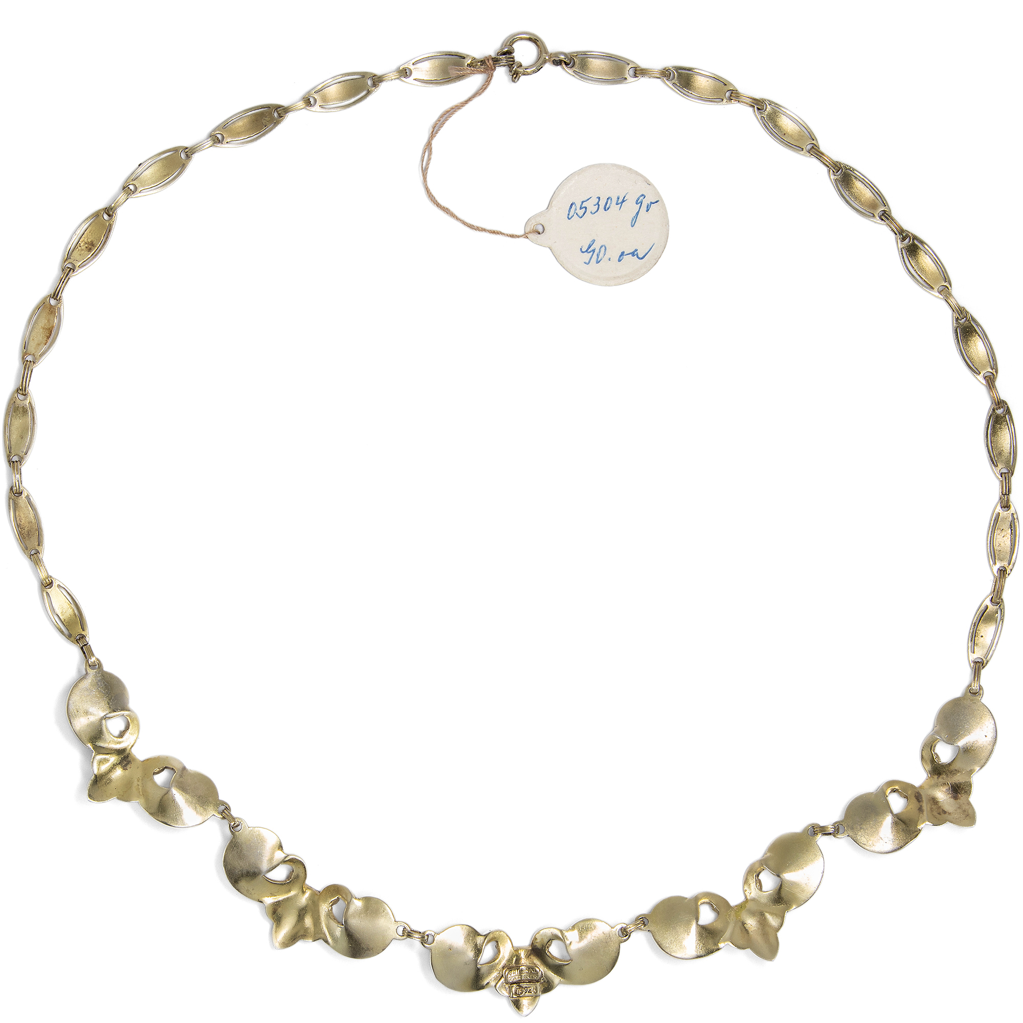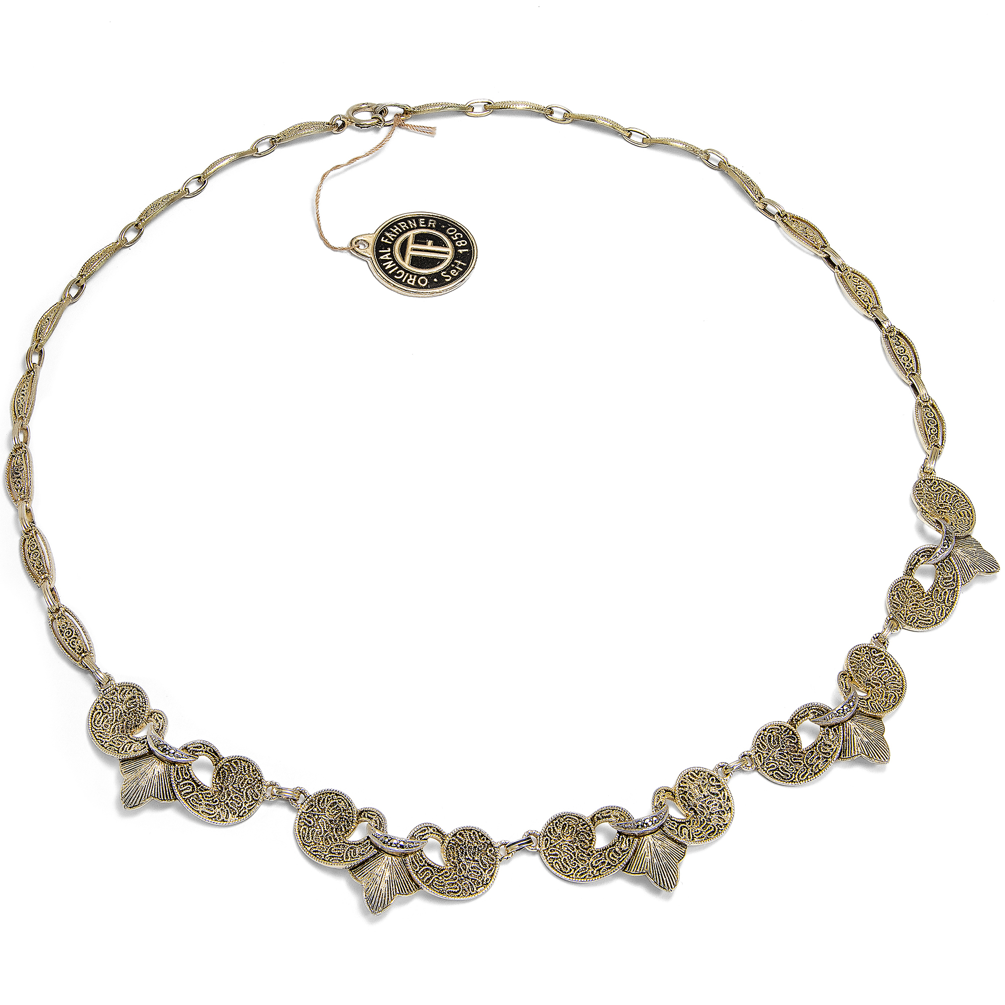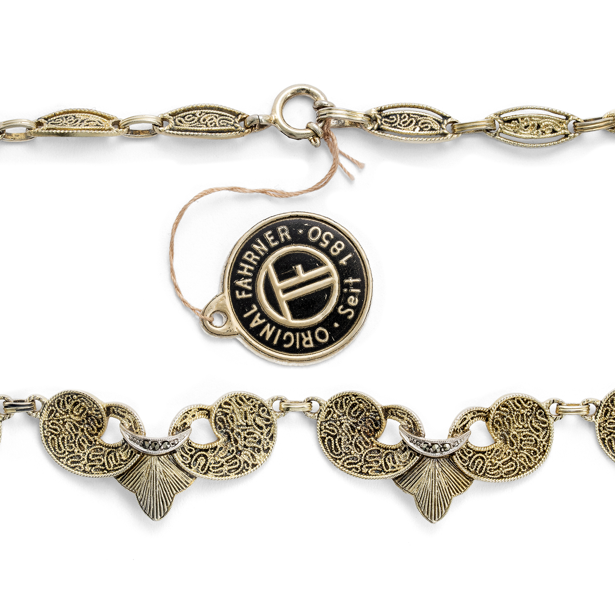 n der Geschichte des Schmucks von Jugendstil und Art Déco nimmt Fahrner-Schmuck aus Pforzheim einen besonderen Platz ein. Denn Theodor Fahrner und später sein Nachfolger Gustav Braendle verstanden es wie kaum ein anderer Schmuckfabrikant der Moderne, künstlerisch überzeugende Entwürfe und eine qualitätvolle Verarbeitung zum Markenzeichen ihrer Broschen, Colliers, Armbänder und Ohrringe zu machen. Theodor Fahrner ließ Künstlerschmuck erschwinglich werden, denn er verband moderne Formen mit demokratischen Materialien. Es entstanden keine Einzelstücke für eine kleine Elite wie bei Lalique oder Cartier, sondern die Entwürfe wurden in Serie in Silber gefertigt, verziert mit Emaille, Markasiten und ab und an auch Edelsteinen. Juweliere und Kaufhäuser in ganz Europa vertrieben den Schmuck, den Fahrner in Zeitschriften und Magazinen umfassend bewarb: „Fahrner Schmuck – nach Entwürfen bester Künstler“ ließ jede Frau teilhaben an einem modernen Leben voller Schönheit. Das hier gezeigte Collier entstammt der Serie „Filigran-Schmuck“, die in den 1930er Jahren entwickelt und bis in die 1950er Jahre produziert wurde. Feine gedrehte Drähte belegen die Oberflächen der Glieder: Sie haben der Serie ihren Namen gegeben. Das Mittelstück des Colliers zeigt fünf voluminöse Agraffen, und linsenförmige Glieder leiten zur Federschließe über. Das Collier besteht aus Silber, das leicht vergoldet wurde. Diese Art der Vergoldung nennt sich bei Fahrner „Antikvergoldung“. Sie hat einen sanft goldenen Ton, an dem sich Fahrner-Schmuckstücke leicht erkennen lassen. Das Collier ist sehr gut erhalten. Fahrner-Schmuck wird oft gesammelt. Entdecken Sie alle weiteren von uns angebotenen Fahrner-Schmuckstücke an dieser Stelle.