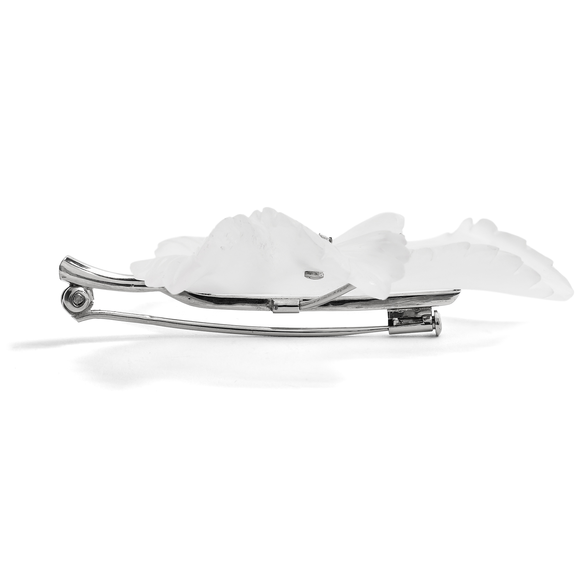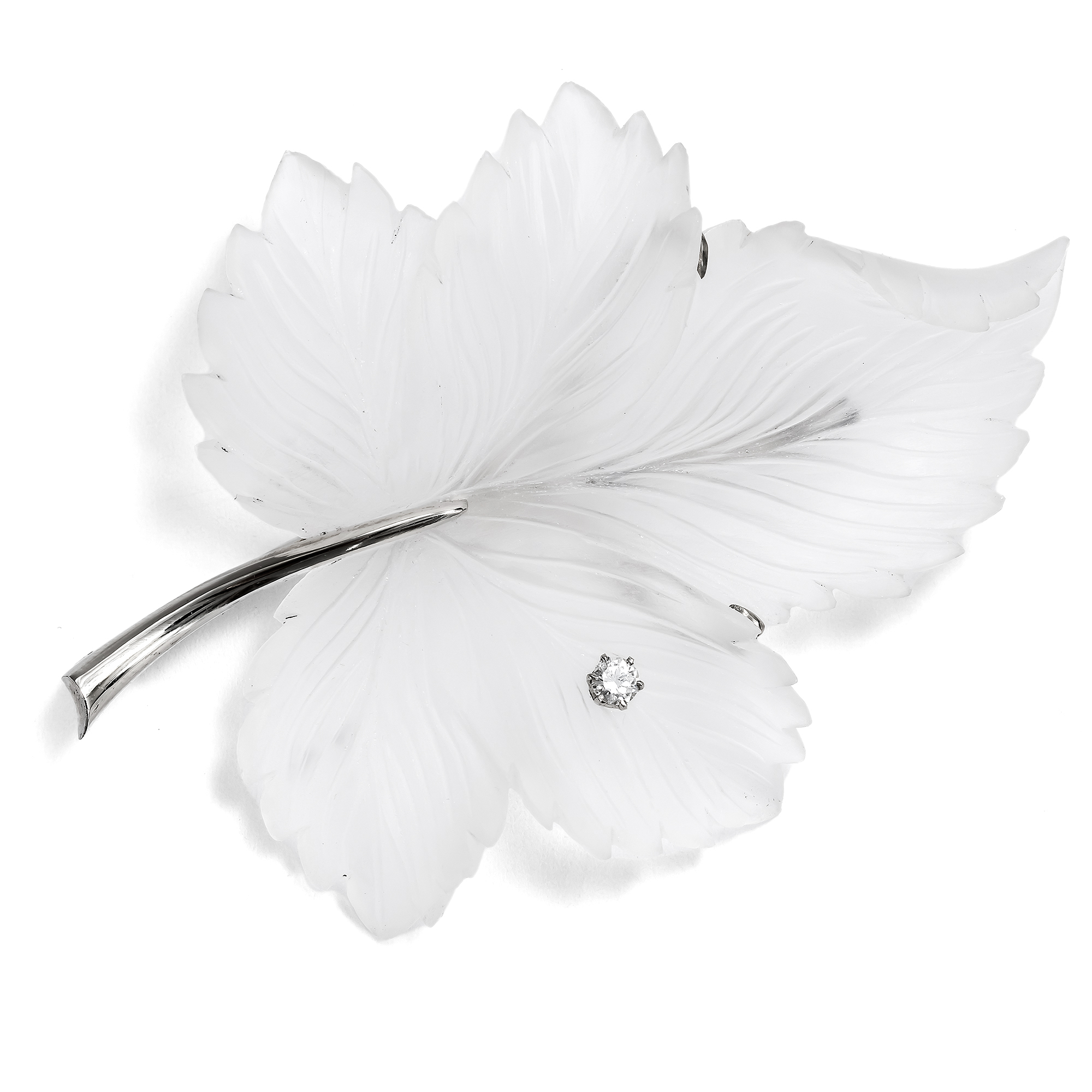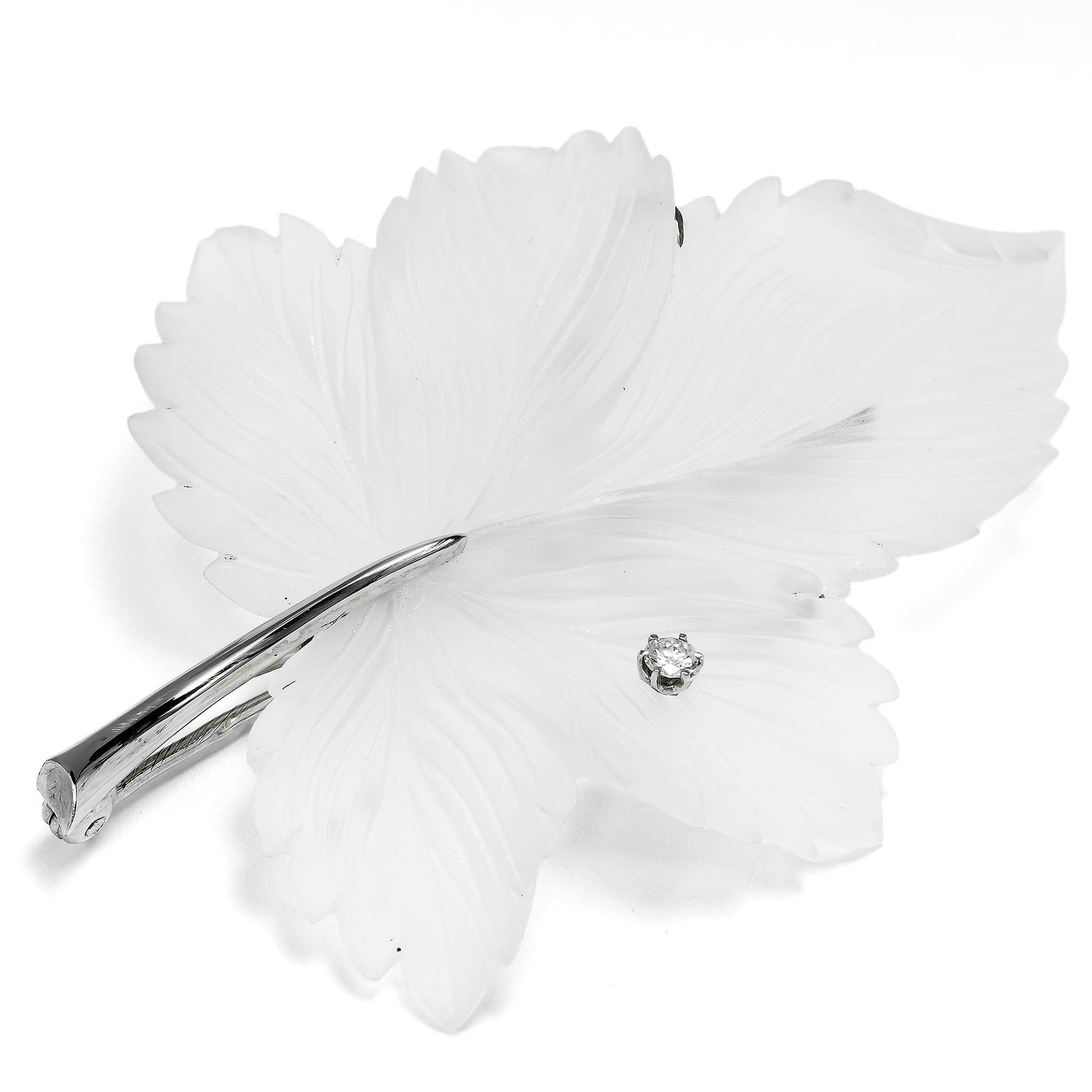 Schmuck aus geschnittenem Bergkristall begegnet in der Schmuckgeschichte immer wieder. Im Art Déco und bis in die 1950er Jahre war es besonders Suzanne Belperron, die in Paris Ringe und Broschen, ja sogar Armreifen aus satiniertem Bergkristall entwarf und fertigen ließ. In den späten 1960er Jahren übernahm David Webb ihre Liebe zu dem Material und machte es erneut zu einer großen Mode, die schnell weltweit Nachahmer fand. Die hier vorliegende Brosche ist ein großes Blatt aus geschnittenem Bergkristall. Mit großer Liebe sind die einzelnen Adern und Details des Blattes aus dem harten Edelstein geschnitten. Durch die gekonnte Bearbeitung der Oberflächen wirkt der Kristall gleichwohl so weich und samtig wie ein echtes Blatt. Ein einzelner Brillant bereichert den Entwurf und wirkt wie ein glitzernder Eiskristall. Der Stengel mit Broschierung auf der Rückseite ist aus Weißgold gefertigt. Er trägt Wiener Goldschmiedemarken. Schmuck mit aus Edelstein geschnittenen Pflanzen, Blättern und Blüten war in Wien in den 1960er Jahren eine große Mode, schon häufiger haben wir ganz wunderbare und kostbare Beispiele hierfür entdecken können. Das Blatt, das wir in Wien entdeckt haben, ist hierfür ein weiteres, ebenso wunderbares wie winterliches Beispiel. Die Brosche ist sehr gut erhalten und ein ungewöhnlicher Blickfang.