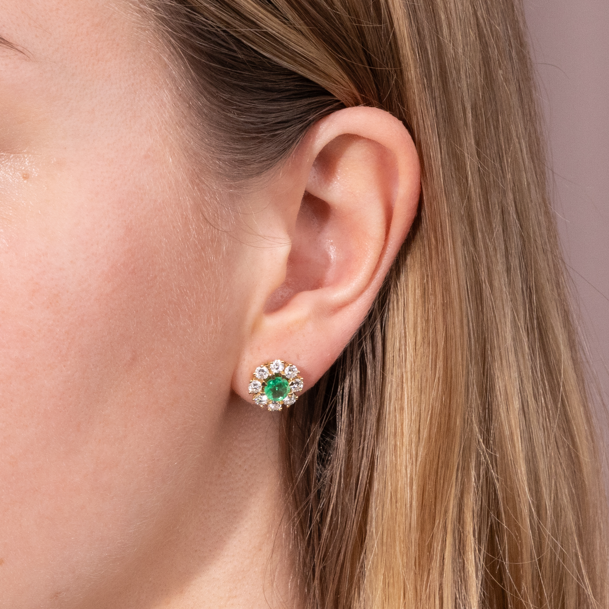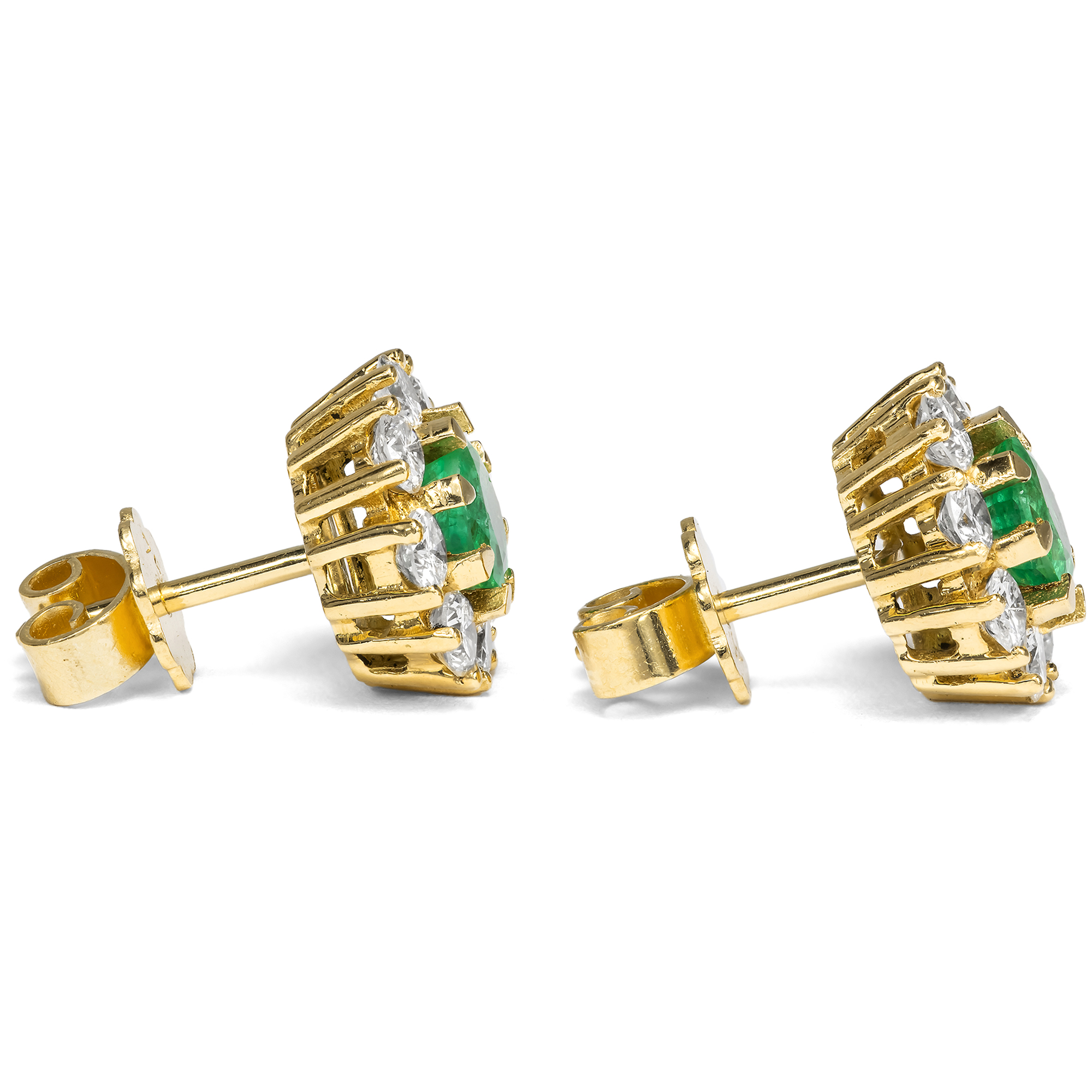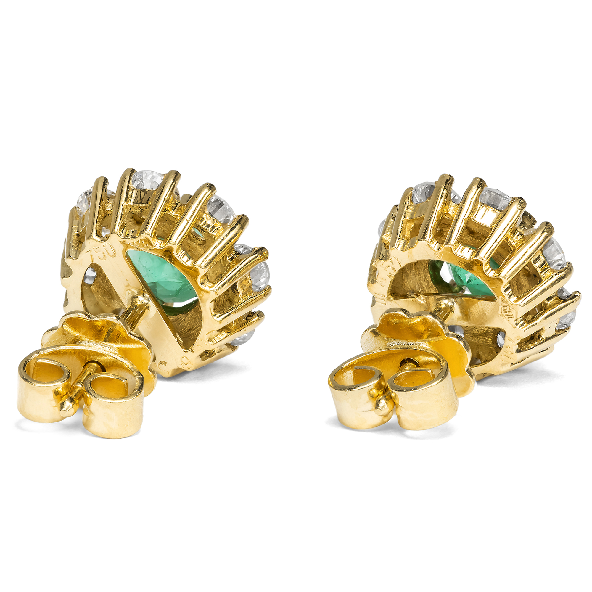Der Name des Smaragds stammt vermutlich aus dem lateinischen „Smaragdus“, was wiederum aus dem griechischen „Smaragdos“ übernommen ist. Die grüne Varietät des Beryll war schon im alten Ägypten begehrt und Ägypten beherrschte bis zum Untergang des Pharaonenreiches den Smaragdhandel im Mittelmeerraum. Erst mit der Eroberung Südamerikas durch die Spanier im 16. Jahrhundert entdeckte man reichhaltige Smaragdvorkommen, die fortan zu den begehrtesten Edelsteinen avancierten. Das vorliegende Paar runder Ohrstecker trägt jeweils einen dieser leuchtend grünen Edelsteine, eingefasst in einen Kranz aus acht funkelnden weißen Brillanten. Die Edelsteine werden von feinen, luftigen Stäben aus hochkarätigem Gelbgold gehalten, was ihnen eine besondere Leichtigkeit verleiht und einen optimalen Lichteinfall ermöglicht. Das Paar aus den 1980er Jahren ist sehr gut erhalten. Ein unabhängiges Gutachten bestätigt die Qualität der verwendeten Materialien. Die Ohrstecker verbinden feines Handwerk mit zeitloser Eleganz und setzen die Edelsteine auf zurückhaltend wirkungsvolle Weise in Szene.
