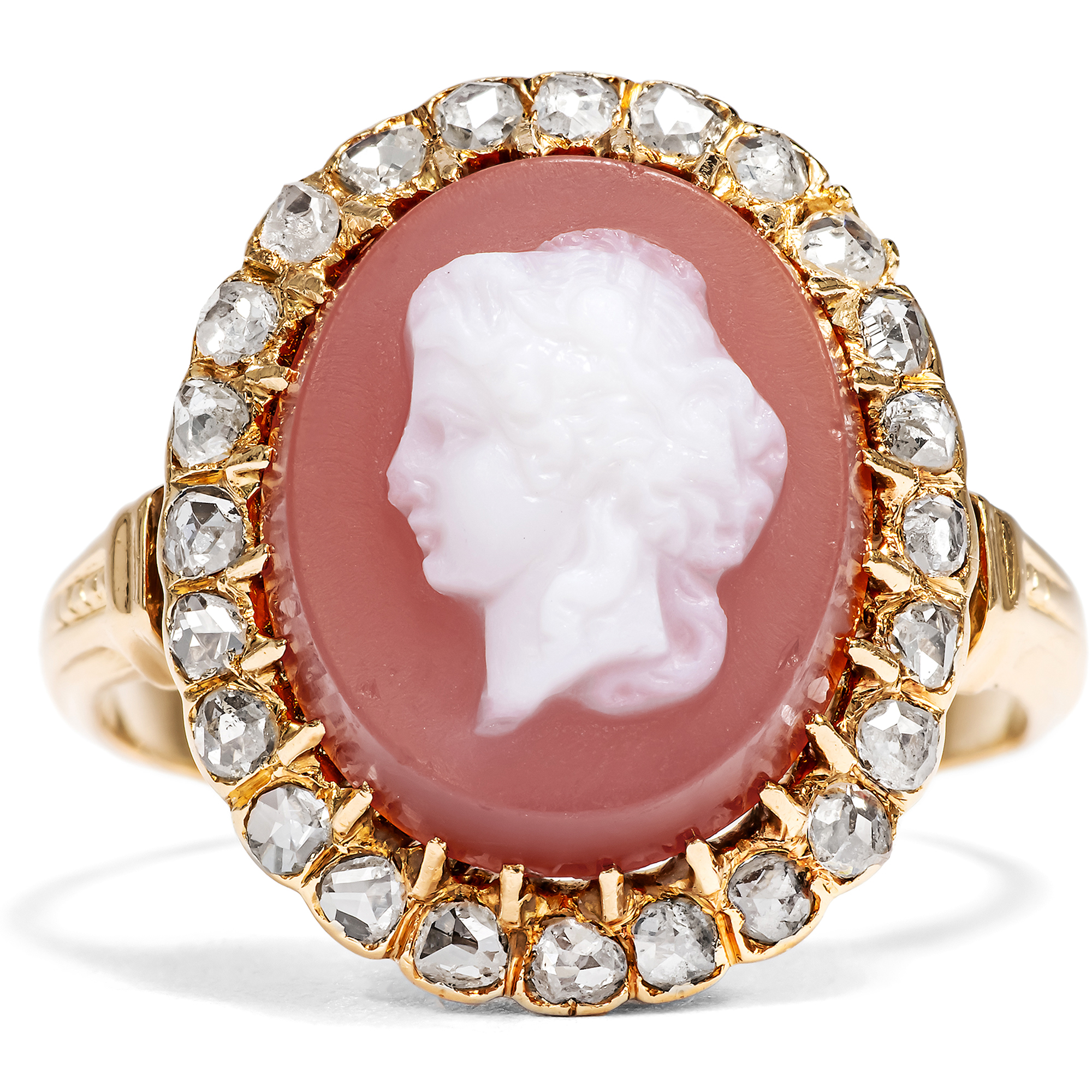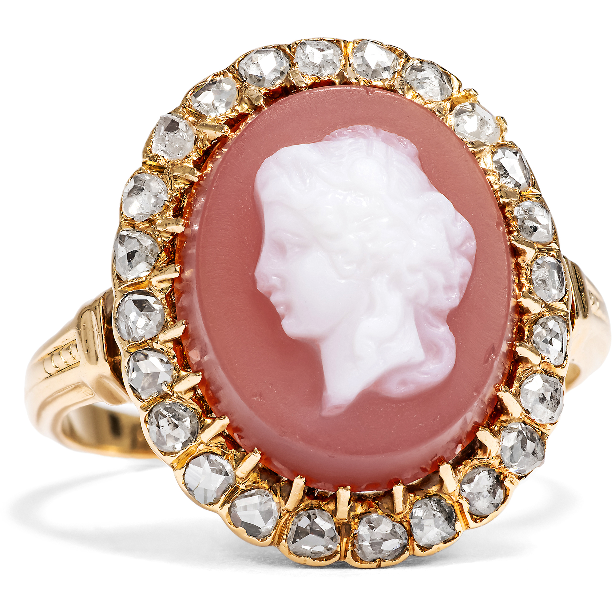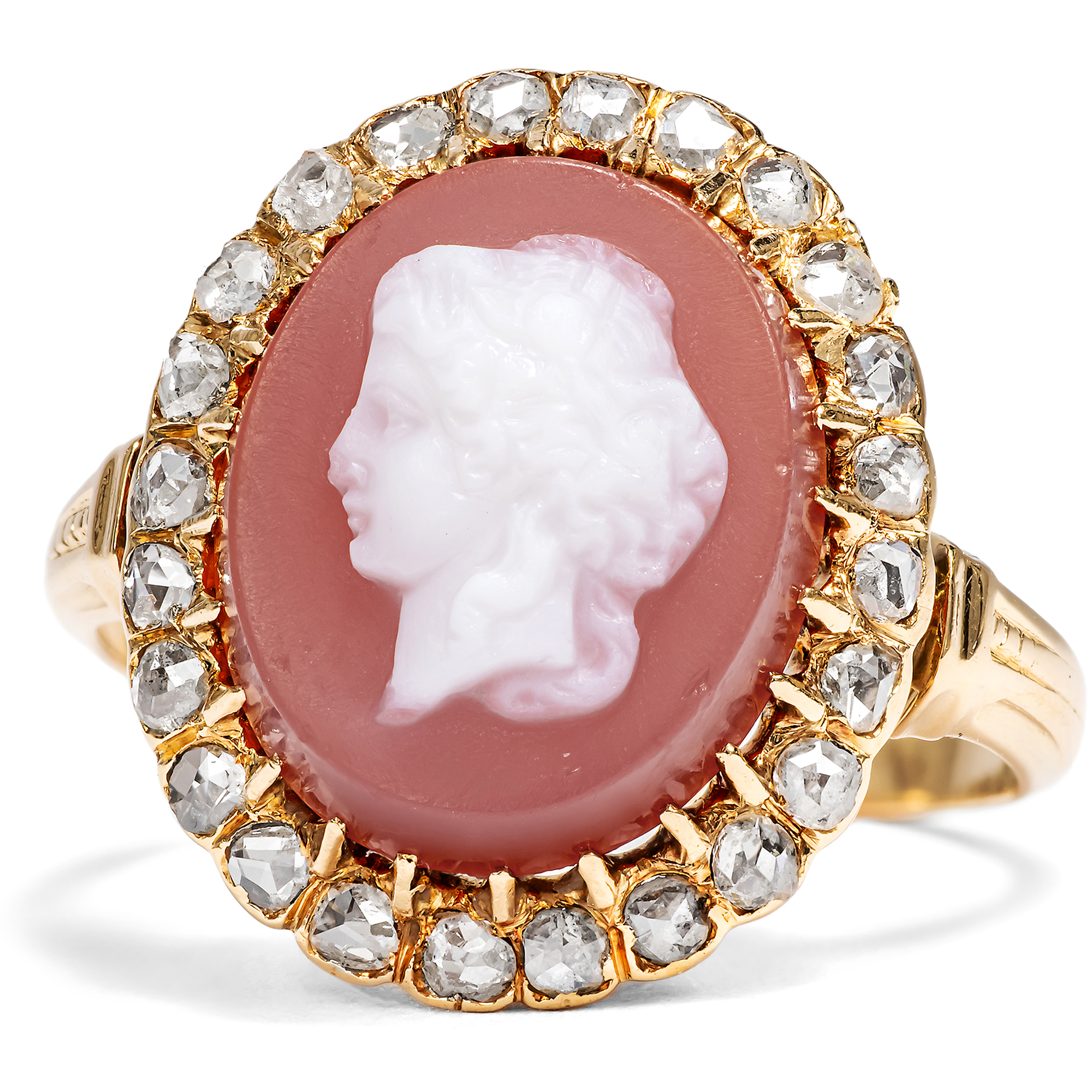Im 19. Jahrhundert lockte die Antike wie eh und je. Auch wohl berühmteste Schmuckform der Antike, die Gemme, wurde wiederbelebt: Ringe, Broschen und Colliers schmückten anstatt mit Diamanten und Edelsteinen mit Gemmen an zentraler Stelle. Auch der hier vorliegende Ring entstand im Zuge dieser Antikenmode – doch interpretiert die Gemme auf ganz zeitgenössische Weise. Weiß erhaben über rosenfarbenem Grund in Lagenstein geschnitzt, sehen wir auch hier eine junge, griechisch frisierte Frau, die uns ihr klassisches Profil zuwendet. Die Gemme wird von zartesten, fein zugespitzten Goldkrappen gehalten. Außen herum rahmt ein funkelnder, doch zurückhaltender Rahmen offen gefasster Diamantrosen das antikisierende Portrait. Doch um wen handelt es sich? Die Götter der Antike waren ein beliebtes Sujet für die Gemmenschneider des 19. Jahrhunderts, doch mit der Zeit begannen Gemmen, eher die Vorstellung der Antike als eindeutige Persönlichkeiten darzustellen – es war also gar keine bestimmte Göttin mehr dargestellt. Ohne Attribute wird unsere unbekannte Schöne so zu einem Sinnbild antiker Schönheit. Der feine, antike Ring ist sehr gut erhalten. Wir konnten ihn in London entdecken. Ein Schmuckstück von subtiler, doch umso überzeugenderer Schönheit, das nicht durch schwere Juwelen, sondern durch die Feinheit seiner Ausführung und die sanfte, malerische Farbpalette besticht.