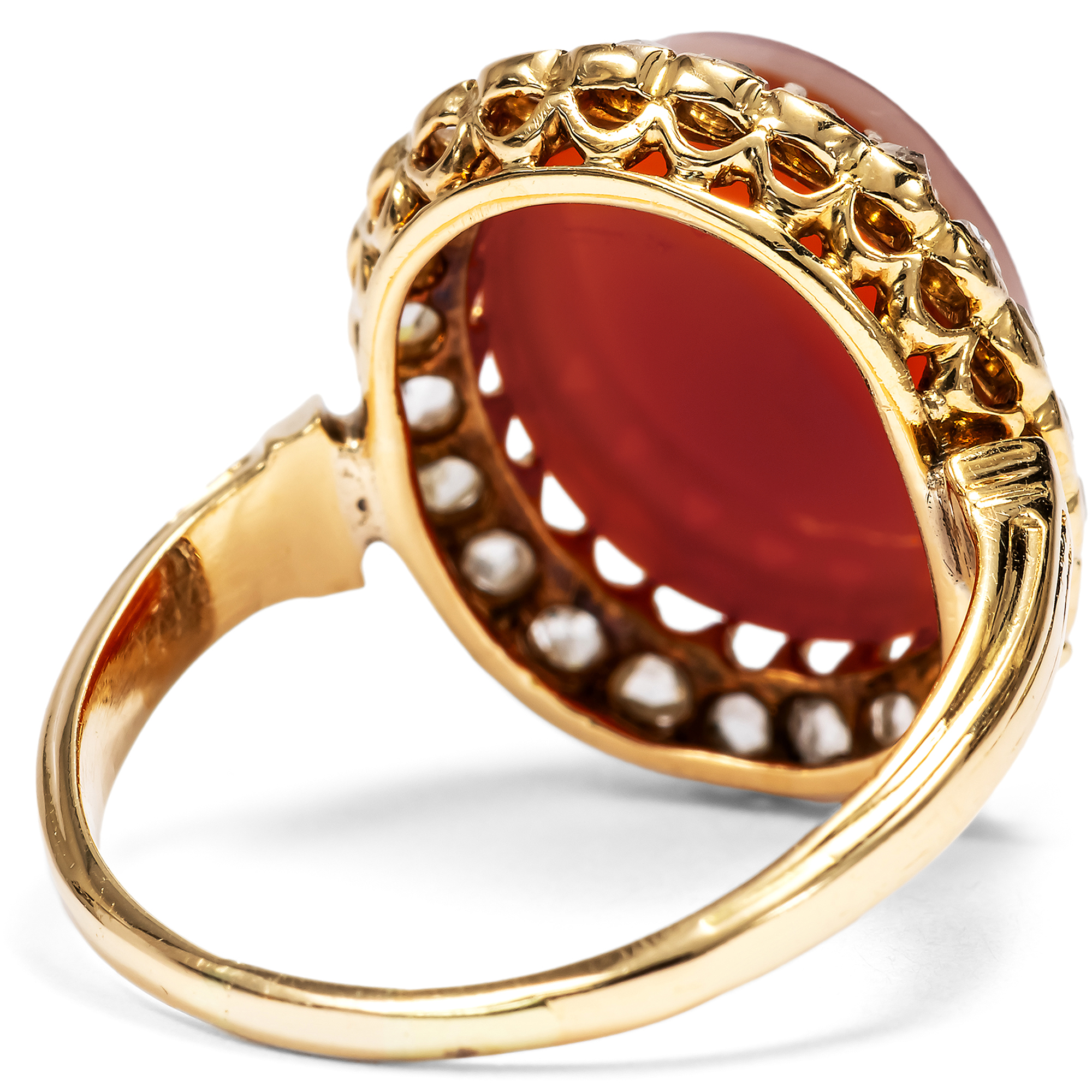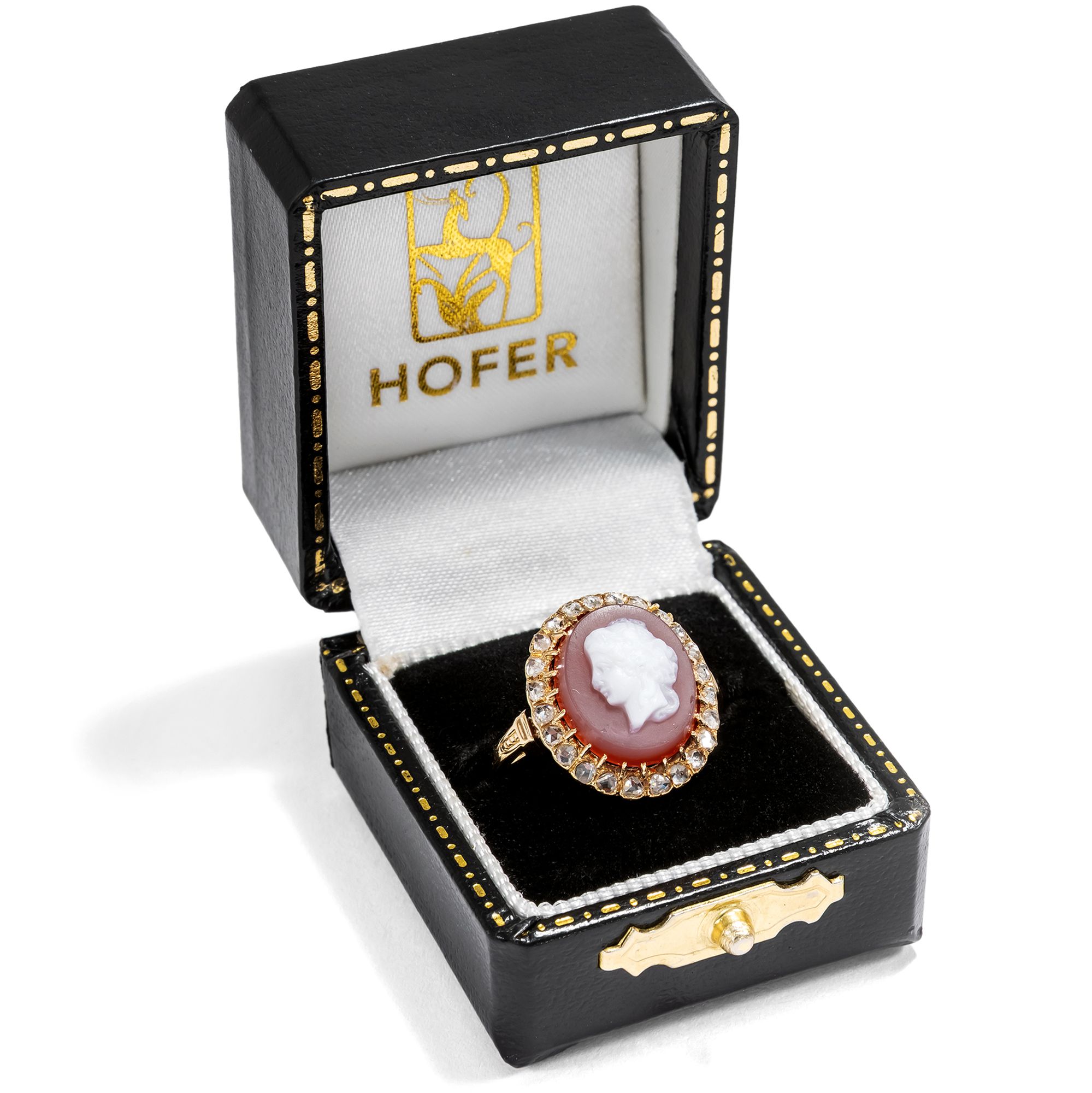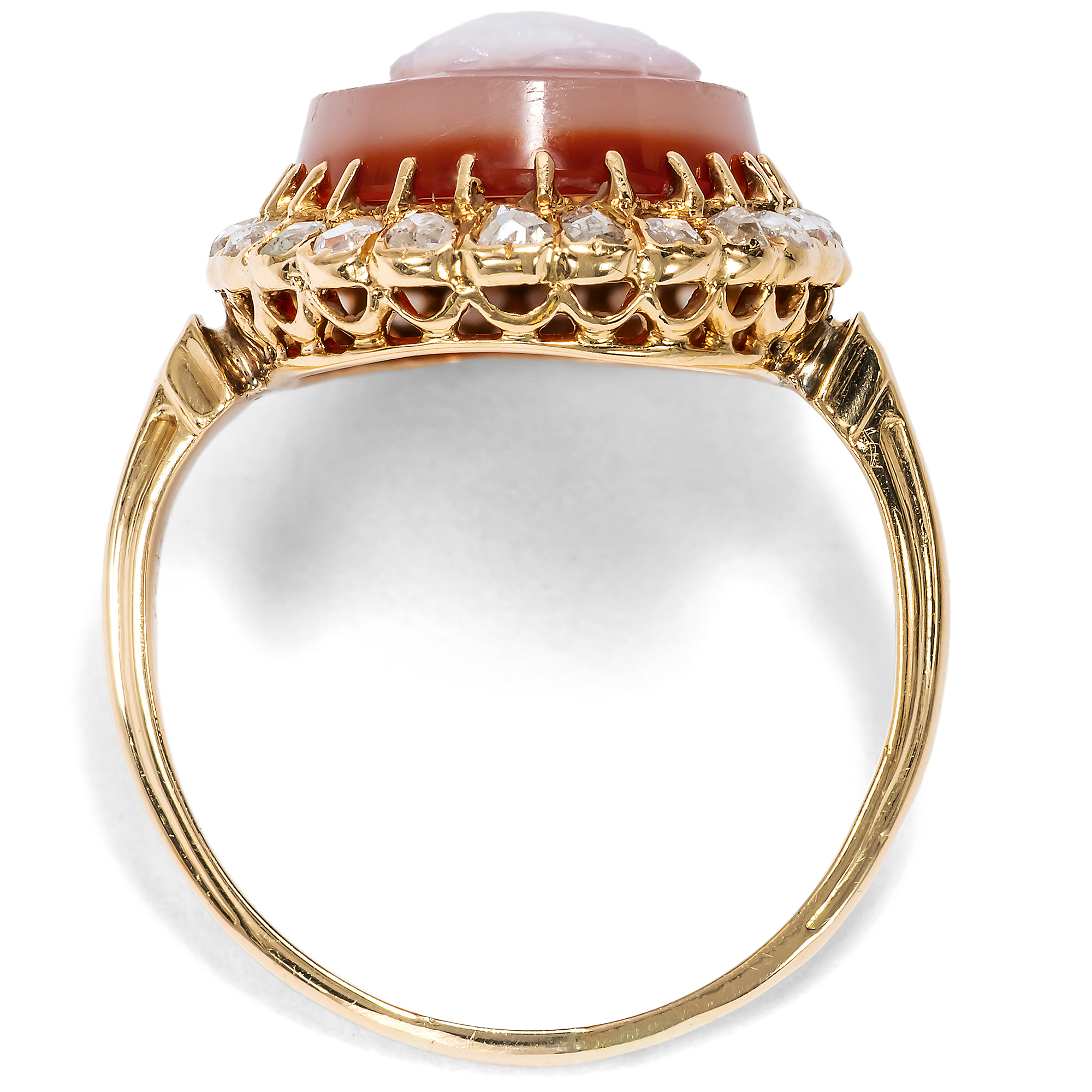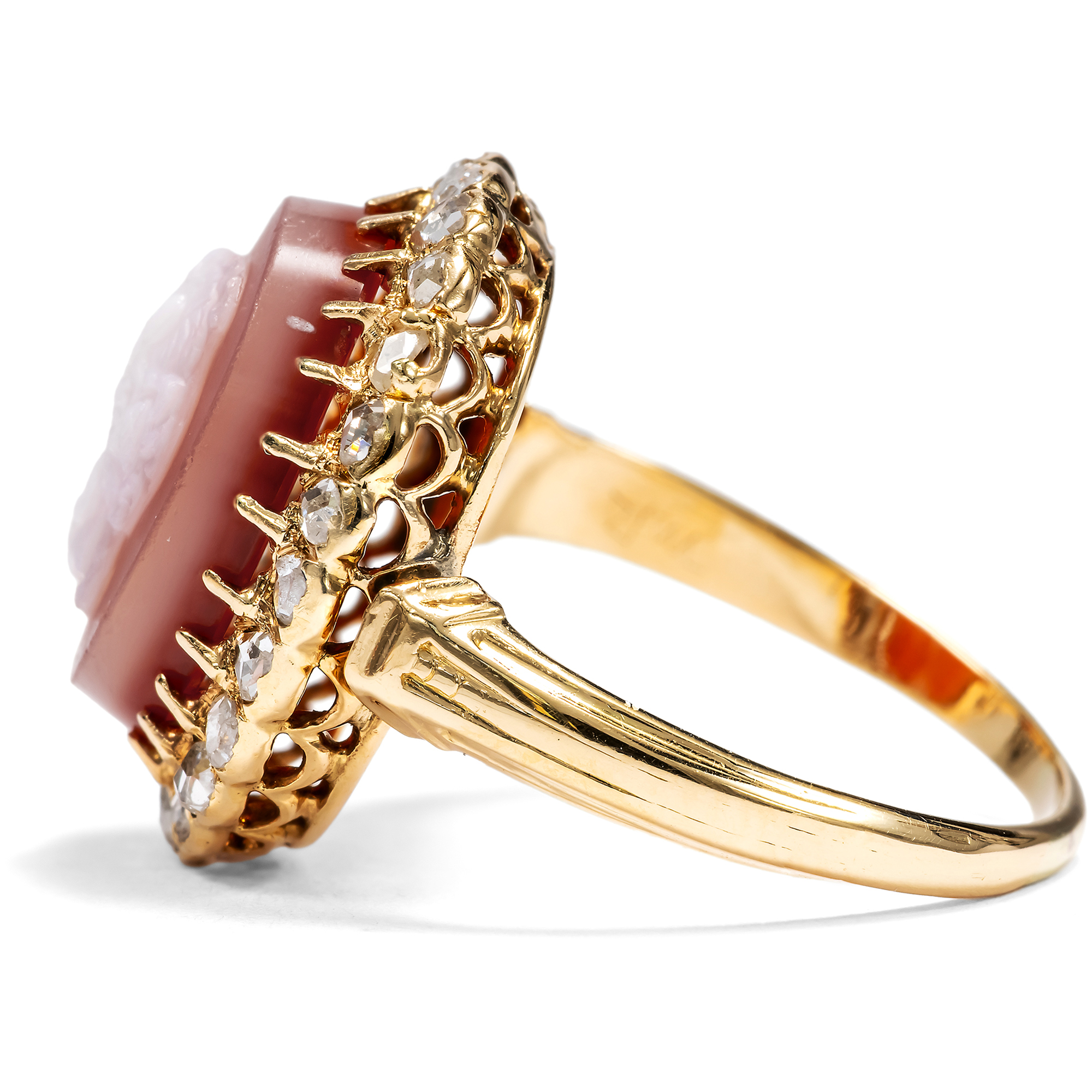 Im 19. Jahrhundert lockte die Antike wie eh und je. Auch wohl berühmteste Schmuckform der Antike, die Gemme, wurde wiederbelebt: Ringe, Broschen und Colliers schmückten anstatt mit Diamanten und Edelsteinen mit Gemmen an zentraler Stelle. Auch der hier vorliegende Ring entstand im Zuge dieser Antikenmode – doch interpretiert die Gemme auf ganz zeitgenössische Weise. Weiß erhaben über rosenfarbenem Grund in Lagenstein geschnitzt, sehen wir auch hier eine junge, griechisch frisierte Frau, die uns ihr klassisches Profil zuwendet. Die Gemme wird von zartesten, fein zugespitzten Goldkrappen gehalten. Außen herum rahmt ein funkelnder, doch zurückhaltender Rahmen offen gefasster Diamantrosen das antikisierende Portrait. Doch um wen handelt es sich? Die Götter der Antike waren ein beliebtes Sujet für die Gemmenschneider des 19. Jahrhunderts, doch mit der Zeit begannen Gemmen, eher die Vorstellung der Antike als eindeutige Persönlichkeiten darzustellen – es war also gar keine bestimmte Göttin mehr dargestellt. Ohne Attribute wird unsere unbekannte Schöne so zu einem Sinnbild antiker Schönheit. Der feine, antike Ring ist sehr gut erhalten. Wir konnten ihn in London entdecken. Ein Schmuckstück von subtiler, doch umso überzeugenderer Schönheit, das nicht durch schwere Juwelen, sondern durch die Feinheit seiner Ausführung und die sanfte, malerische Farbpalette besticht.