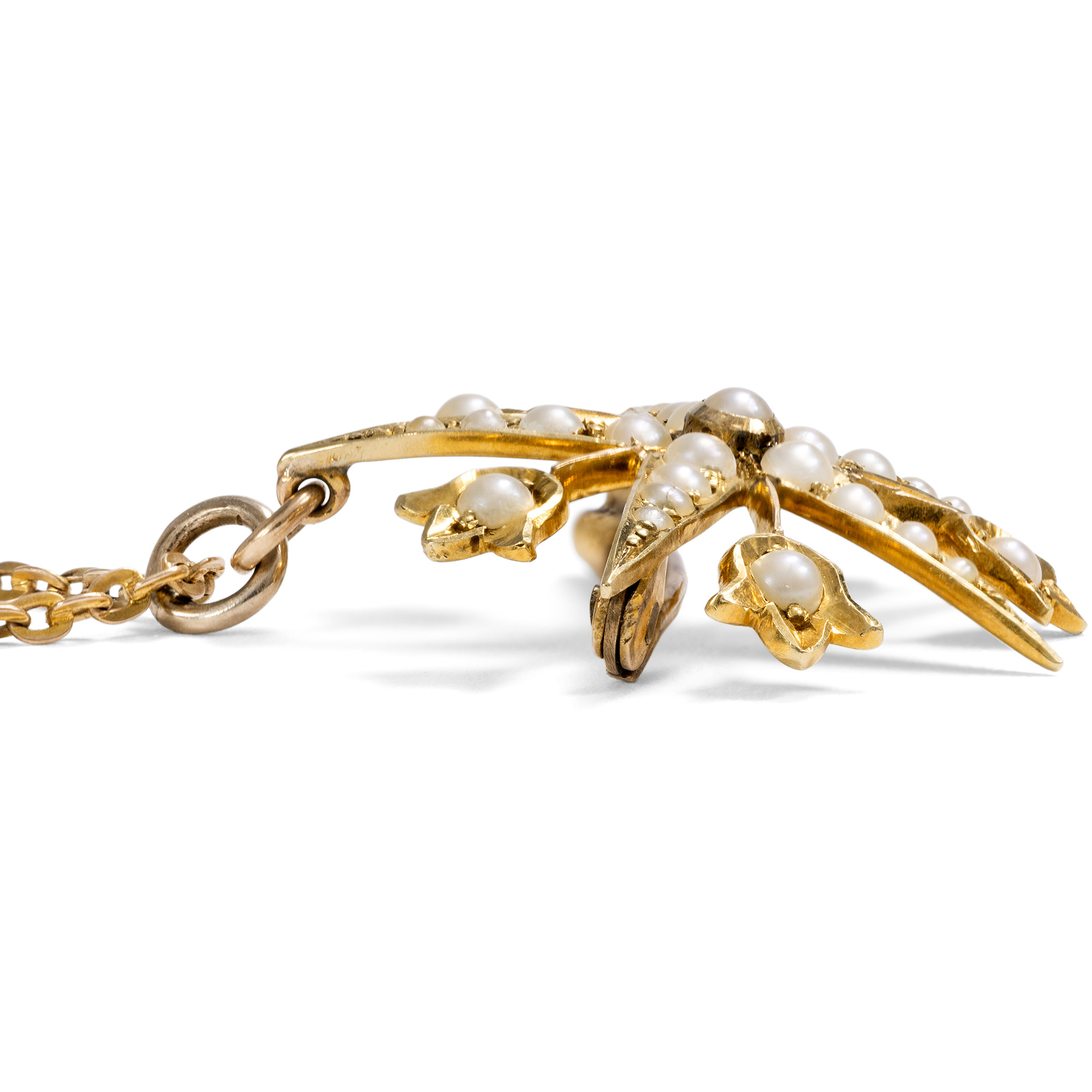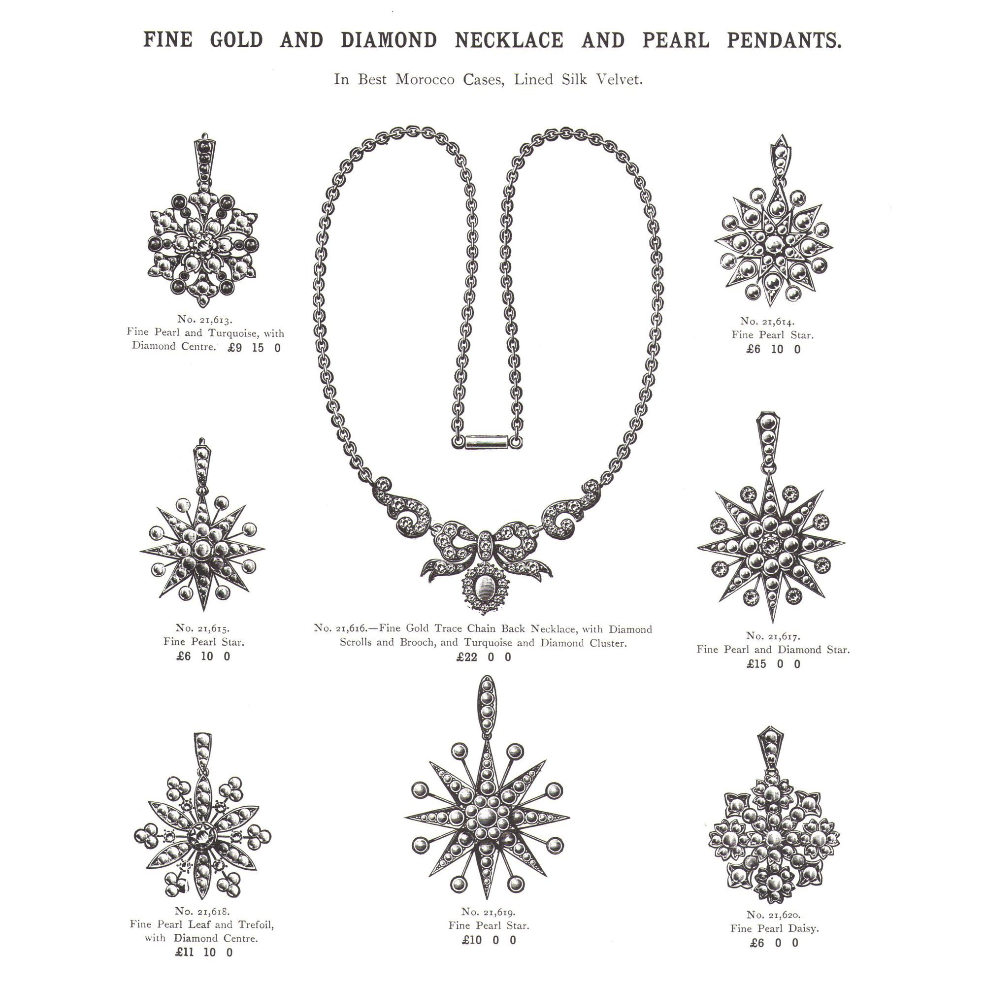 The stars are in blossom, the moon is in flower, And bright are the windows of night in her tower. Dieses Lied stimmen die Elben in J.R.R. Tolkiens 1937 erschienenem Roman Der Hobbit an, als sie des Nachts durch die Wälder des Auenlandes ziehen und die Schönheit der Natur besingen. Der vorliegende Anhänger erinnerte uns daran, vereint er doch das Sternenmotiv mit kleinen Blütenkelchen, die zwischen seinen Strahlen aufsprießen. Der zarte Stern ist mit kleinen Saatperlen in Gold gefasst und lässt sich an der ebenfalls antiken Kette als Anhänger tragen. Nimmt man diese jedoch ab, so lässt sich die Anhängerschlaufe einklappen und der Stern kann als Brosche getragen werden. Diese Doppelfunktion, aber auch der Entwurf und die Verarbeitung sind typisch für britische Schmuckstücke der Jahre um 1900. Wir zeigen als letztes Bild eine Seite aus einem zeitgenössischen Katalog, die die Fülle entsprechender floraler Anhänger im Großbritannien der Jahrhundertwende illustriert. Abb. aus dem Katalog der Goldsmiths & Silversmiths Co. Ltd., 112 Regent Street, London, 1901, abgebildet bei Peter Hinks (Hrsg.): Viktorianischer Schmuck, Hildesheim/Zürich/New York 1996, S. 21.