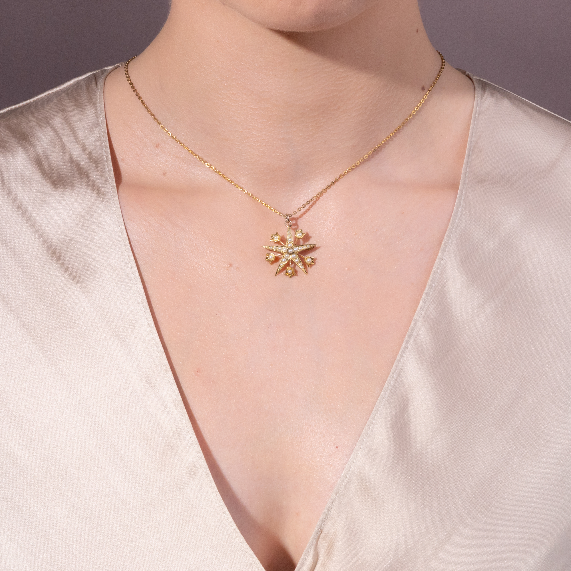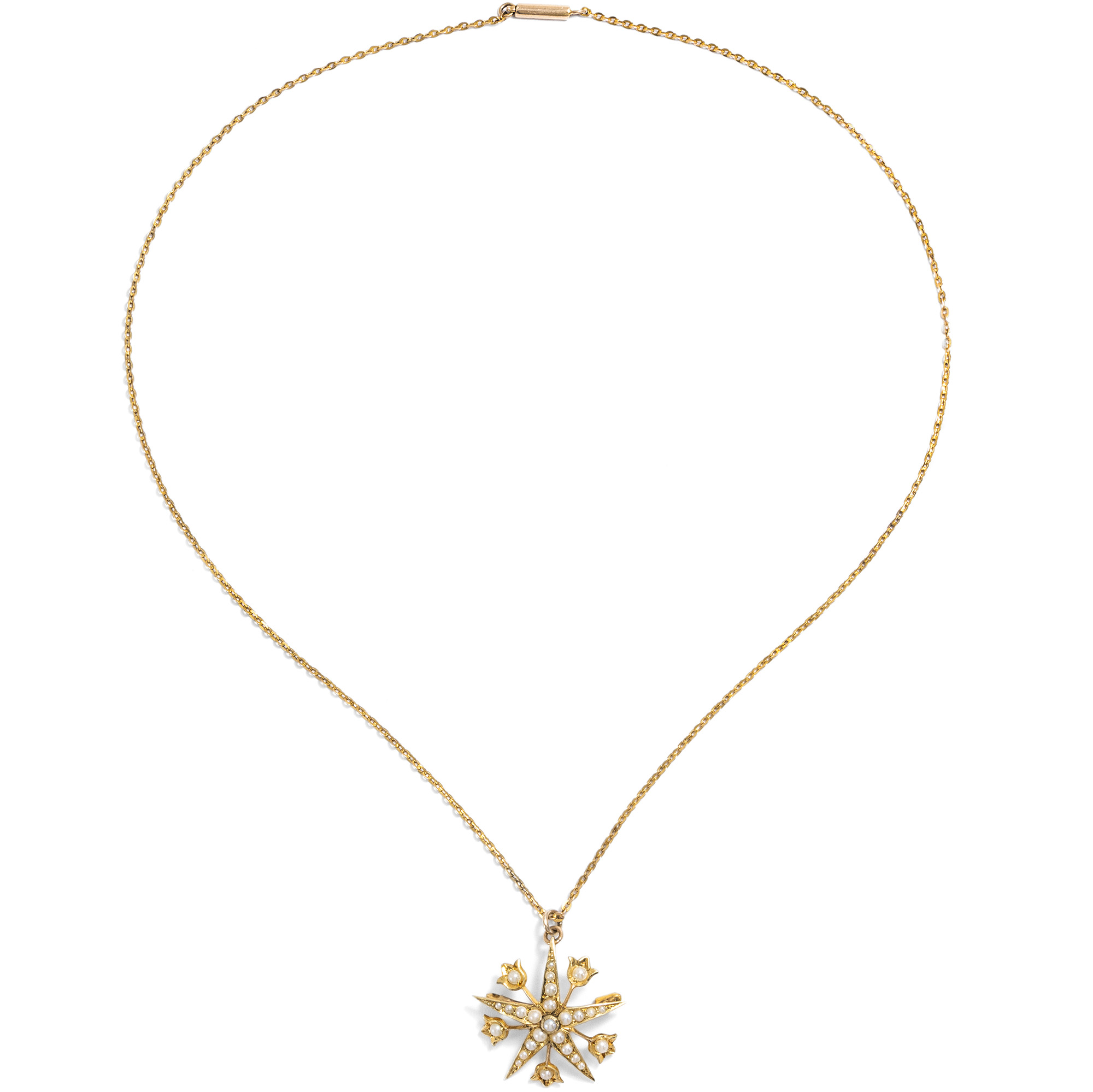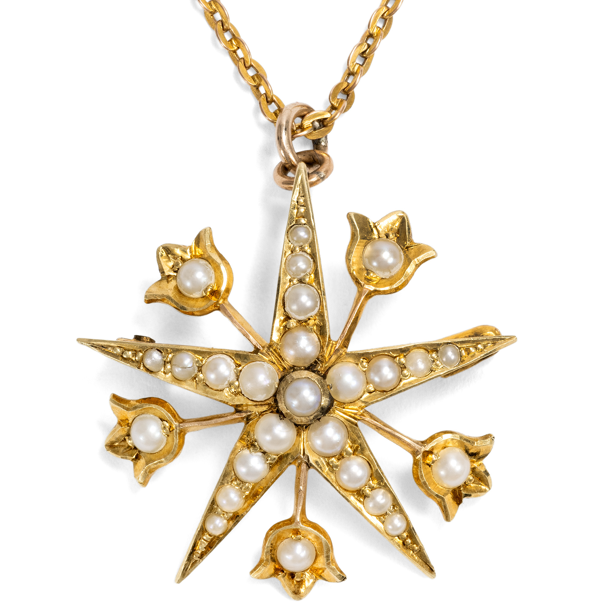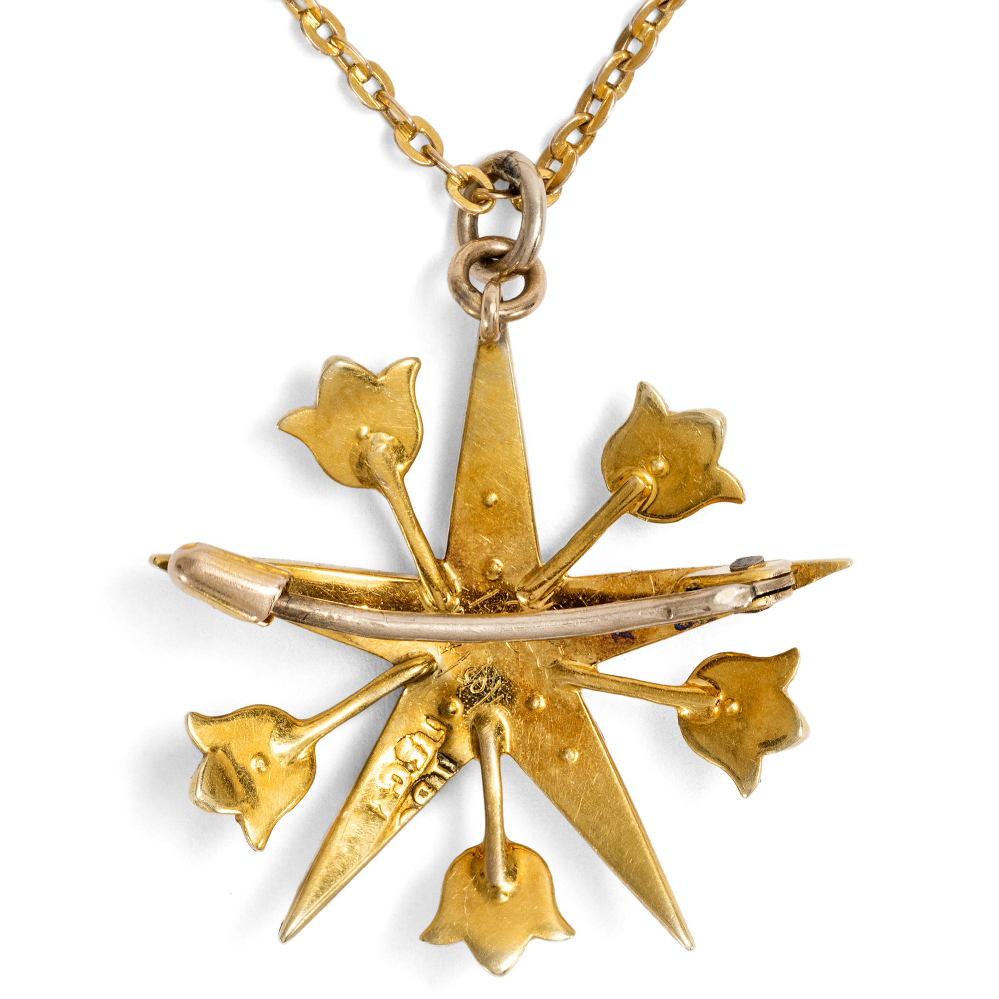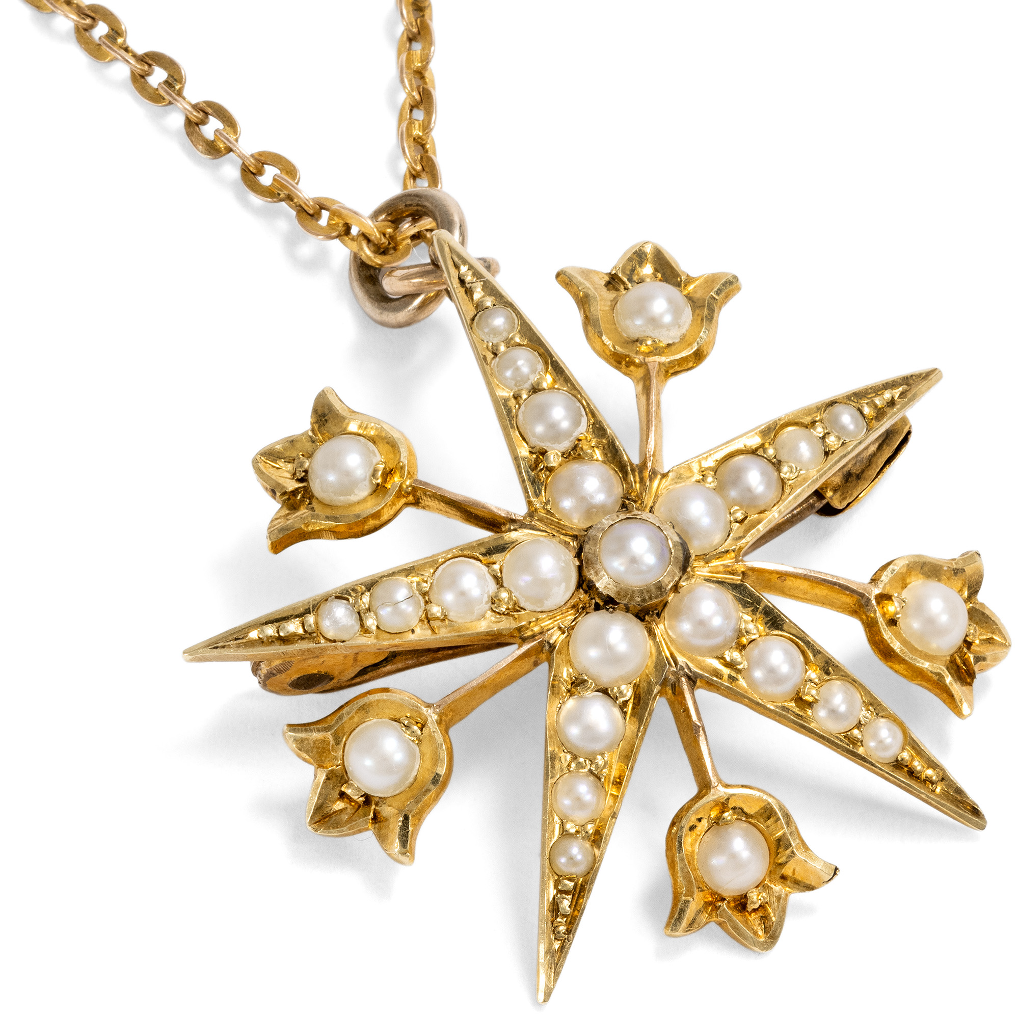 Zarte Anhänger-Brosche in Sternenform mit Saatperlen in Gold, Großbritannien um 1900