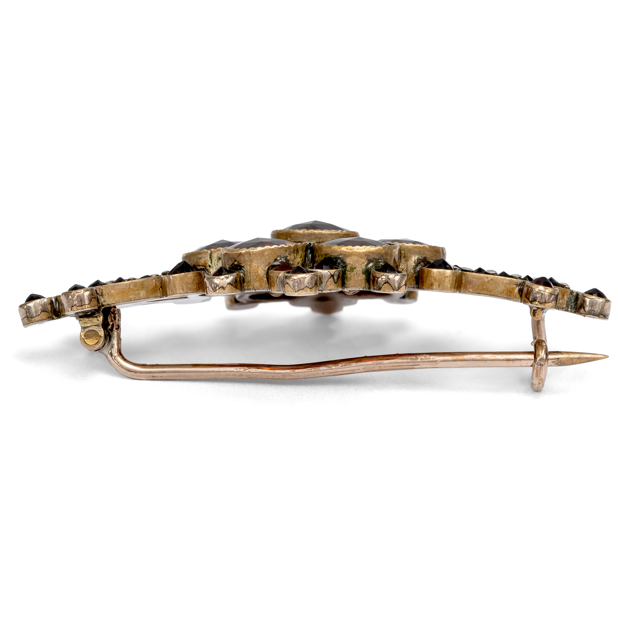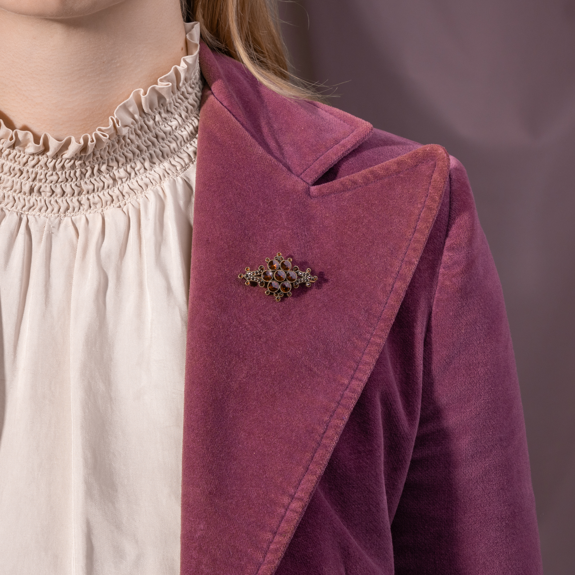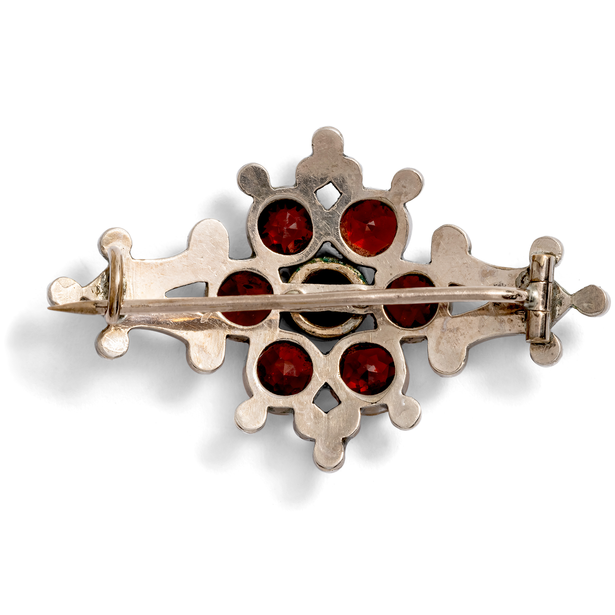 Seit Jahrhunderten schon werden die verführerisch rotglühenden Granate zu Schmuck ganz unterschiedlicher Art verarbeitet. Große, kostbare Steine schmückten einst die farbenfrohen Colliers des Barock und Rokoko. Die Form des Granatschmucks, die wir heute am ehesten mit diesem Stein verbinden – Sterne und Blüten, dicht an dicht besetzt mit unzähligen Granaten – entwickelte sich Mitte des 19. Jahrhunderts und wurde schnell zum Publikumsliebling. Diese Brosche, entstanden in den Jahren um 1900, präsentiert mittig eine große Blüte, die sich mit schwungvollen Elementen zu einer gestreckten Form verbinden. Zahlreiche feurige Granate im Rosenschliff, sorgfältig in verschiedenen Größen gesetzt, lassen das Stück lebendig funkeln. Gefasst sind sie in vergoldetes Tombak, das schauseitig kaum sichtbar ist und so die volle Wirkung der Steine hervorhebt. Entstanden ist somit ein wundervoller Blickfang, der noch heute zu vielerlei Outfits getragen werden kann.
