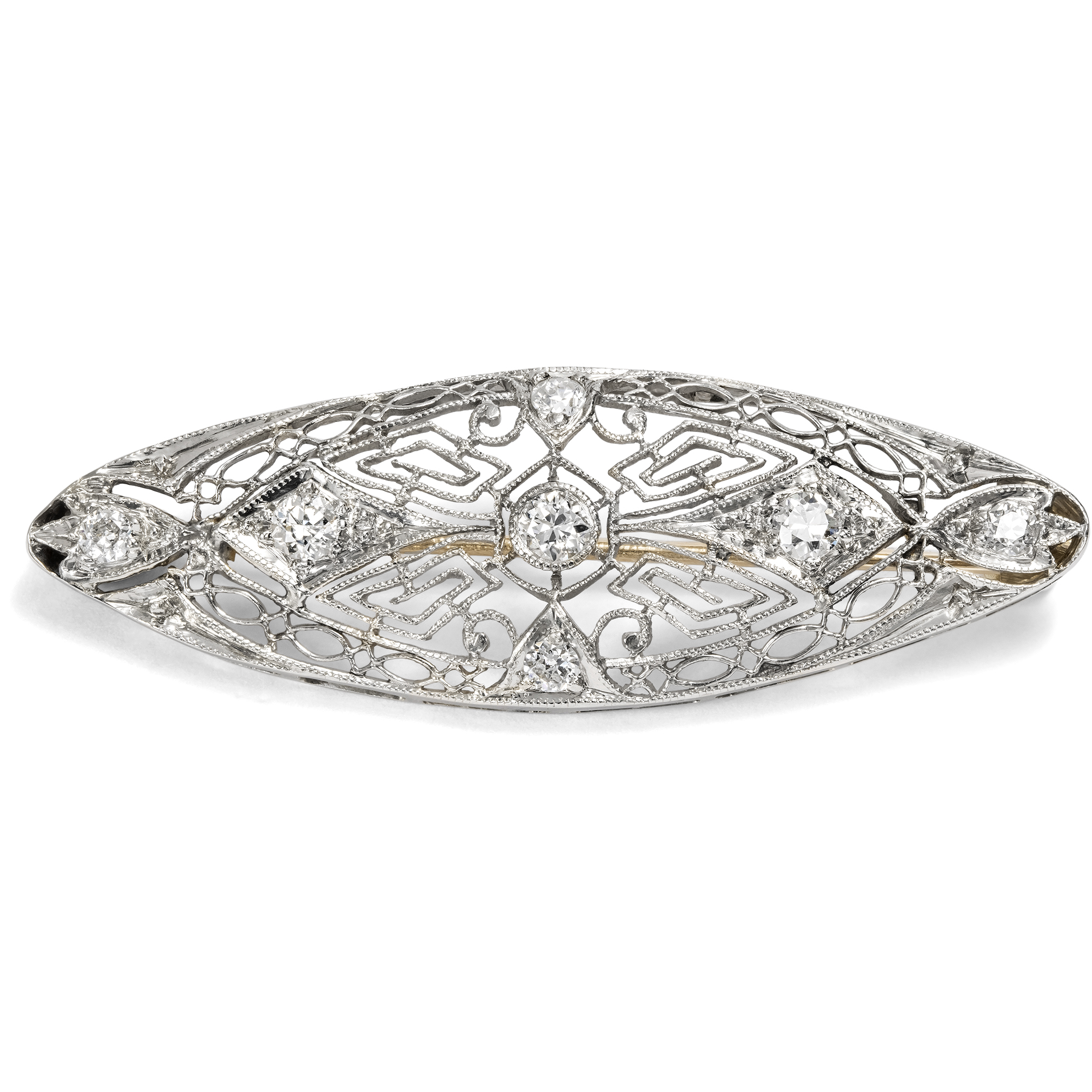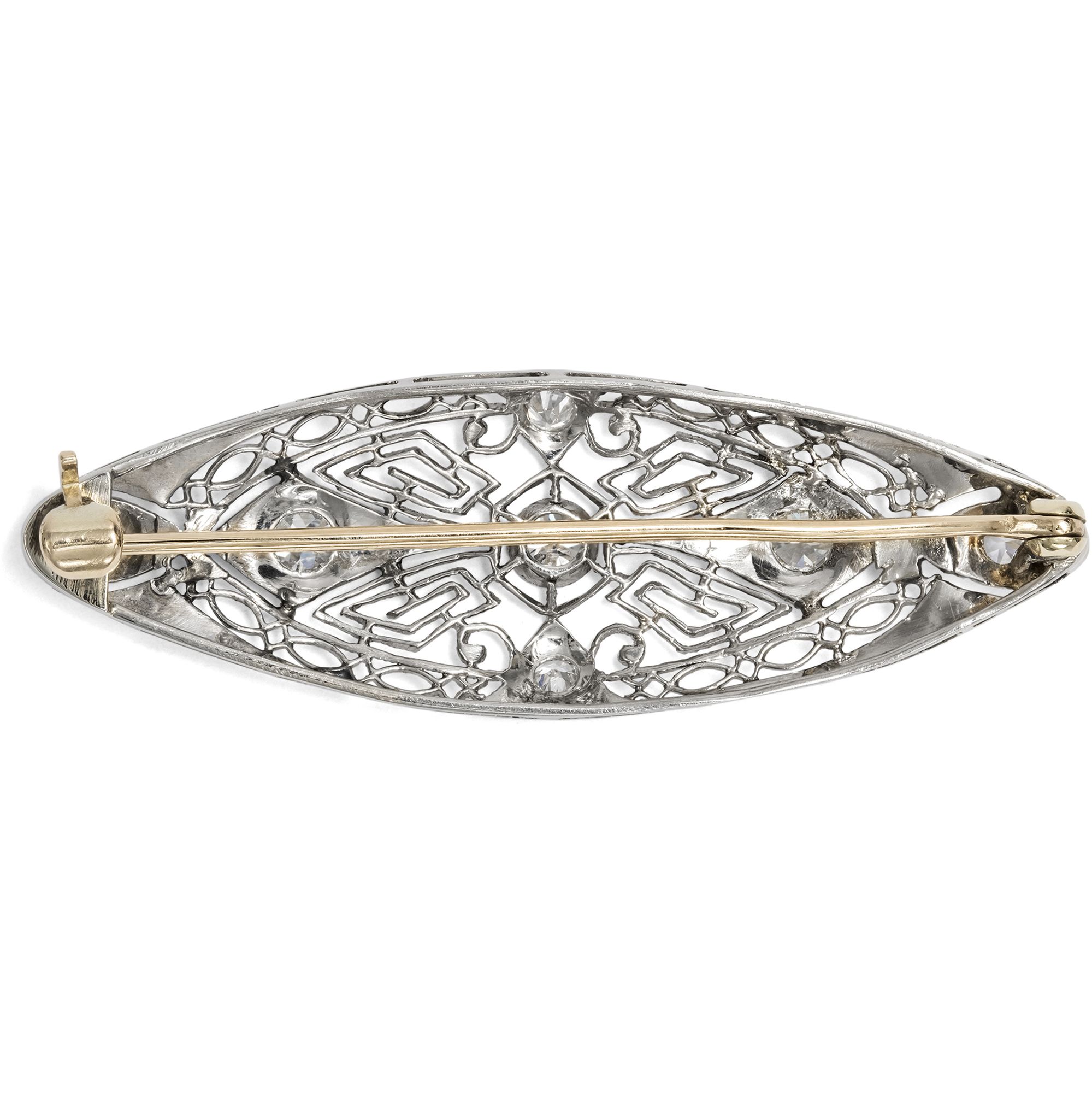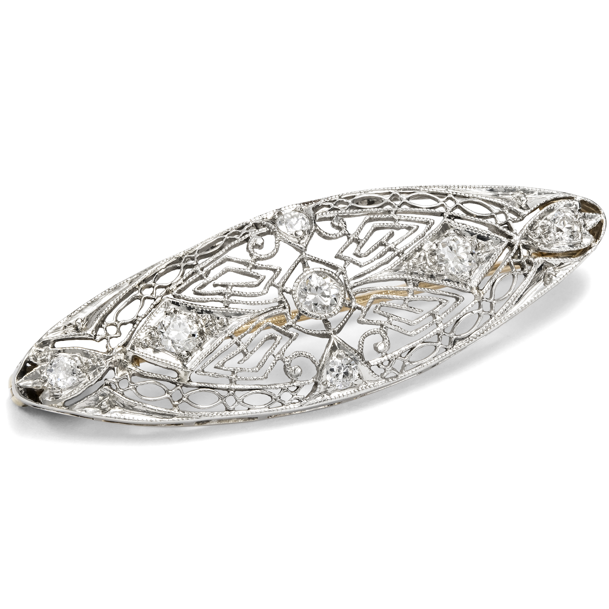 Schmuck aus den USA, im frühen 20. Jahrhundert entstanden, ist für seine detaillierte Ästhetik bekannt. Filigrane Streben durchbrechen die oft einfachen Grundformen der Broschen, Armbänder und Anhänger; dazwischen sind Diamanten in ornamentale Arrangements gesetzt. Millegriffes entlang der feinen Streben verleihen zusätzliche Struktur. So wirken die Stücke oftmals wie aus Edelmetall gewirkte Spitze. Anbei bilden wir zum Vergleich eine Seite aus dem Katalog der Kind & Sons Jeweler ab, die weitere Entwürfe in diesem typisch amerikanischen Stil zeigt (siehe letzte Abb.). Ein solches Schmuckstück ist auch die vorliegende mandelförmige Brosche, die aus Platin gearbeitet ist. Sieben Diamanten im Übergangsschliff von zusammen etwa 0,44 ct besetzen die Oberfläche und sind in der spitzenartigen Komposition als Glanzpunkte eingefasst. Zart und ätherisch erscheint der filigran durchbrochene Entwurf beinahe textil. Die rückseitige Broschierung ist aus stabilem Gold gearbeitet und mit Sicherheitsverschluss versehen, sodass sich die Brosche sorglos tragen lässt. Die Brosche ist sehr gut erhalten und ein wunderbares Beispiel für den feinen Art-Déco-Stil der späten 1920er Jahre.