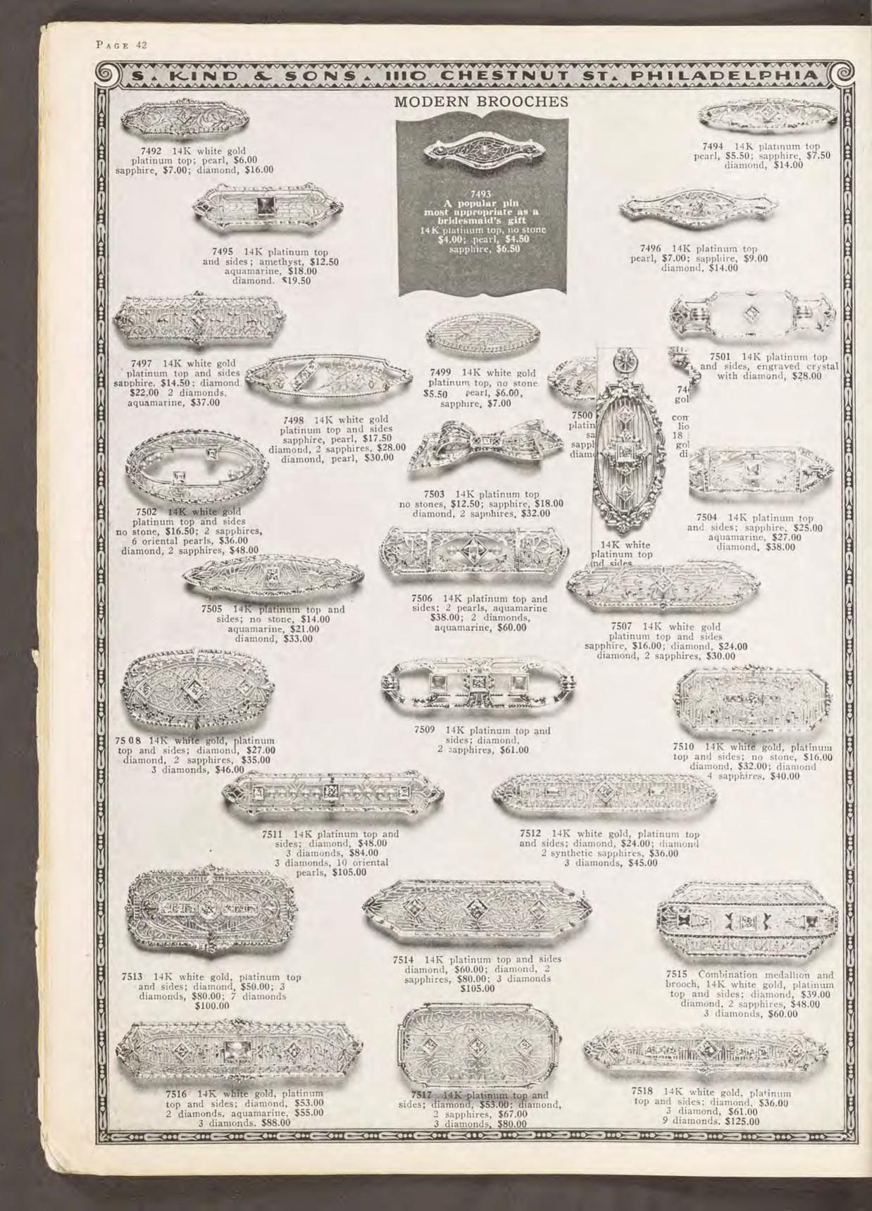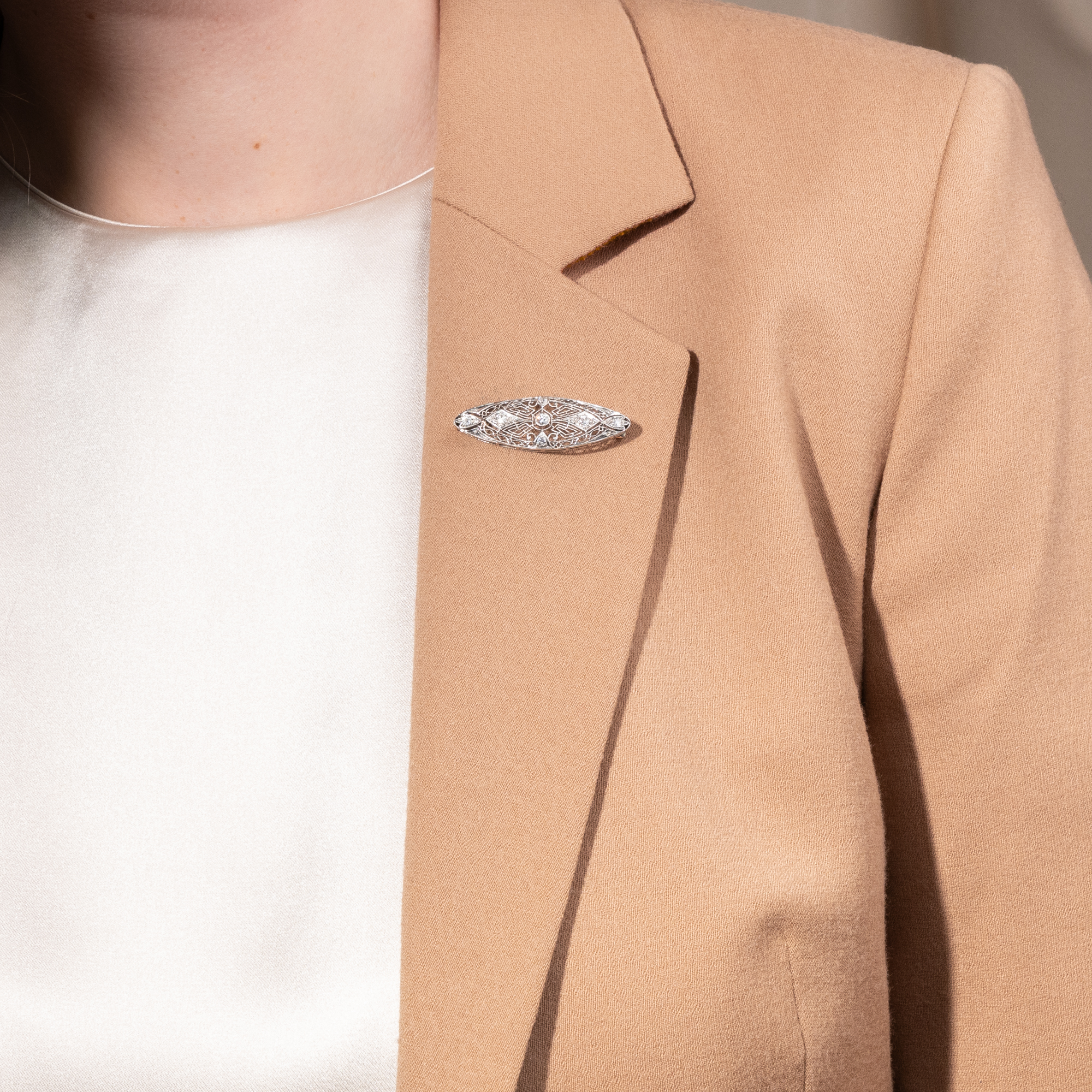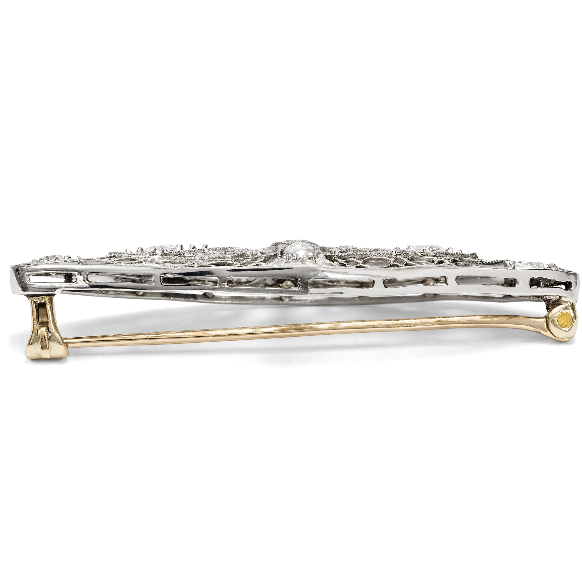 Schmuck aus den USA, im frühen 20. Jahrhundert entstanden, ist für seine detaillierte Ästhetik bekannt. Filigrane Streben durchbrechen die oft einfachen Grundformen der Broschen, Armbänder und Anhänger; dazwischen sind Diamanten in ornamentale Arrangements gesetzt. Millegriffes entlang der feinen Streben verleihen zusätzliche Struktur. So wirken die Stücke oftmals wie aus Edelmetall gewirkte Spitze. Anbei bilden wir zum Vergleich eine Seite aus dem Katalog der Kind & Sons Jeweler ab, die weitere Entwürfe in diesem typisch amerikanischen Stil zeigt (siehe letzte Abb.). Ein solches Schmuckstück ist auch die vorliegende mandelförmige Brosche, die aus Platin gearbeitet ist. Sieben Diamanten im Übergangsschliff von zusammen etwa 0,44 ct besetzen die Oberfläche und sind in der spitzenartigen Komposition als Glanzpunkte eingefasst. Zart und ätherisch erscheint der filigran durchbrochene Entwurf beinahe textil. Die rückseitige Broschierung ist aus stabilem Gold gearbeitet und mit Sicherheitsverschluss versehen, sodass sich die Brosche sorglos tragen lässt. Die Brosche ist sehr gut erhalten und ein wunderbares Beispiel für den feinen Art-Déco-Stil der späten 1920er Jahre.