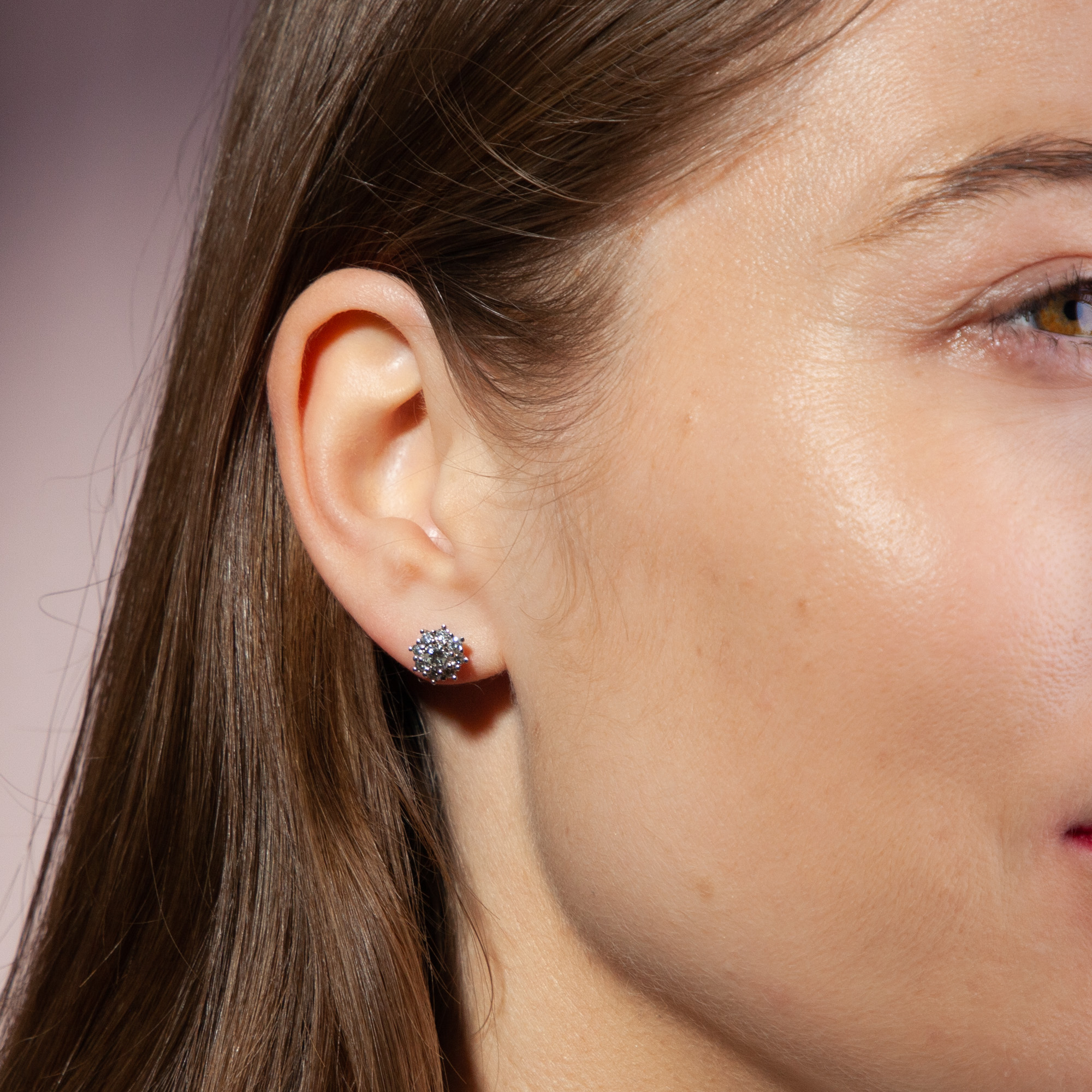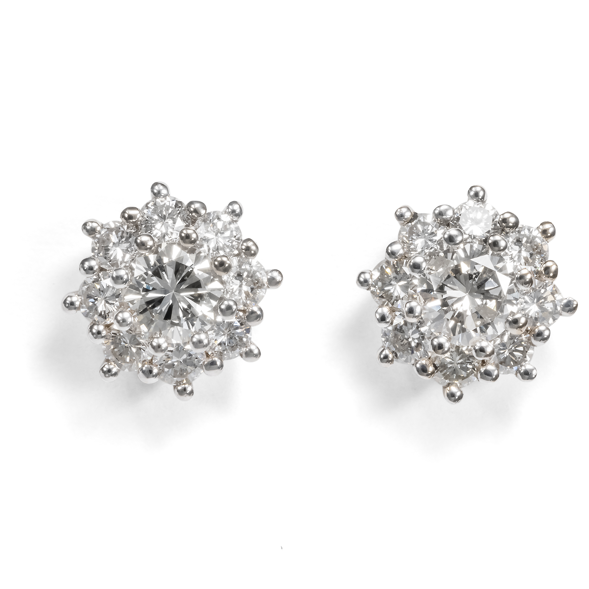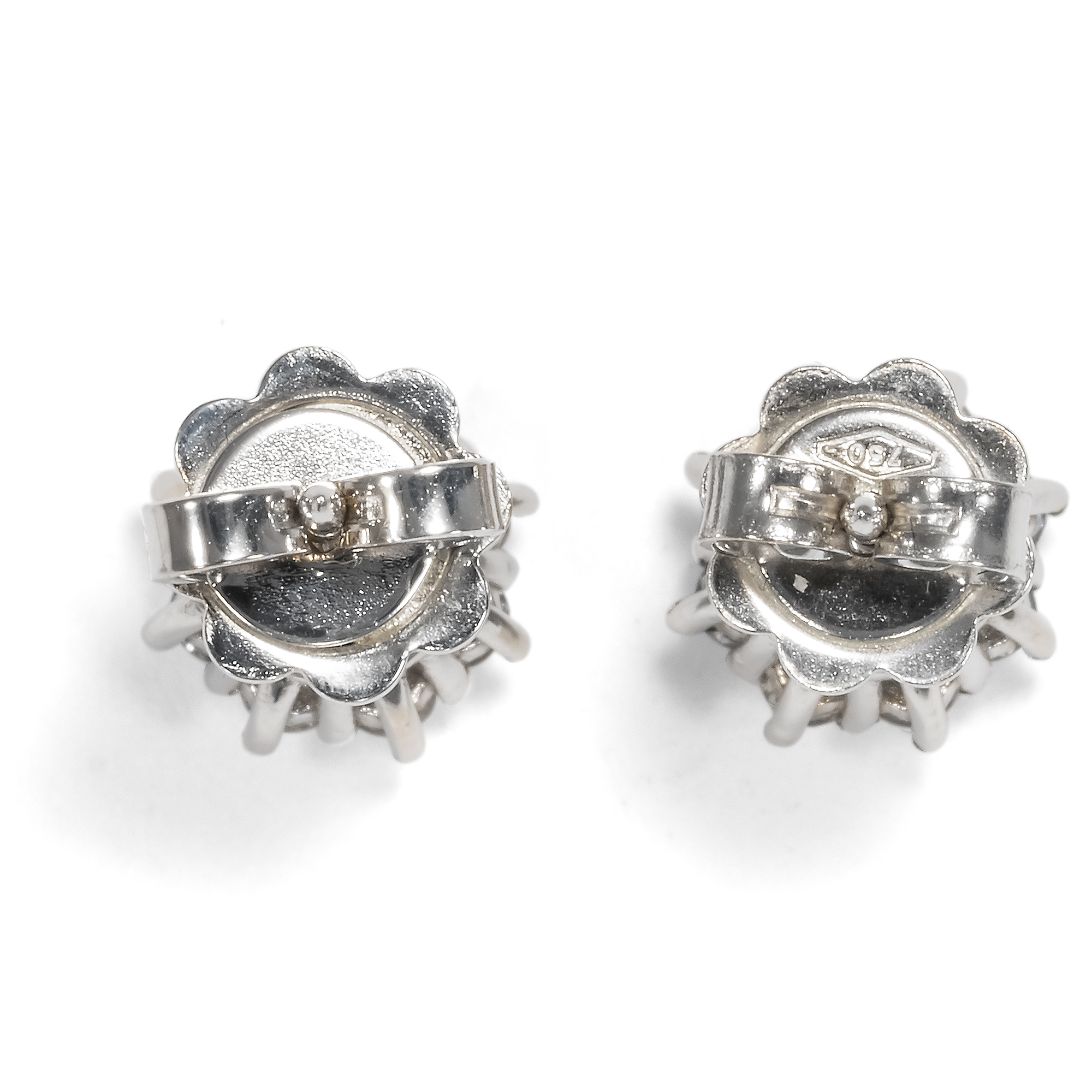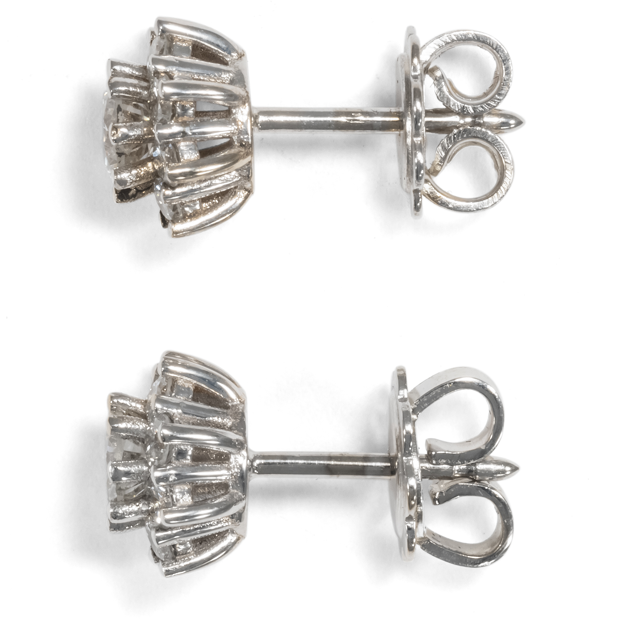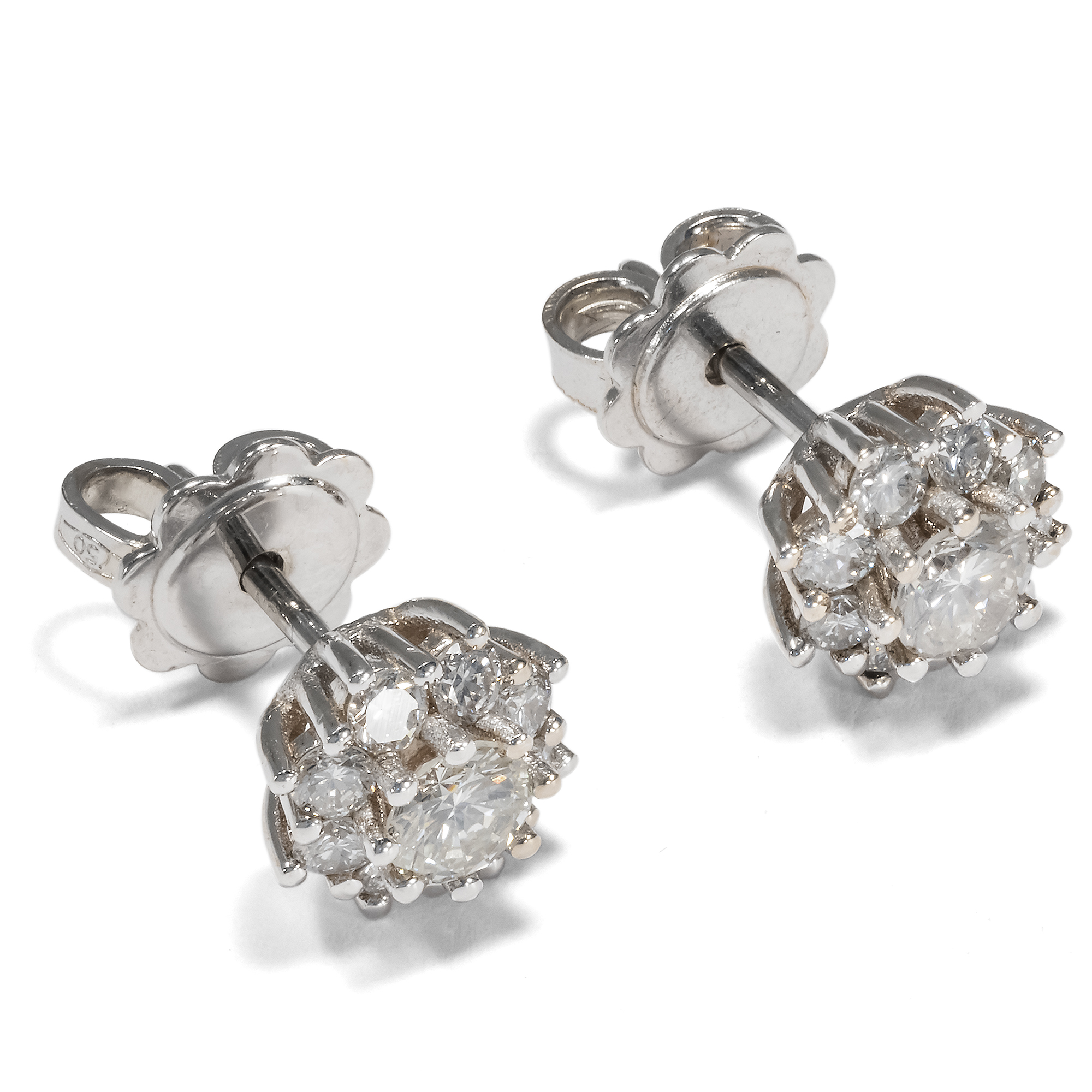 Wie kleine Blüten in glitzerndem Weiß erscheinen die vorliegenden Ohrstecker. Jeweils ein schöner Brillant von etwa 0,20 ct bildet ihren strahlenden Mittelpunkt. Ein Kranz aus weiteren hell leuchtenden Diamanten im Brillantschliff umgibt die Mittelsteine wie Blütenblätter. Die Edelsteine sind in hochkarätiges Weißgold gefasst. So erscheinen die Kompositionen wie kleine Blüten aus Licht. Ohrringe sind im Bereich des antiken Schmucks die am schwierigsten zu findenden Stücke. Zu oft hat der Lauf der Zeit die Paare auseinander gerissen und es ging eines der beiden Stücke verloren. Unsere Goldschmiede haben daher aus unserer Sammlung vintage Edelsteinen achtzehn Diamanten mit einem Gesamtgewicht von 0,94 Karat ausgesucht und zu diesen Ohrsteckern zusammengestellt. Die Diamanten stammen aus Schmuckstücken, welche uns leider nicht mehr in tragbarem Zustand erreichten. Wir haben sie daher ausgefasst und hier neu eingesetzt. Die Fassungen wurden für uns in Italien hergestellt und die Steine hier in Berlin eingefasst. In ihrer schlichten, klassischen Gestaltung können sie zu einer Vielzahl von Schmuckstücken eine wunderbare Ergänzung bilden.
