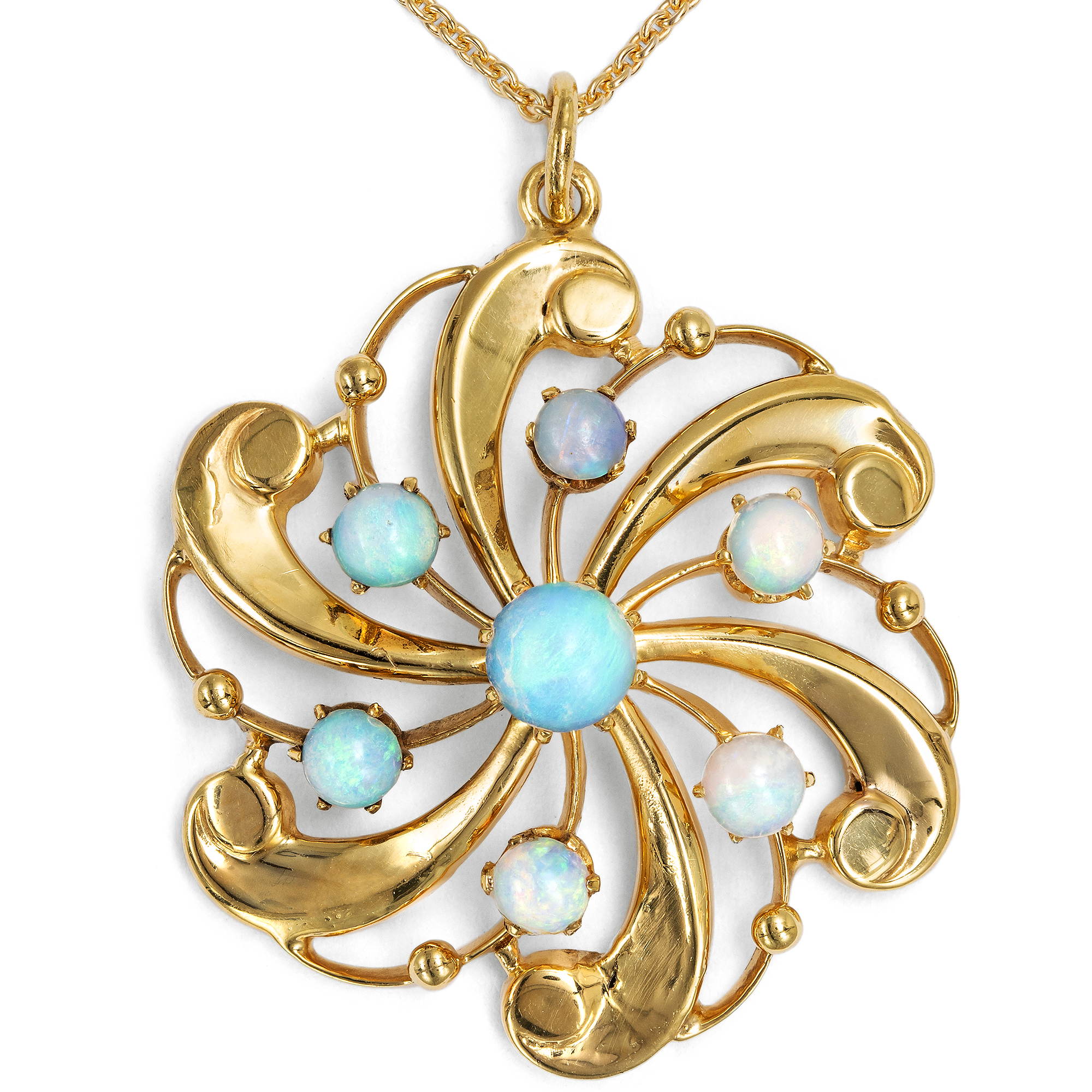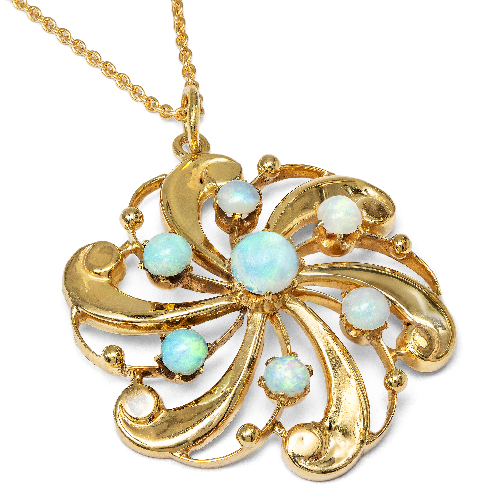 Das Britische Empire umfasste an der Wende zum 20. Jahrhundert beinahe ein Viertel der Weltbevölkerung. Als Folge dessen ergoss sich aus den Kolonien ein nicht enden wollender Strom exotischer Waren und Kostbarkeiten in die großen Häfen Englands. Edelsteine und Perlen wurden in nie gesehener Menge importiert, und die Schmuckproduktion jener Jahre war so reichhaltig wie nie zuvor oder danach. Zu den besonderen Schätzen, zu denen England Zugang hatte, gehörten Opale aus der Kolonie Australien. Der schillernde Edelstein gehörte zu den Favoriten der Briten und zierte in den vielfältigsten Varianten den Schmuck der vorletzten Jahrhundertwende. Auch der vorliegende Anhänger, den wir in London entdeckt haben, zeigt einen feinen Besatz aus sieben australischen Opalen mit wundervollem Farbspiel. Der zarte Anhänger aus 9-karätigem Gold zeigt sich in Form eines dynamischen Wirbels, der an eine Blüte erinnert. Mithilfe einer modernen Ankerkette kann der schöne Anhänger aus der Regierungszeit Edward VII. sofort getragen werden – ein typisches Schmuckstück der Belle Époque, das durch sein lebensfrohes Farbspiel bis heute überzeugt.