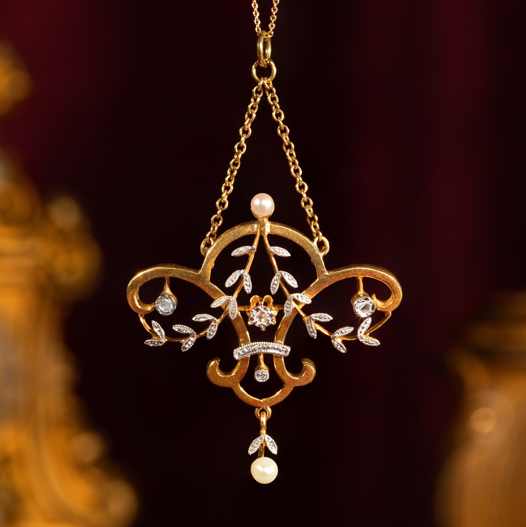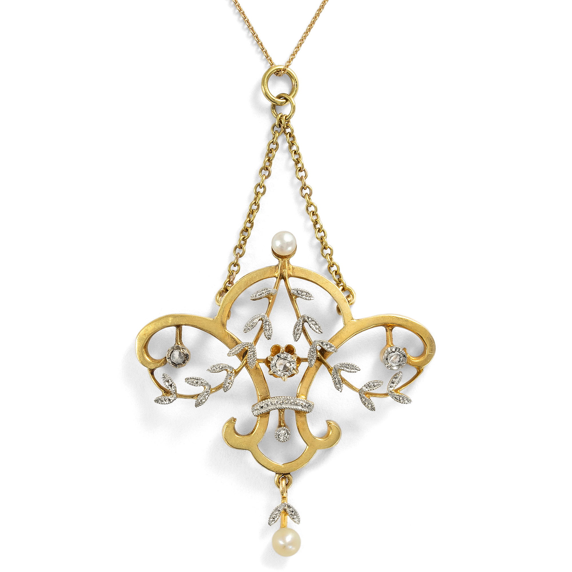 Die Jahre um 1900 brachten mit dem sogenannten „Garland Style“, dem „Girlandenstil“, eine Formensprache in die Welt des Schmucks, die dem Jugendstil eine klassischere, feinere Stilauffassung entgegensetzte. Anlehnungen an Formen des Louis XVI und feine Motive aus der klassischen Antike belebten einen Neoklassizismus, der kleine, zarte Lorbeerranken ebenso schätzte wie minutiöse Festons und Verzierungen mit winzigen Millegriffes. Auch das hier vorliegende Schmuckstück führt uns diesen eleganten Stil vor Augen. Auf einem von goldenen Schwüngen gebildeten Körper sind feine Girlanden aus Lorbeerblättern appliziert, die mit Platin hervorgehoben sind. Dazwischen glitzern kleine Rosendiamanten. Ober- und unterhalb dieser Komposition sind kleine Perlen gefasst. Durch die strenge Symmetrie des Entwurfs erhält die feine, verspielte Arbeit eine klassische Note. Ganz ähnliche Entwürfe, jedoch als Brosche konzipiert, finden sich beispielsweise im Katalog des Juweliers E. Bannse aus Paris, vgl. z.B. den Entwurf Nr. 458 unten links. Der Katalog ist um das Jahr 1910 erschienen, und auch der vorliegende Anhänger ist in dieser Zeit entstanden. Wir haben den Anhänger in London entdeckt und um eine neue Goldkette ergänzt. Sie ist aus besonders feinen Gliedern gearbeitet und passt damit ganz perfekt zu dem eleganten Anhänger.