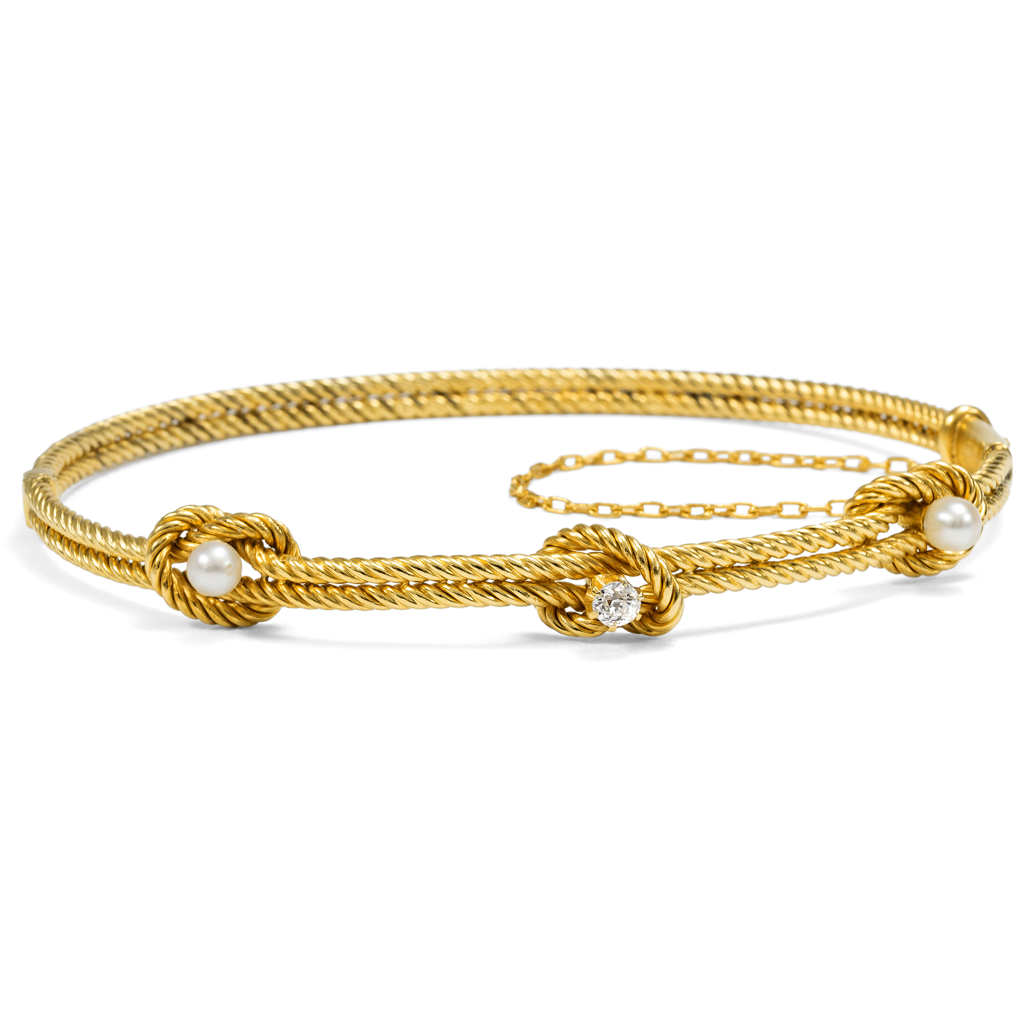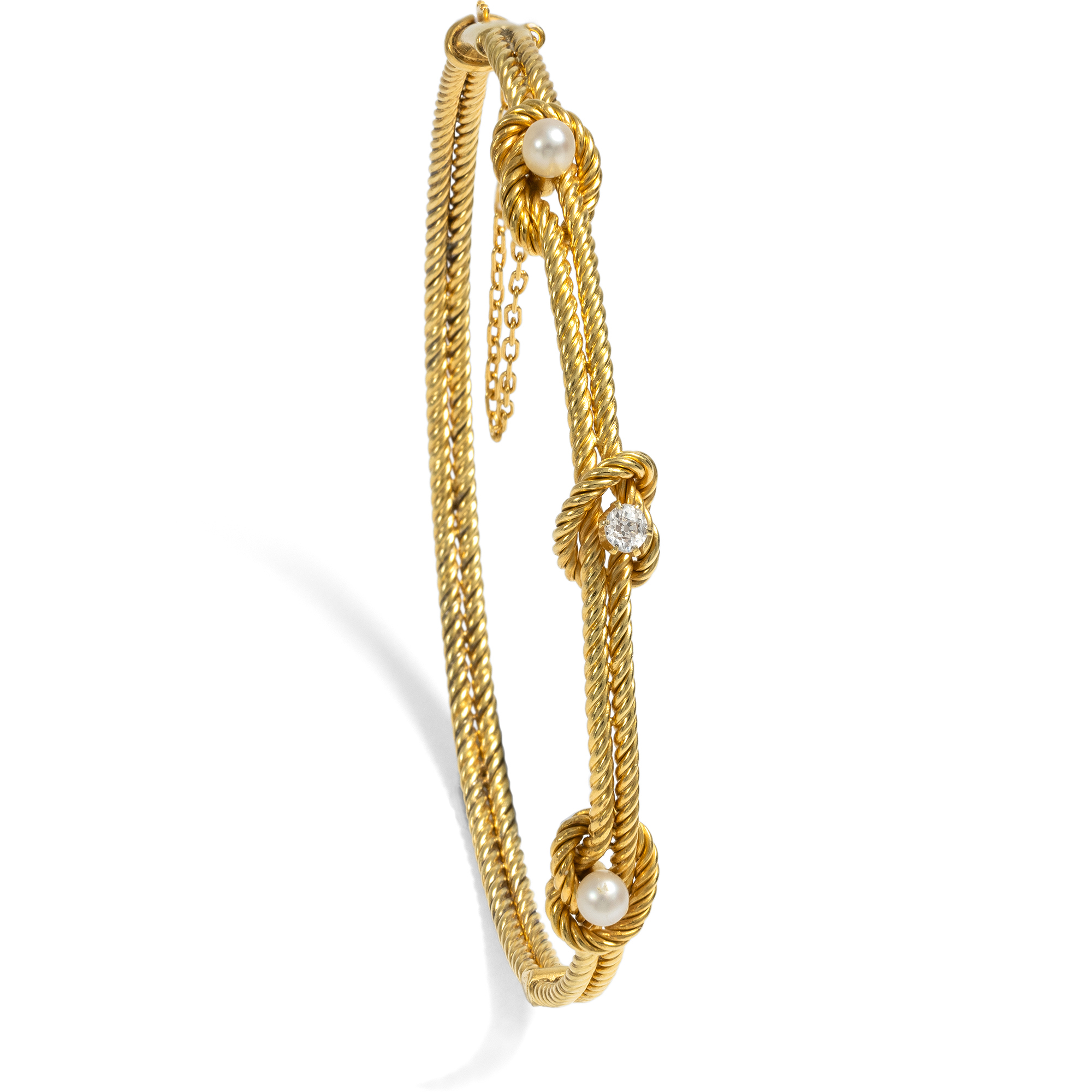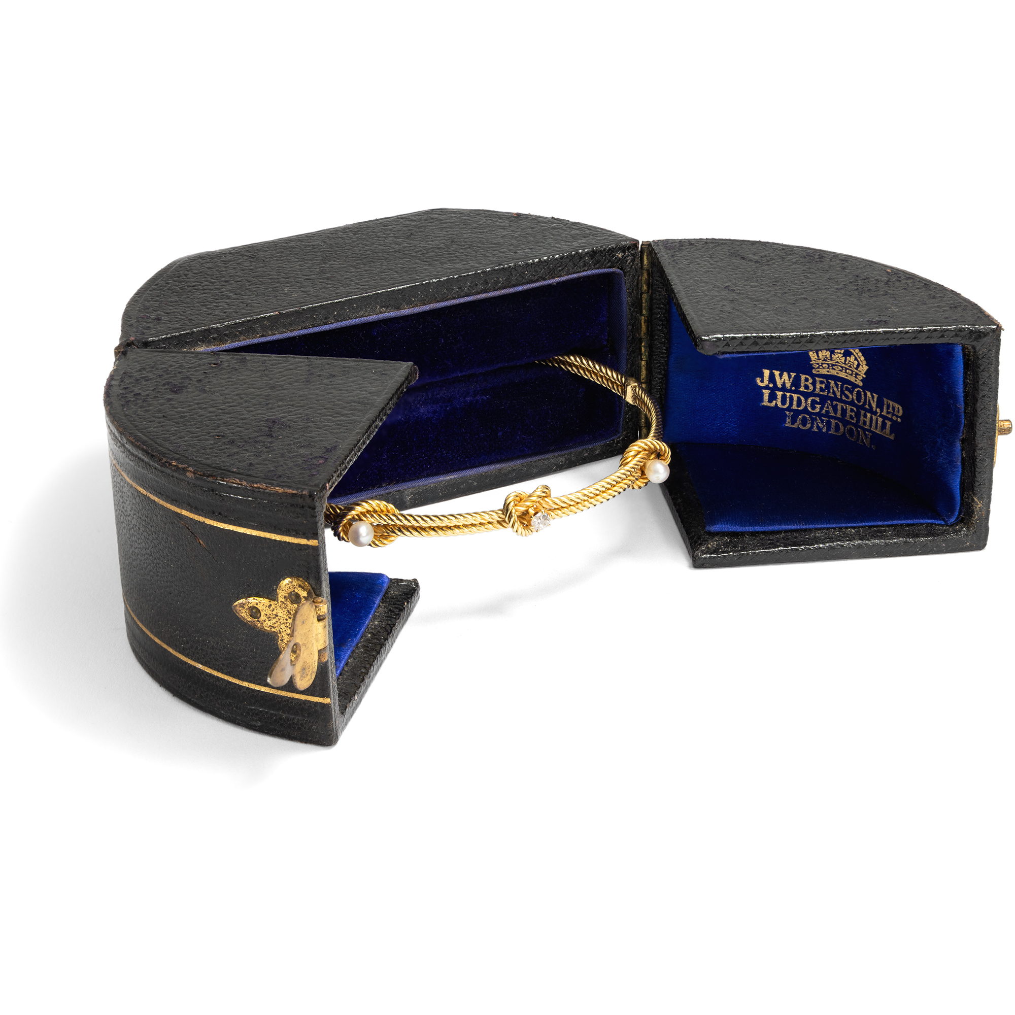 Schmuck des 19. Jahrhunderts transportiert oft romantische Botschaften. Seine Formen und Materialien konnten symbolische Bedeutungen übermitteln, die von den Zeitgenossen ohne Weiteres entschlüsselt werden konnten. Auch der hier vorliegende Armreif bedient sich dieser Form der Kommunikation, denn seine Oberseite zeigt gleich drei kunstvoll verschlungene Knoten. Tatsächlich scheint es, als bestehe der Reif aus einem doppelten Tau aus Gold, das in regelmäßigen Abständen zu großen Knoten verschlungen worden ist. Die beiden äußeren Knoten sind zudem mit einer Perle besetzt, der mittlere Knoten mit einem Diamanten. Knoten sind die sicher unmittelbar eingängigsten Symbole der Verbundenheit und Liebe. Schon aus der klassischen Antike sind zahlreiche entsprechende Beispiele überliefert. Knoten sind Teil eines Liebeszaubers in den Papyri Graecae Magicae IV, 296ff. und waren als sog. Herkulesknoten Teil des römischen Heiratszeremoniells. In viktorianischer Zeit waren „Lover's Knots“ geradezu ubiquitär, eine besondere Mode wurden sie vor allem in den Jahren um 1900. Zahlreiche erhaltene Schmuckstücke variieren das Thema, doch nur selten ist es so fein und elegant ausgeführt wie hier. Die Perlen als Attribut der Liebesgöttin Venus und der Diamant als Stein der Ewigkeit ergänzen die Aussage der Knoten dabei noch weiter. Wir haben den Armreif in London entdeckt. Er hat sich in seinem wohl originalen Etui des Londoner Juweliers J. W. Benson erhalten.