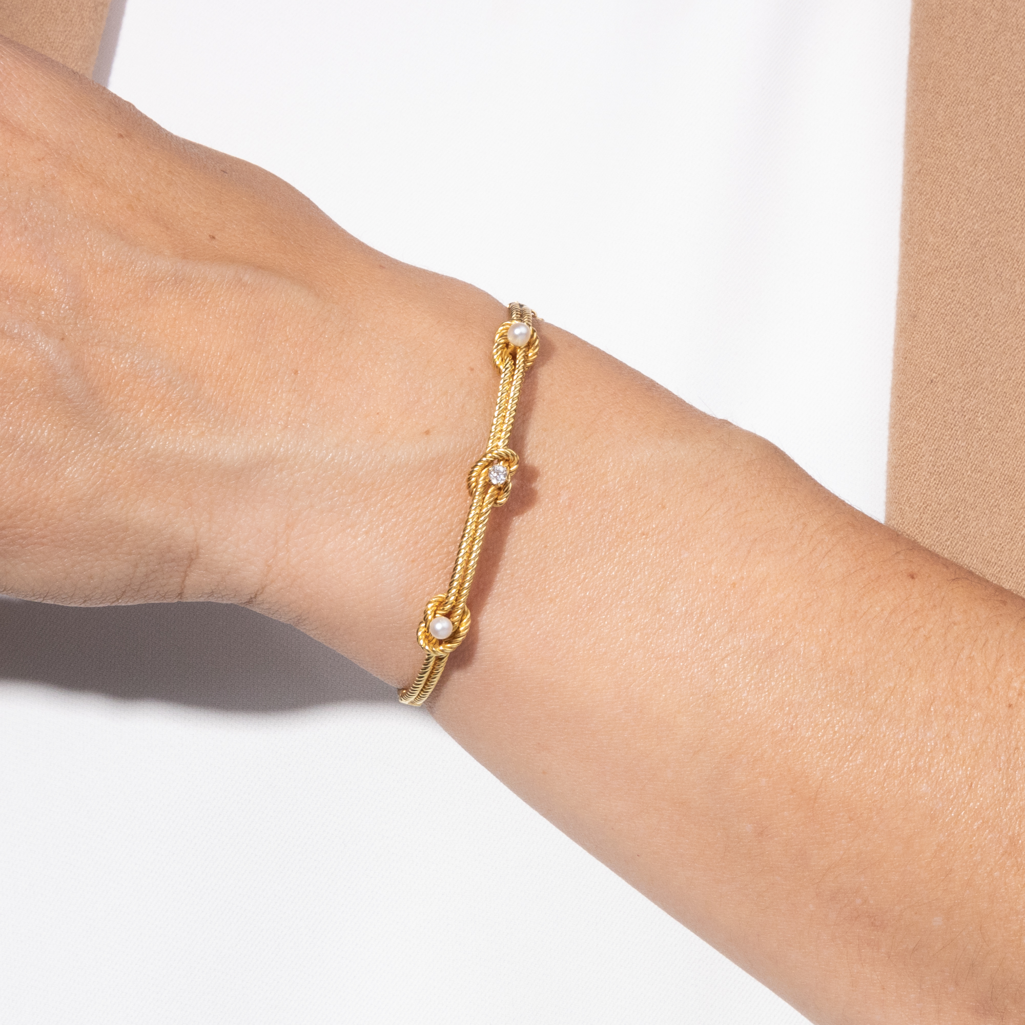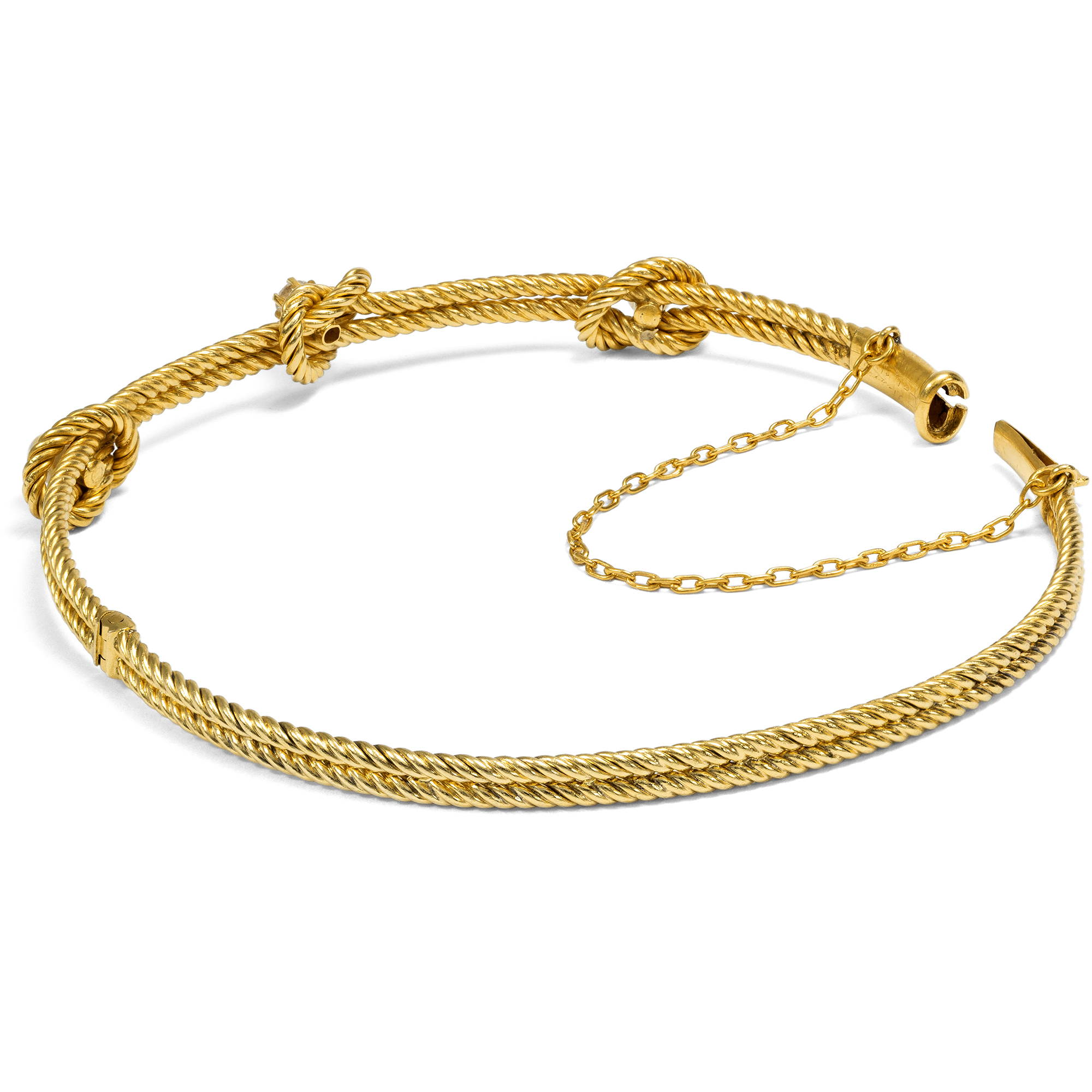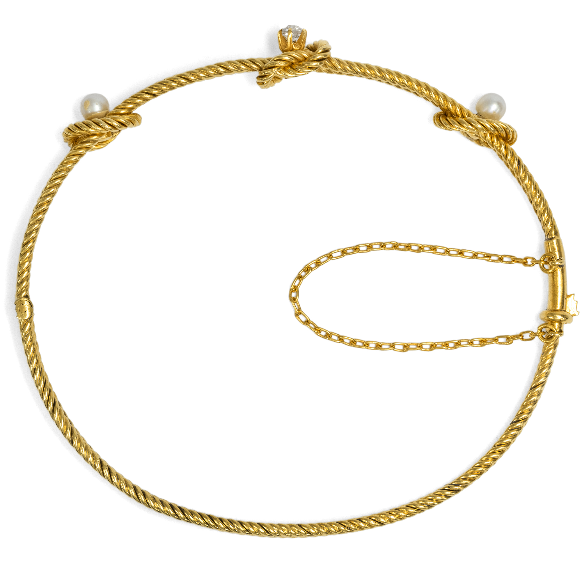 Schmuck des 19. Jahrhunderts transportiert oft romantische Botschaften. Seine Formen und Materialien konnten symbolische Bedeutungen übermitteln, die von den Zeitgenossen ohne Weiteres entschlüsselt werden konnten. Auch der hier vorliegende Armreif bedient sich dieser Form der Kommunikation, denn seine Oberseite zeigt gleich drei kunstvoll verschlungene Knoten. Tatsächlich scheint es, als bestehe der Reif aus einem doppelten Tau aus Gold, das in regelmäßigen Abständen zu großen Knoten verschlungen worden ist. Die beiden äußeren Knoten sind zudem mit einer Perle besetzt, der mittlere Knoten mit einem Diamanten. Knoten sind die sicher unmittelbar eingängigsten Symbole der Verbundenheit und Liebe. Schon aus der klassischen Antike sind zahlreiche entsprechende Beispiele überliefert. Knoten sind Teil eines Liebeszaubers in den Papyri Graecae Magicae IV, 296ff. und waren als sog. Herkulesknoten Teil des römischen Heiratszeremoniells. In viktorianischer Zeit waren „Lover's Knots“ geradezu ubiquitär, eine besondere Mode wurden sie vor allem in den Jahren um 1900. Zahlreiche erhaltene Schmuckstücke variieren das Thema, doch nur selten ist es so fein und elegant ausgeführt wie hier. Die Perlen als Attribut der Liebesgöttin Venus und der Diamant als Stein der Ewigkeit ergänzen die Aussage der Knoten dabei noch weiter. Wir haben den Armreif in London entdeckt. Er hat sich in seinem wohl originalen Etui des Londoner Juweliers J. W. Benson erhalten.