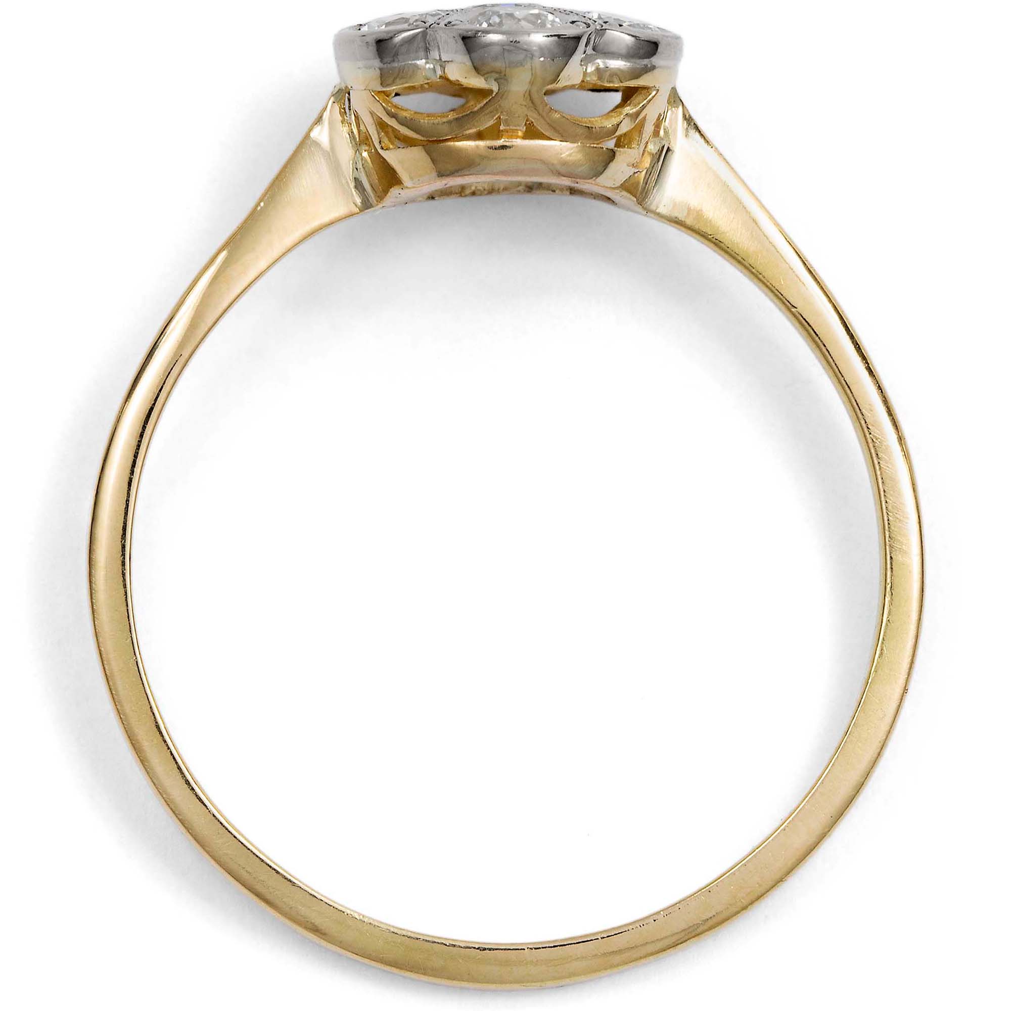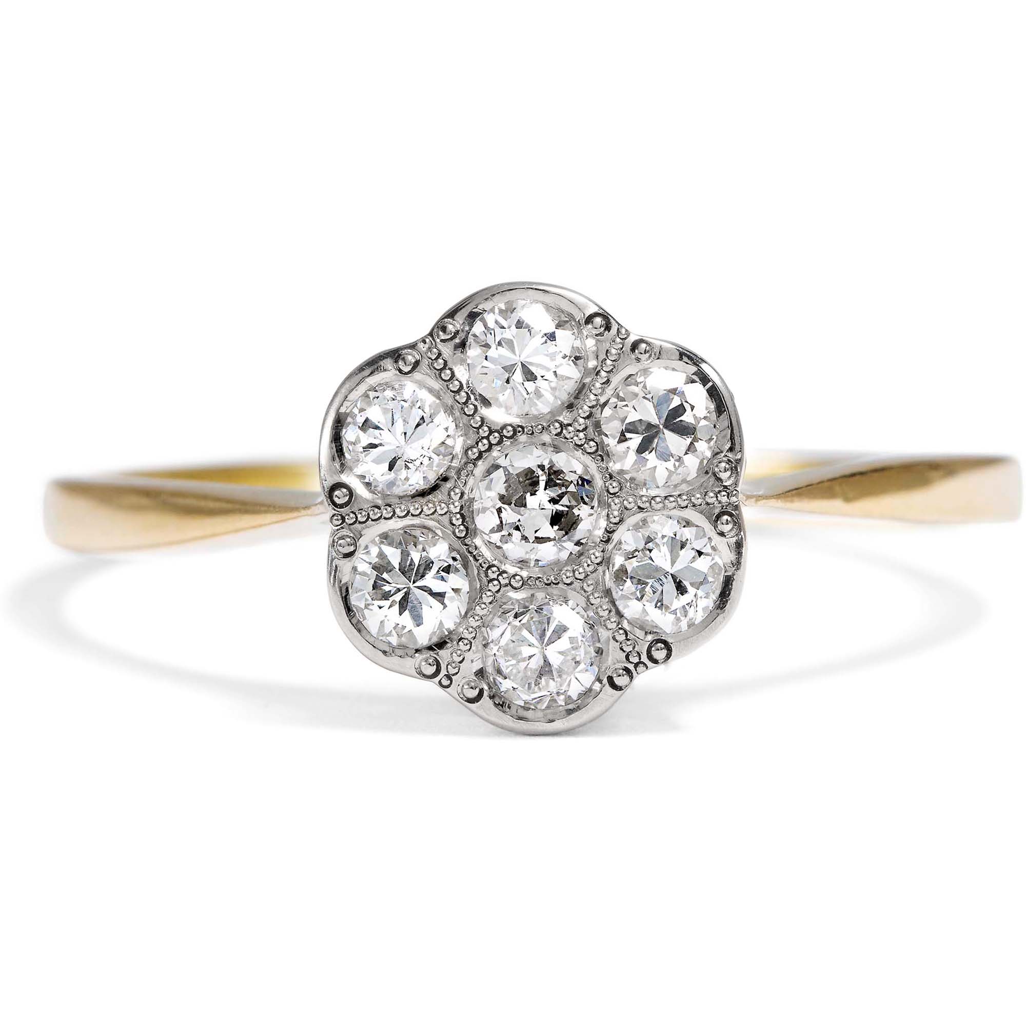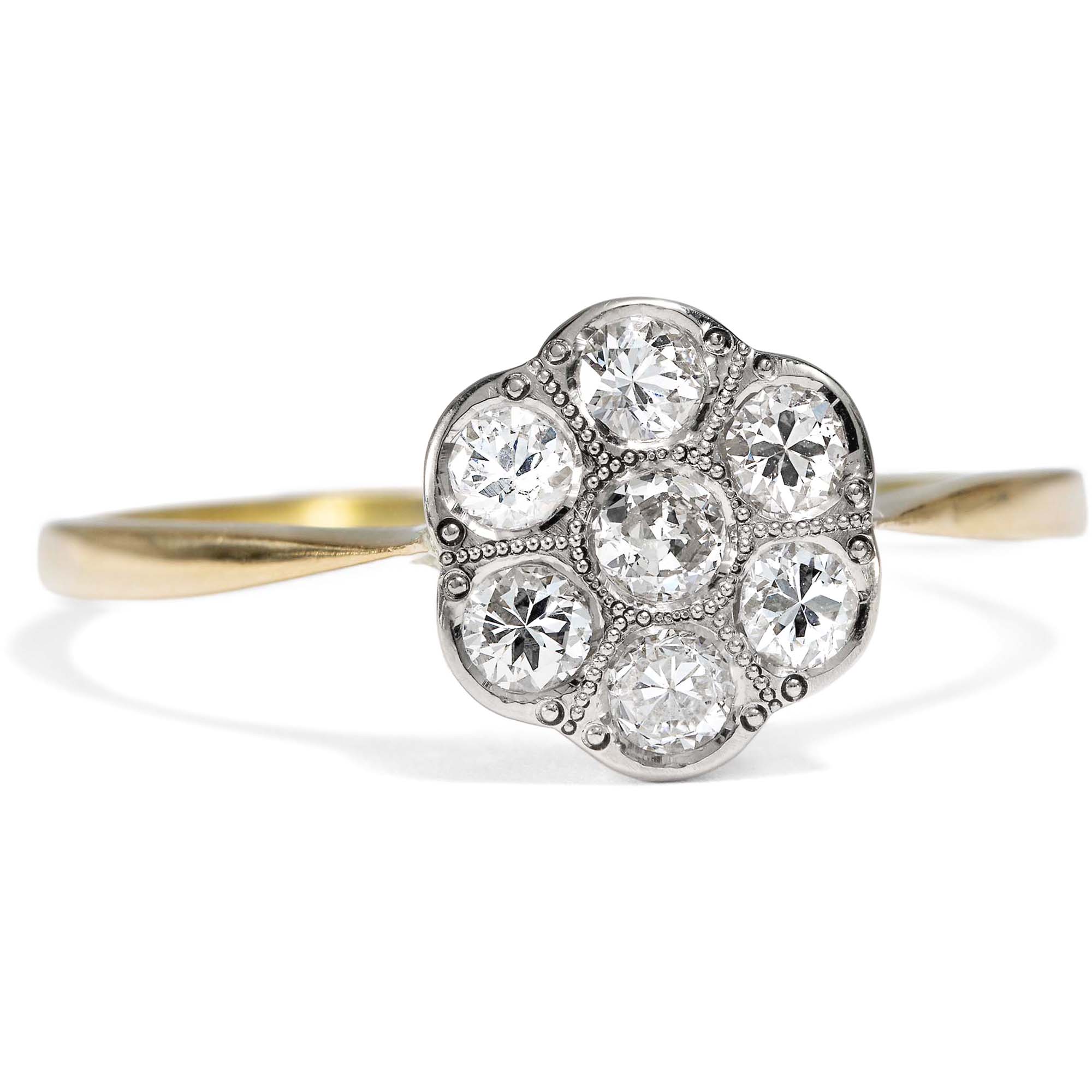 „On waste and woodland, rock and plain, Its humble buds unheeded rise; The Rose has but a summer reign; The Daisy never dies!“ — James Montgomery, A Field Flower, 1803 In der Sprache der Blumen, die im 19. Jahrhundert noch allgegenwärtig war, nahm das Gänseblümchen eine besondere Stellung ein. Es galt nicht nur als Sinnbild der Unschuld – auch seine Beständigkeit, mit der es fast das ganze Jahr über blüht, wurde hochgeschätzt. Der schottische Dichter James Montgomery etwa schrieb die obigen Verse, nachdem er am ersten Weihnachtstag des Jahres 1803 auf einer Wanderung ein Gänseblümchen in voller Blüte entdeckte. Der hier präsentierte Ring greift dieses Symbol auf und zeigt ein Cluster aus insgesamt sieben Diamanten mit einem Gesamtgewicht von etwa 0,42 Karat. Die Edelsteine sind blütenartig arrangiert – eine Gestaltung, die dem Ringtypus seinen Namen gibt: „Daisy-Ring“, nach dem englischen Wort für Gänseblümchen. Die Fassungen der Diamanten bestehen aus Platin und lassen die Steine wie ein einziges, funkelndes Lichtgebilde erscheinen. Ringschiene und Unterkaderung hingegen sind aus warm schimmerndem Gold gearbeitet, was dem Ring eine elegante Zweifarbigkeit verleiht. Entdeckt haben wir dieses zauberhafte Stück im Süden Englands, in England ist es auch entstanden. Durch seine zeitlose Gestaltung ist der Ring nicht nur ein wunderbarer Begleiter zu antikem wie modernem Schmuck, sondern eignet sich auch hervorragend als individueller Verlobungsring.