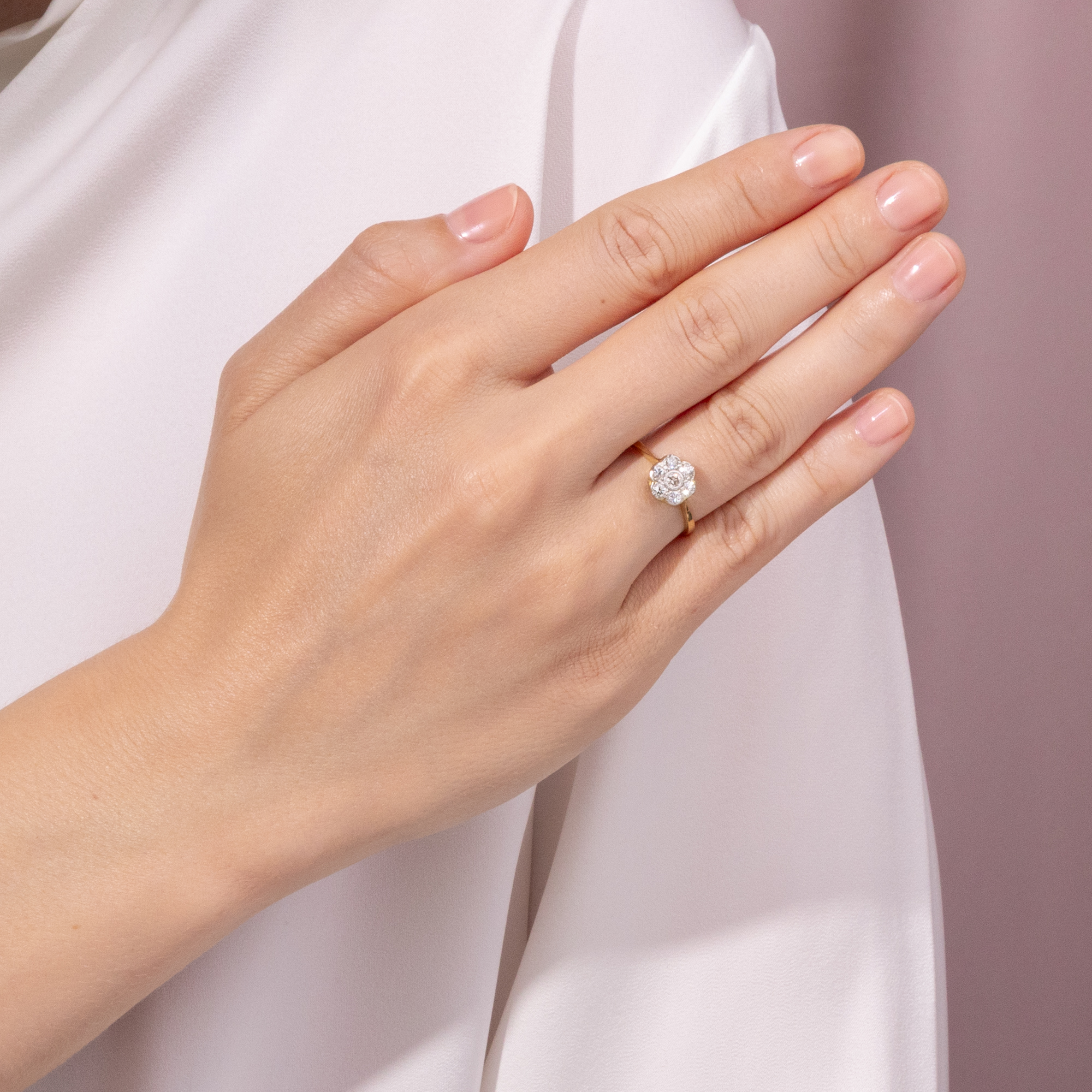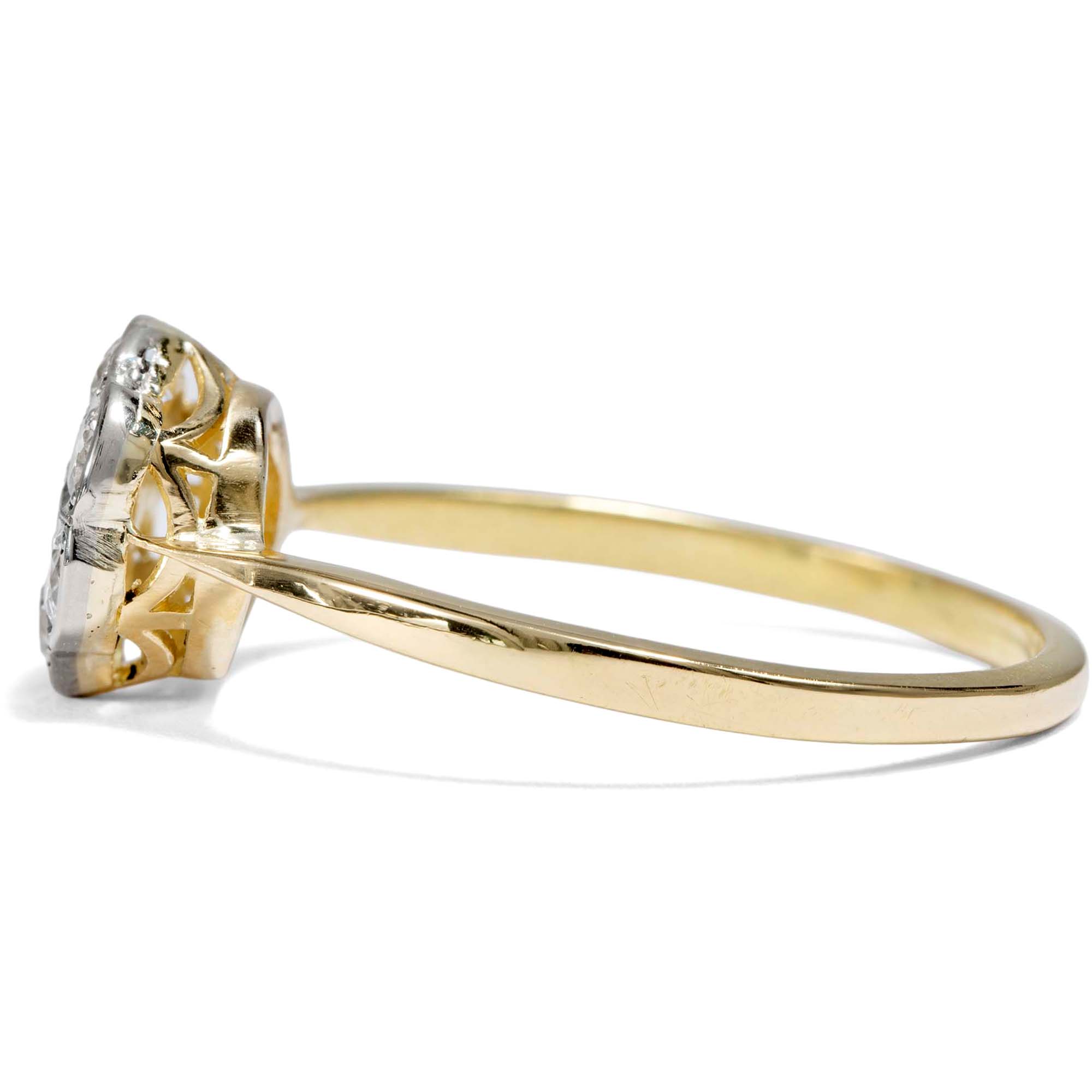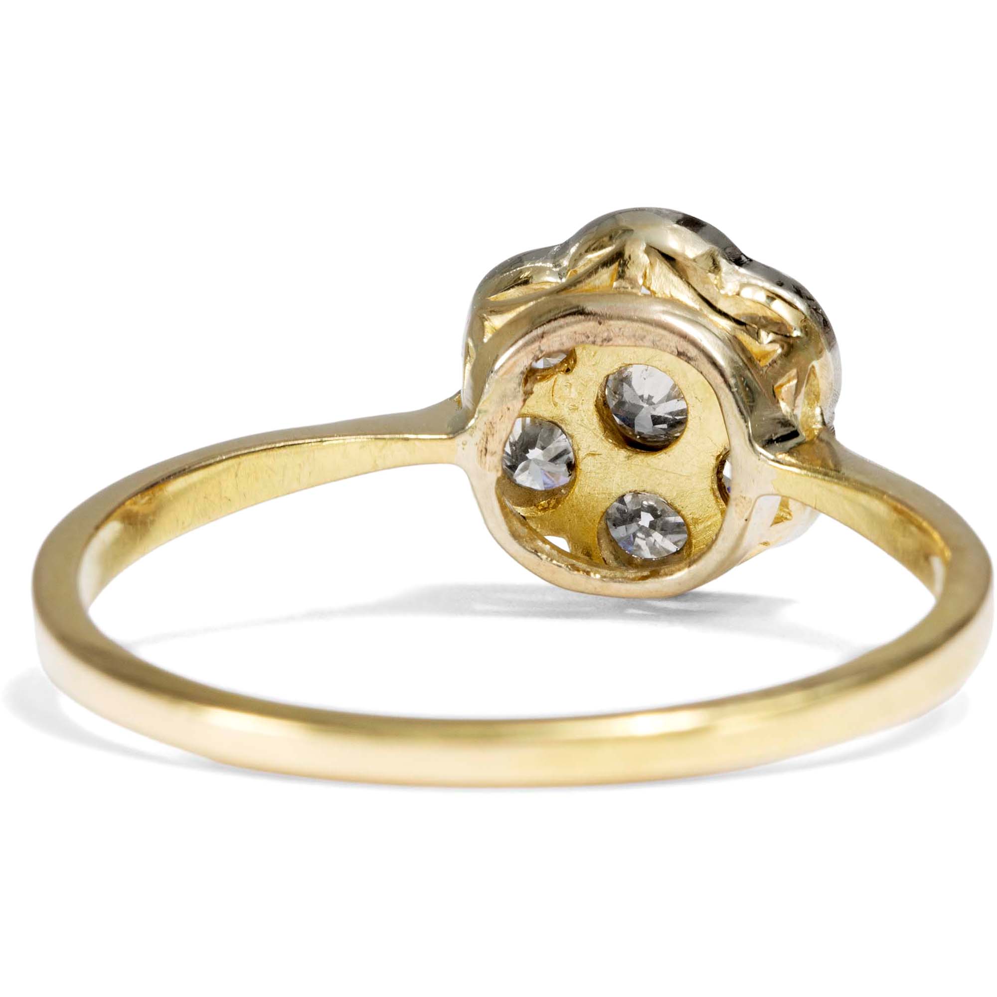 „On waste and woodland, rock and plain, Its humble buds unheeded rise; The Rose has but a summer reign; The Daisy never dies!“ — James Montgomery, A Field Flower, 1803 In der Sprache der Blumen, die im 19. Jahrhundert noch allgegenwärtig war, nahm das Gänseblümchen eine besondere Stellung ein. Es galt nicht nur als Sinnbild der Unschuld – auch seine Beständigkeit, mit der es fast das ganze Jahr über blüht, wurde hochgeschätzt. Der schottische Dichter James Montgomery etwa schrieb die obigen Verse, nachdem er am ersten Weihnachtstag des Jahres 1803 auf einer Wanderung ein Gänseblümchen in voller Blüte entdeckte. Der hier präsentierte Ring greift dieses Symbol auf und zeigt ein Cluster aus insgesamt sieben Diamanten mit einem Gesamtgewicht von etwa 0,42 Karat. Die Edelsteine sind blütenartig arrangiert – eine Gestaltung, die dem Ringtypus seinen Namen gibt: „Daisy-Ring“, nach dem englischen Wort für Gänseblümchen. Die Fassungen der Diamanten bestehen aus Platin und lassen die Steine wie ein einziges, funkelndes Lichtgebilde erscheinen. Ringschiene und Unterkaderung hingegen sind aus warm schimmerndem Gold gearbeitet, was dem Ring eine elegante Zweifarbigkeit verleiht. Entdeckt haben wir dieses zauberhafte Stück im Süden Englands, in England ist es auch entstanden. Durch seine zeitlose Gestaltung ist der Ring nicht nur ein wunderbarer Begleiter zu antikem wie modernem Schmuck, sondern eignet sich auch hervorragend als individueller Verlobungsring.
