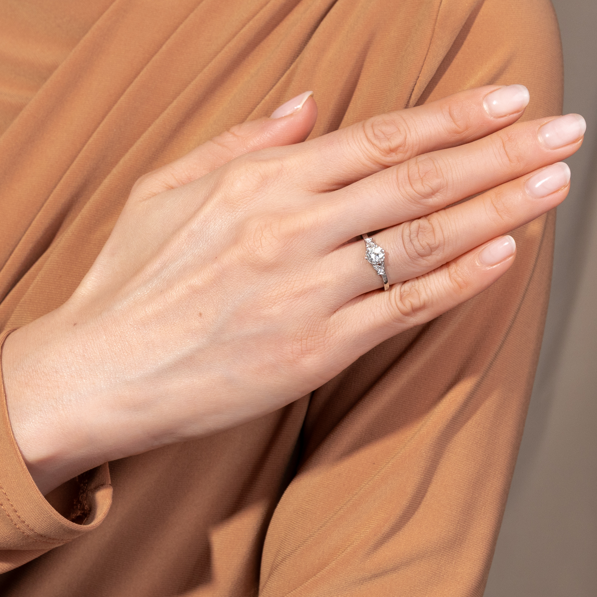 Die Liebe zu antiken Objekten lässt uns als Antikschmuckhändler ab und an auch ungefasste Edelsteine einkaufen. Denn jeder historische Diamant ist ein unverwechselbares Unikat mit ganz eigenem Charakter. Die Suche nach schönen Fassungen für unsere historischen Diamanten gestaltete sich jedoch schwieriger als gedacht. Moderne Fertigfassungen, wie man sie im Handel kaufen kann, sind oft seelenlose Maschinenprodukte ohne Gefühl für Form und Proportion. Doch schöne, handgeschmiedete, antike Fassungen kommen selten ohne passende Diamanten zu uns. So haben wir unseren Goldschmied beauftragt, eine Ringfassung nach unserem Entwurf zu fertigen, die wir anschließend nach alter Technik haben gießen lassen. Wir haben den vorliegenden Ring aus feinem Platin herstellen lassen und darin einen antiken Diamanten der Belle Époque fassen lassen. Der Diamant im sog. „Old European Cut“ wurde in den Jahren um 1900 herum geschliffen und wiegt 0,68 ct. Er hat eine sehr gute, weiche Brillanz und eine sehr gute Reinheit (VS2). Seine Farbe ist schwach warm getönt (J, Leicht getöntes Weiß). Zwei kleinere Diamanten in zarten Verzierungen mit Millegriffes beleben die Ringschultern und geben dem Stück seine leichte Eleganz, die den großen Brillanten wunderbar inszeniert. Zugleich funkelt das Schmuckstück bei jedem Lichtstrahl, der auf seine fein ausgearbeiteten Oberflächen trifft. Der Ring ist durch seine hochwertigen, unempfindlichen Materialien und seinen flachen Aufbau auch täglich zu tragen. Ein unabhängiges Gutachten hat die Qualität der Materialien bestätigt.