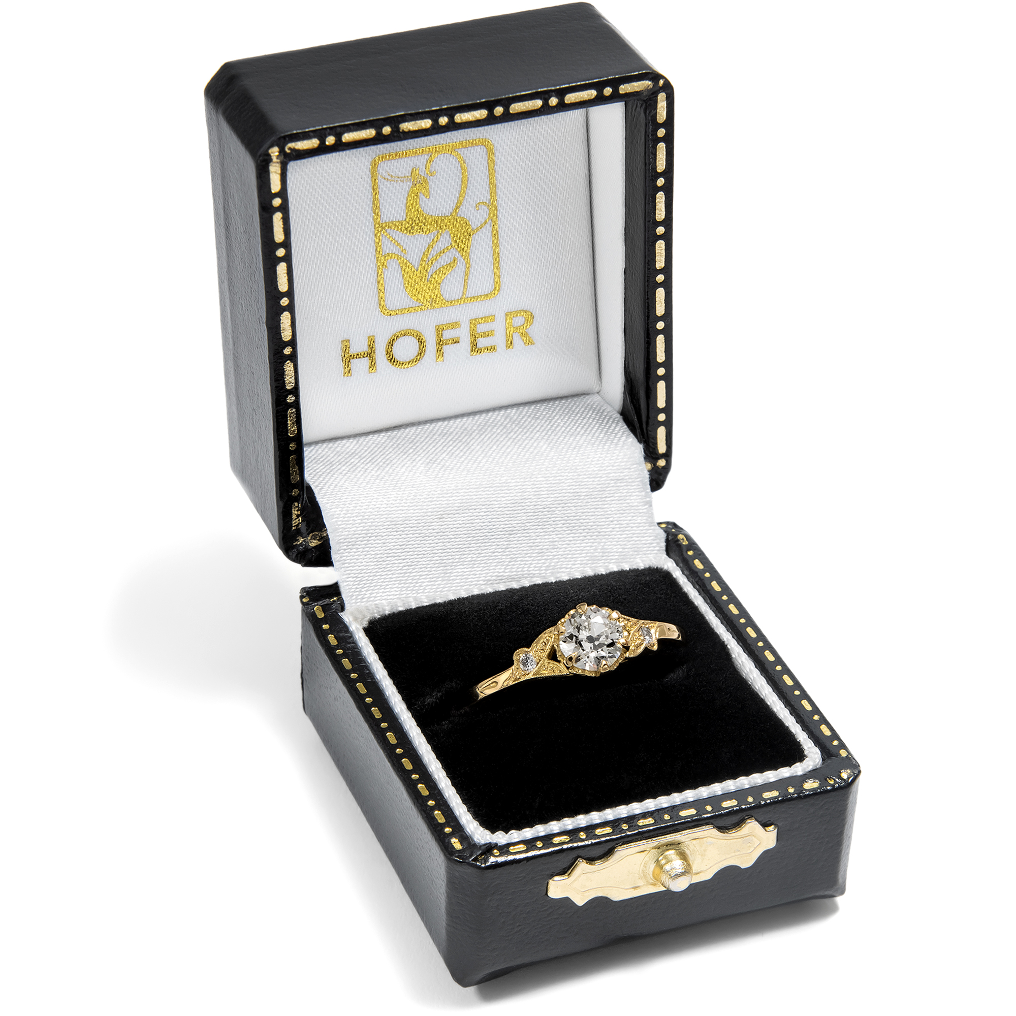 Die Liebe zu antiken Objekten lässt uns als Antikschmuckhändler ab und an auch ungefasste Edelsteine einkaufen. Denn jeder historische Diamant ist ein unverwechselbares Unikat mit ganz eigenem Charakter. Die Suche nach schönen Fassungen für unsere Diamanten gestaltete sich jedoch schwieriger als gedacht. Moderne Fertigfassungen, wie man sie im Handel kaufen kann, sind oft seelenlose Maschinenprodukte ohne Gefühl für Form und Proportion. Doch schöne, handgeschmiedete, antike Fassungen kommen selten ohne passende Diamanten zu uns. So haben wir unseren Goldschmied beauftragt, eine Ringfassung nach unserem Entwurf zu fertigen, die wir anschließend nach alter Technik haben gießen lassen. Wir haben den vorliegenden Ring aus hochkarätigem Gelbgold herstellen lassen und hierzu historisches Gold verwendet. Hier trägt dieser Ring nun einen antiken Diamanten der Belle Époque von 0,59 ct, der in den Jahren um 1900 herum geschliffen wurde. Es handelt sich um einen warm getönten Stein mit deutlichen natürlichen Einschlüssen (p1) in Form kleiner schwarzer Pünktchen aus Graphit im Kristall. Geschliffen wurde der Stein im zur Jahrhundertwende üblichen Form des Diamantschliffs, den die Zeitgenossen „Brillant“, wir heute aber „Old European Cut“ nennen. Zwei kleine Diamanten in zarten Verzierungen mit Millegriffes gliedern die Ringschultern und geben dem Stück seine leichte Eleganz, die den großen Diamanten wunderbar inszeniert. Zugleich funkelt das Schmuckstück bei jedem Lichtstrahl, der auf seine fein ausgearbeiteten Oberflächen trifft. Der Ring ist durch seine hochwertigen, unempfindlichen Materialien und seinen flachen Aufbau auch täglich zu tragen. Ein idealer Ring für die wohl entscheidendste Frage im Lebens – und die ist ja immer eine Herzenssache!