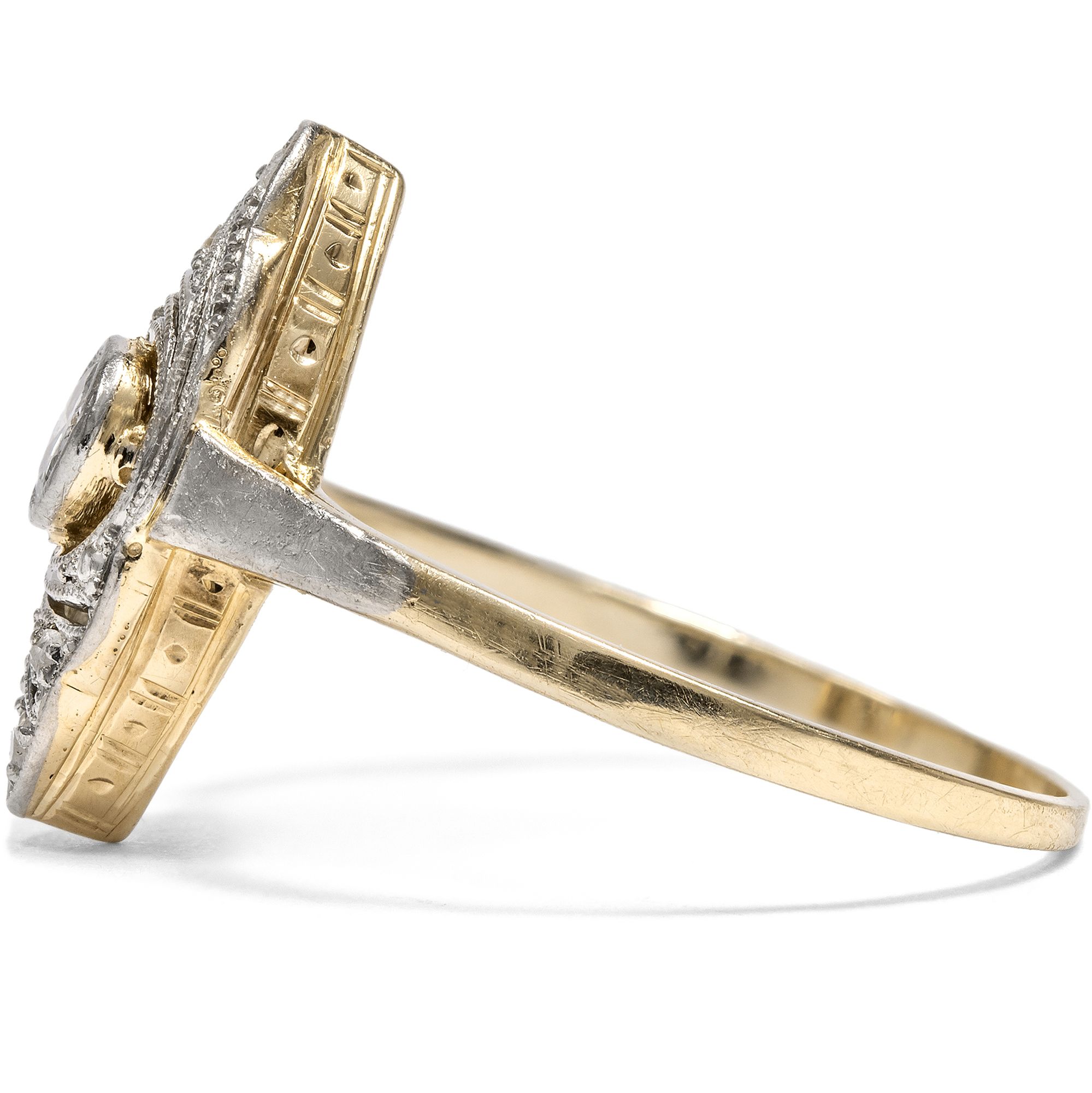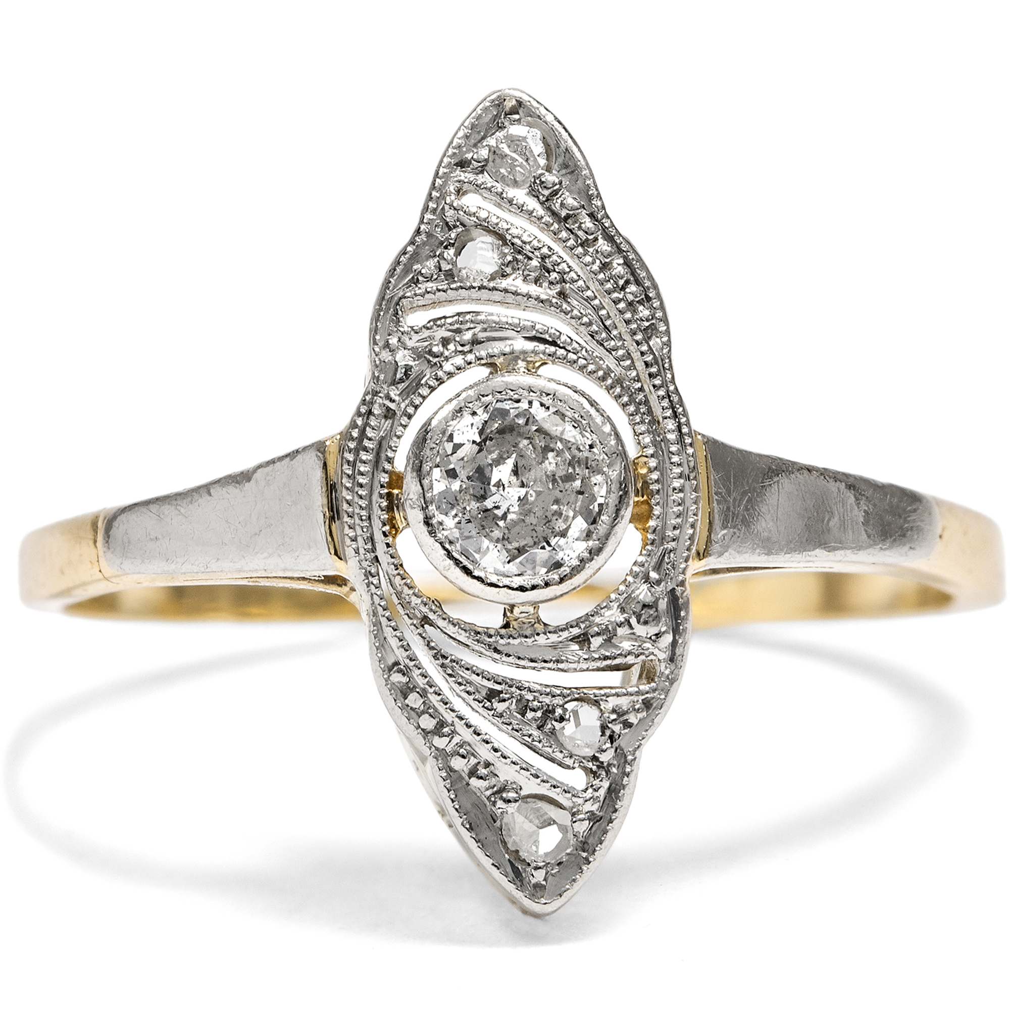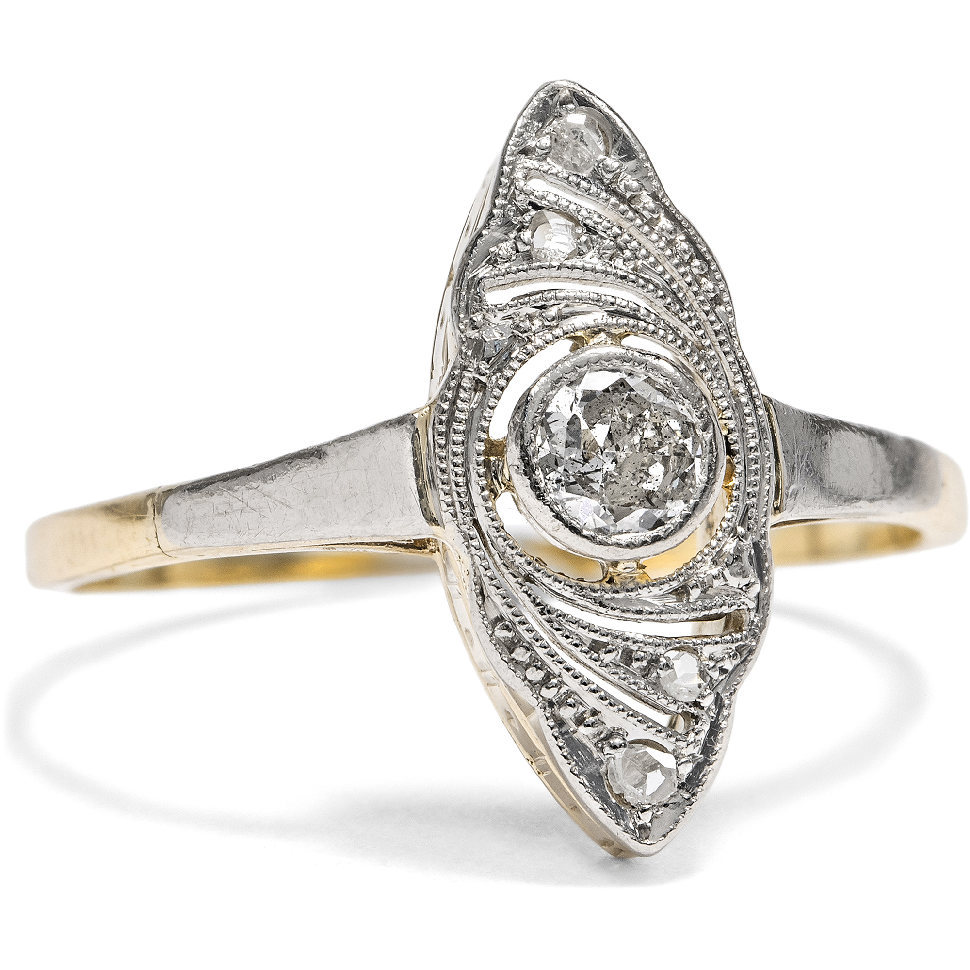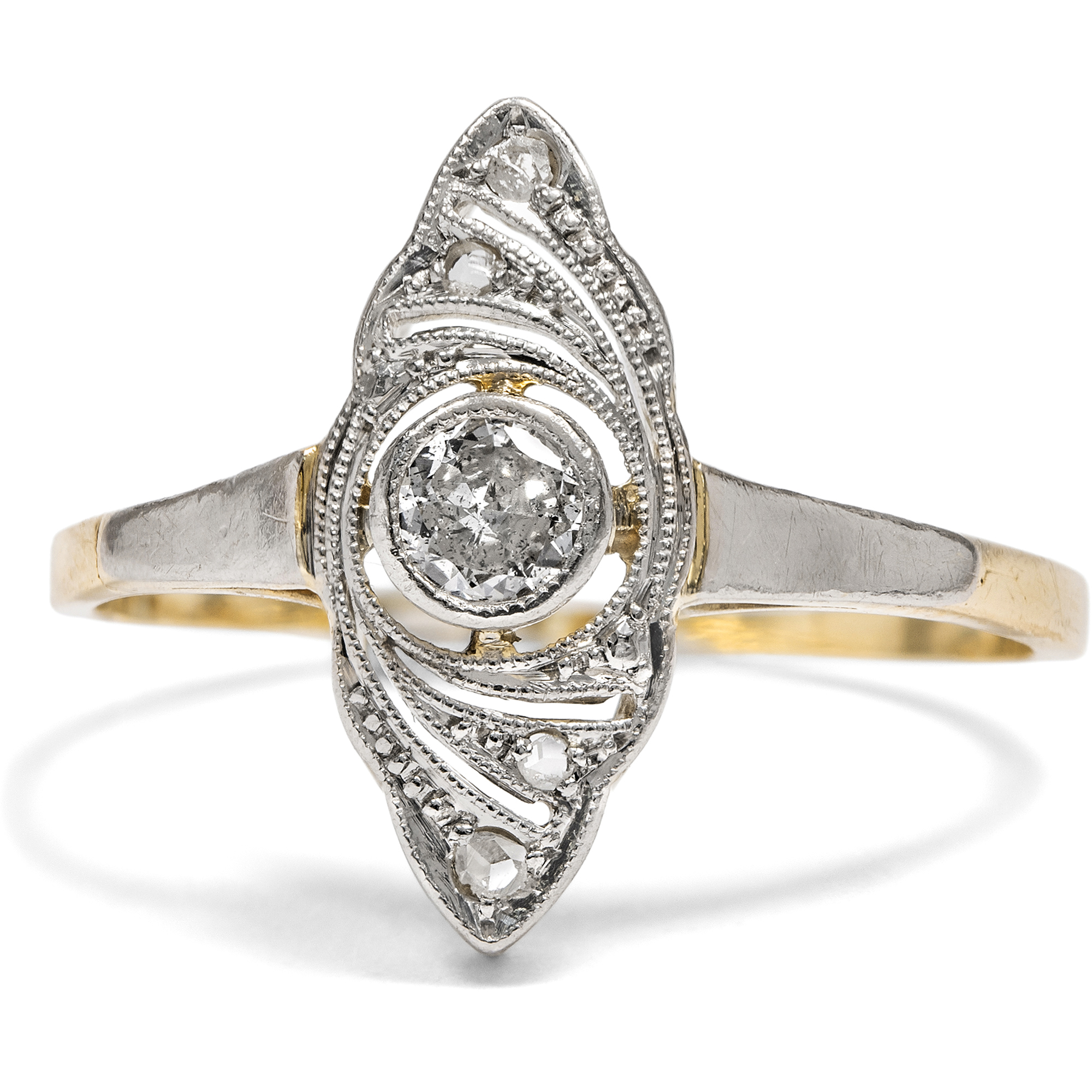 Weißjuwelen, also Schmuckstücke in weißer Farbigkeit, feiern das Licht. Die Neuerung der elektrischen Glühlampe ließ am Ende des 19. Jahrhunderts die Nacht zum Tage werden. Folglich konnte nun auch der Schmuck am Abend strahlen wie noch nie zuvor. Auf den großen Bällen in Paris, London und St. Petersburg wurden immer prachtvollere Diamantcolliers präsentiert, zudem Tiaren, Broschen und Ringe, allesamt Träume in weißen Diamanten. Als dann zu Beginn des 20. Jahrhunderts erst Platin und schließlich auch Weißgold ihren Einzug in die Schaufenster der Juweliere hielten, war dieser weiße Glanz vollkommen, und die Nacht zum Tage gemacht. Der hier vorliegende Ring ist ein typischer Vertreter dieser eleganten Schmuckgattung und in den Jahren um 1920 entstanden. Er besteht aus Gelbgold mit einer Schauseite aus Platin. Diese zeigt wunderbare Durchbrechungen mit feinen Schattenfugen, die in das Metall gesägt sind. Ein schöner Altschliff und vier Diamanten im Rosenschliff besetzen den schiffchenförmigen Ringkopf und setzen Glanzpunkte. Flach gearbeitet und von Hand gefertigt, ist das schöne Schmuckstück ein romantischer und feiner Ring mit nun schon 100 Jahren Geschichte.